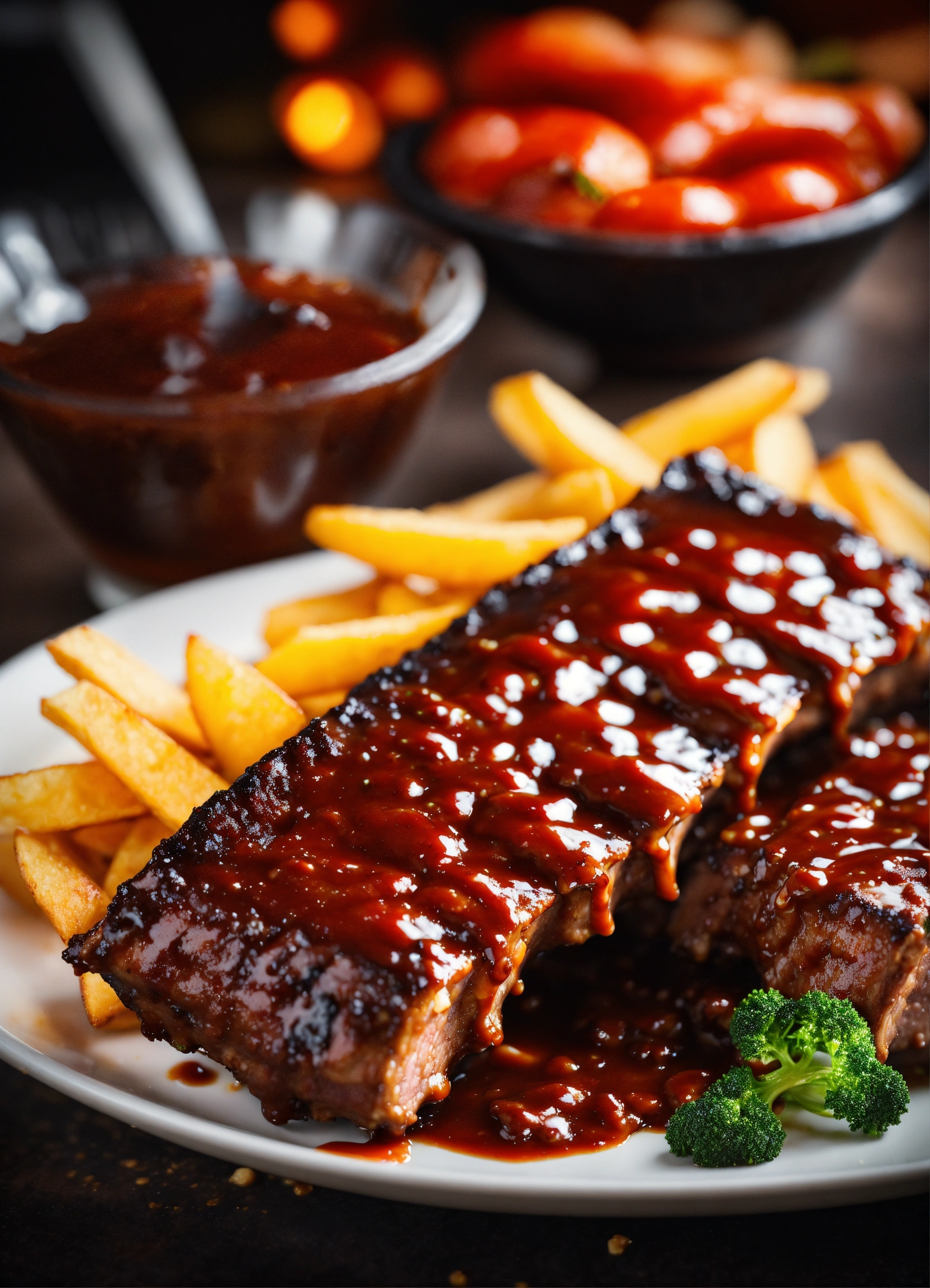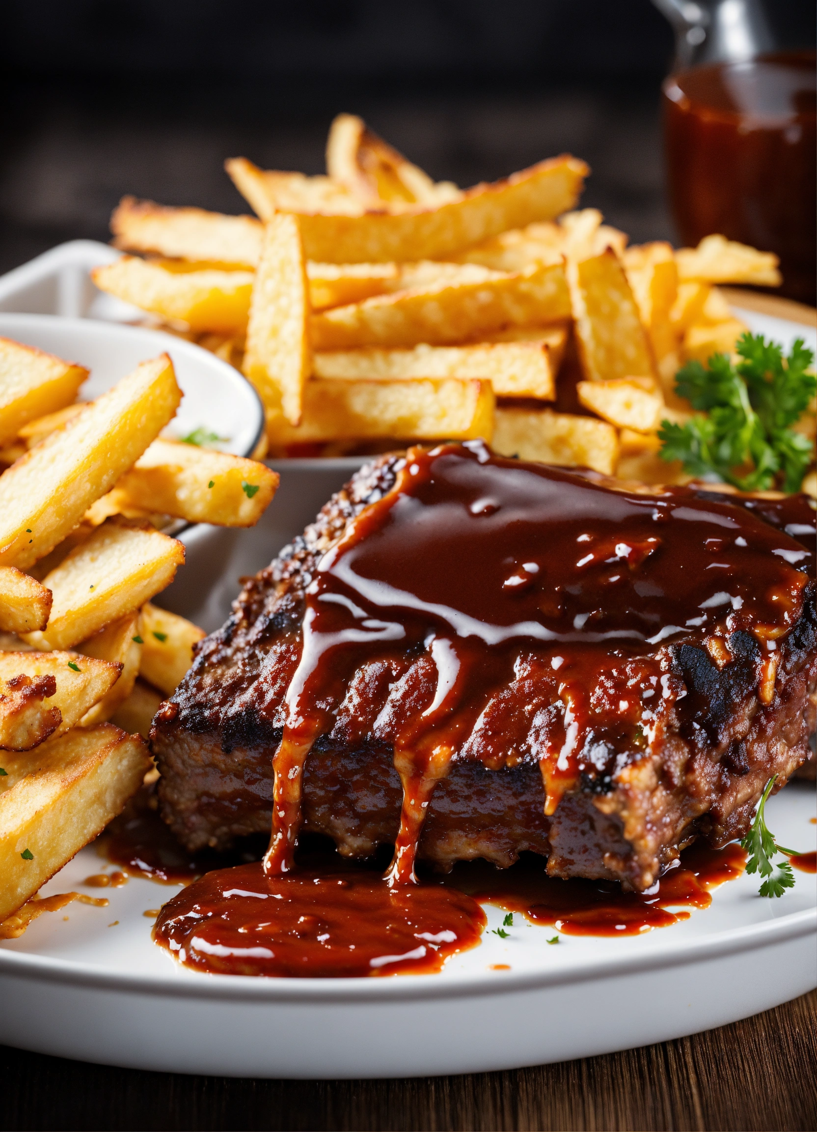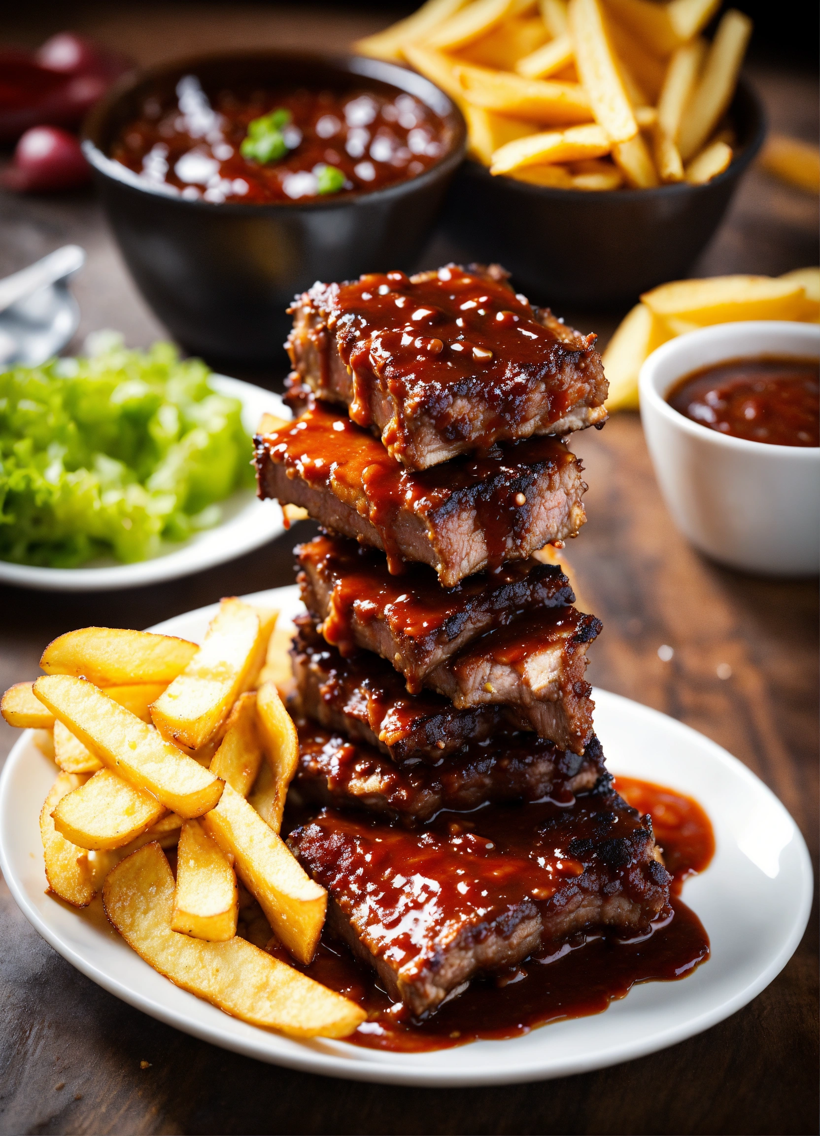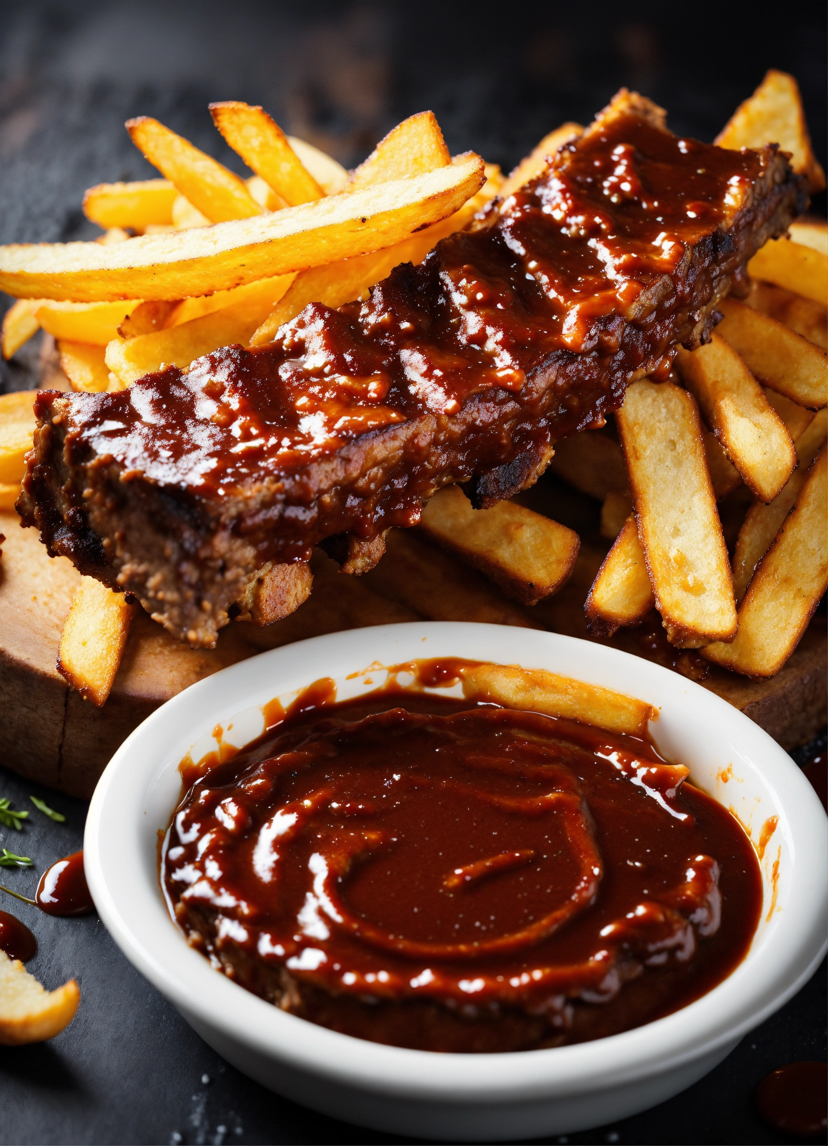 Ribs with chips to combine with spectacular splashes of barbecue sauce. creative dynamic composition varies angle. macro food photography, taken by an expensive, very high-tech camera. eye-catching, enticing and captivating. photo product, ideal for poster promotion. 8k, hd quality, ultra realistic, hyper detailed. original idea taken from a different angle.