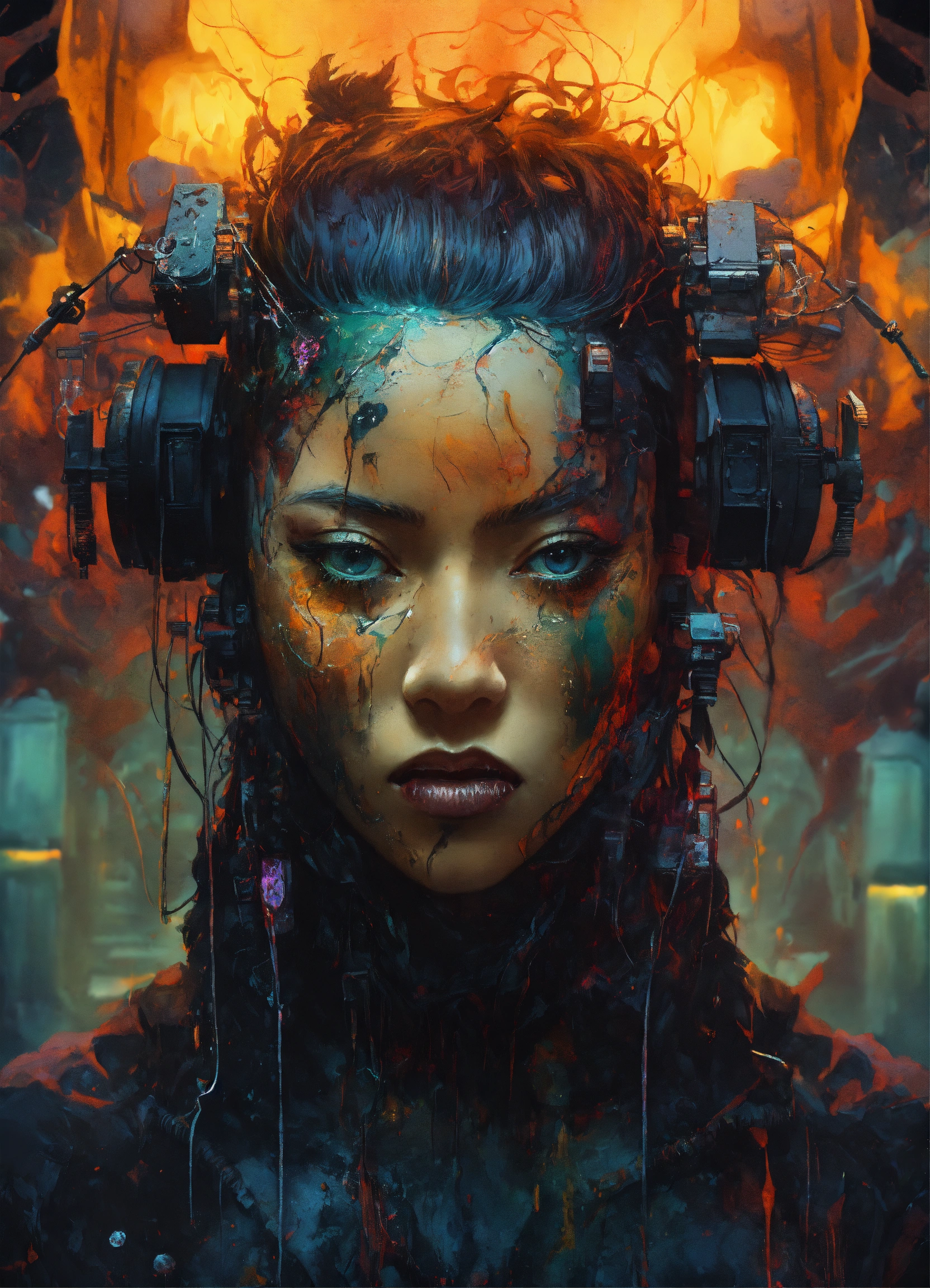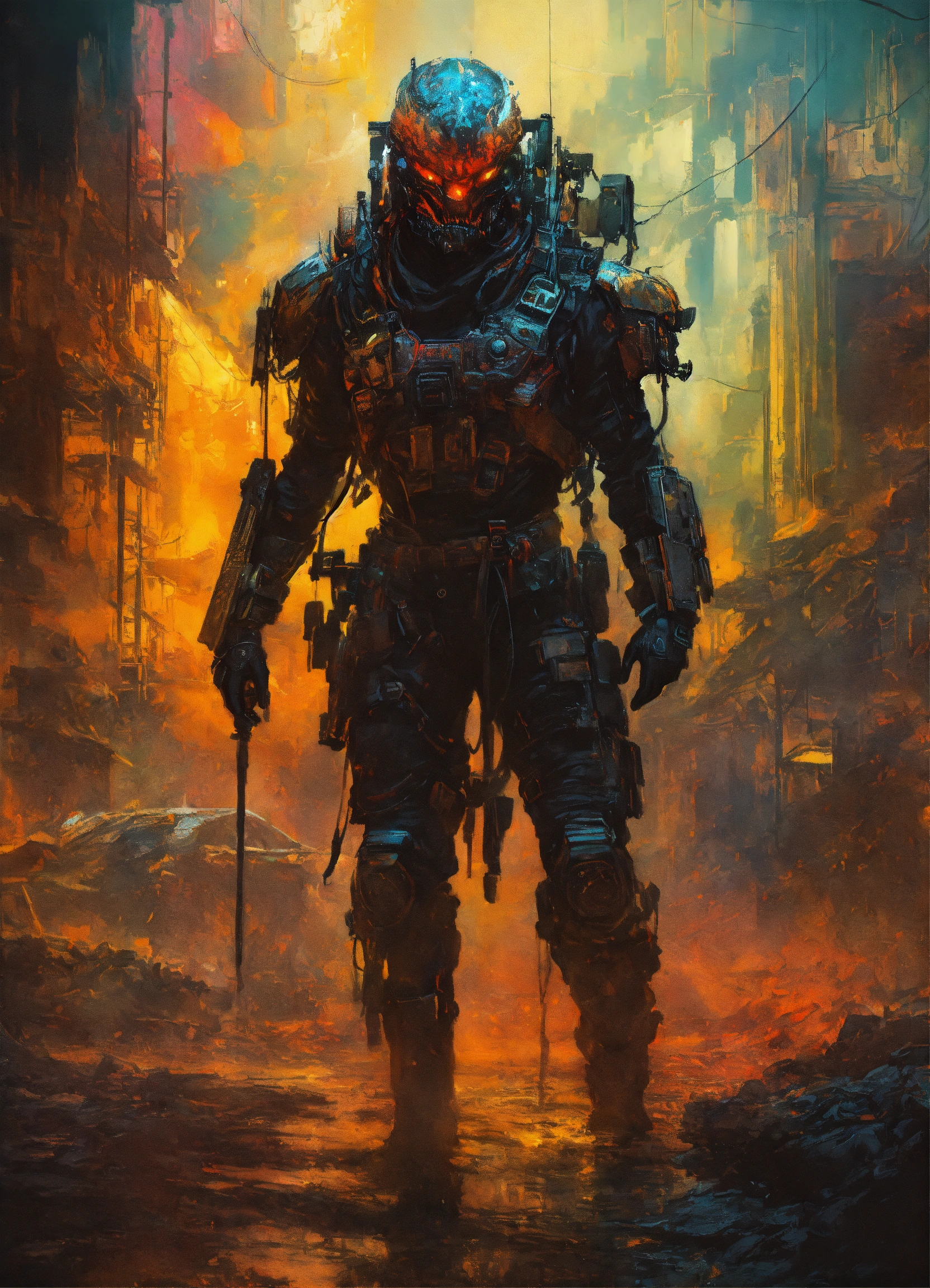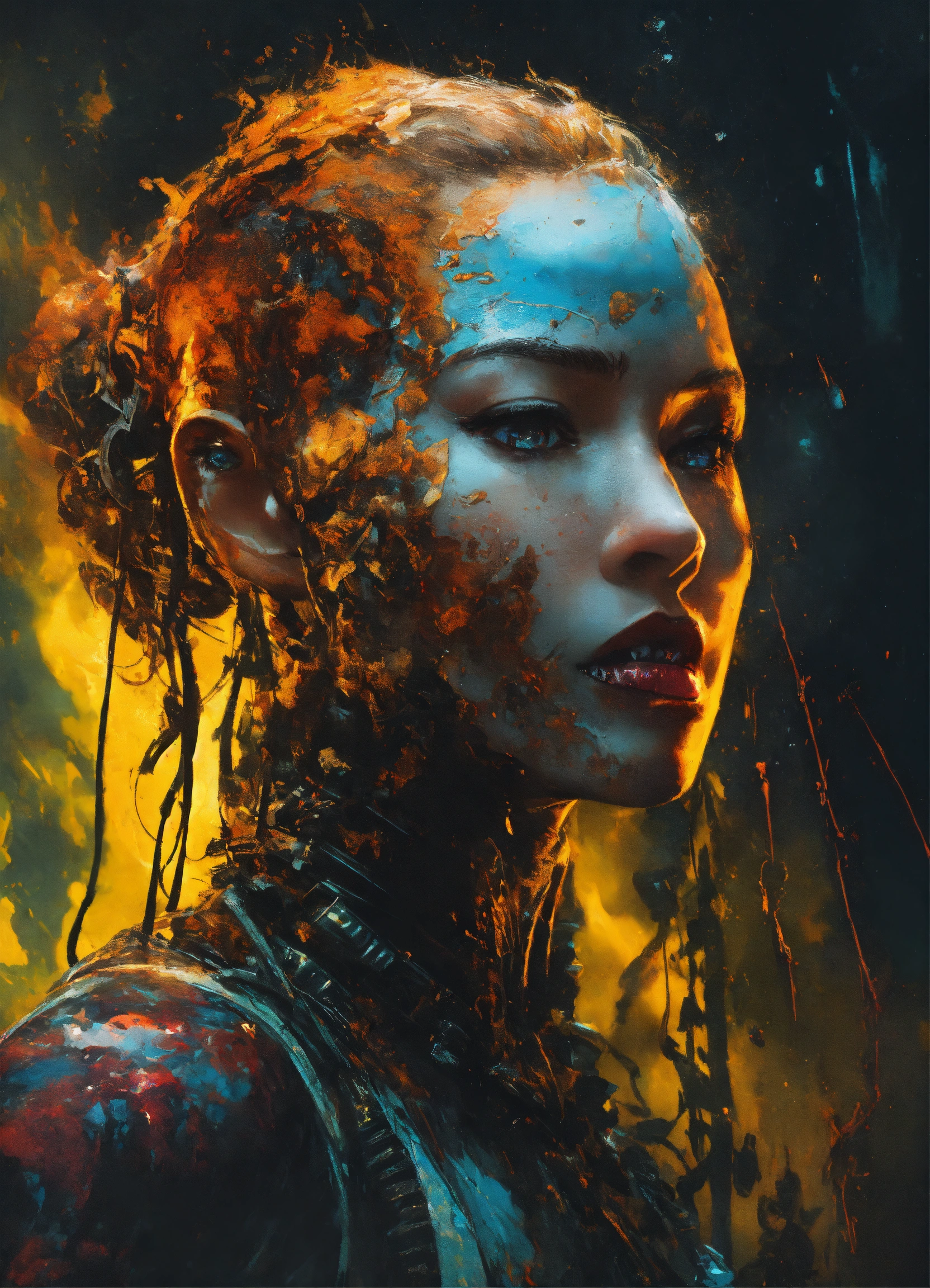 Mesmerizing double exposure photo illustration that masterfully merges the worlds of predator, android, venomous, sharp teeth, rage, corrupted, black spoils, scorn, savage, full body portrait, head on a black background, synesthesia meticulous moonscape elemental, photo-realistic hdr portrait, paper marbling, oil splash, oil stained, intricate hyperdetailed fluid gouache illustration, by ismail inceoglu, atsuko goto, tom bagshaw, cyberpunk gritty and rust color, tertiary color, intricate, 8k resolution