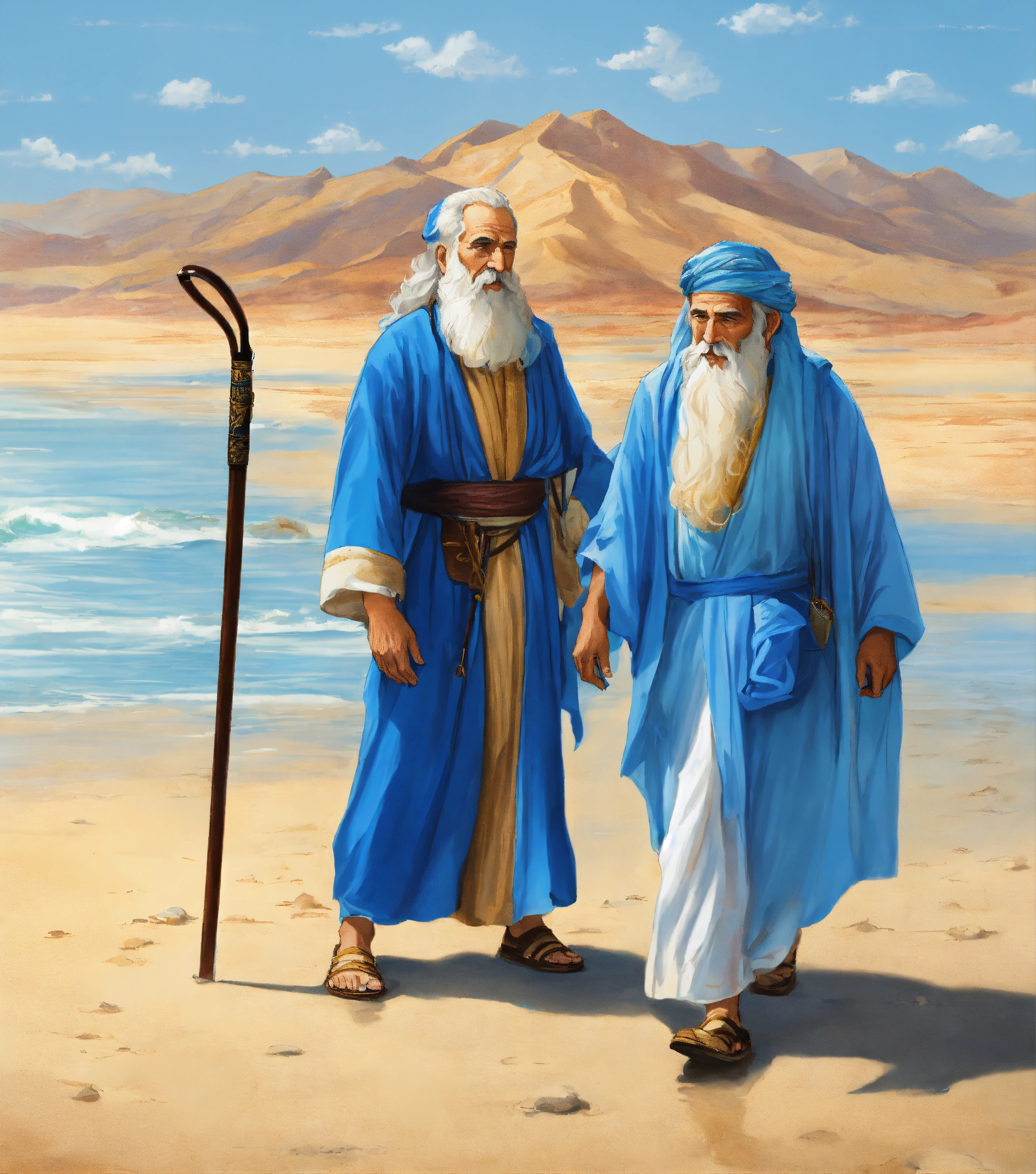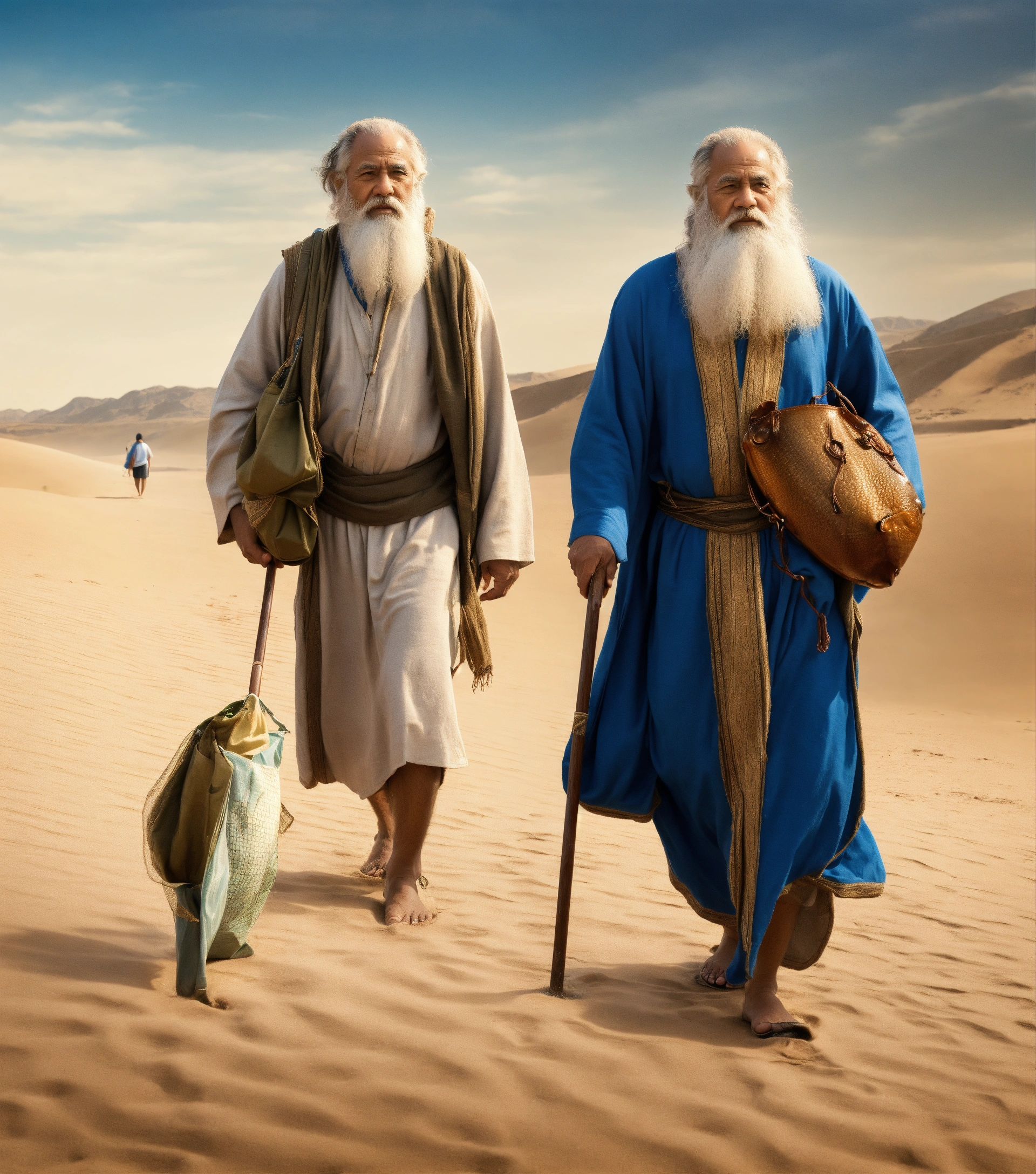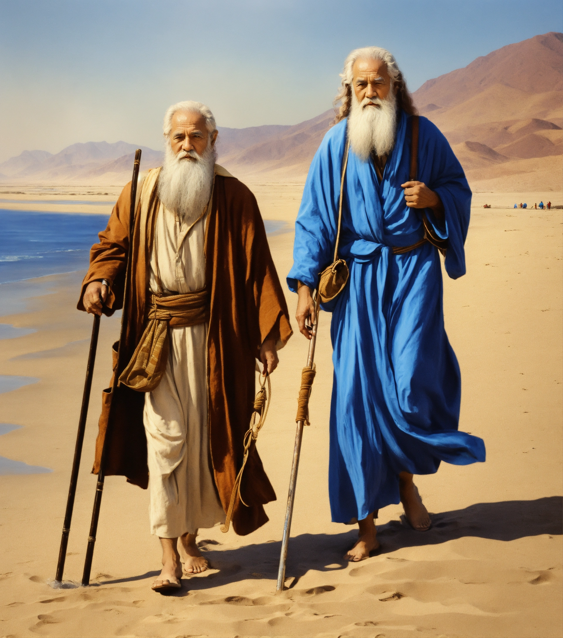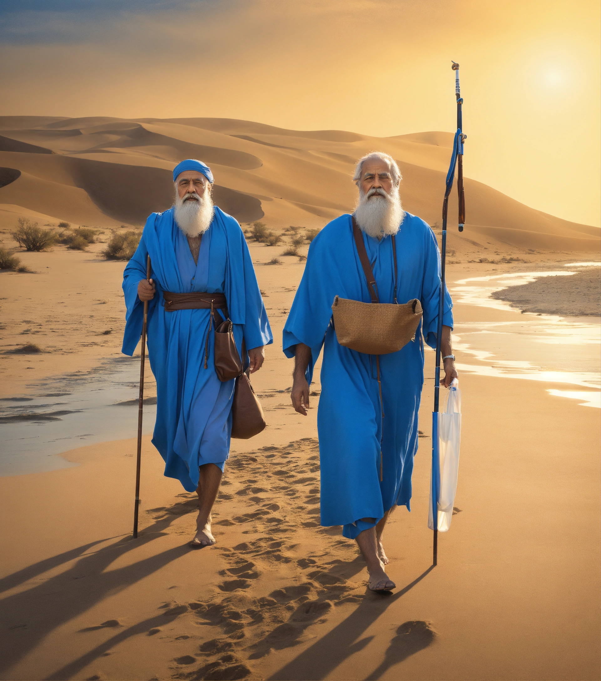Show both prophet moses and yusha walking on a desert beach, their left side is desert and their right side in the water. moses is carrying his cane with a white beard and wearing blue and young yusha 20 year old carrying a bag on his back. large fish inside the bag.
