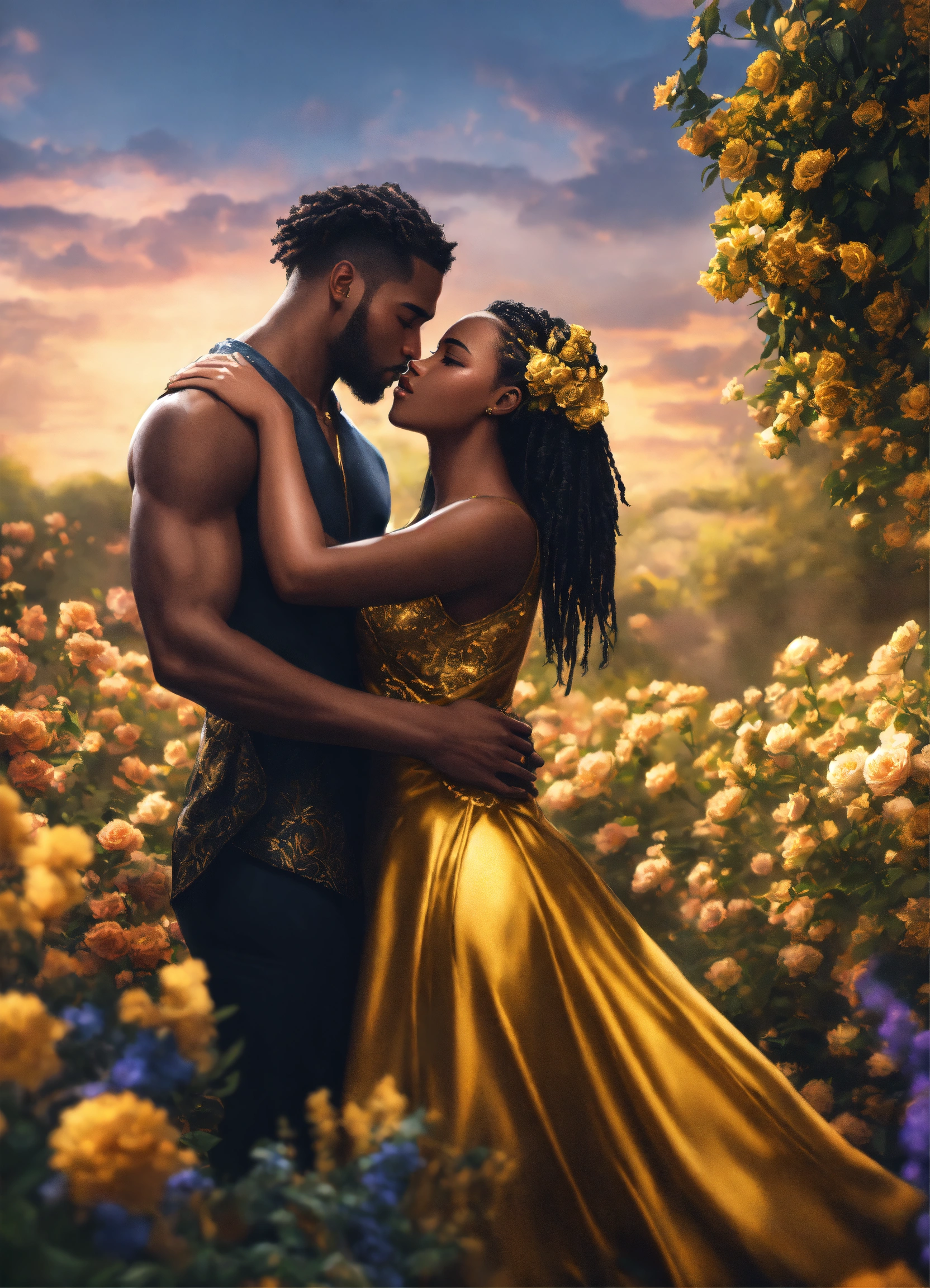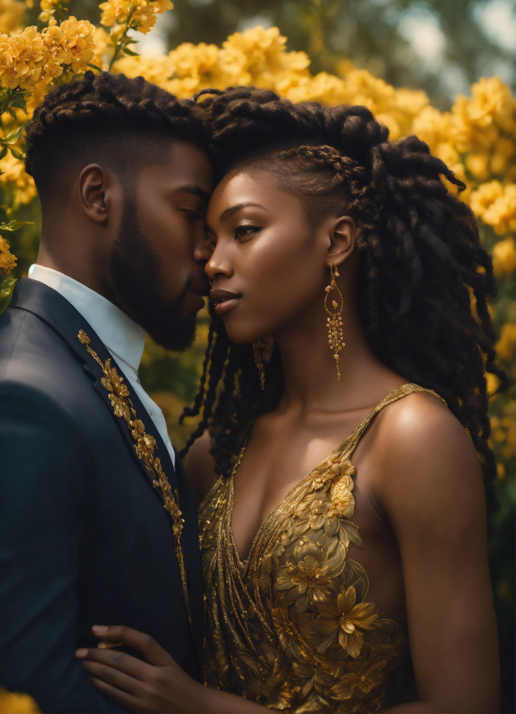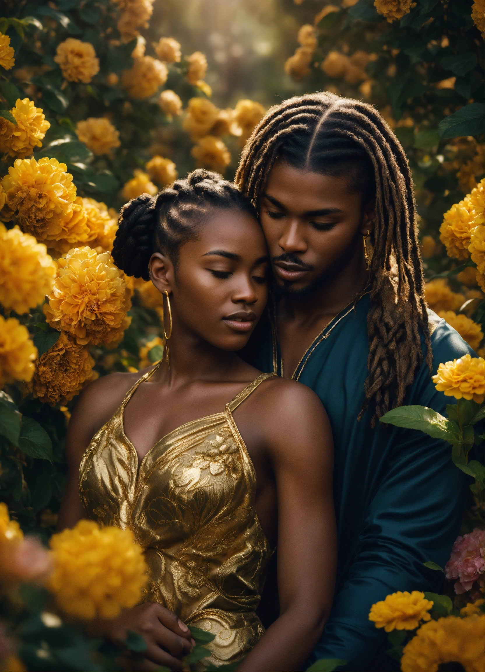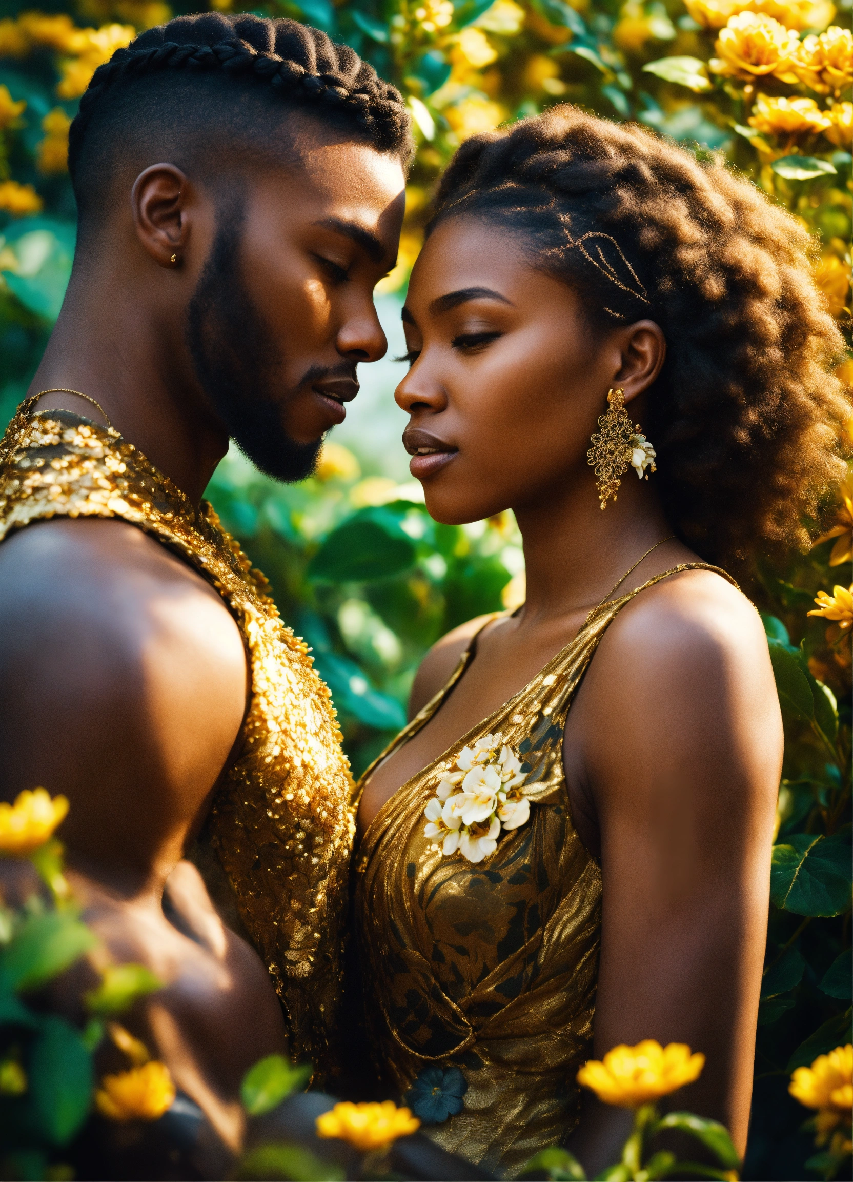 Young strong black man with short hair embracing a beautiful black girl with long braided hair wearing a gold dress in a flowering garden, fantasy, high detail, realistic photo, high detail, digital painting, cinematic, stunning, hyper-realistic, sharp focus, high resolution 8k, insanely detailed
