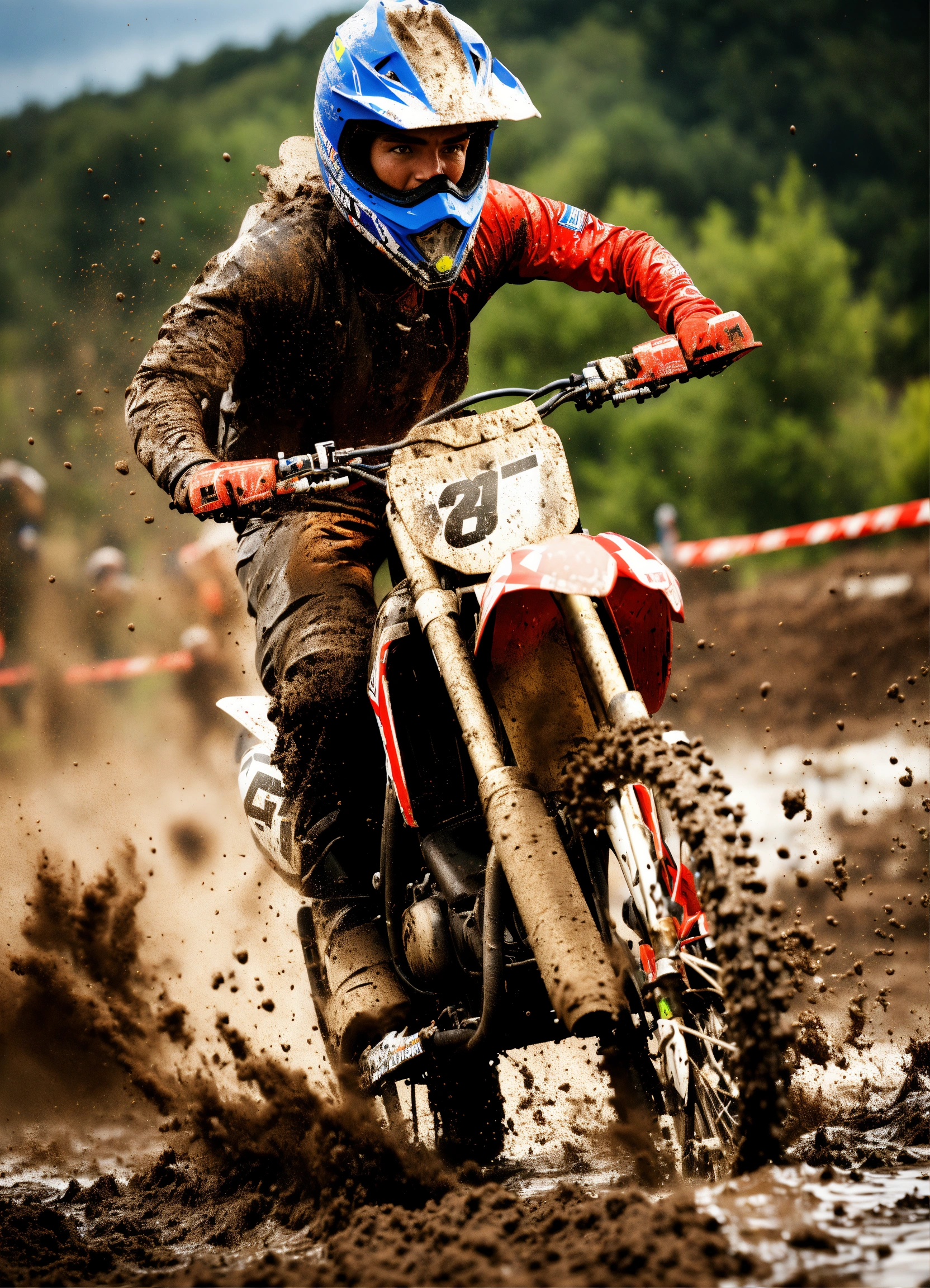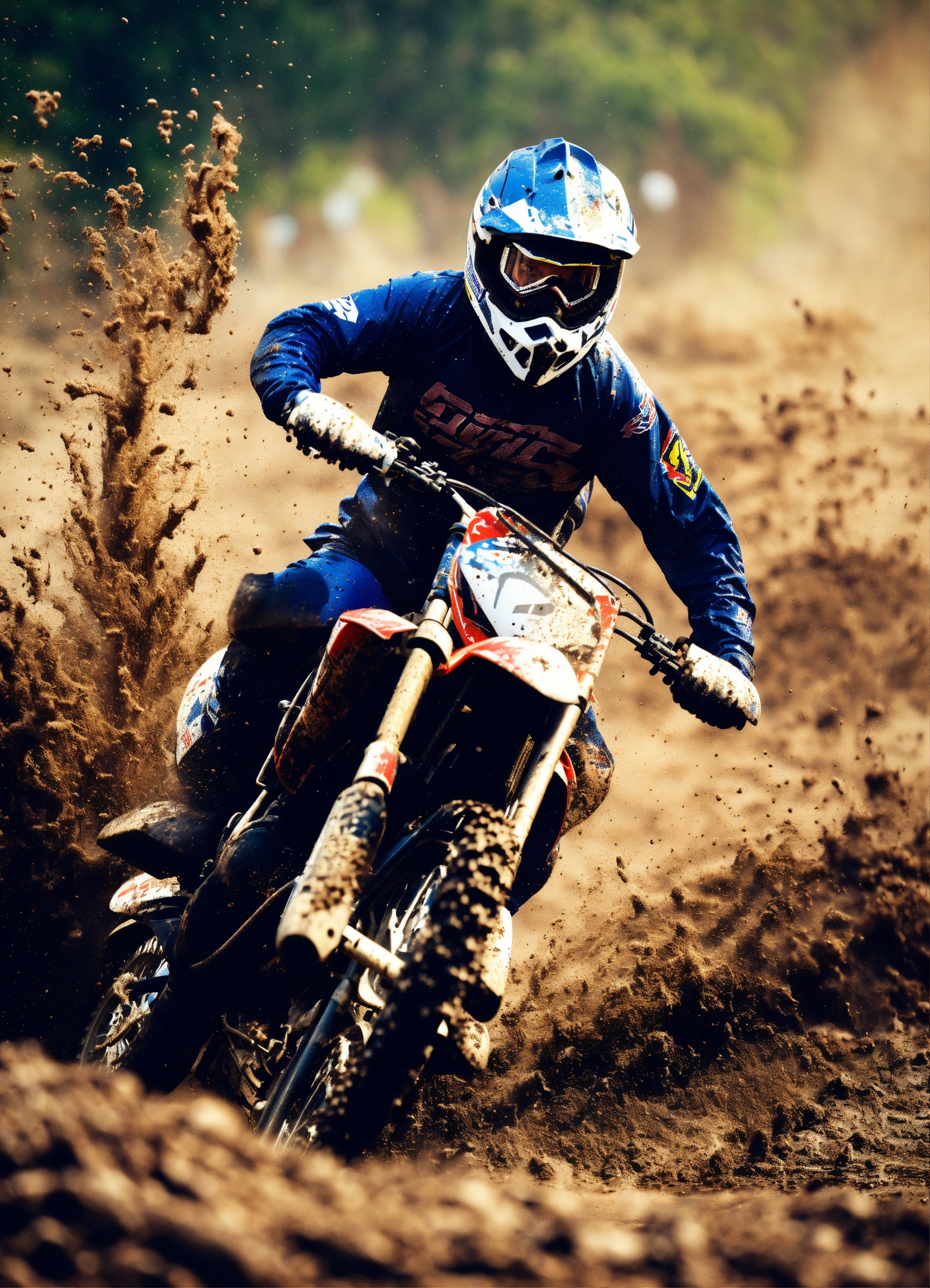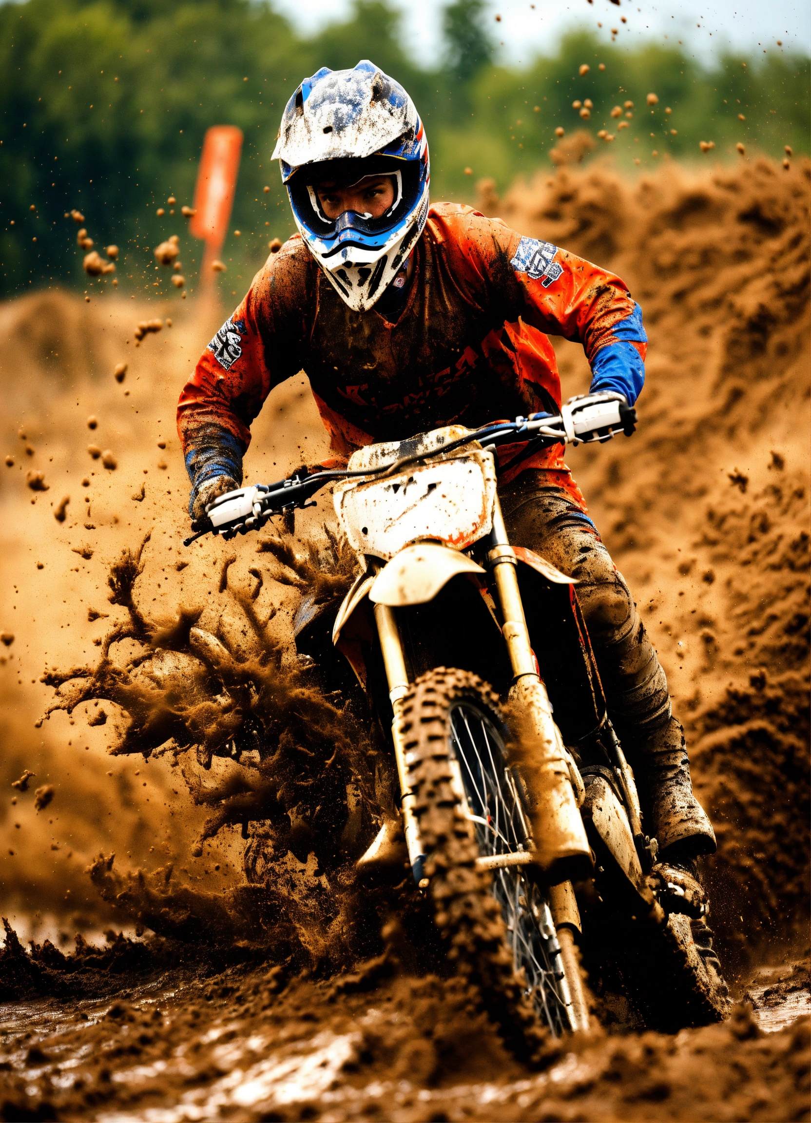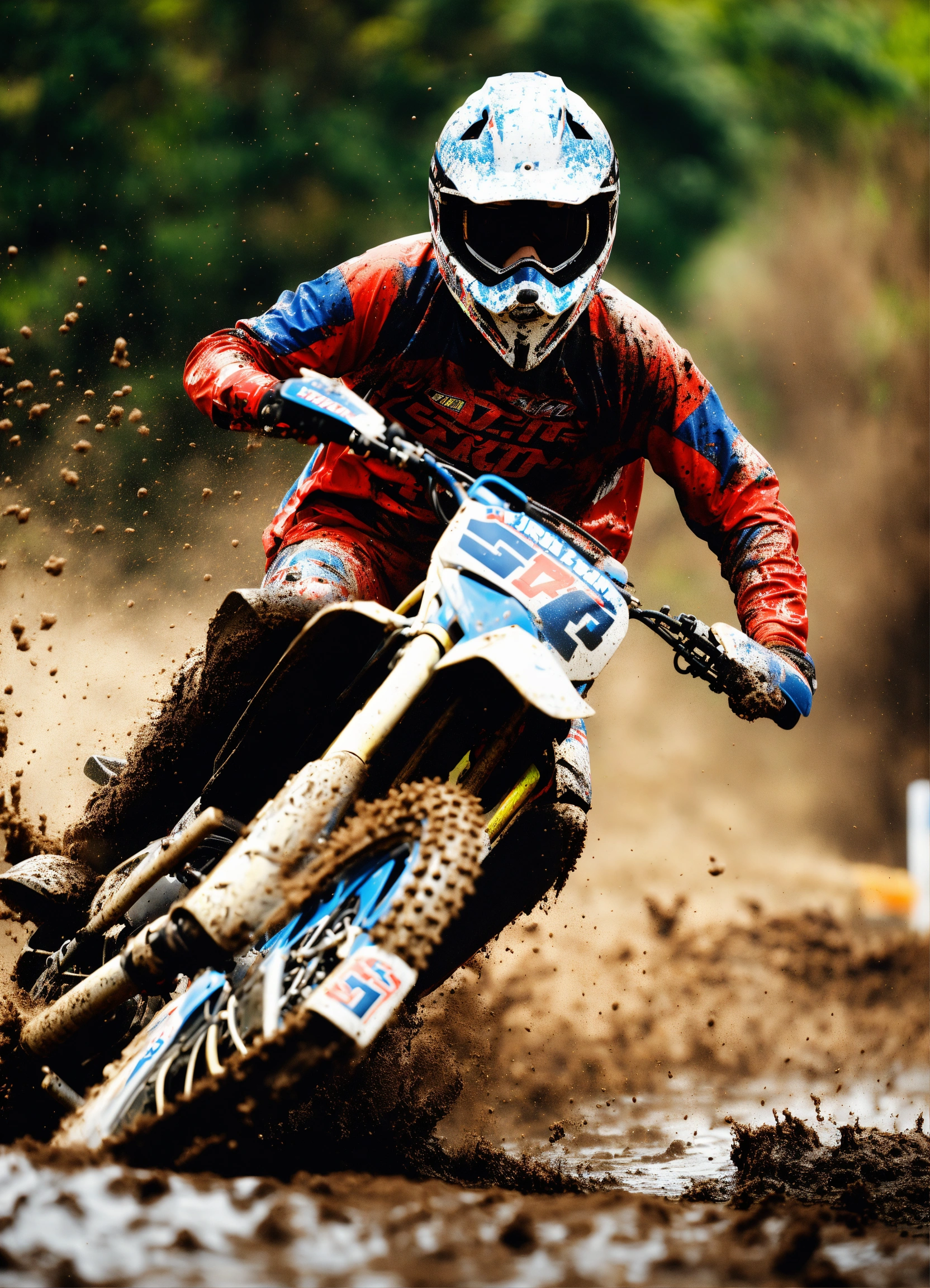 A realistic close-up of a motocross rider taking a turn with lots of mud splashing towards the camera