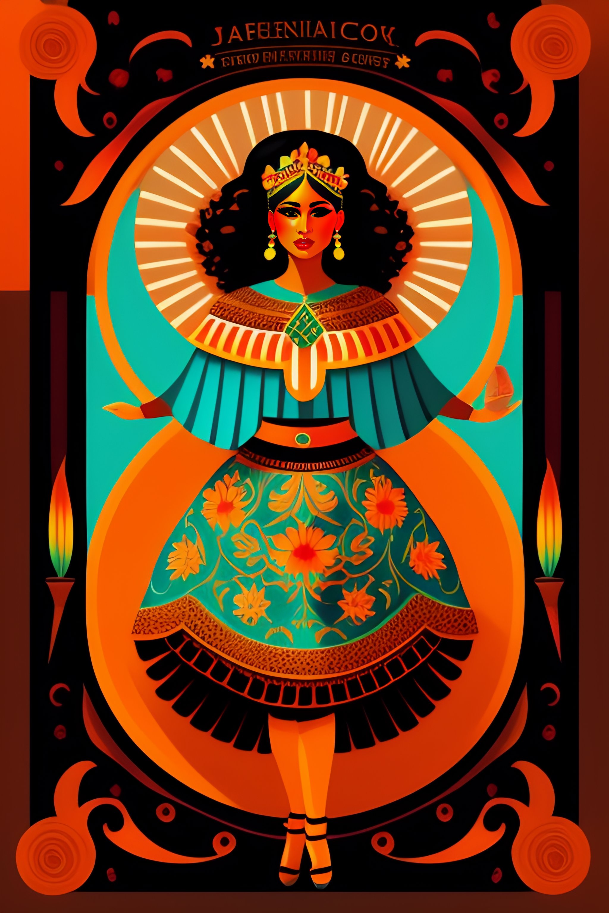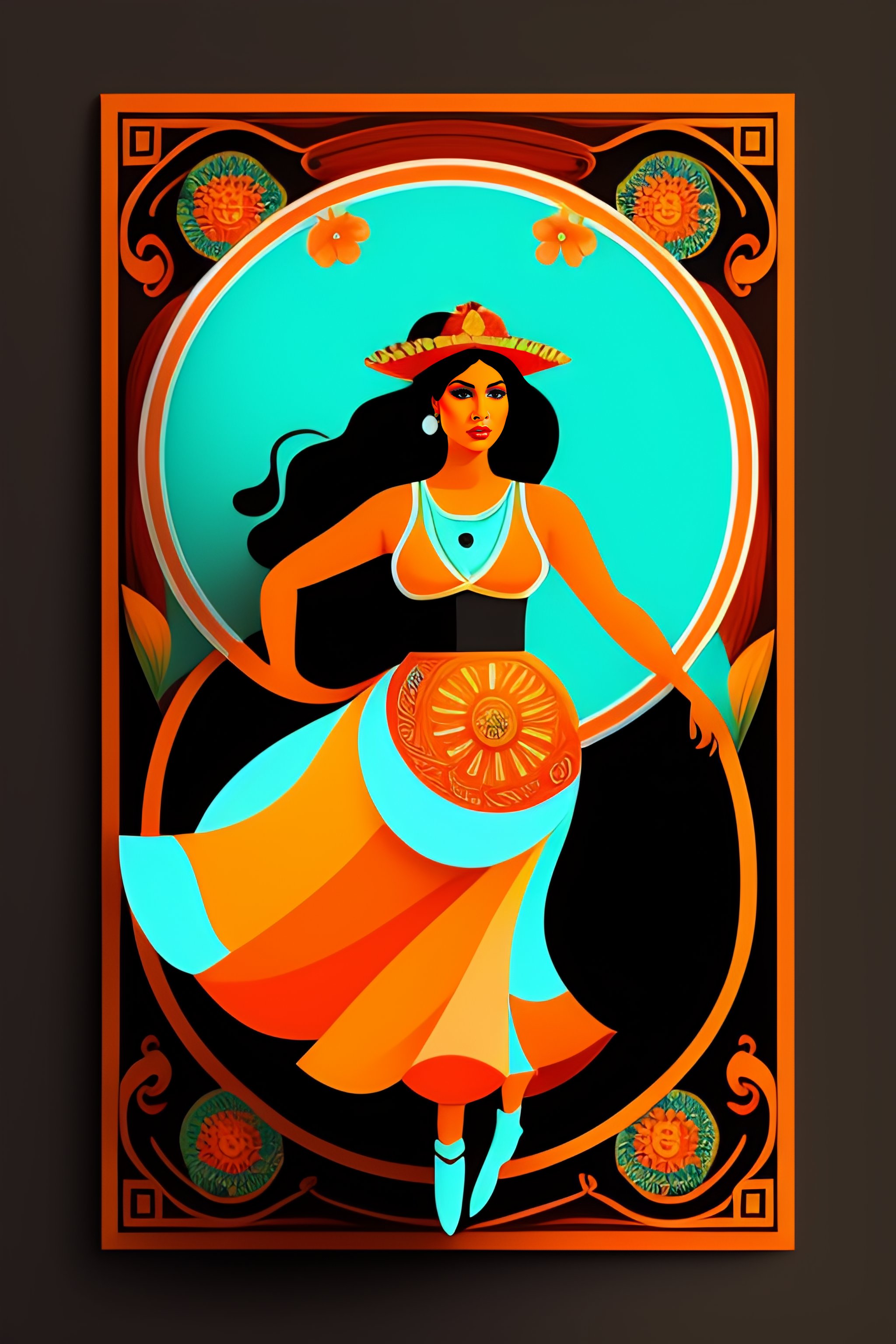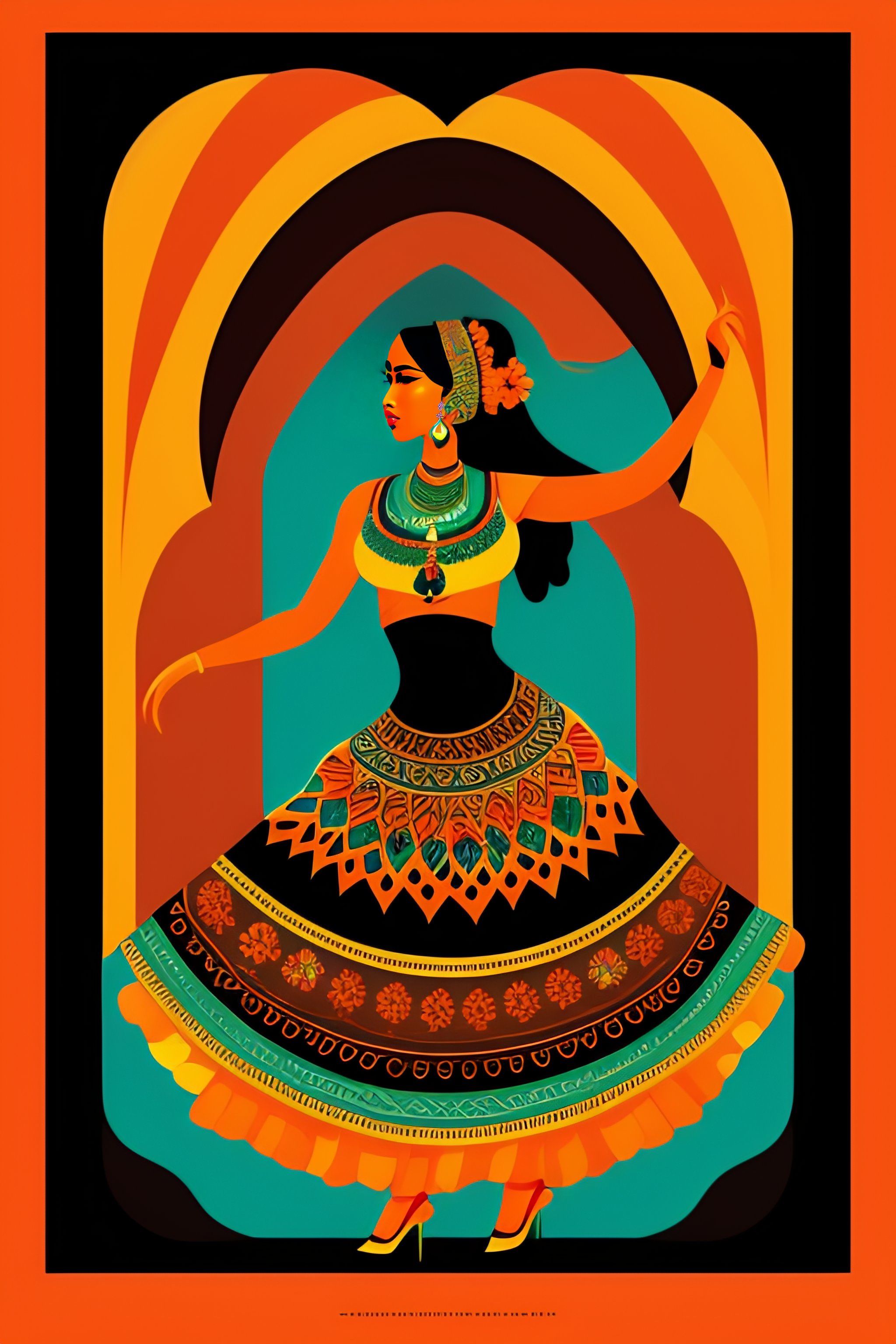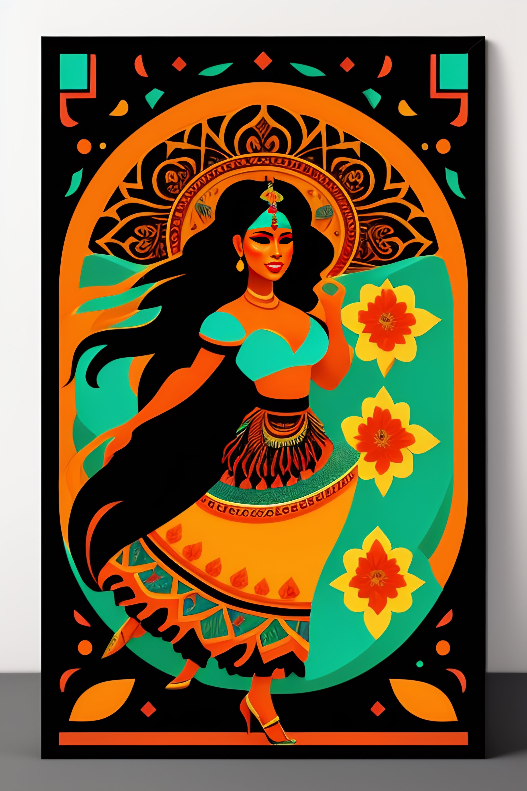 Vector flat flyer, flyer flat vector 2d image of a female flamenco dancer surrounded by mexican ornamental elements such as mates, flowers, garlands of lights and native plants, colors orange, turquoise and black
