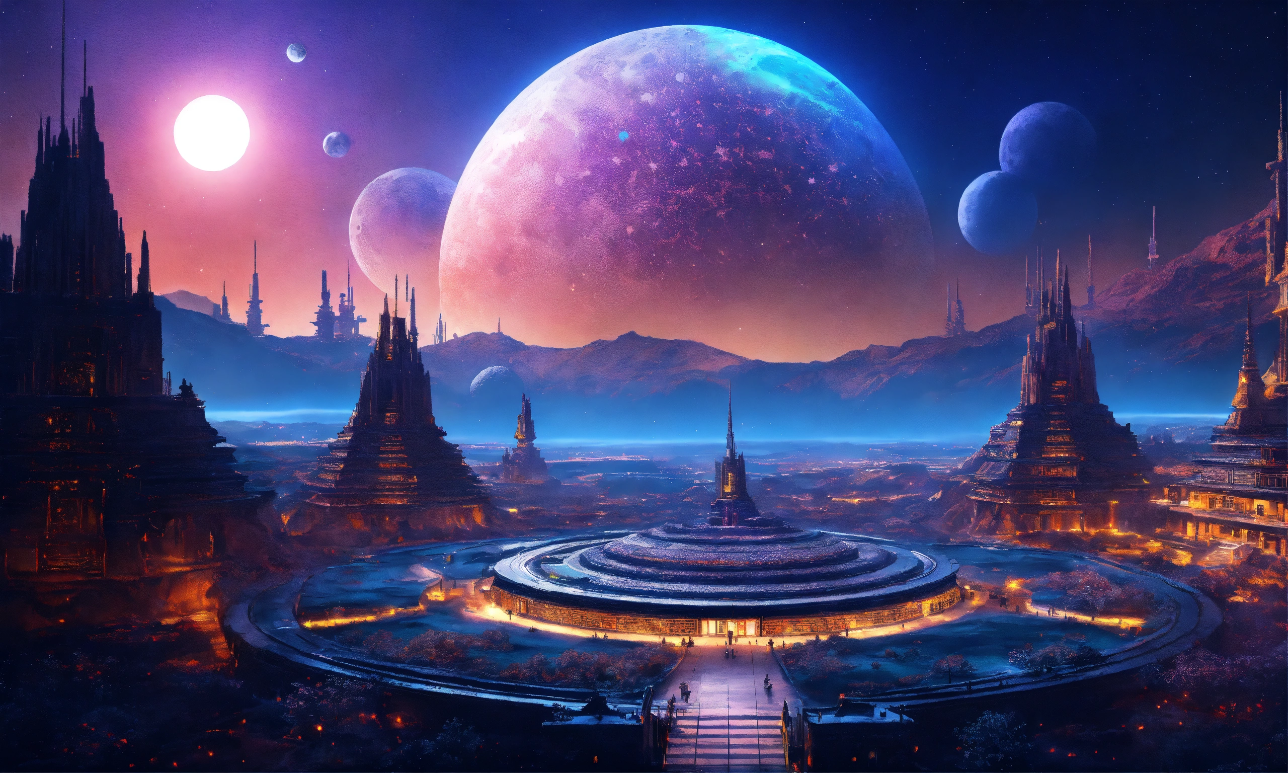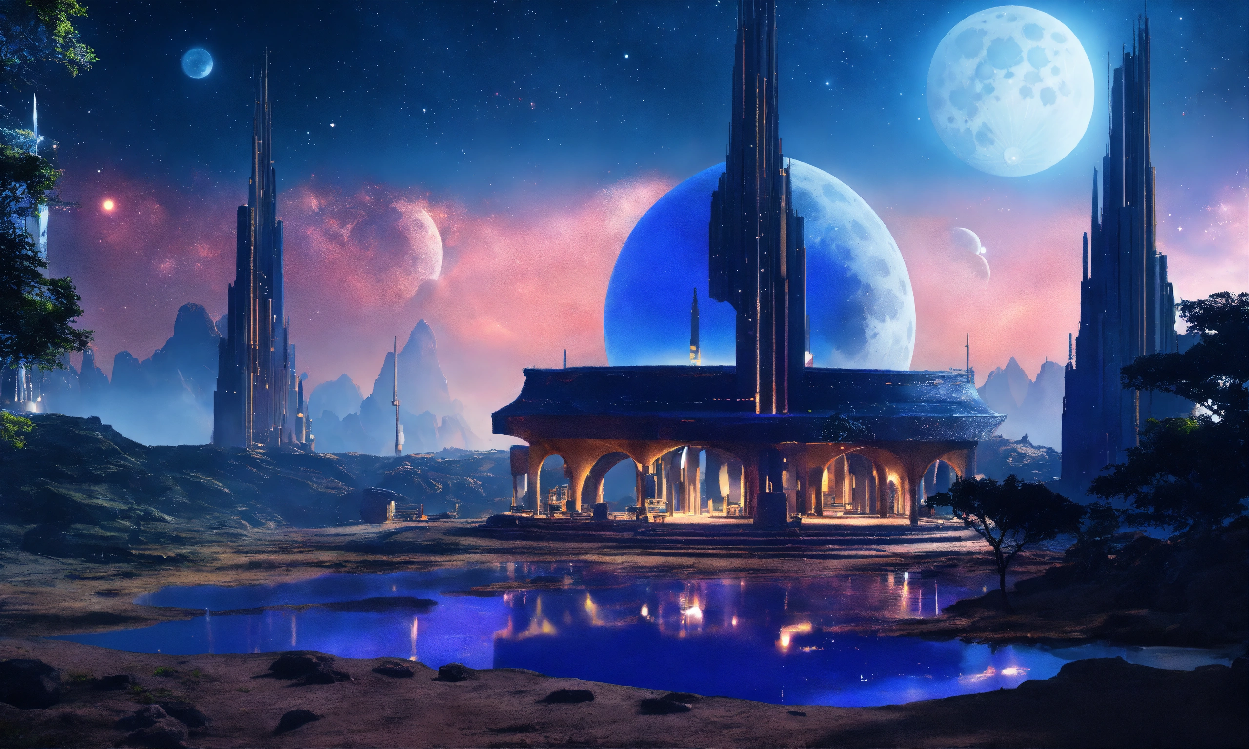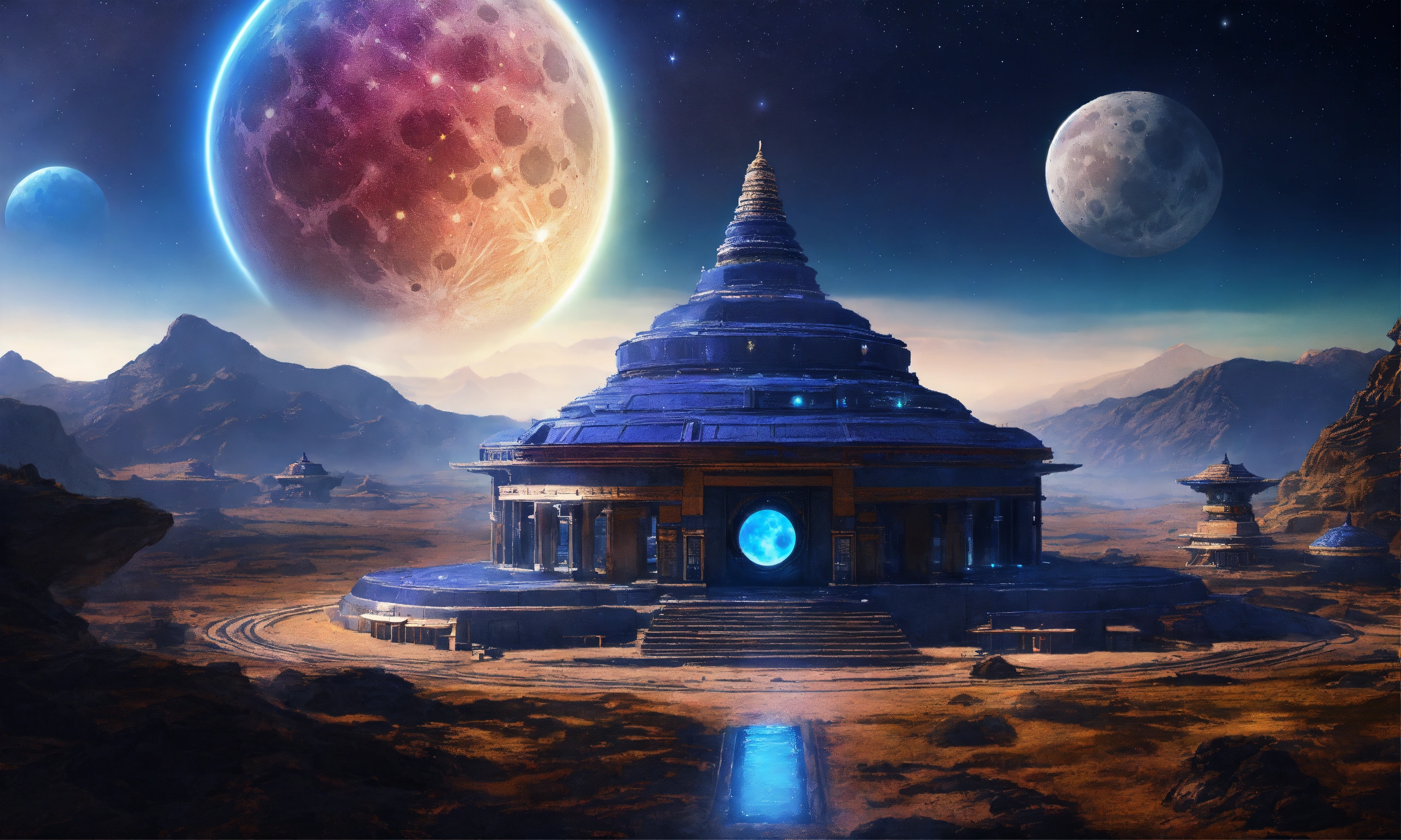 Distant view of a large round indigo temple in the center of a futuristic community, extraterrestrial landscape, dream planet, sensation of immensity, self-luminescent crystals emerging from the surface of the ground, the moon and stars can be seen in the sky even during the day