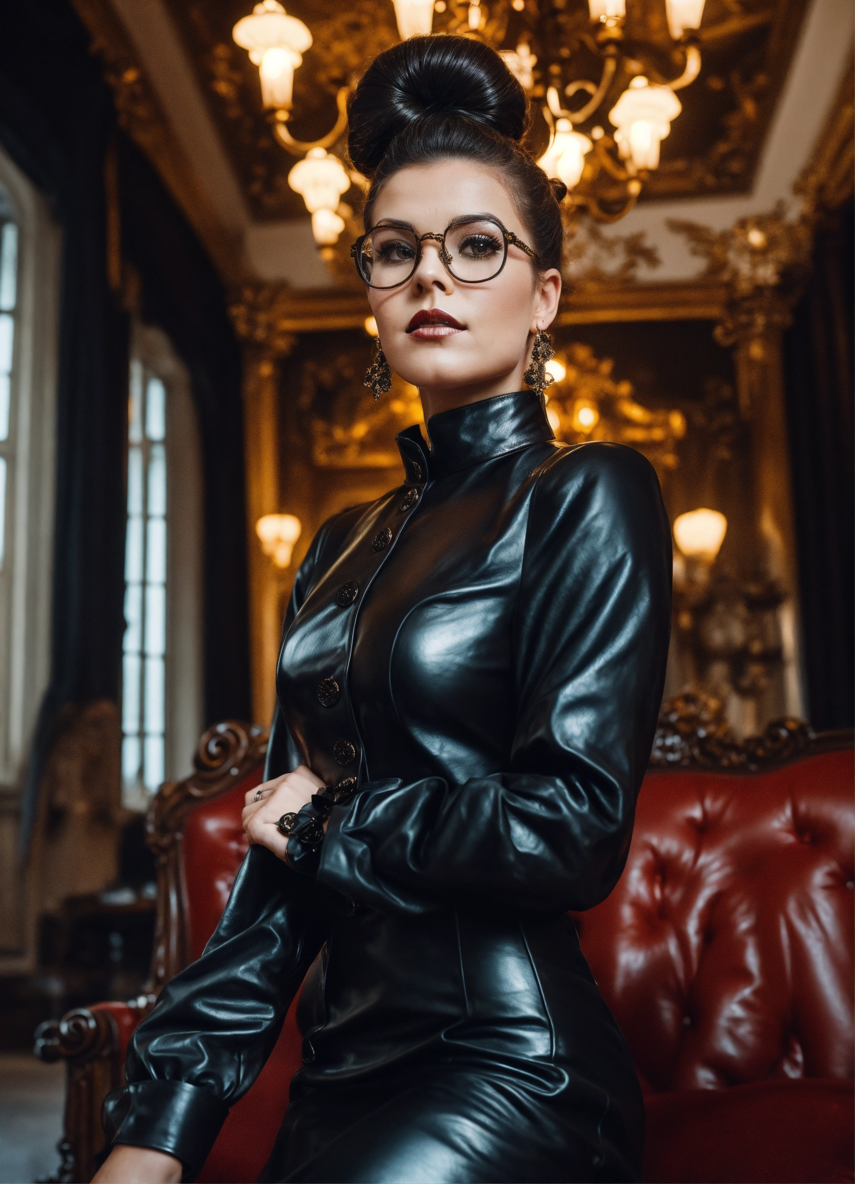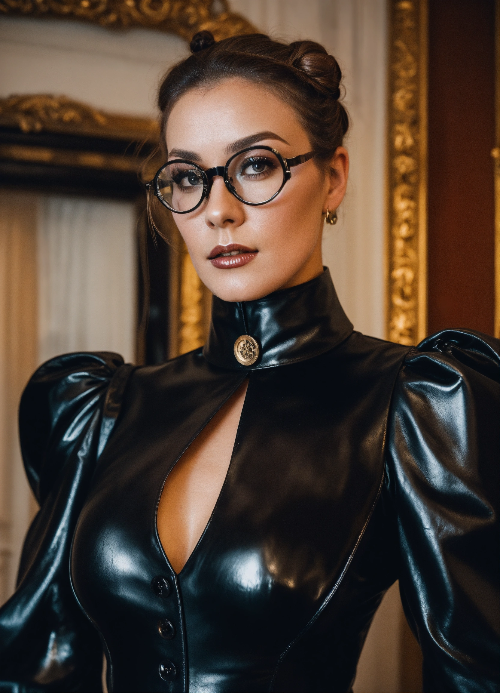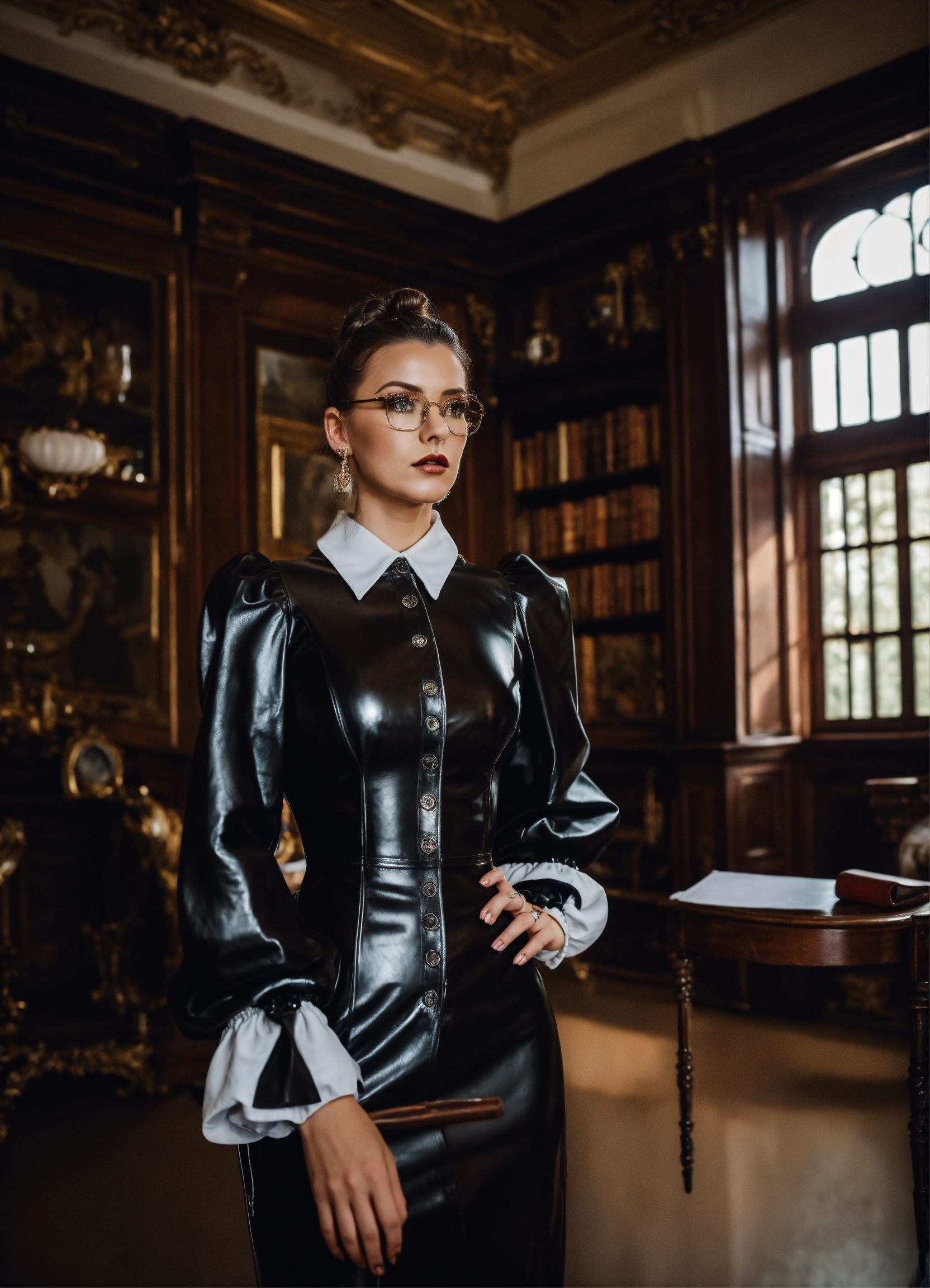 Worm's eye view, stunning female german mistress model, strict looking, glasses, hair bun, black victorian governess shiny leather dress with big buttons, big long puff sleeves, shirt collar, mansion room