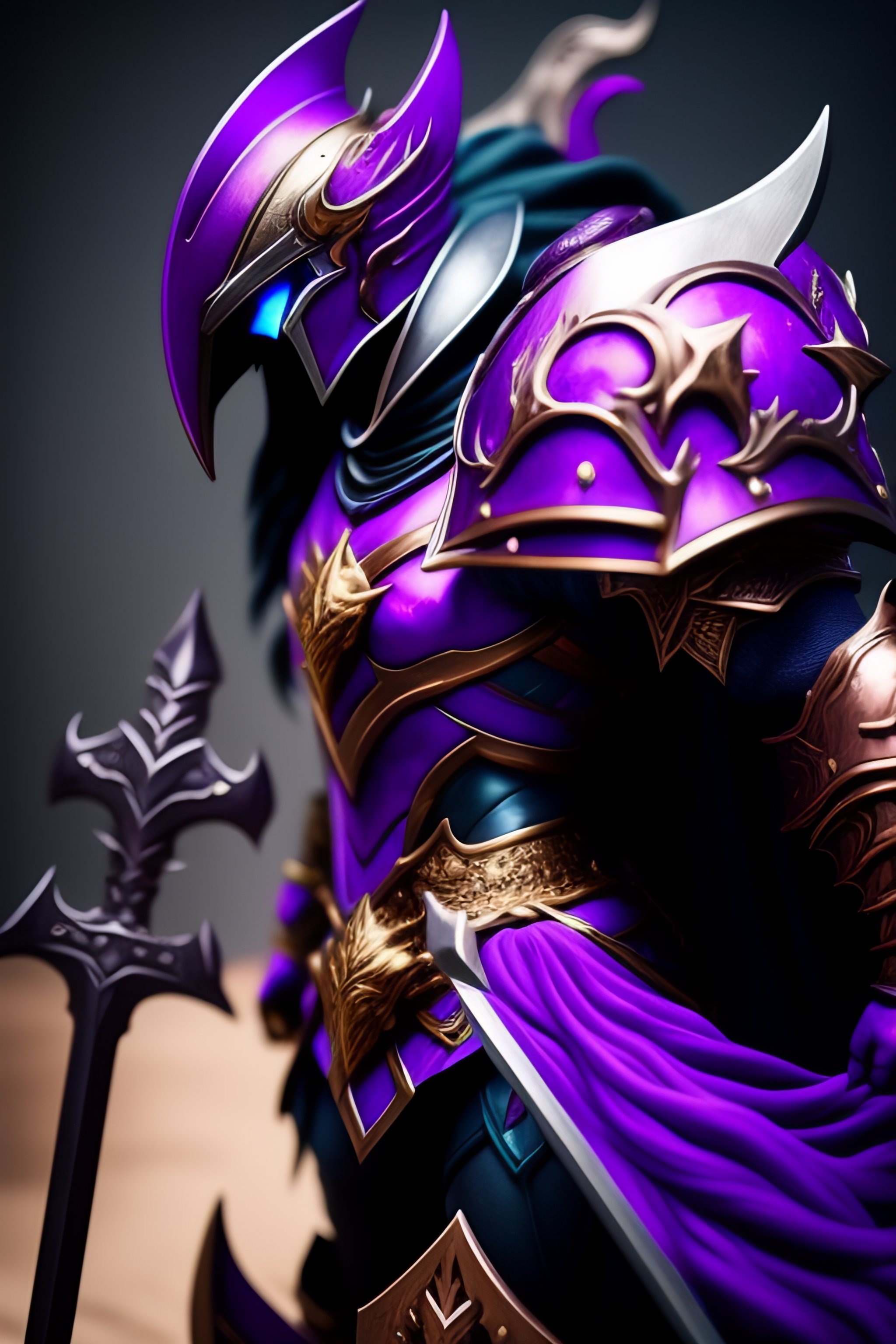 Mordekaiser from league of legends with purple details on armor, using purple sword, using skull shield, full body