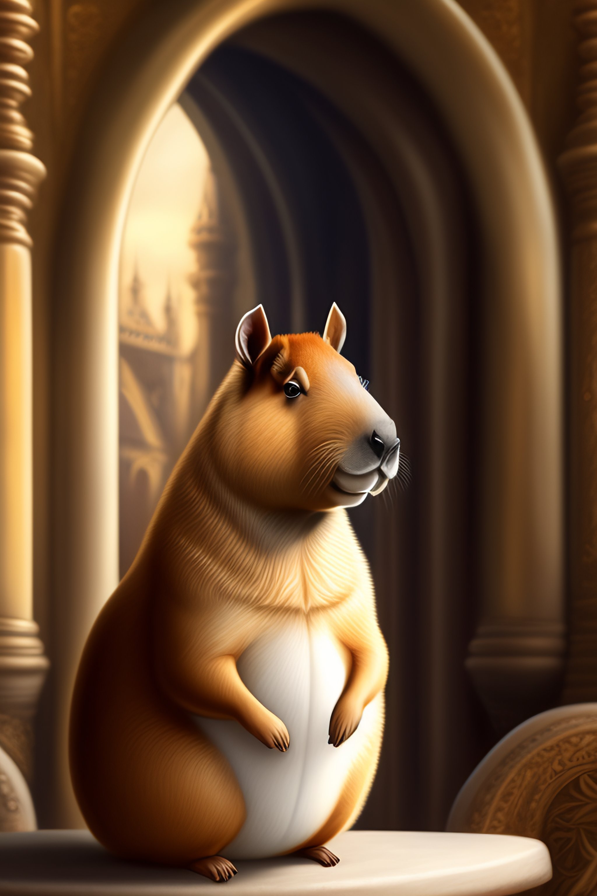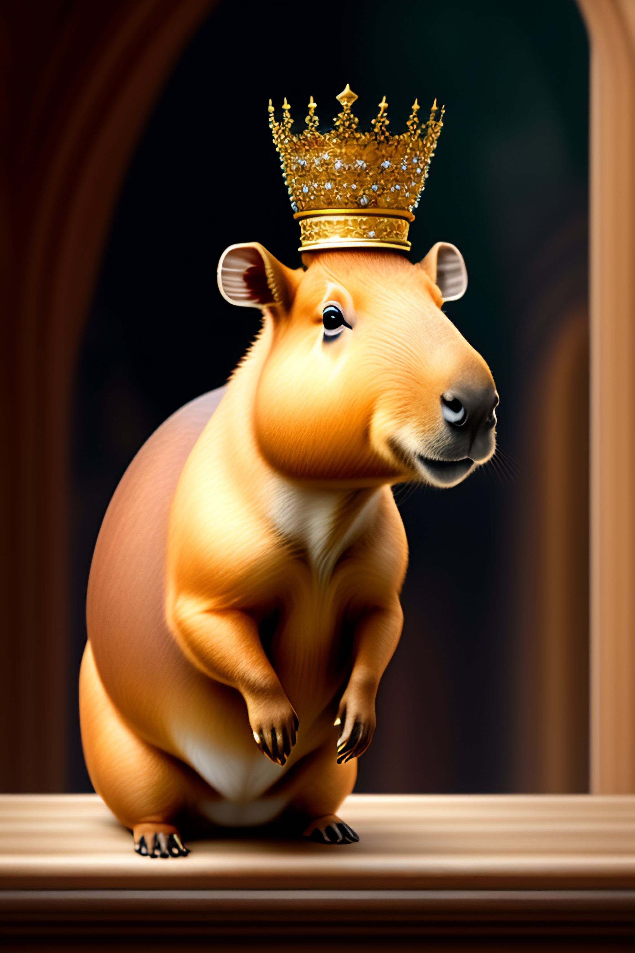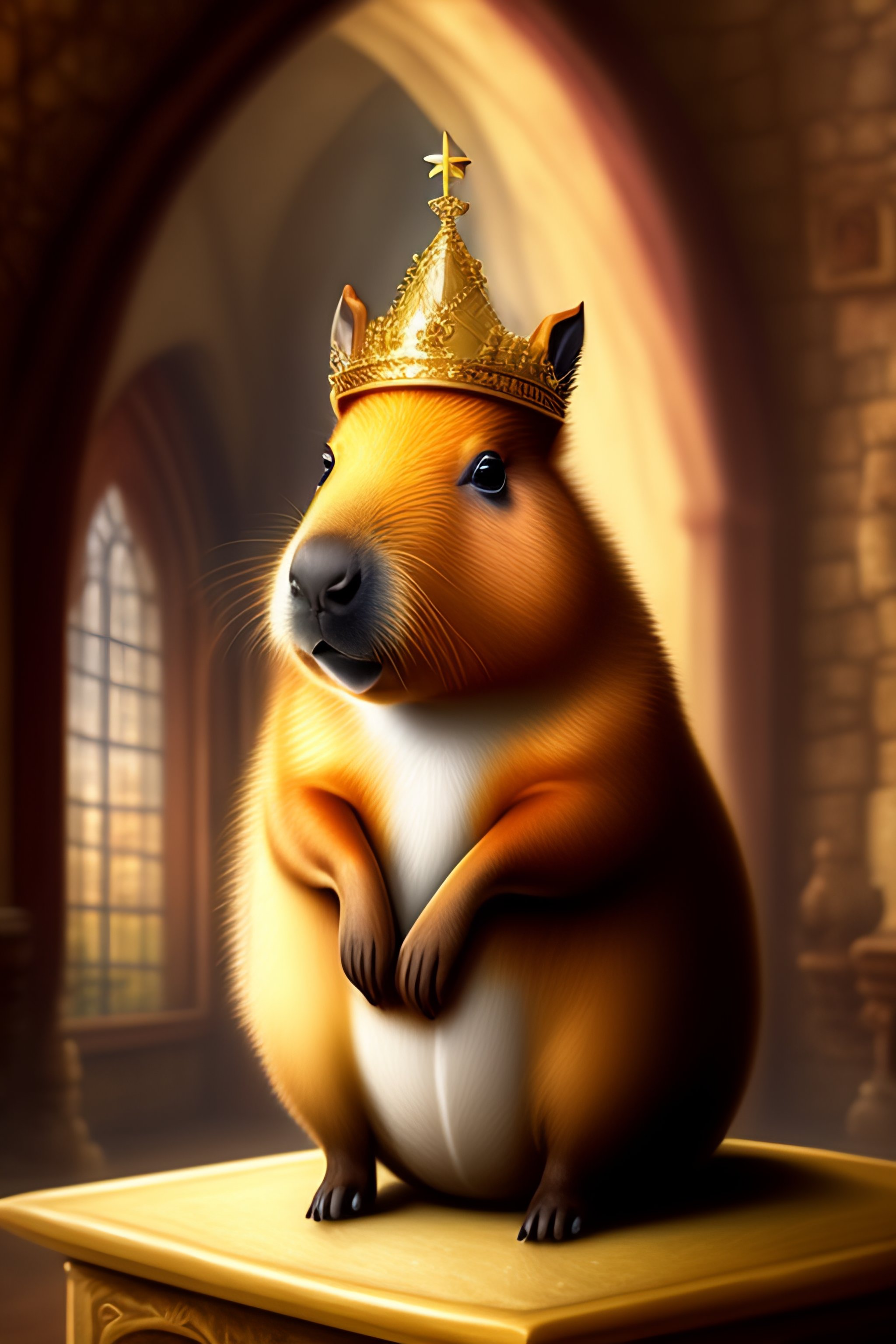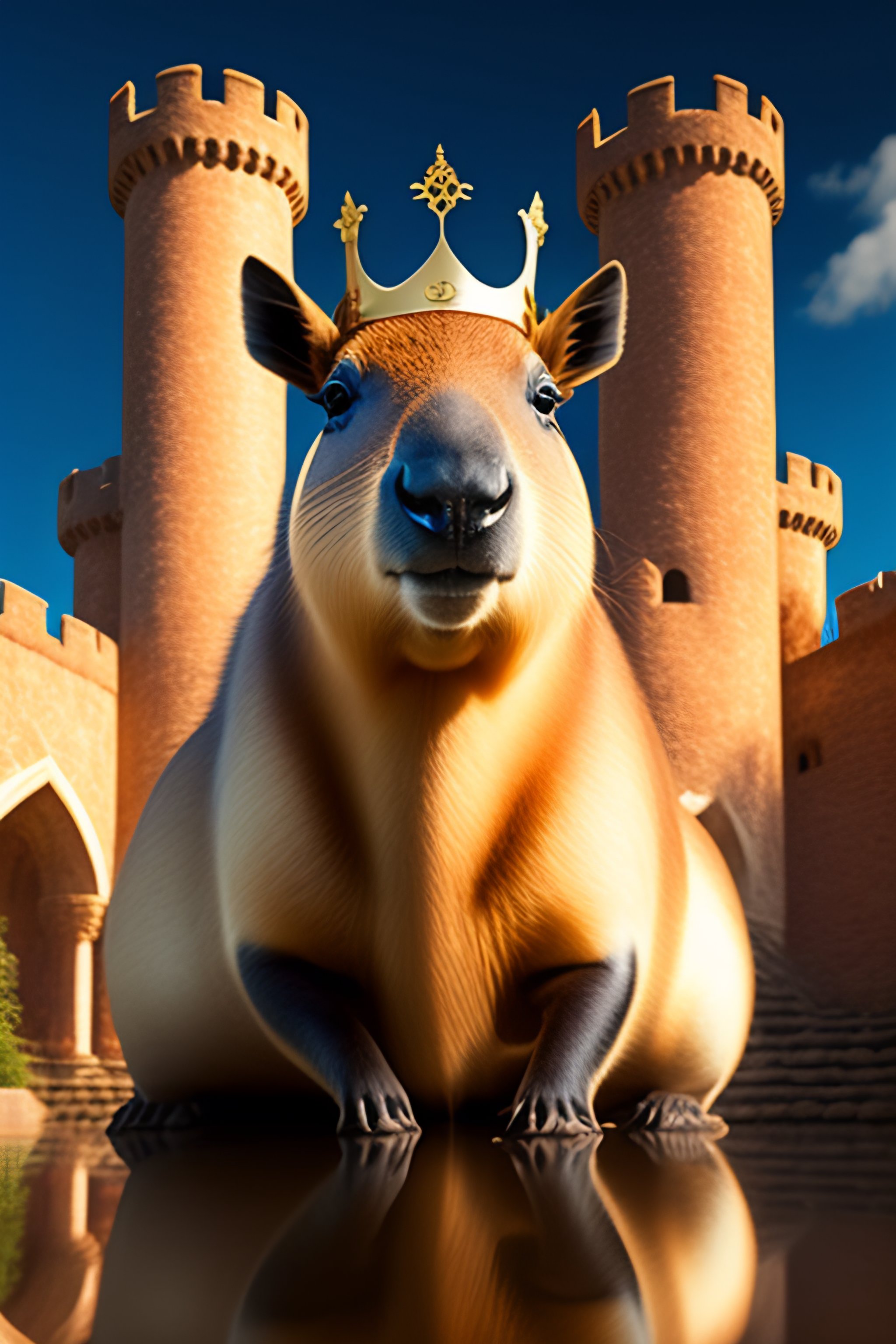 A cartoon drawing of a capybara in a castle with a crown on its head