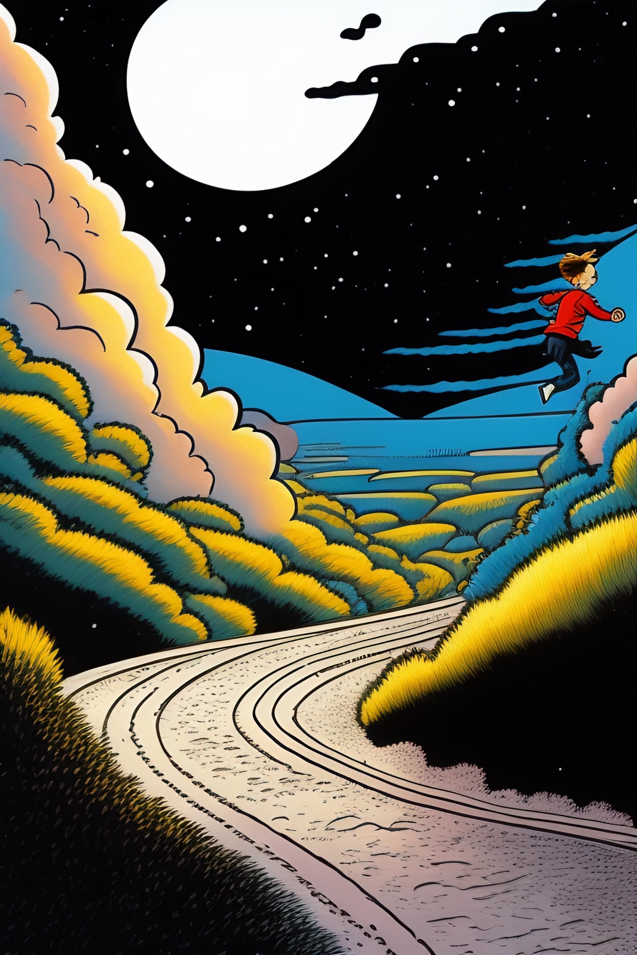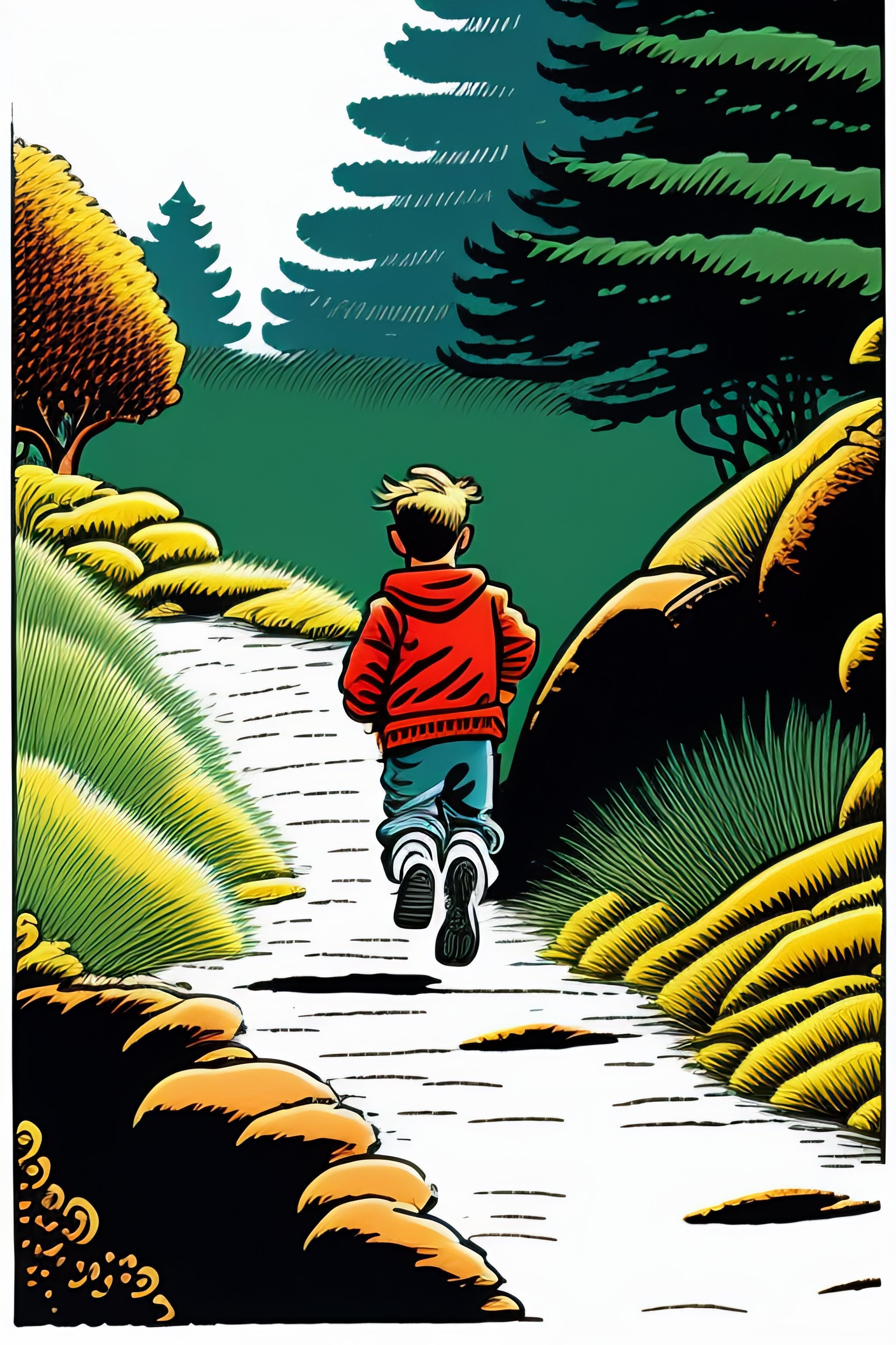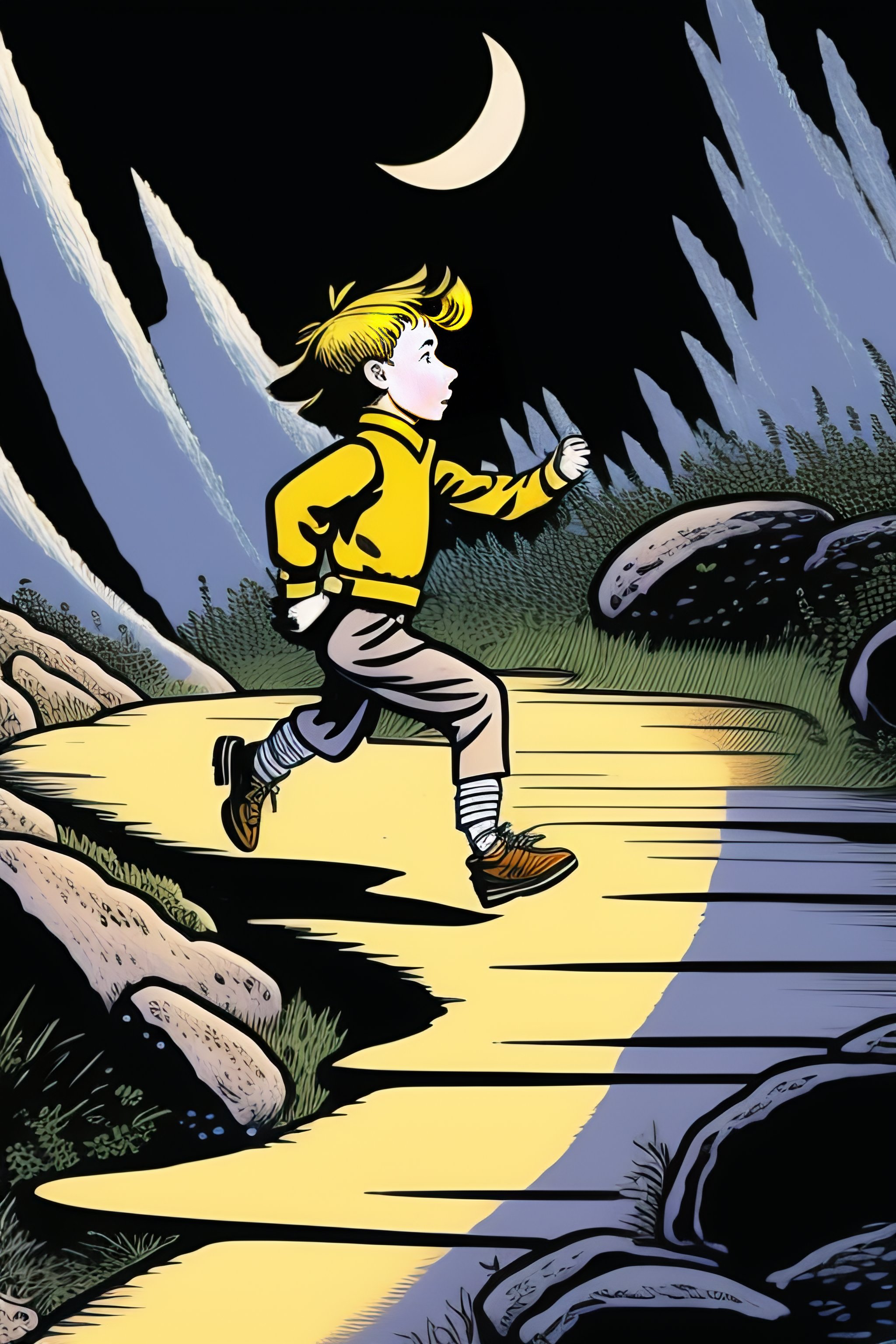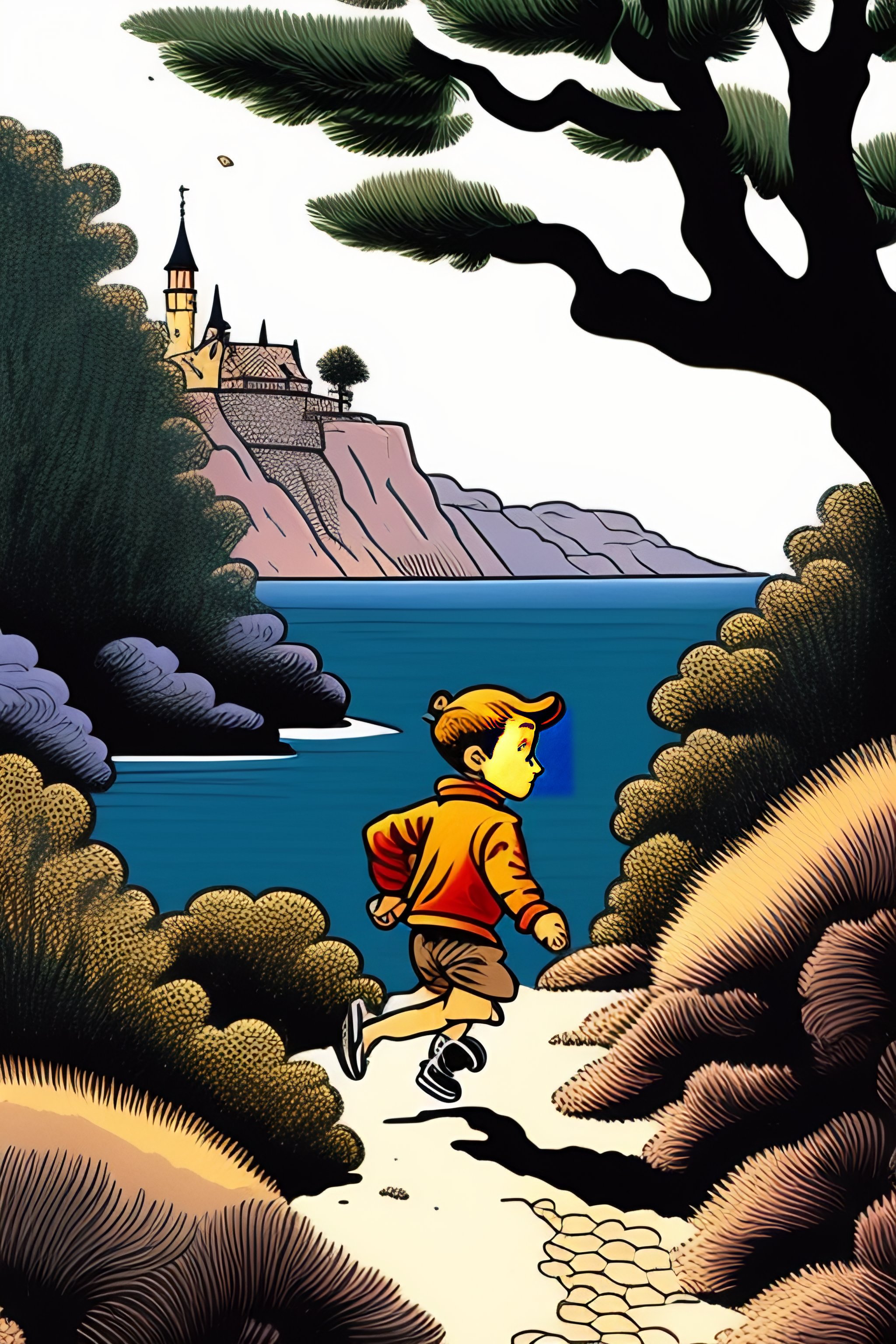 illustrated by hergé. a boy running away to escape the world and all of his problems.