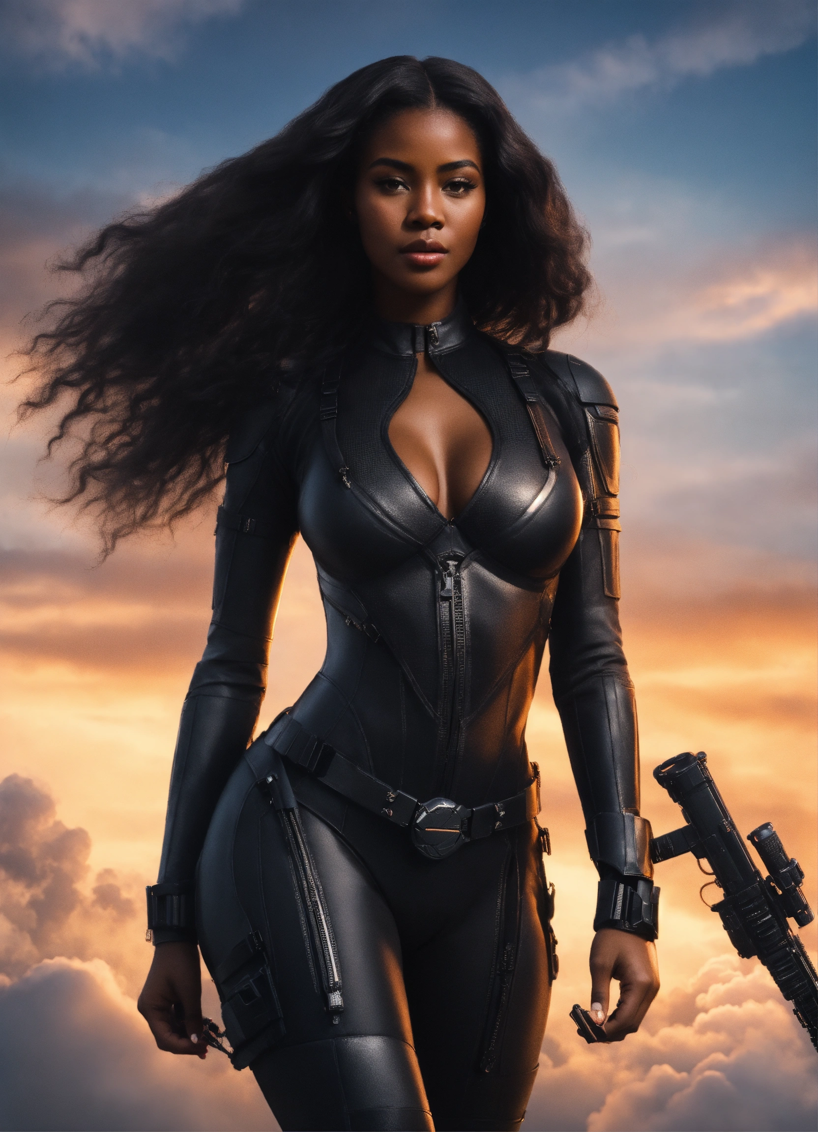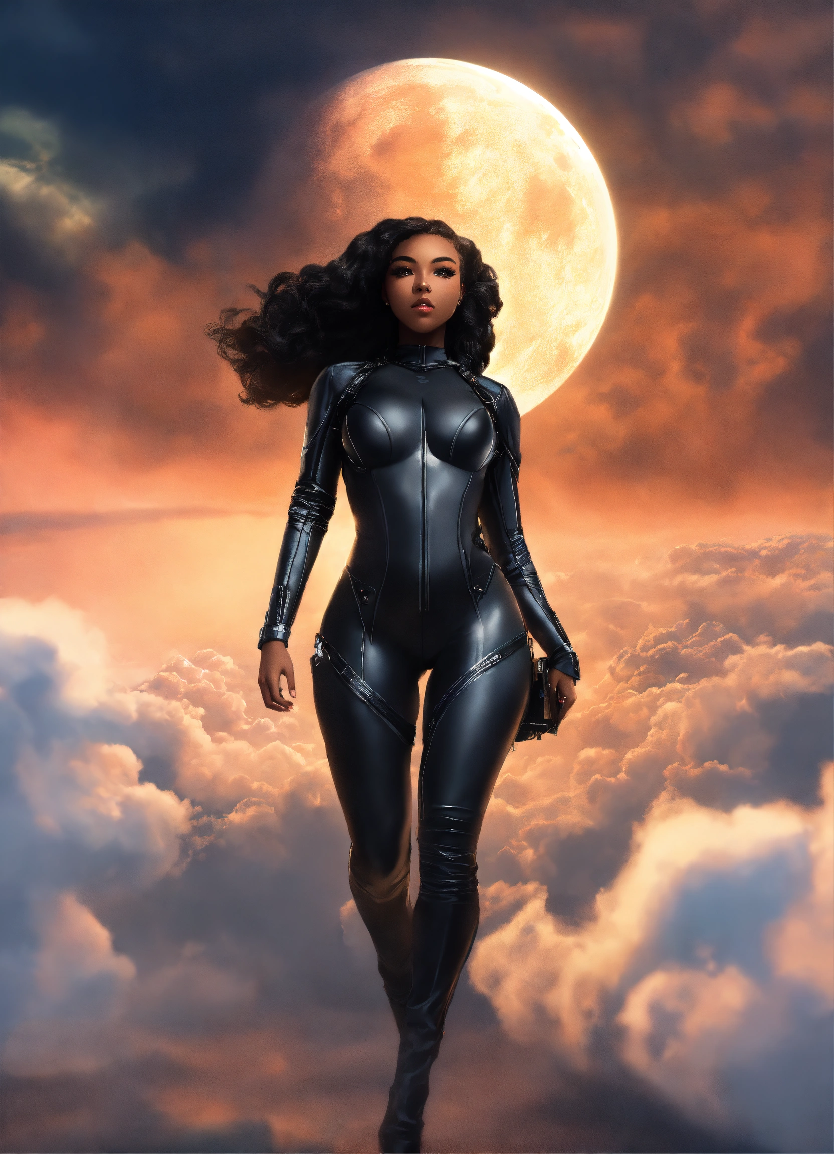 A beautiful black girl goddess, a hottie, perfect face perfect figure, shapely beautiful goddess with long dark hair hour-glass figure wearing a black spy stealth suit, walking in the clouds, resolution 8k, insanely detailed