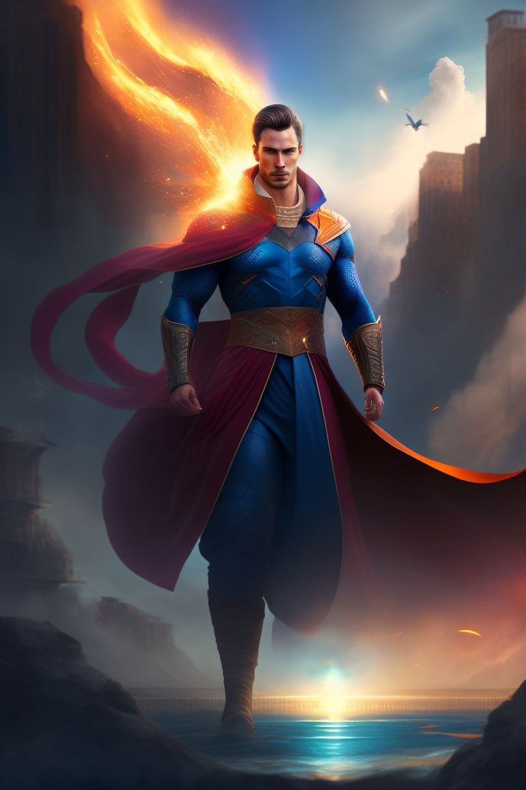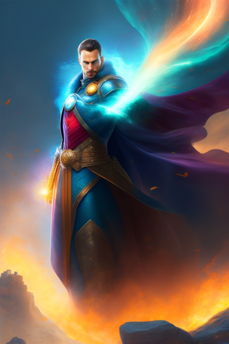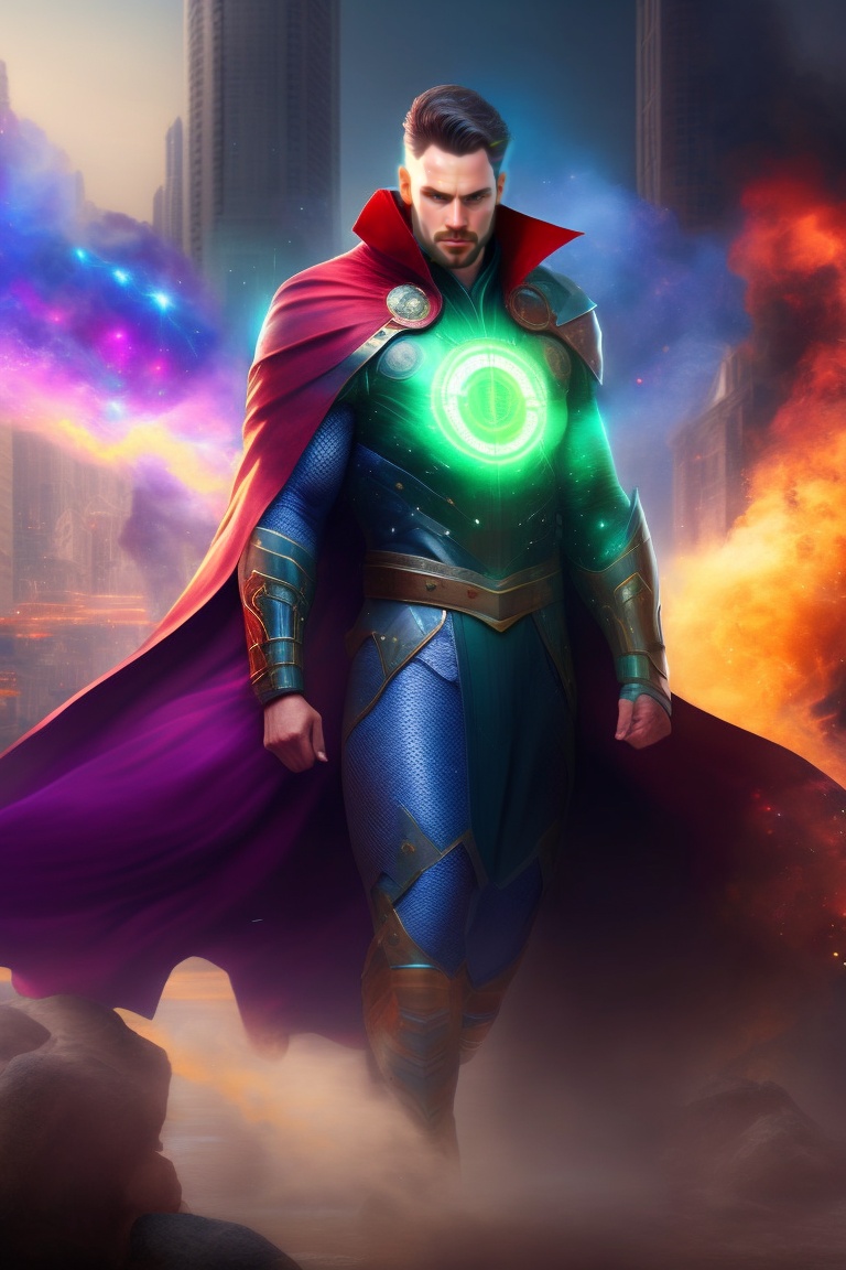 Doctor Strange, Klyntar, Full Body, Hero pose, destroyed city, floating particles, green eyes, windy,