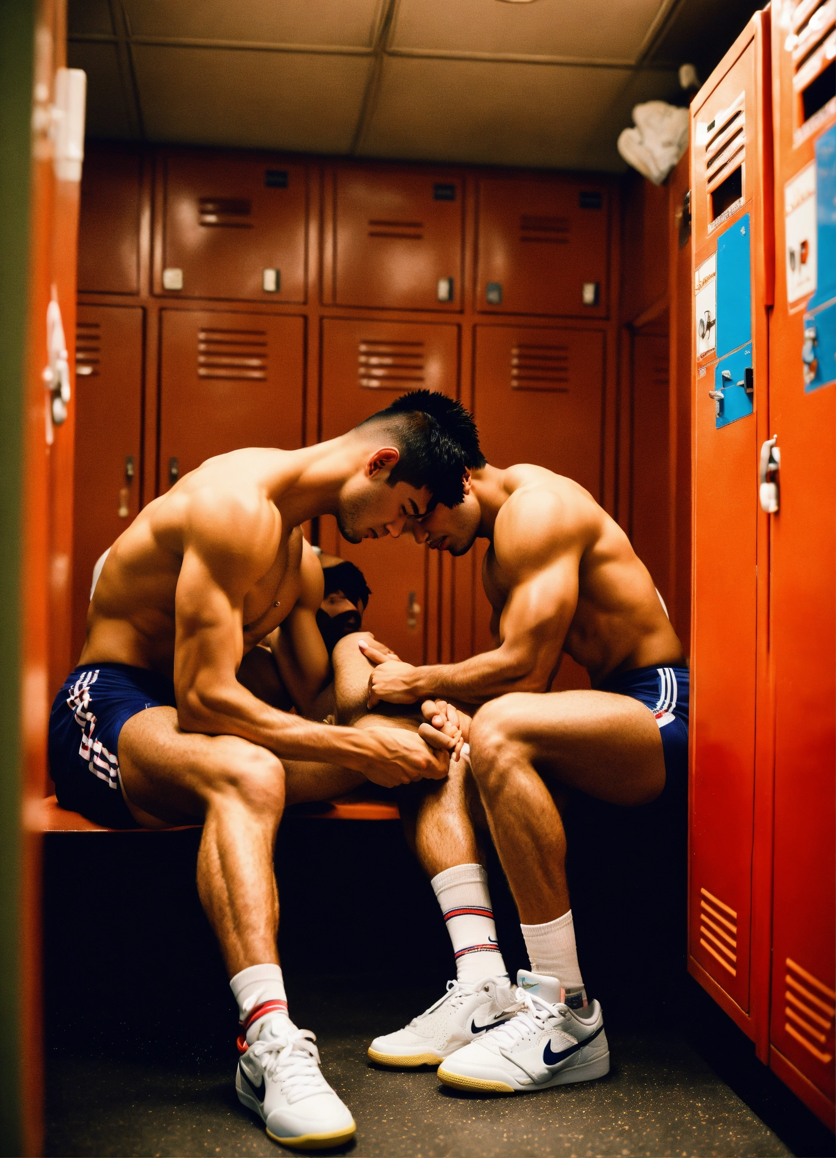 Bromance, group of japanese fit slim sweaty sporty college handsome tanned boxer wrestlers young stud guys cuddling, smelling, holding hands, flirting, drooling, kissing, wearing sock and nike jordan sneakers, in a locker room lockers, with big bulges, sniffing sneakers, they like feet, gazing into each other, salivating