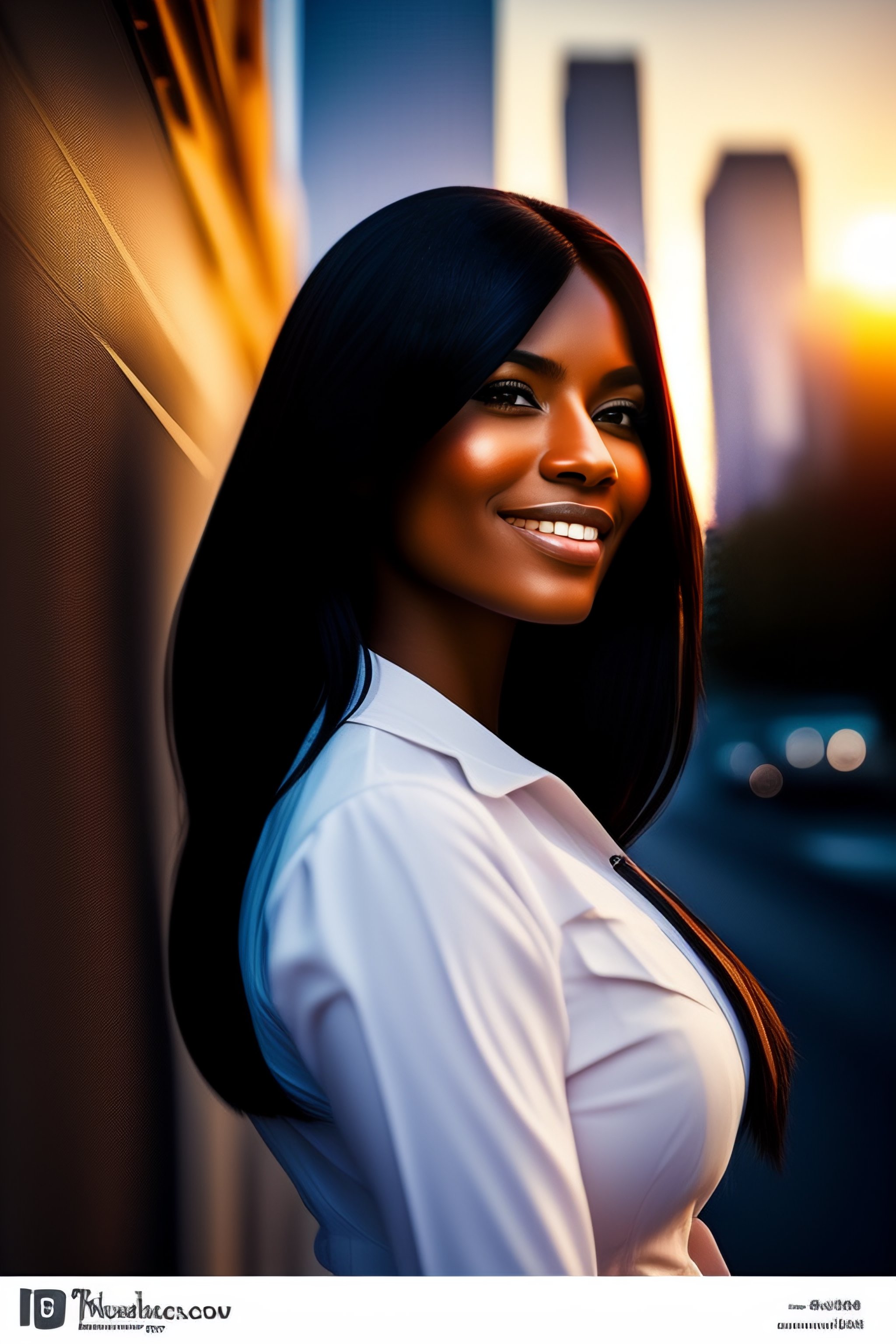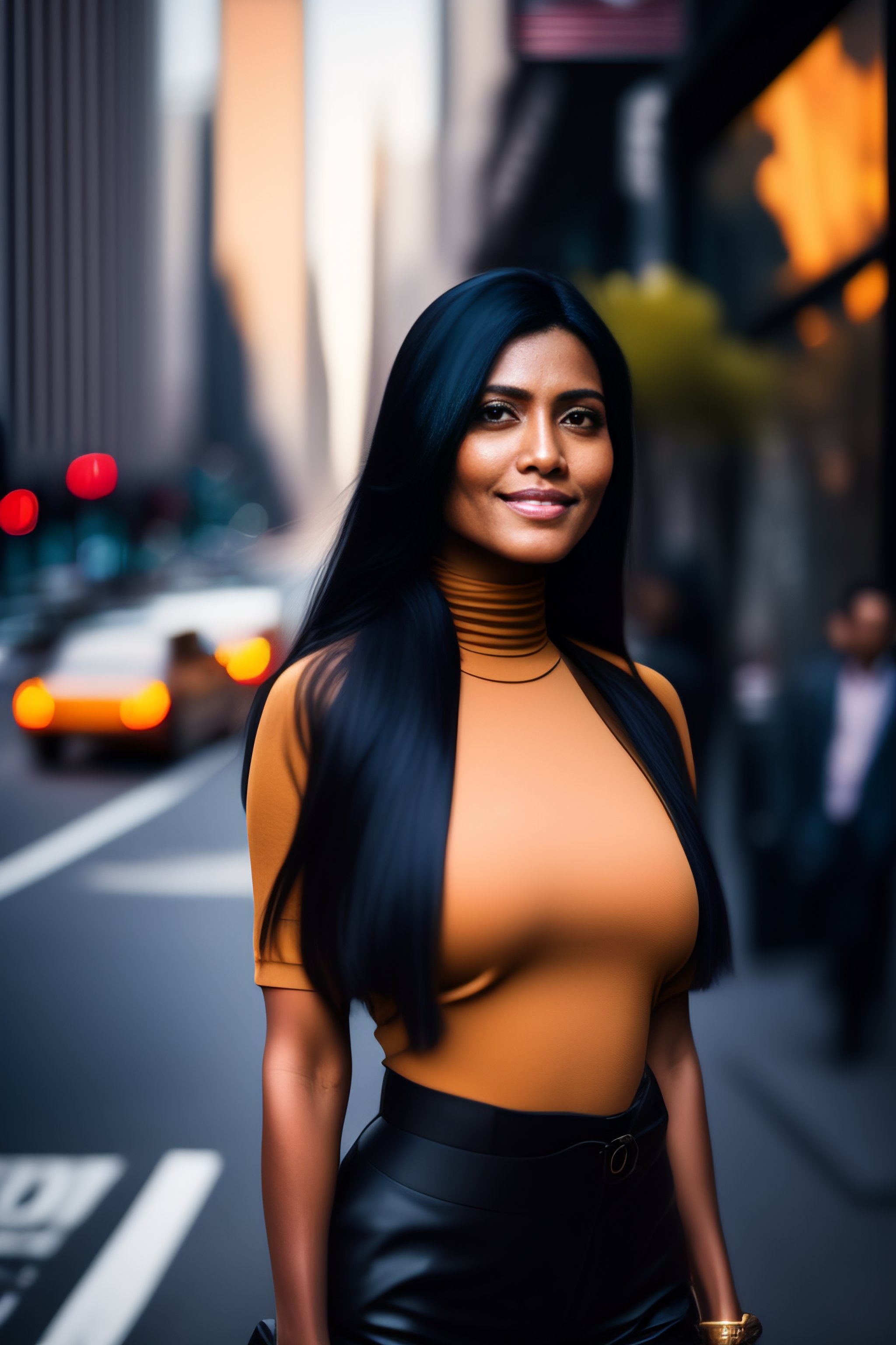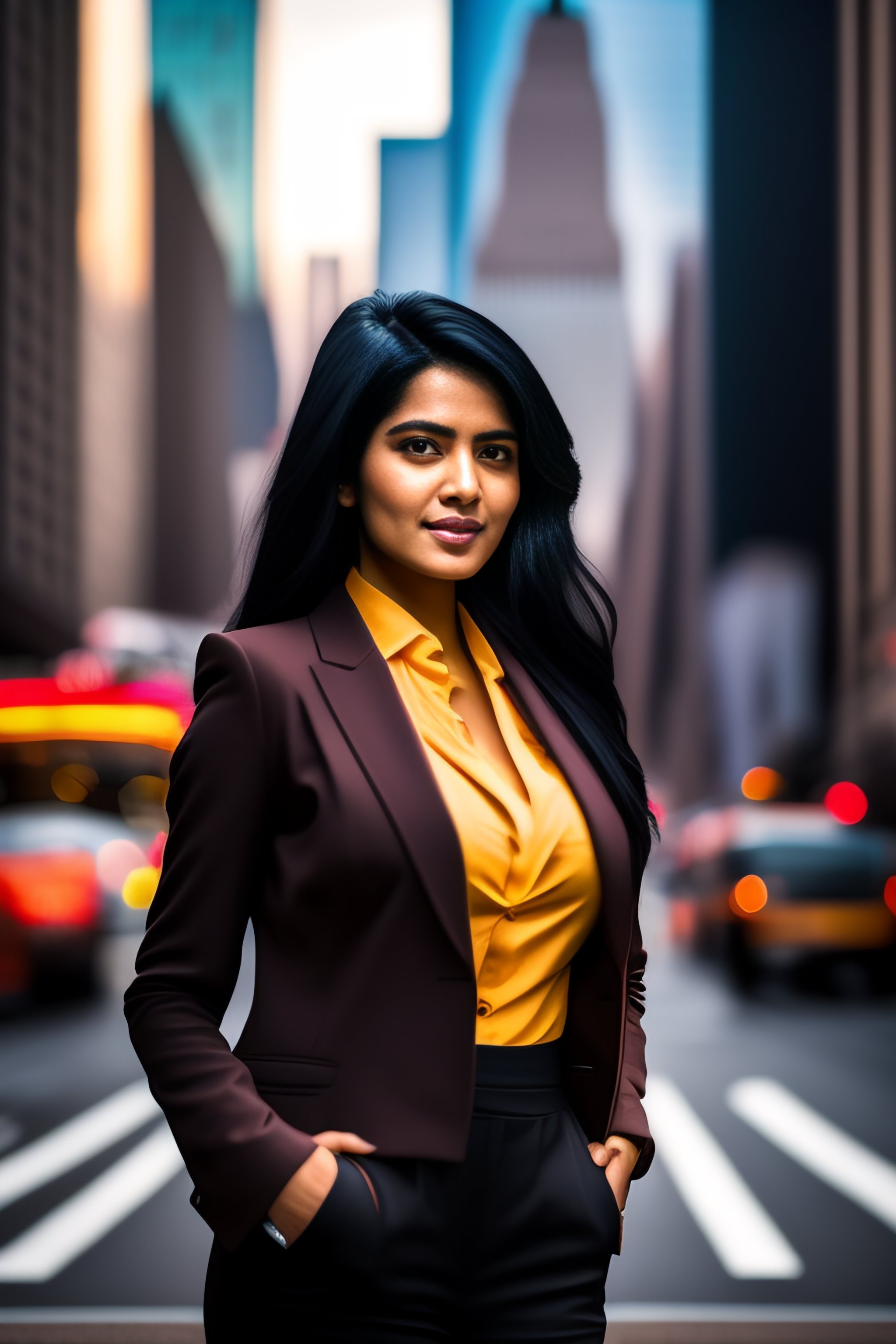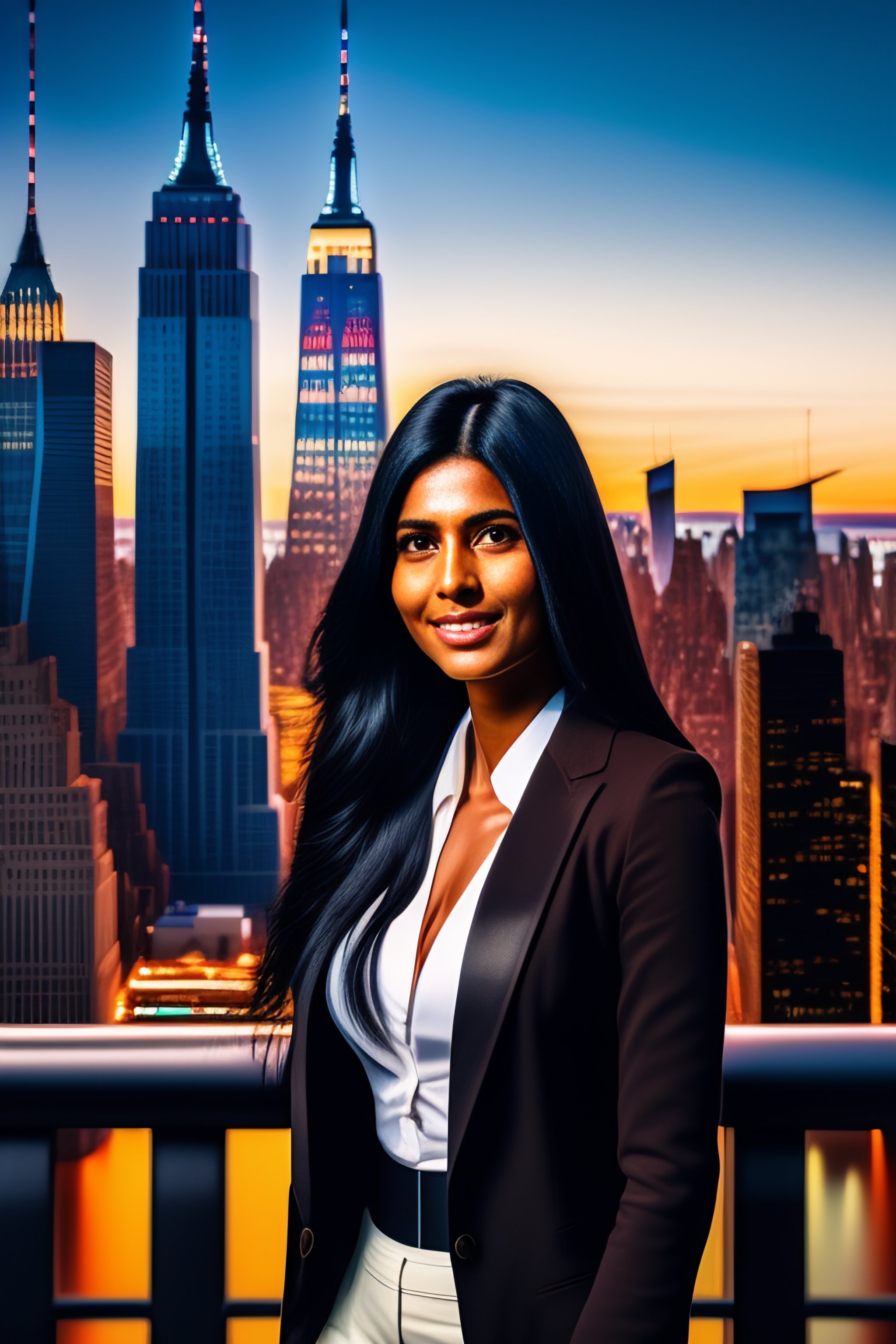 Ceo tech company in computer security bay area woman indian dark brown skin dark long black hair fashionable standing in front of new york city skyline