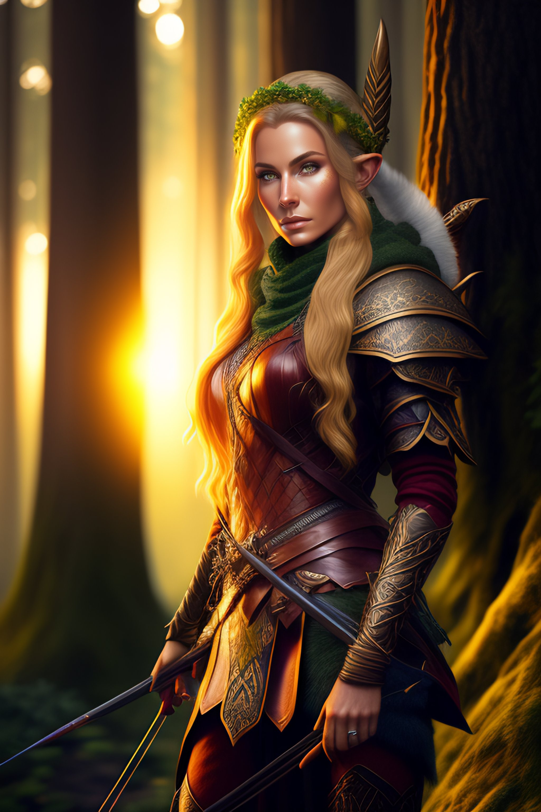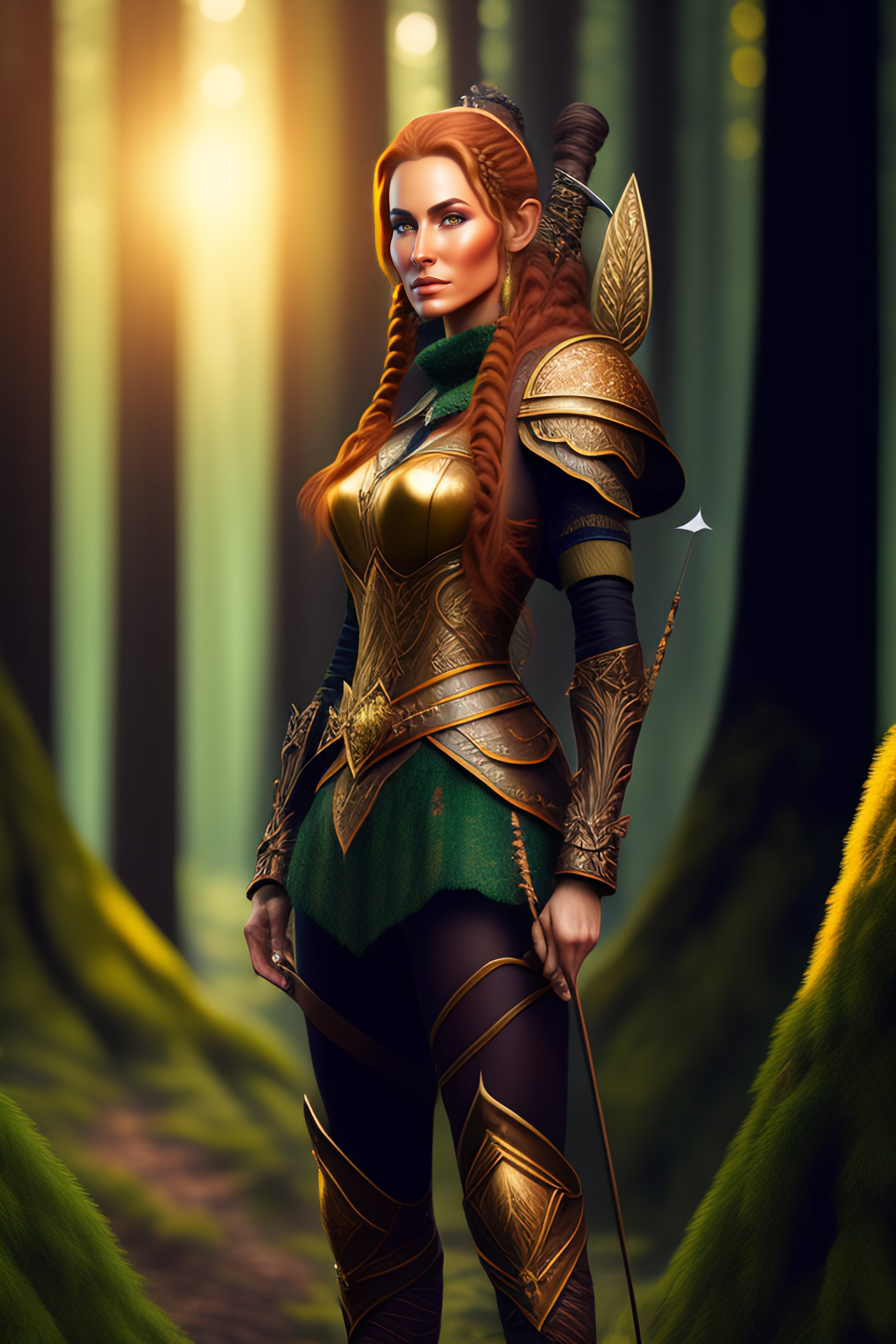 Highly detailed female elf ranger, standing in a forest at sunset, wearing armor and wielding a bow and arrow, realistic textures, 8k resolution