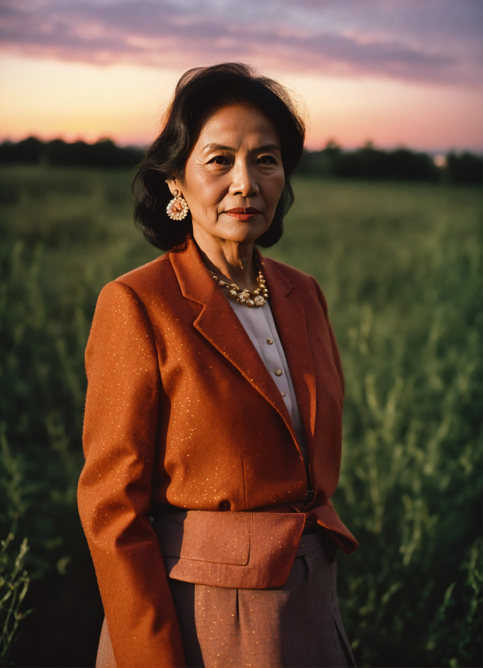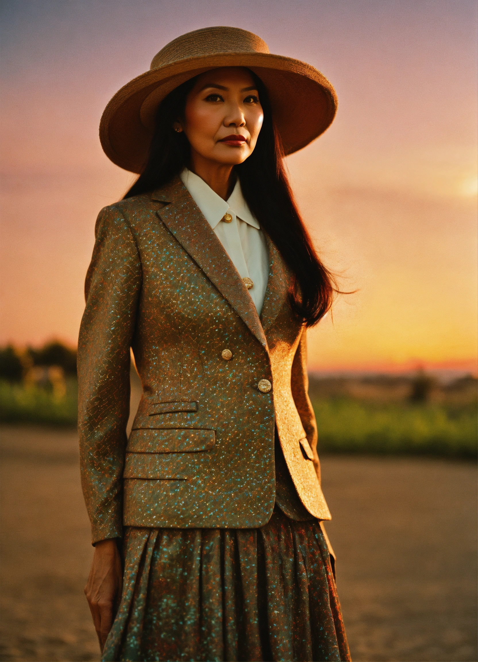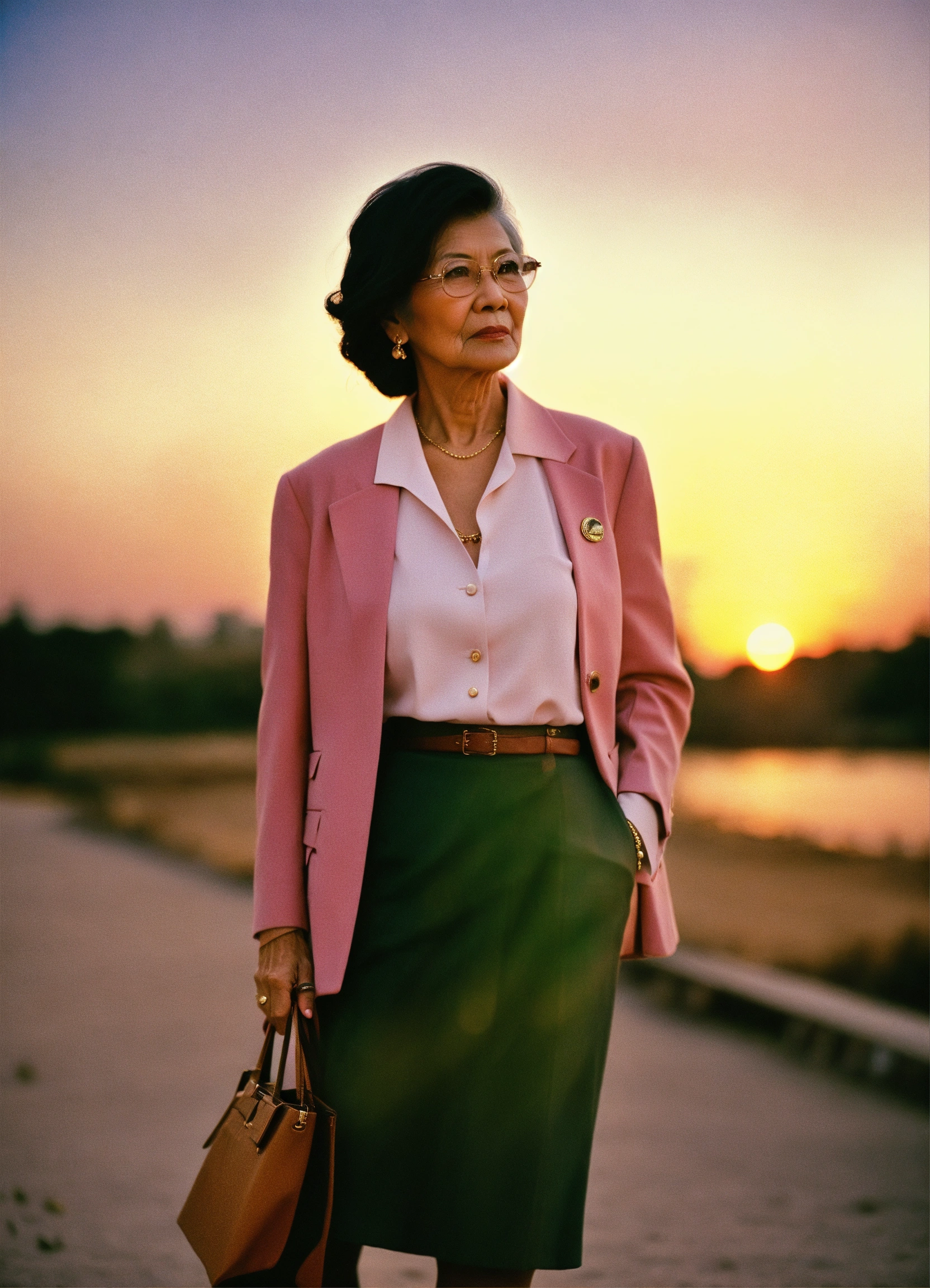 Extremely detailed photographic image, grained image, beautifully composed, color image, 00's fashionable image, fashionable magazine photography, leica summicron 35mm f2.0, kodak 400tx, fashion photography, fashionable model, asian indian woman pensioner senior adult realistic adult in a suit with skirt, facing a sunset.