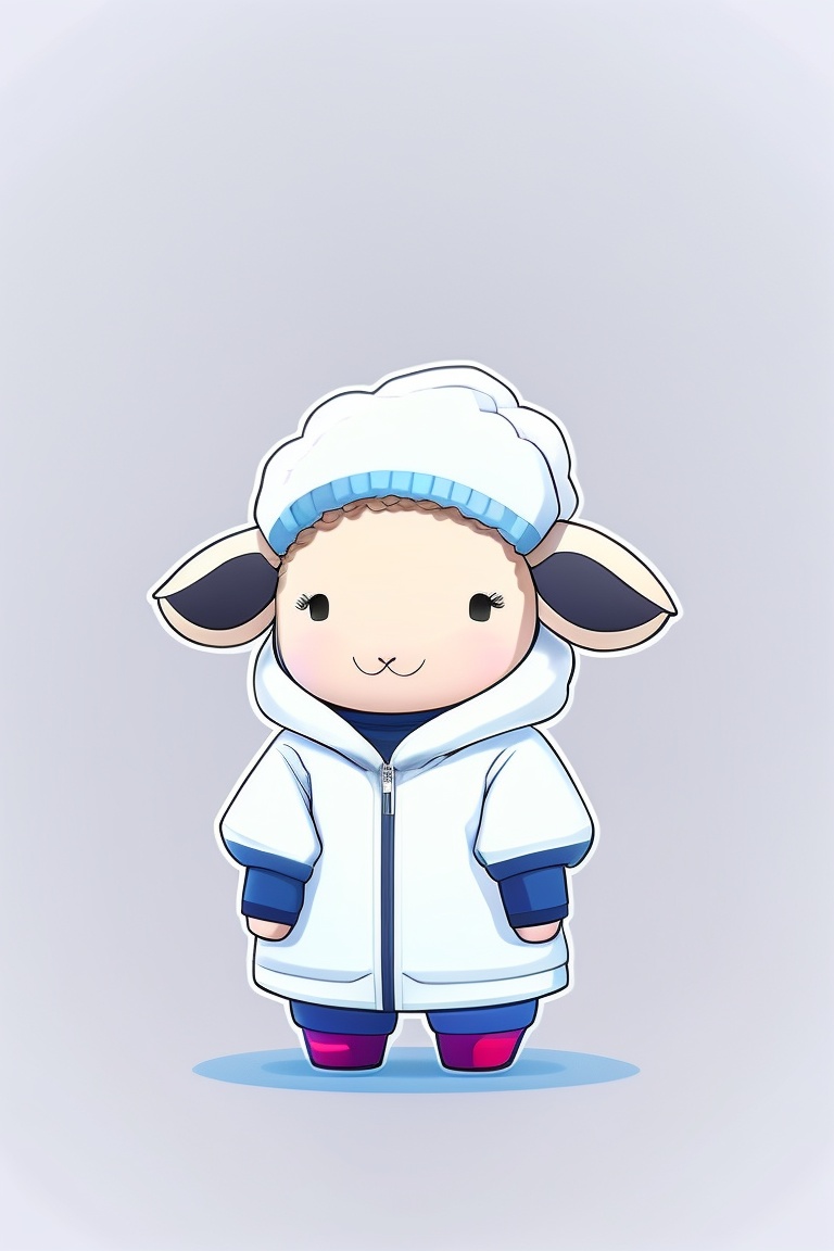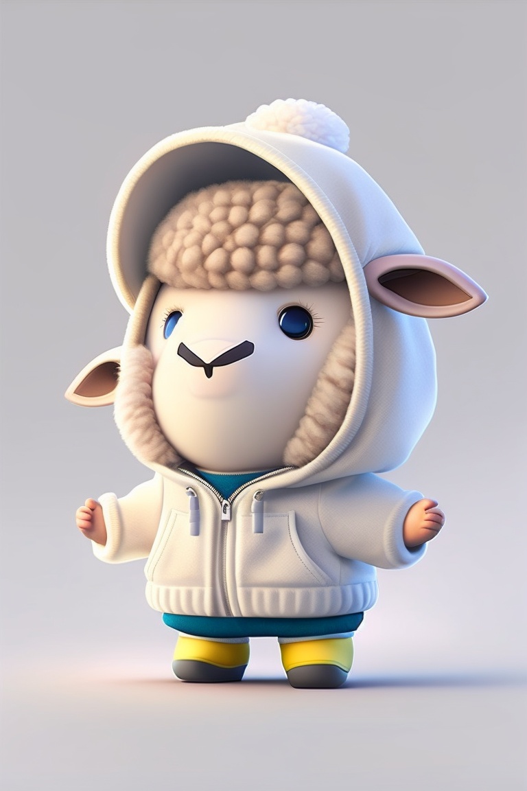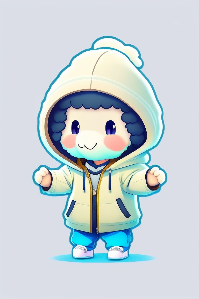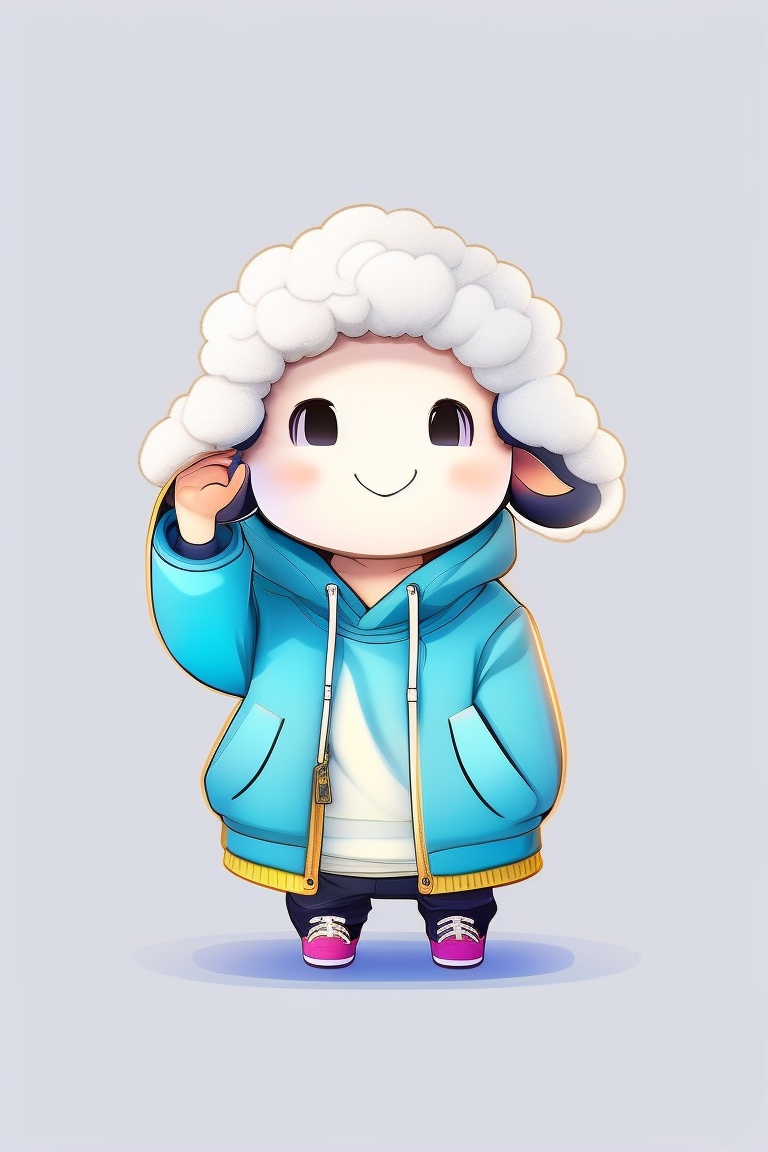 Sheep wearing hoodie as a very cute anime character, white background, making a sign with his hands and smiling