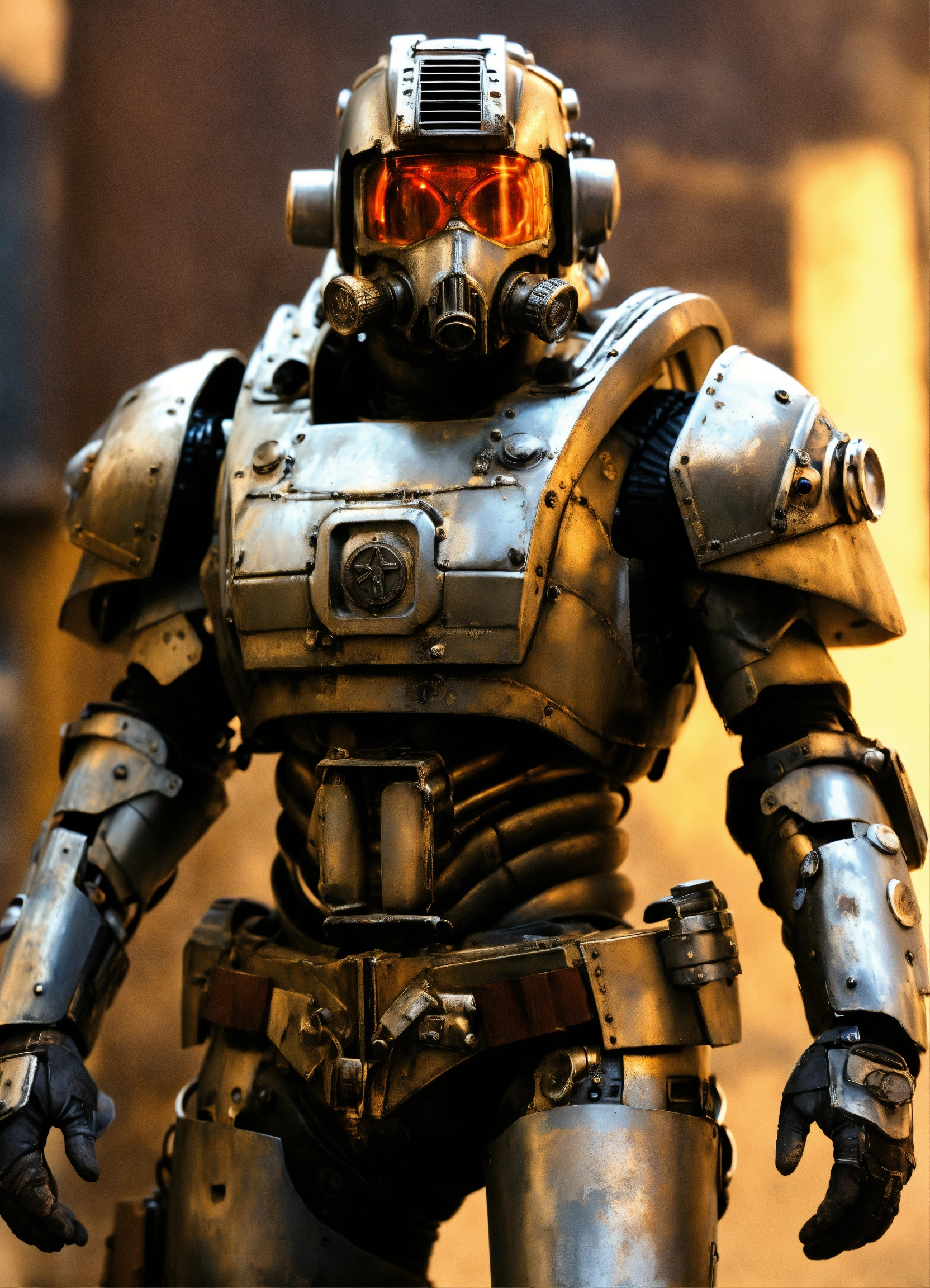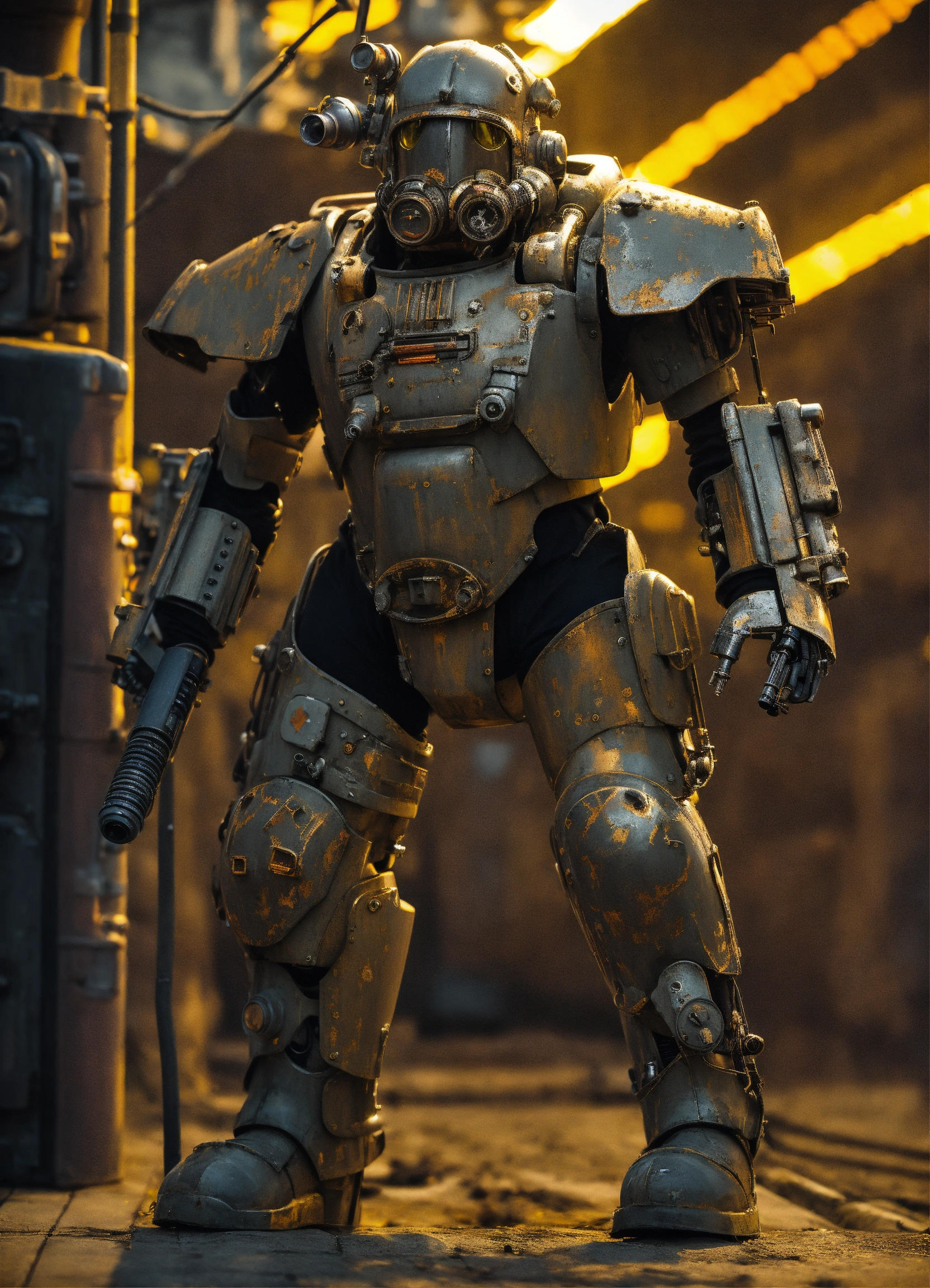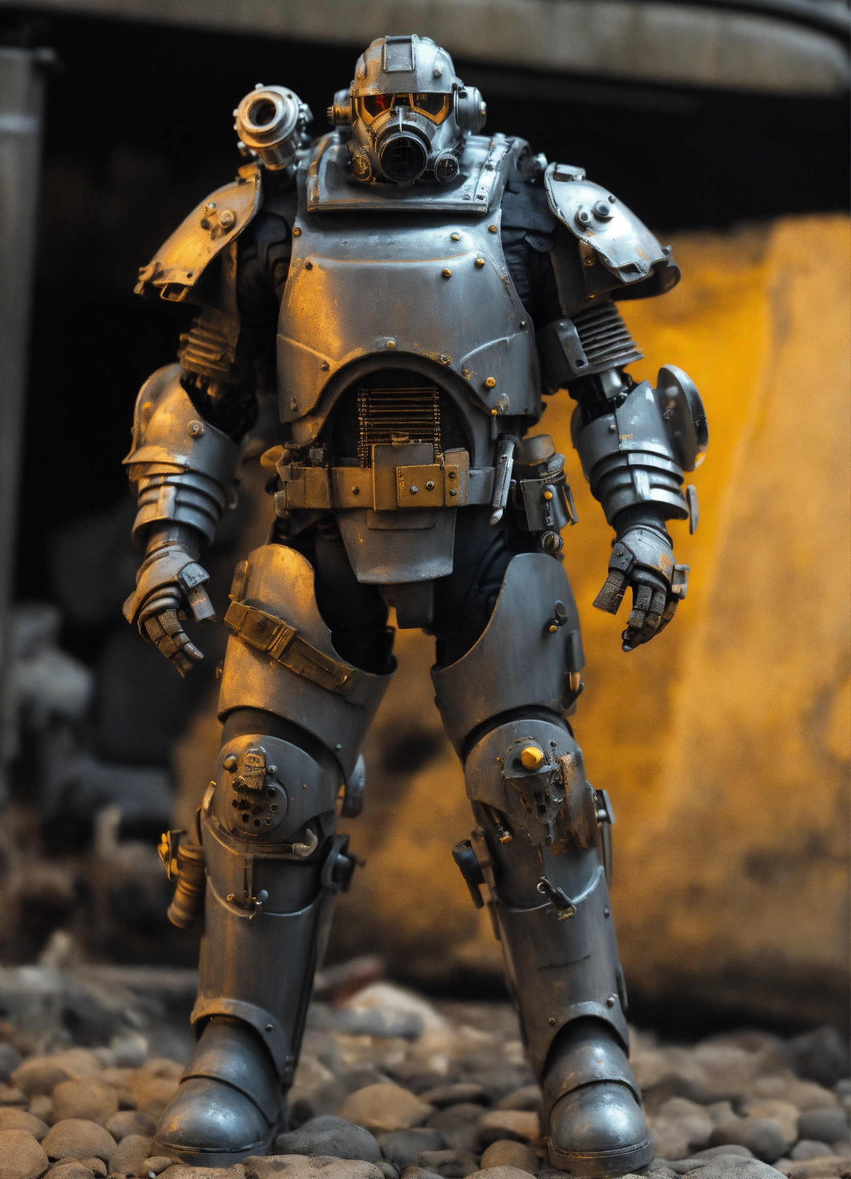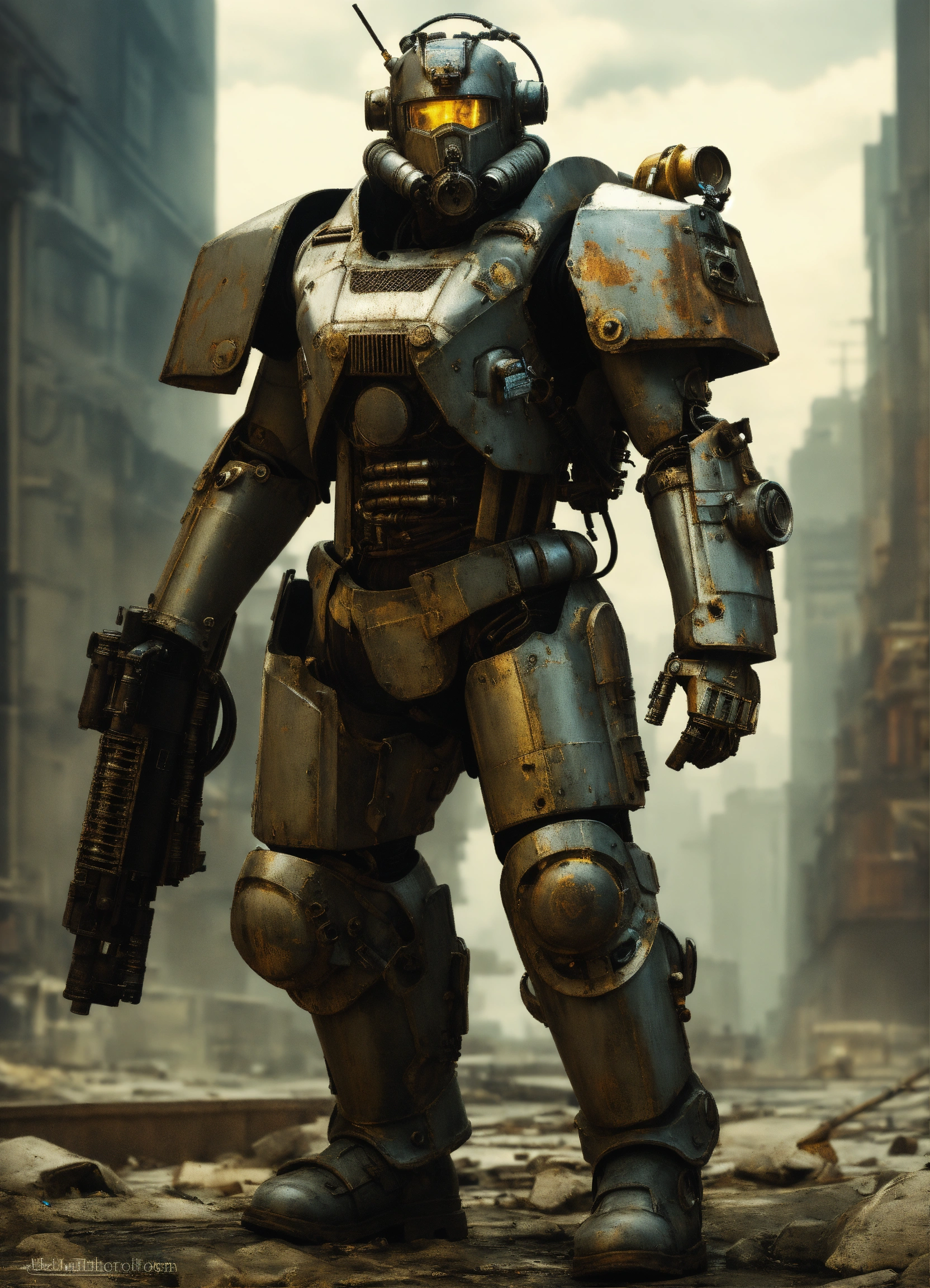 Dieselpunk cybernetic supersoldier with gray weathered power armor