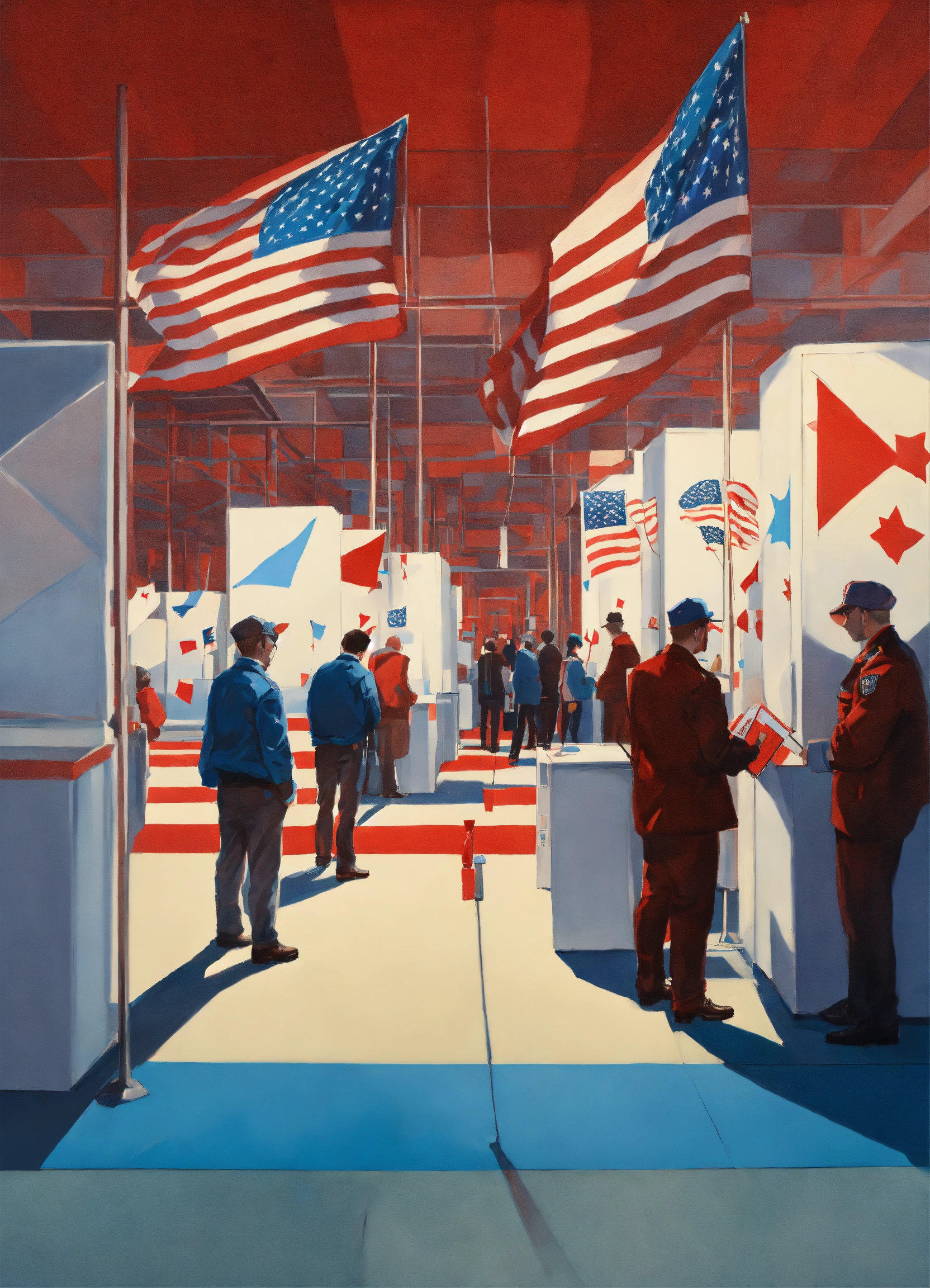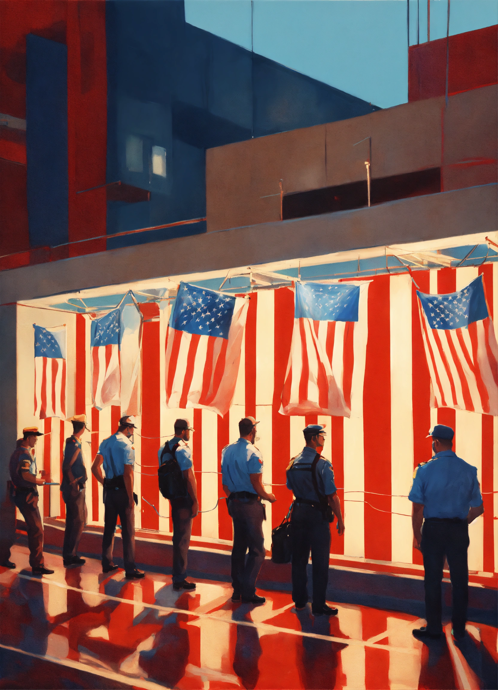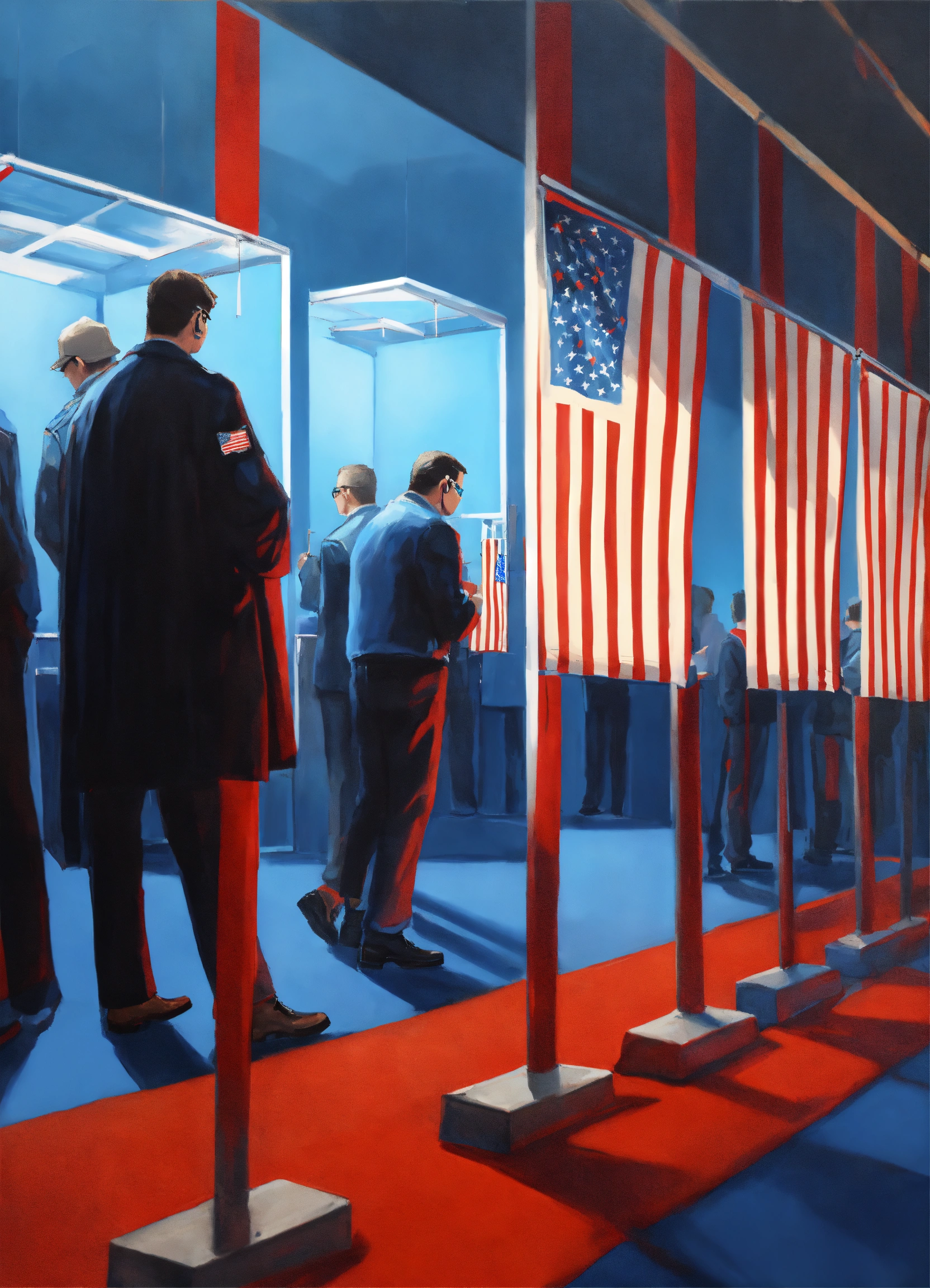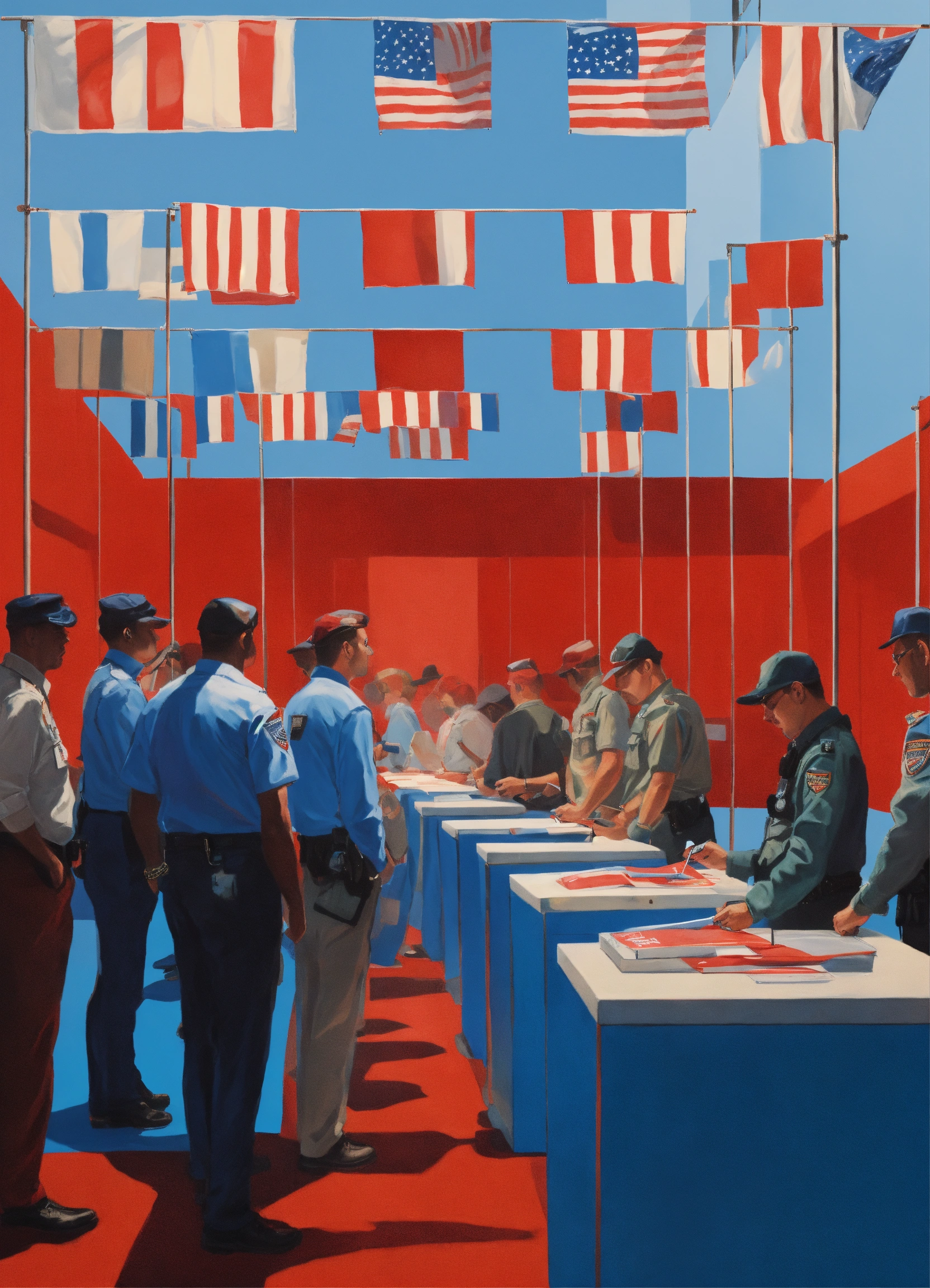 Superrealist style, urban style, people voting on a poll, election day, flags, security people, red shadows, pale blue, ivory, glowing lights