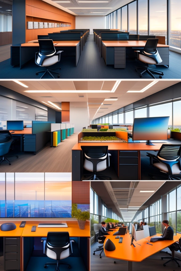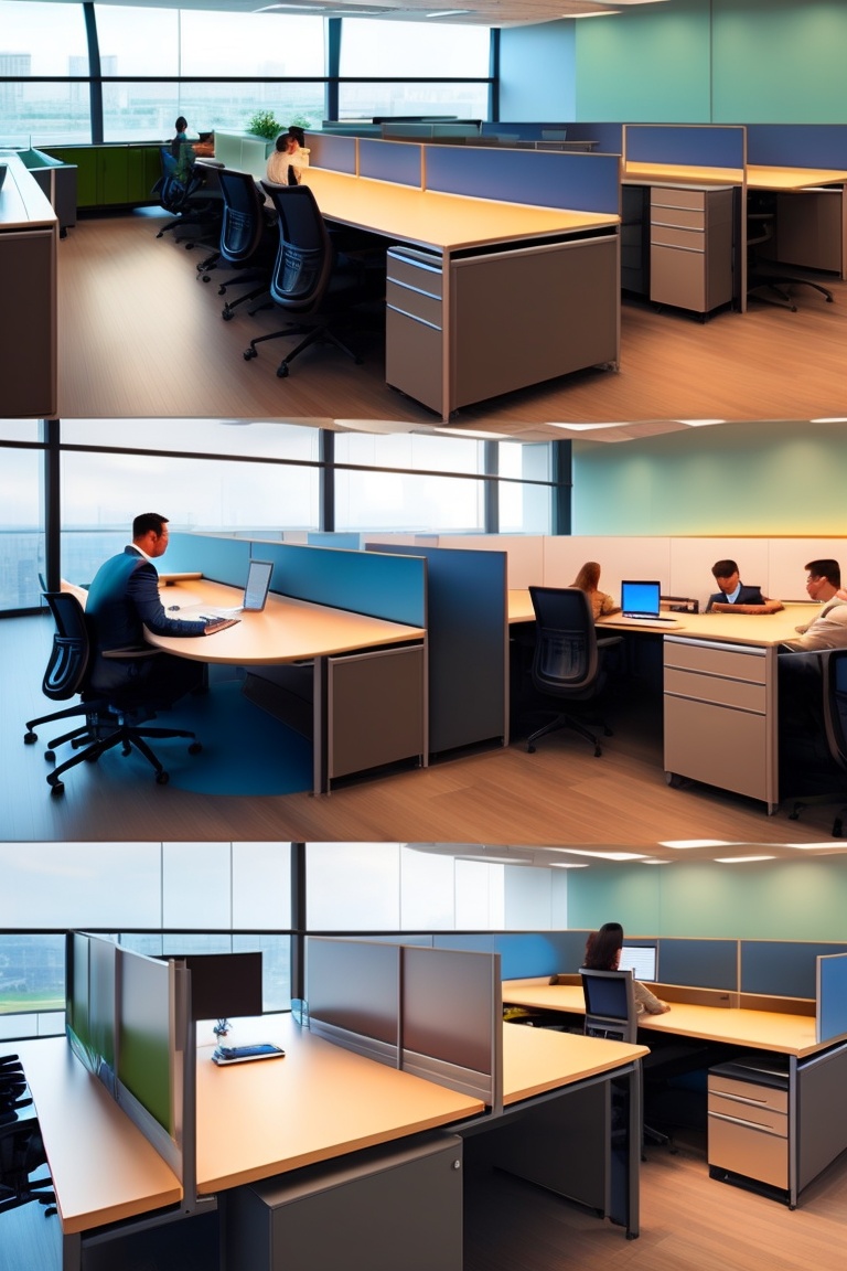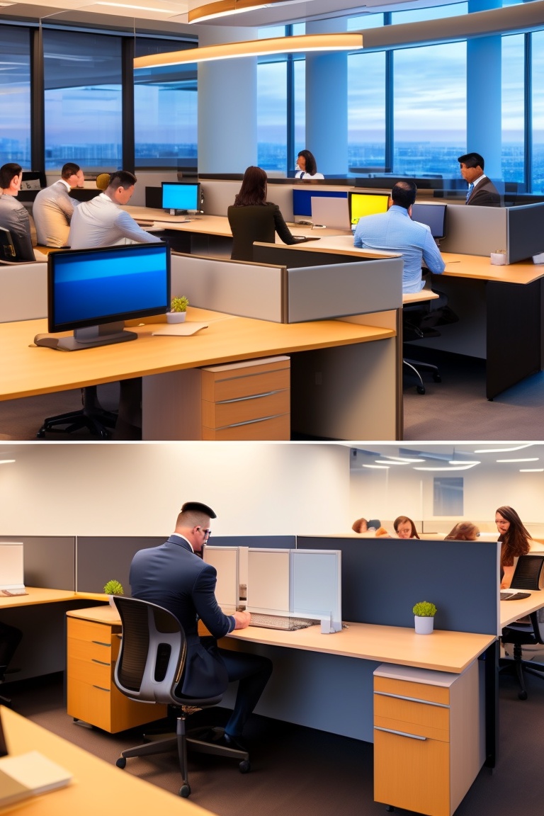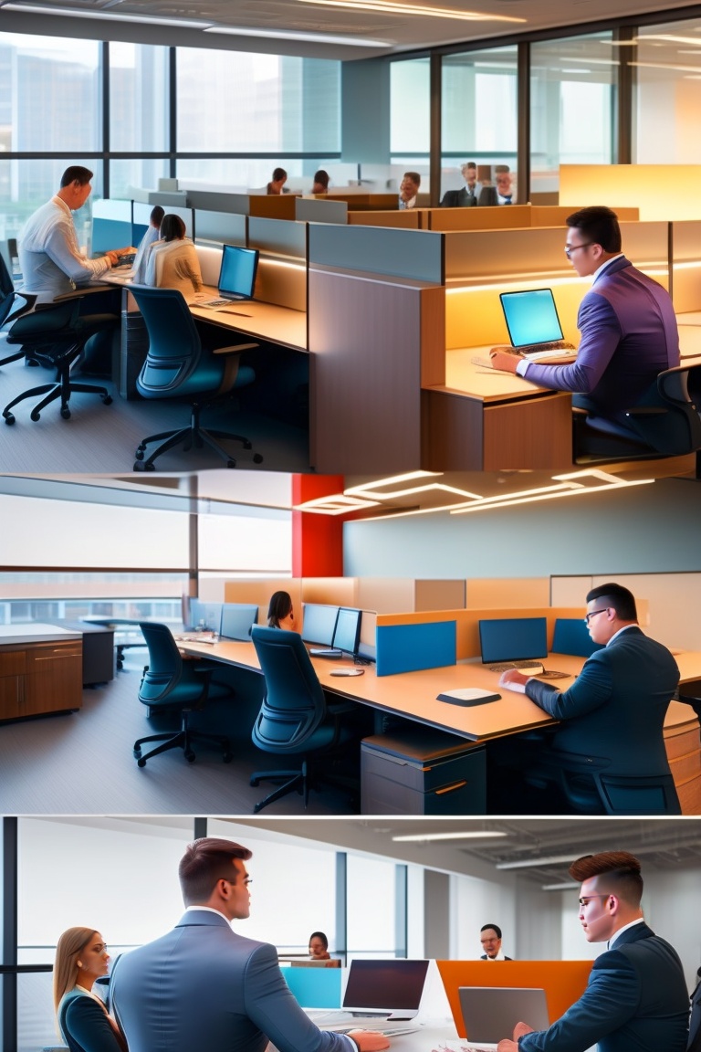 In this scene, a bustling office environment is depicted through a captivating photograph. the image captures a dynamic workspace filled with professionals engaged in various tasks, enhancing the atmosphere of productivity and collaboration. the photo showcases a multitude of individuals working on laptops, engaged in stimulating discussions, and brainstorming ideas at sleek, contemporary workstations. the vibrant ambiance is illuminated by ample natural light filtering through large windows, illuminating the room with a warm and energizing glow. the composition of the image draws attention to the seamless blend of creativity and professionalism that defines the triad's workspace. through this captivating photography, the image effortlessly conveys the essence of a thriving and innovative work environment that fosters growth and success.
