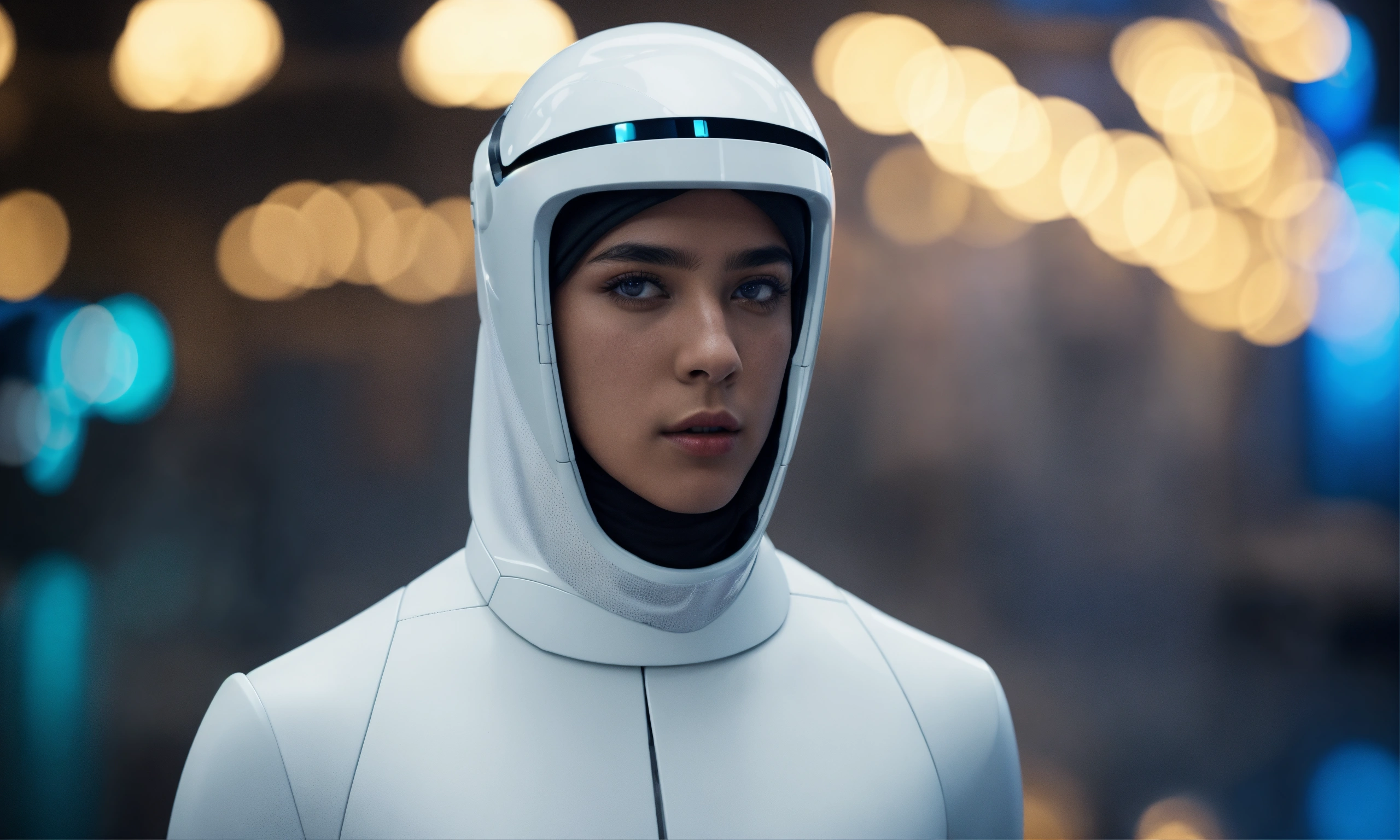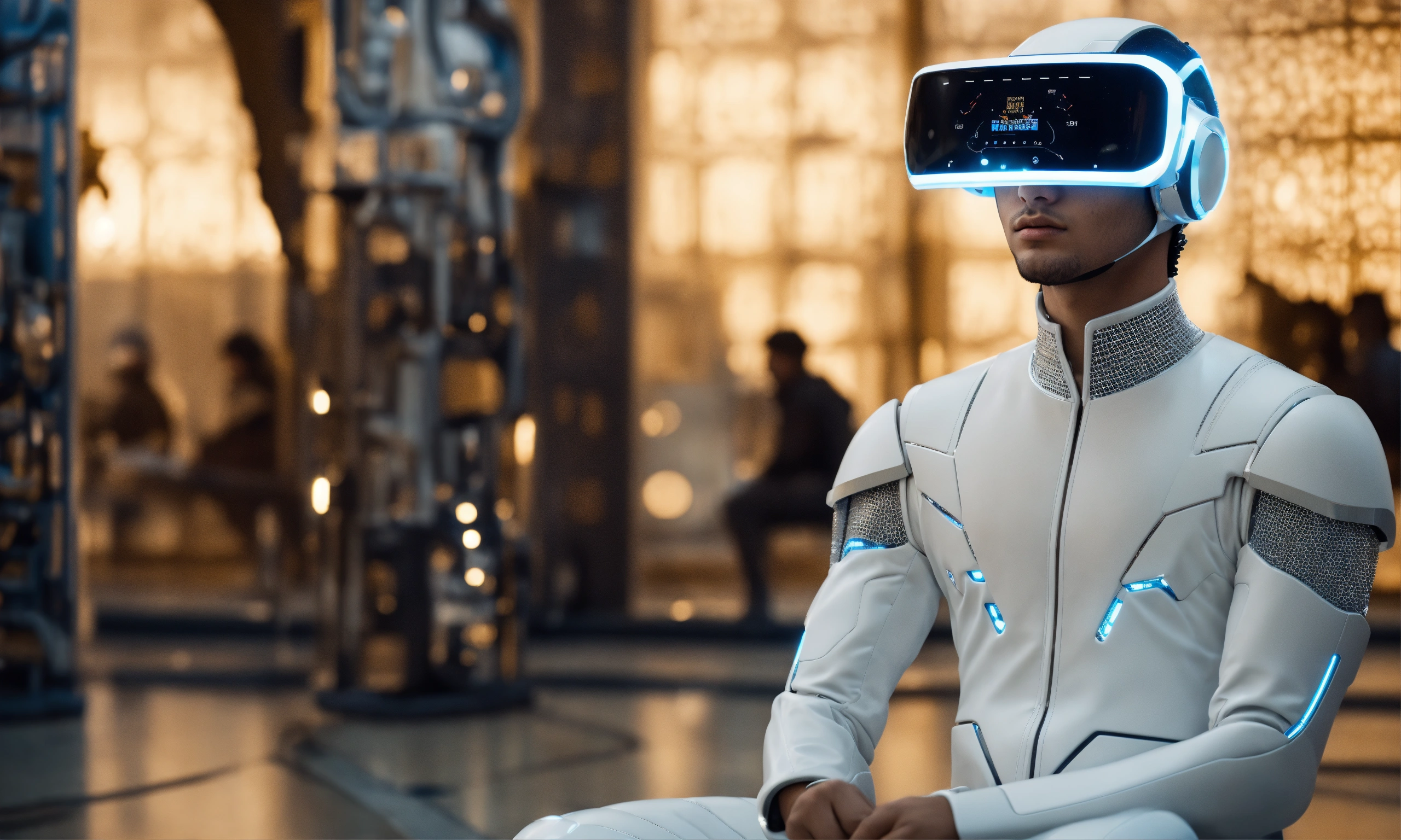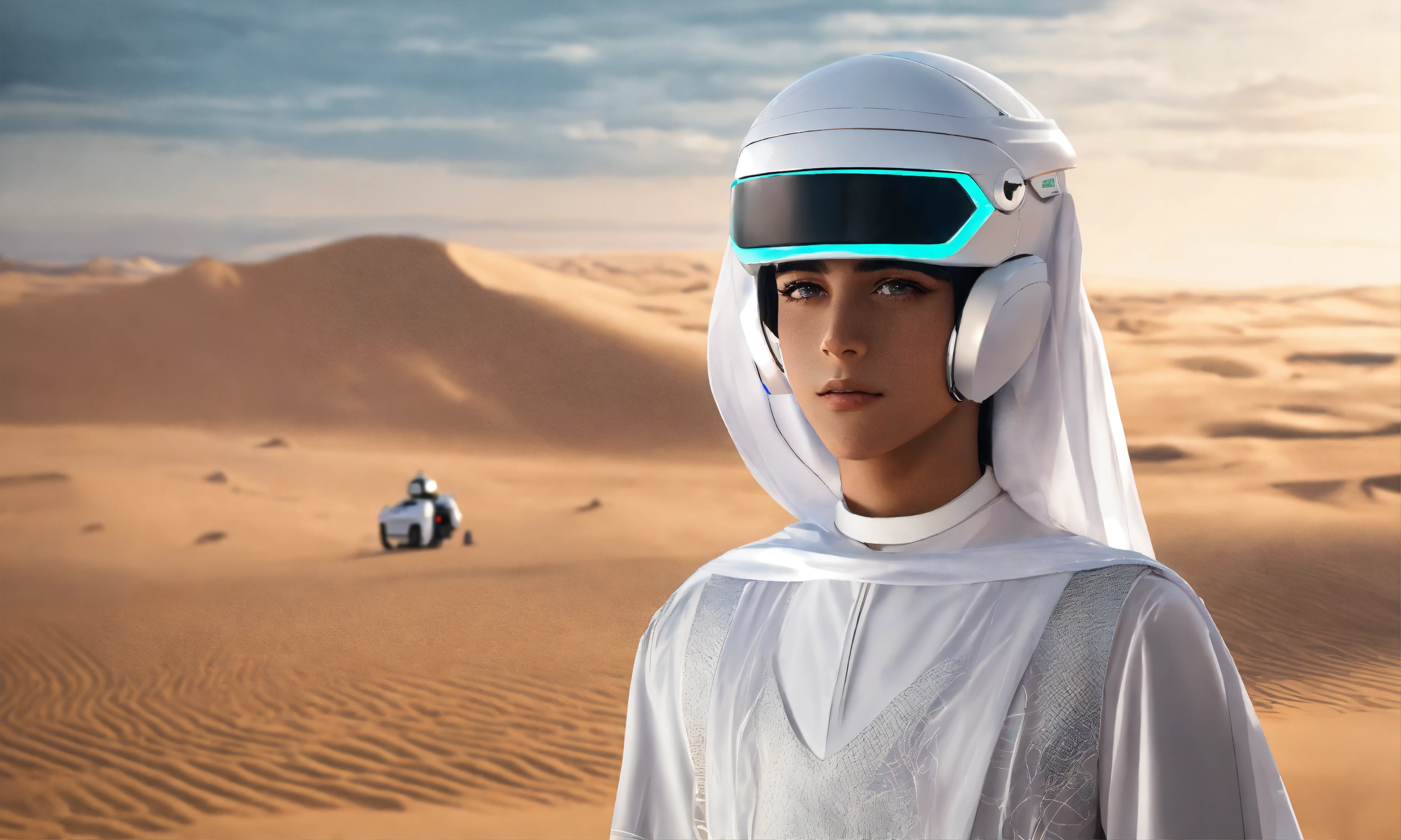 Young saudi youth, future, technology, robots, metaverse head gear, dream, modern, white costume, photo-realistic, 8k, high-definition