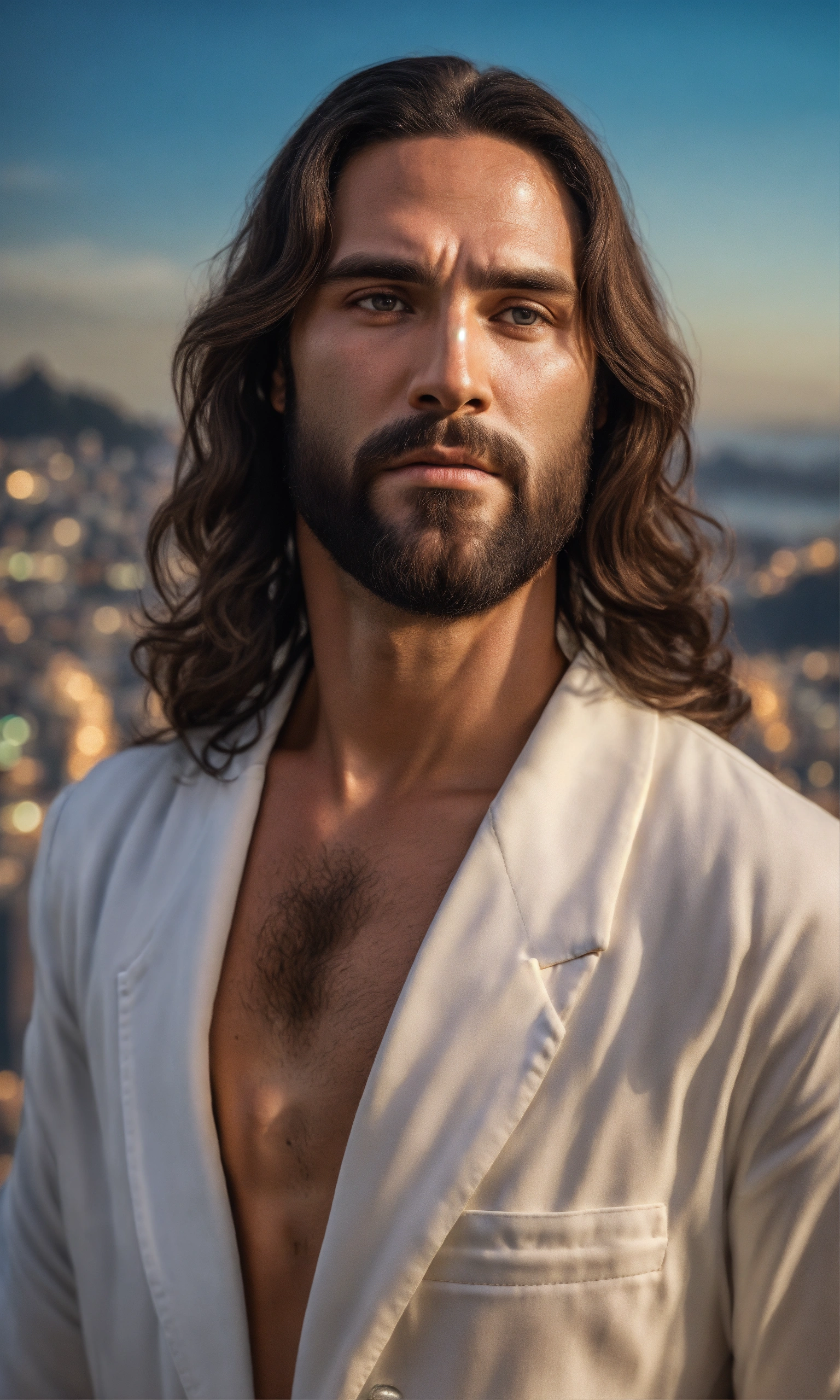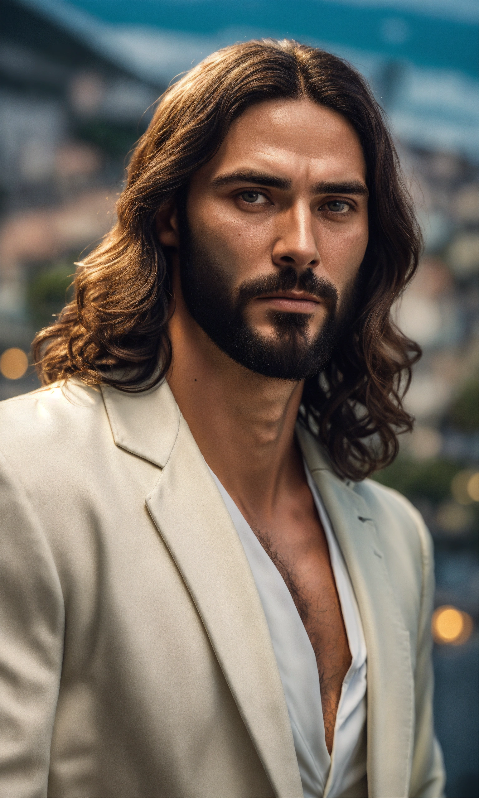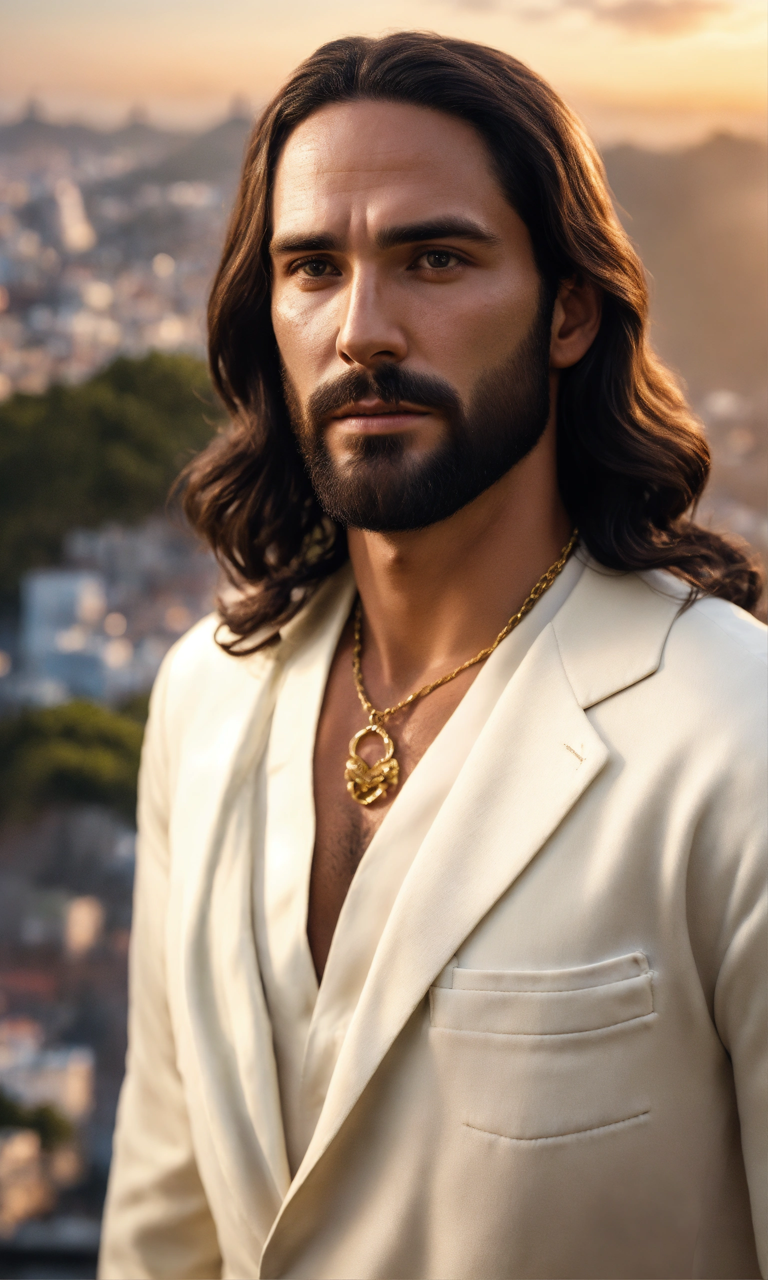 Ultra realistic photo of male brazilian jesus, forties, vintarealistic, not painted, very detailed faces, skin with pores, 4k, white suit, ultra detailed rio de janeiro city background, skin not smoothed, face from left to right, desire in the eyes, half profile, glowering, looking into the camera, black shirt. all body, glossy