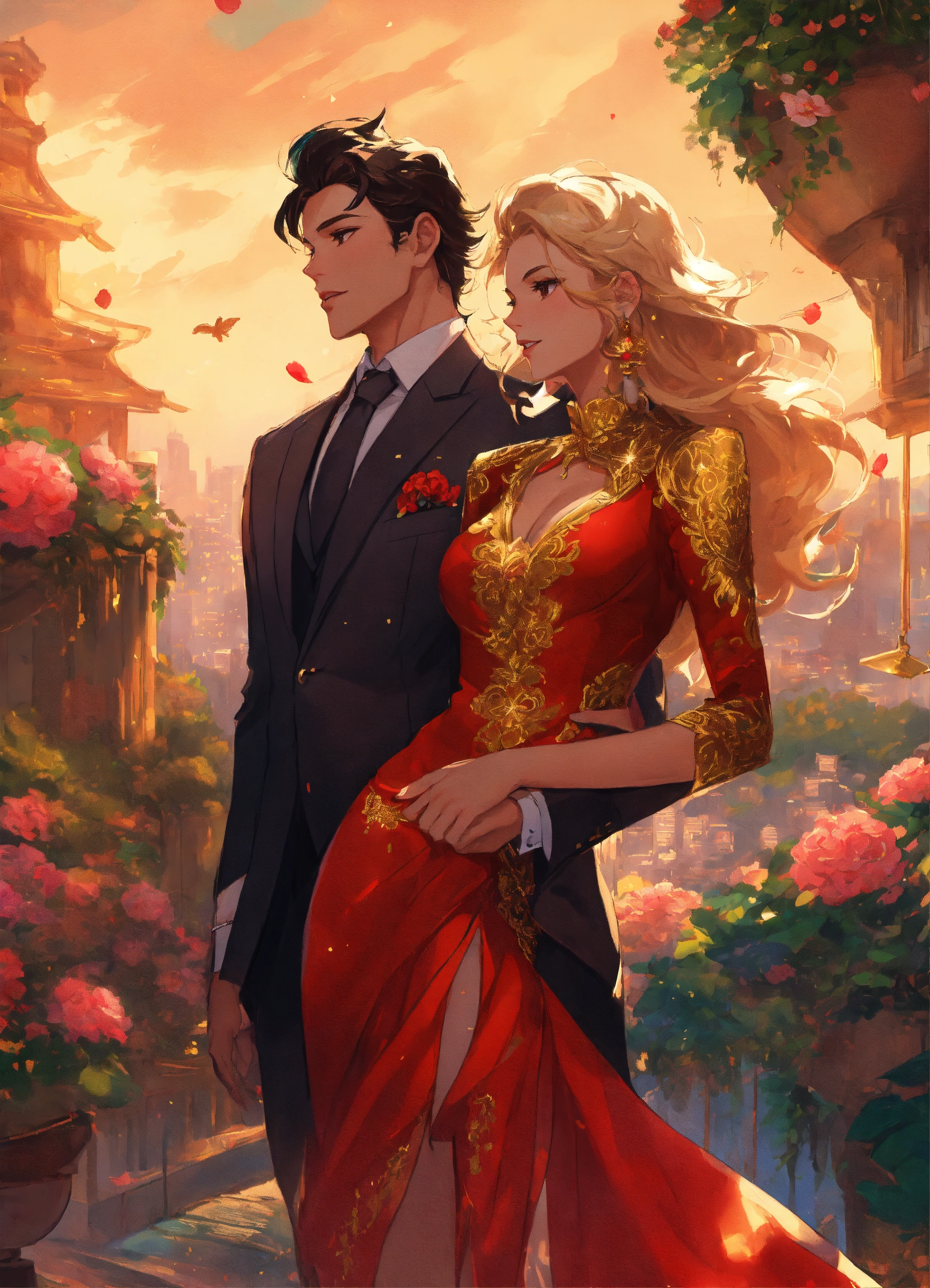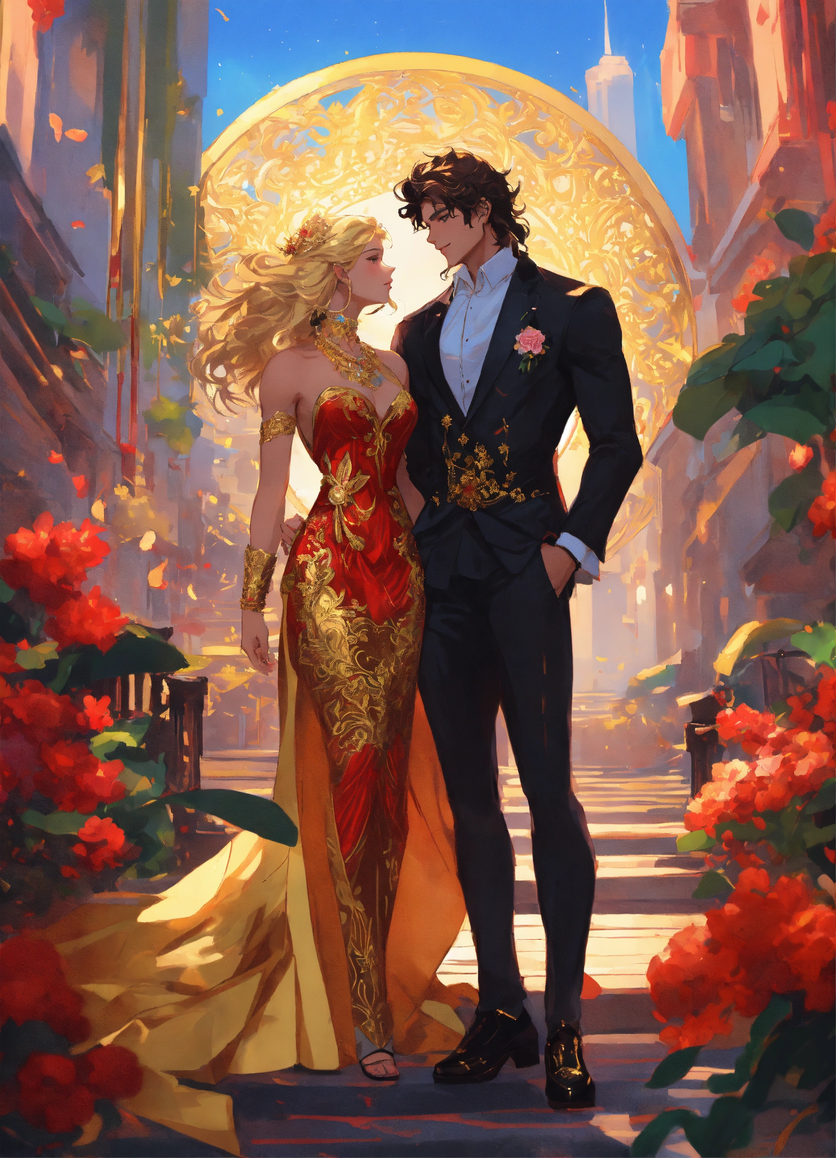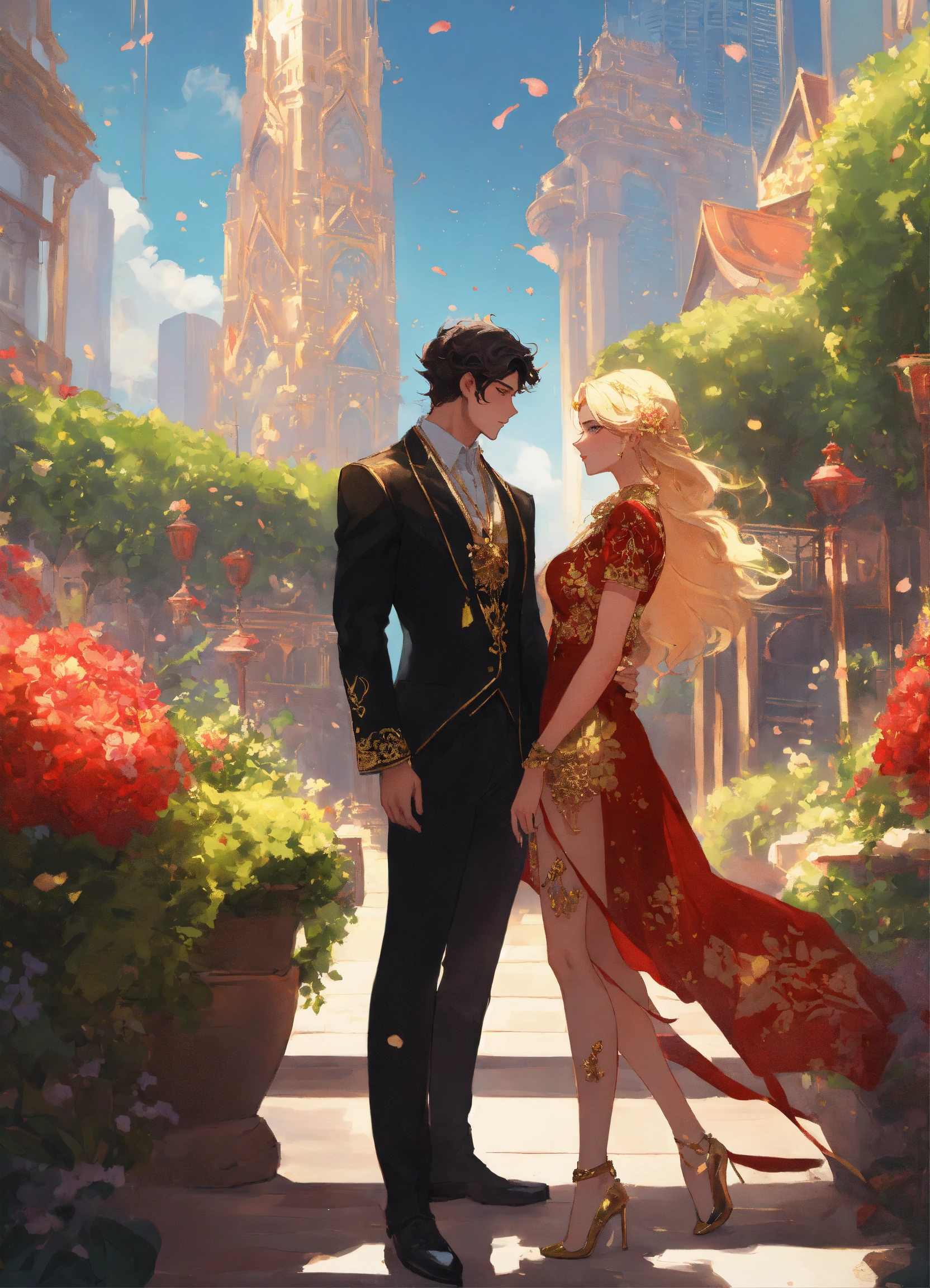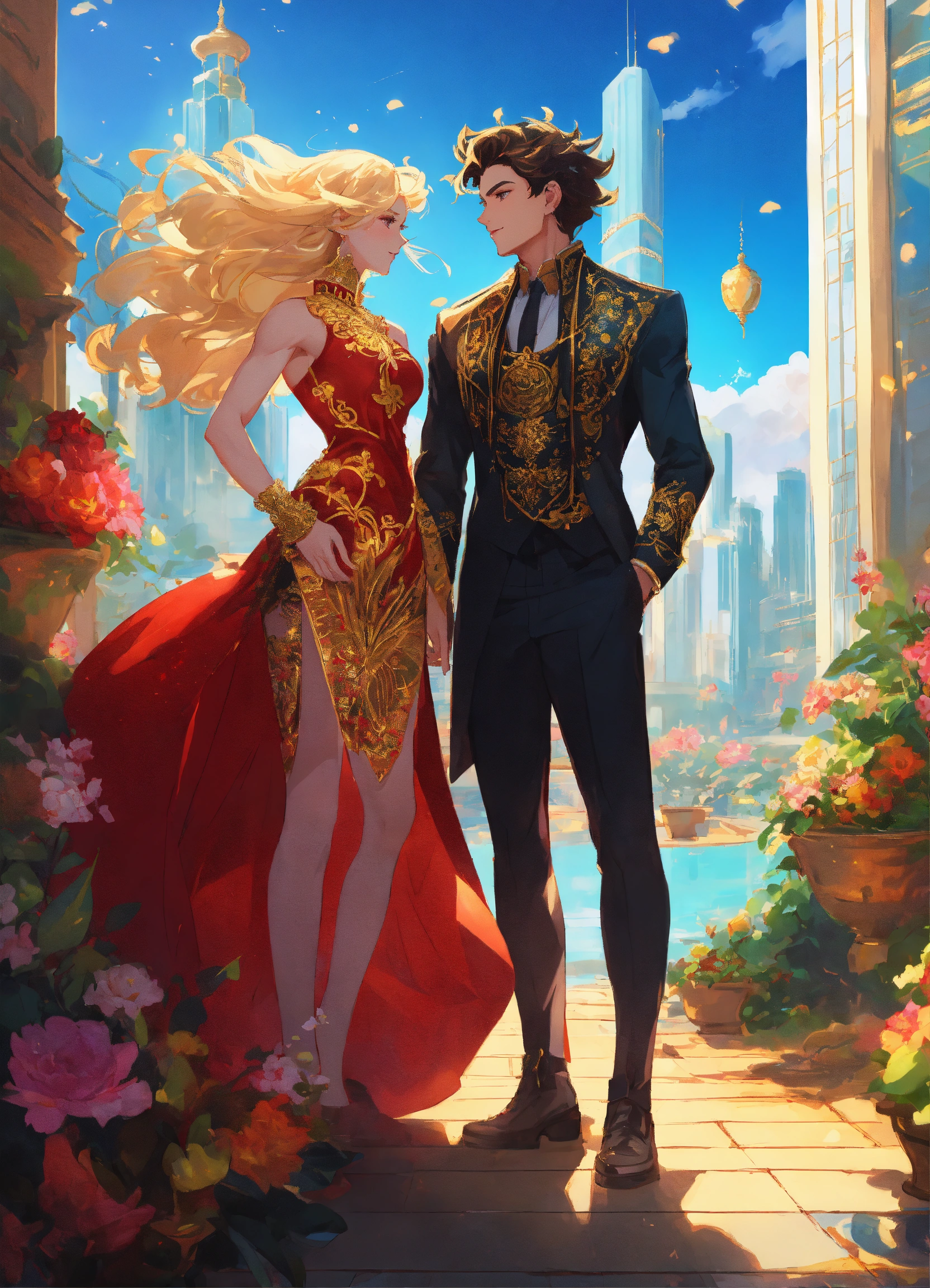 Illustration of beautiful city of towering skyscrapers, islands, vibrant colors, fair skin, the young man wears a intricate princely black suit with gold ornaments, has wavy black tousled hair, the golden haired woman wears a red intricate dress with gold adornments that shows legs, she has muscles, maximalist, 8k photo, animestyle, by artgerm, by rossdraws, trending on artstation, garden, windy, flowers, circular perspective, romantic, facing each other