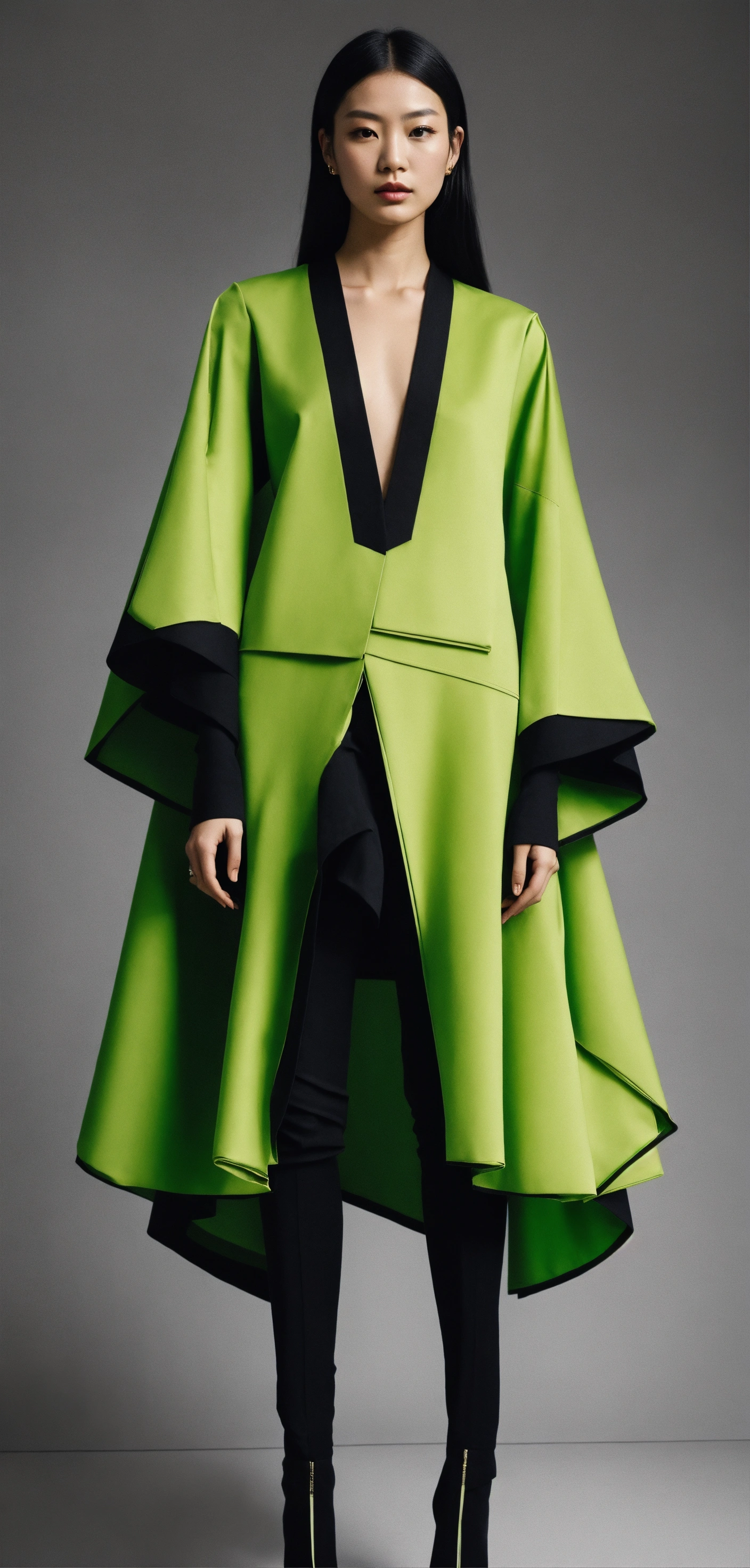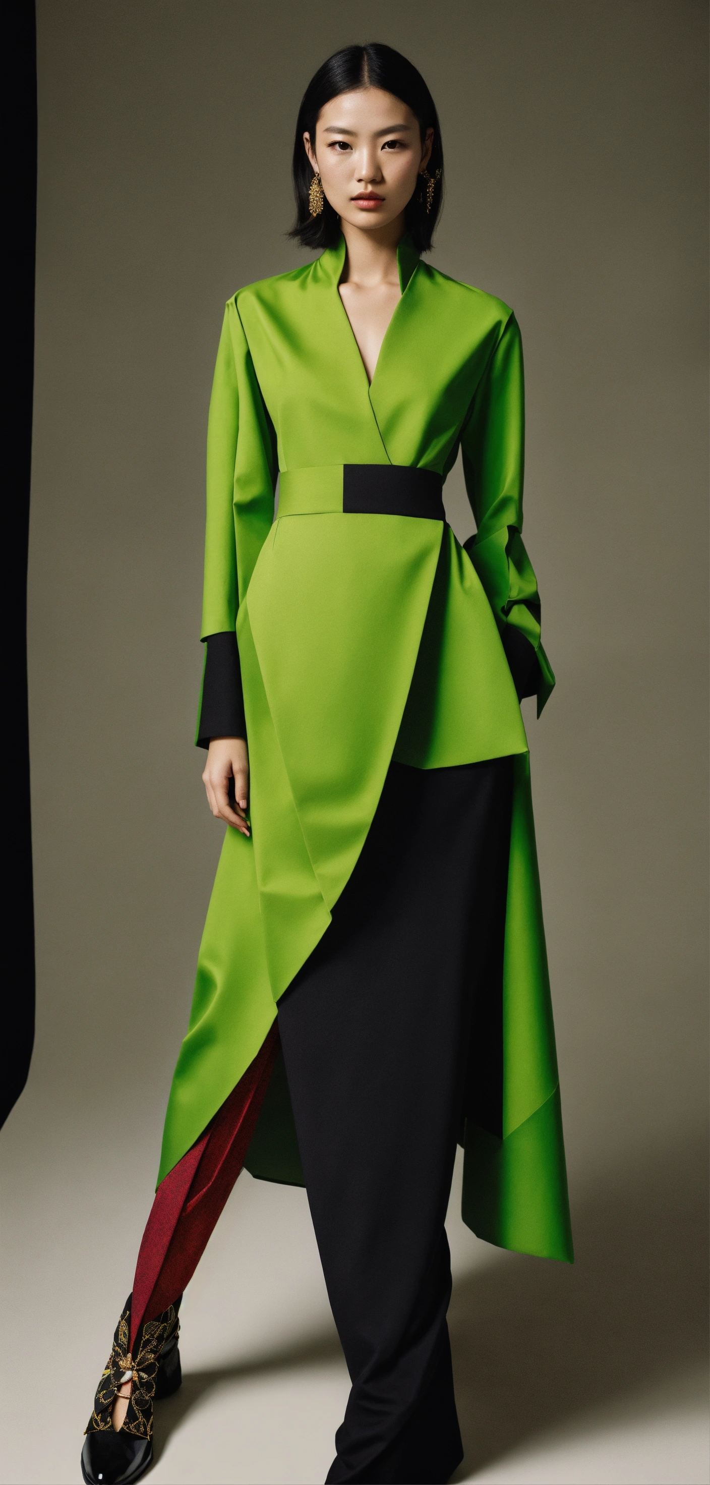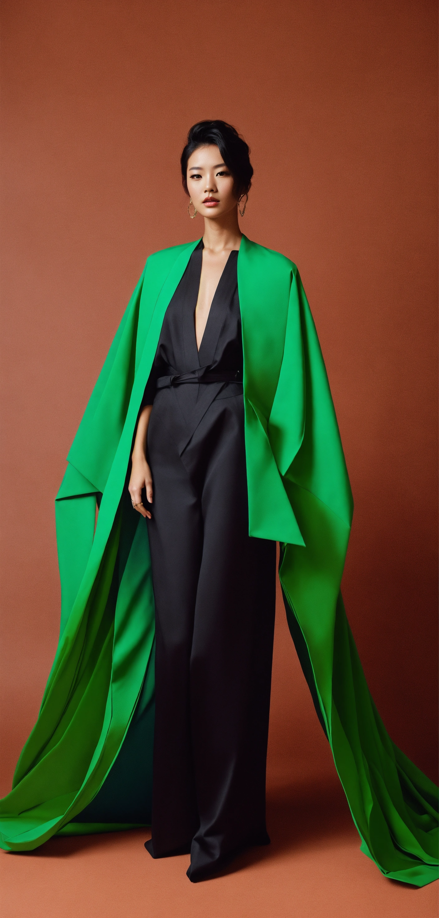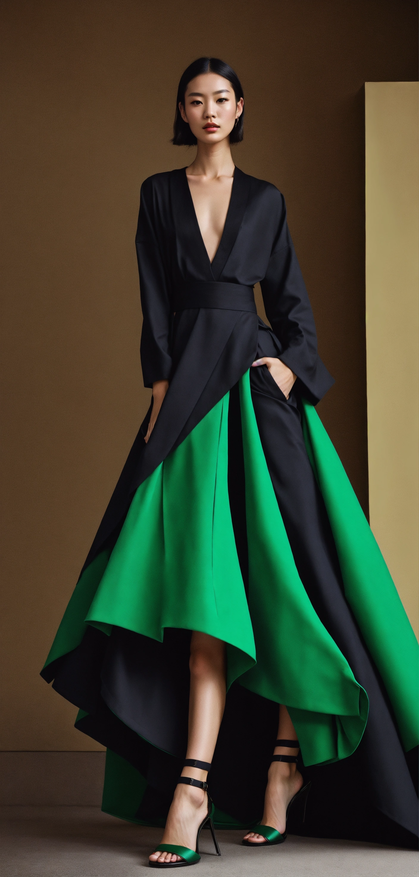 Capture a striking low-angle wide shot of a japanese model donning an avant-garde ensemble. the attire, crafted from elegant black and vibrant green cotton, boasts a stylish v-neck design. it features a high-low cut that cascades gracefully in the front, culminating in an exquisite train. the long sleeves draw inspiration from the precise folds of origami. this high-fashion studio shot, reminiscent of the artistic vision of alasdair mclellan, exudes a captivating allure.