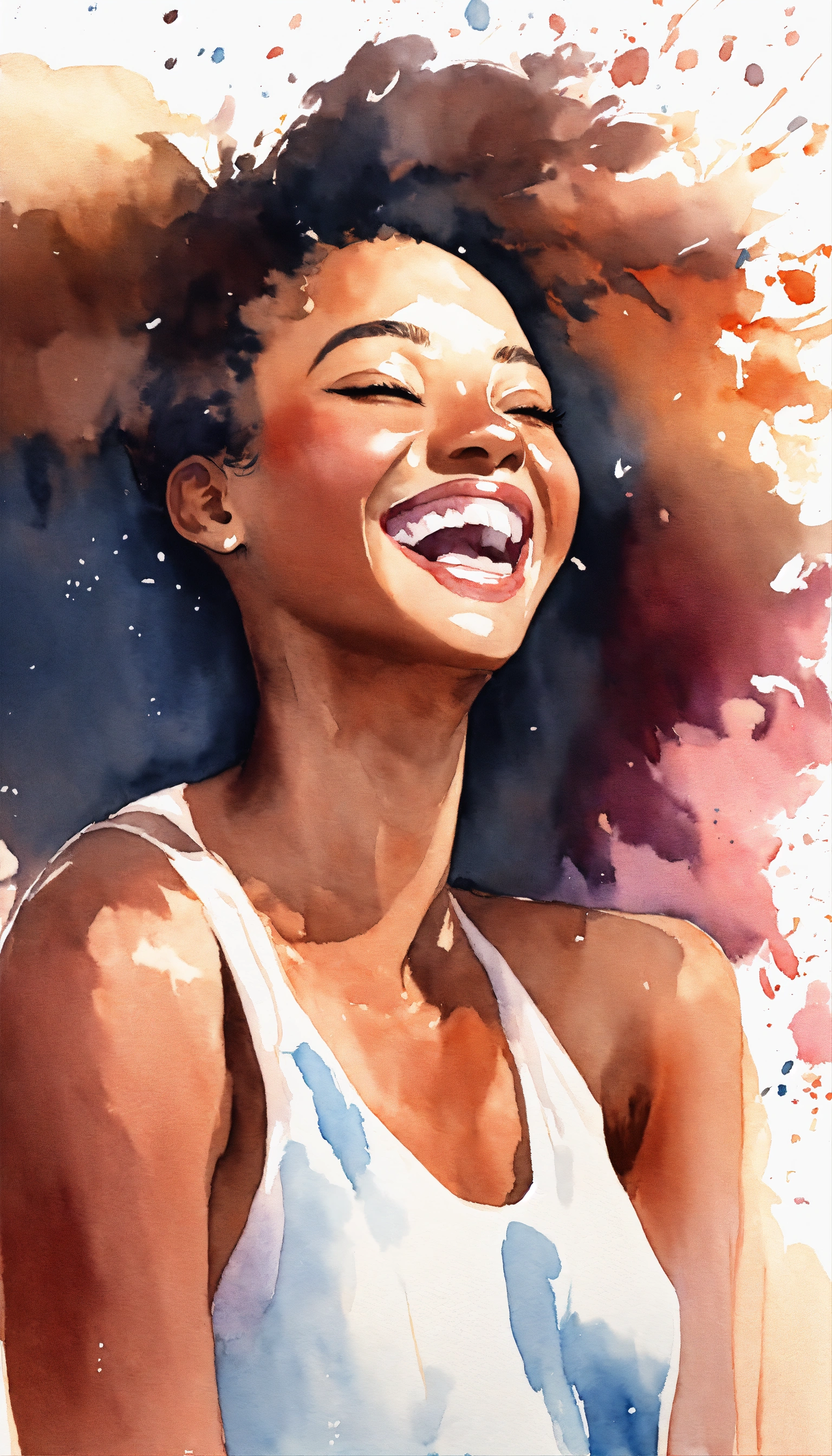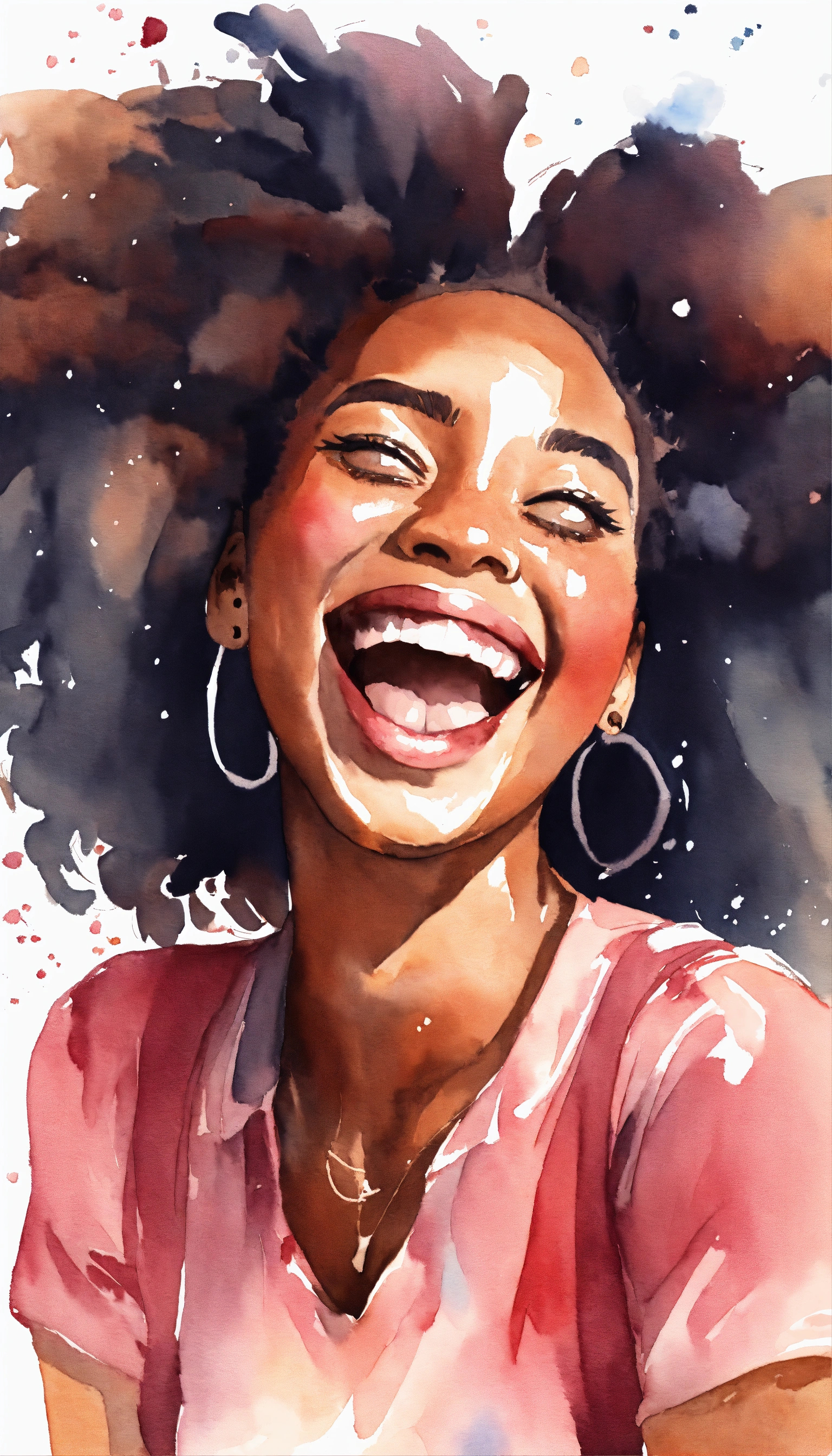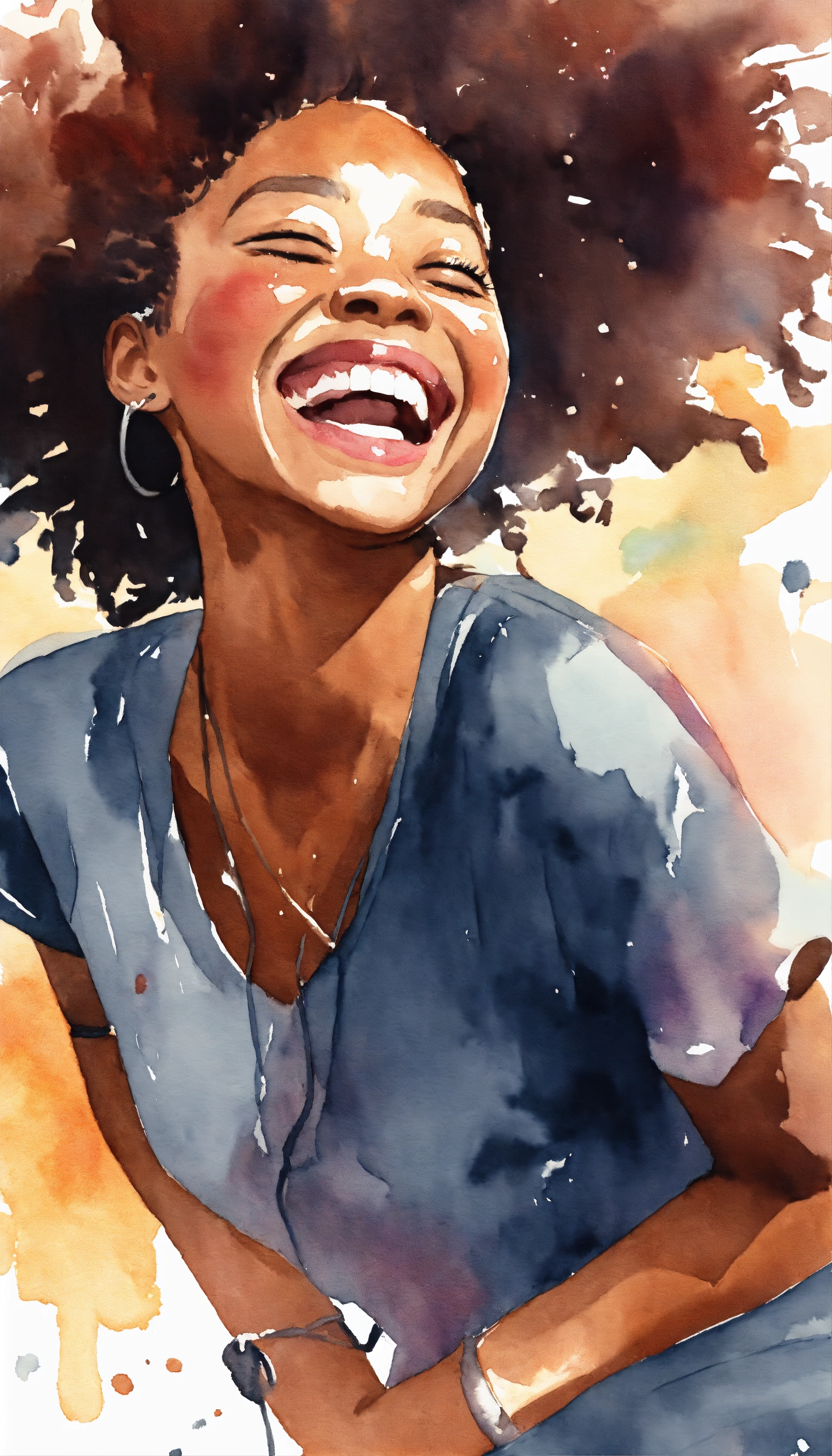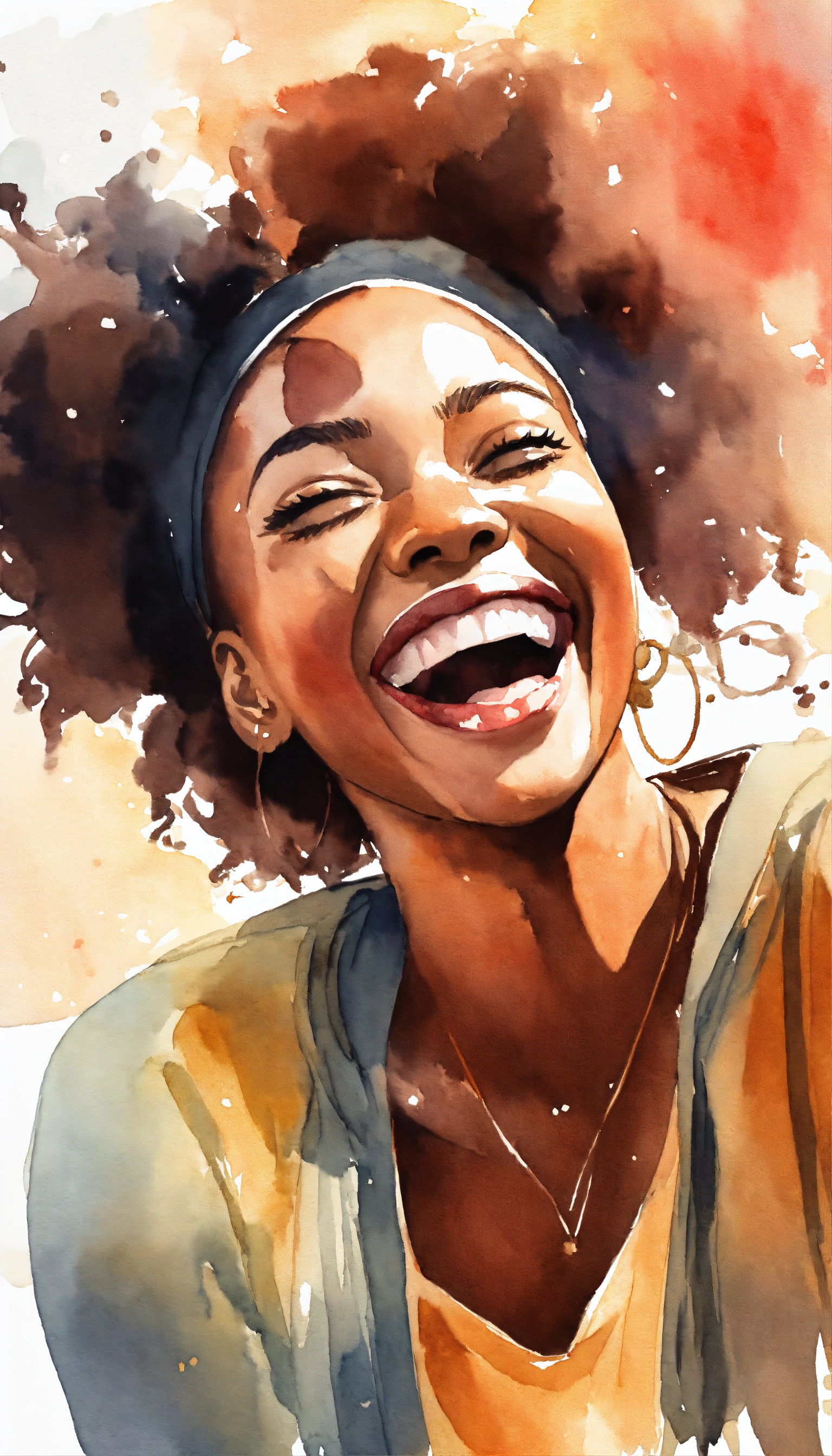 Joyful black girl laughing, candid lighting capturing her happiness, watercolor clip art, vector image, flat white background