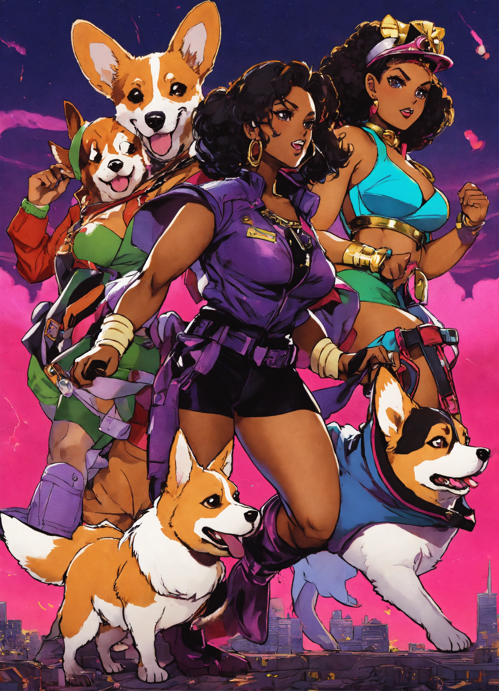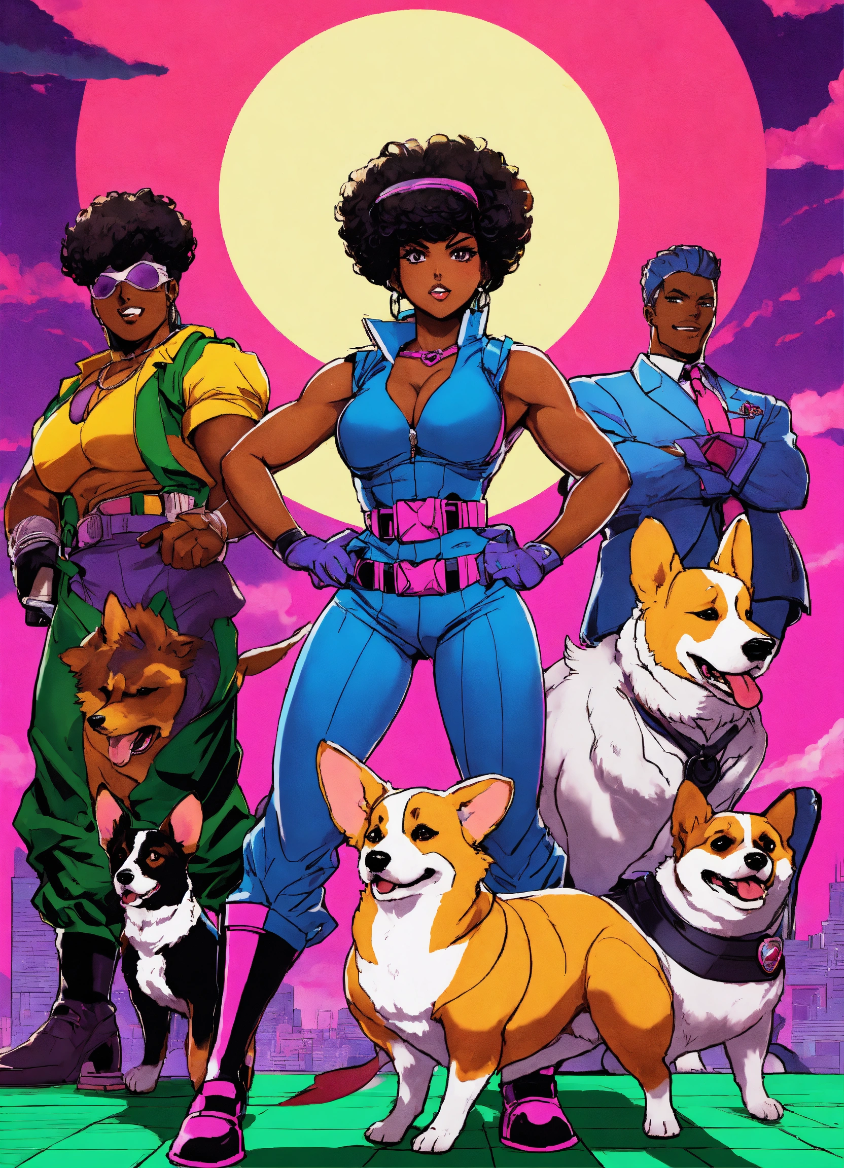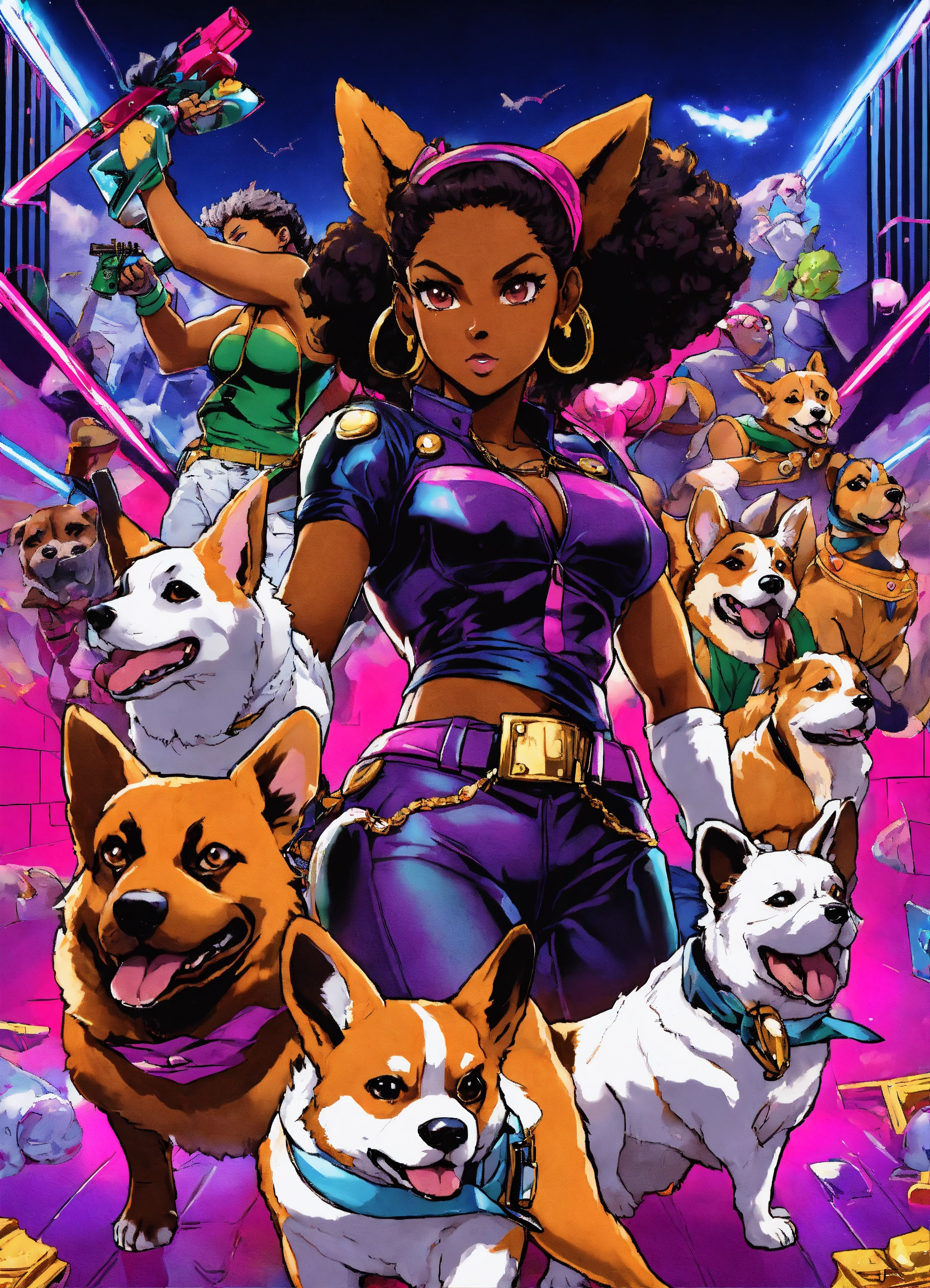 80's villain black female characters jojo's bizarre corgi stands adventure manga art style in action fighting video game cover