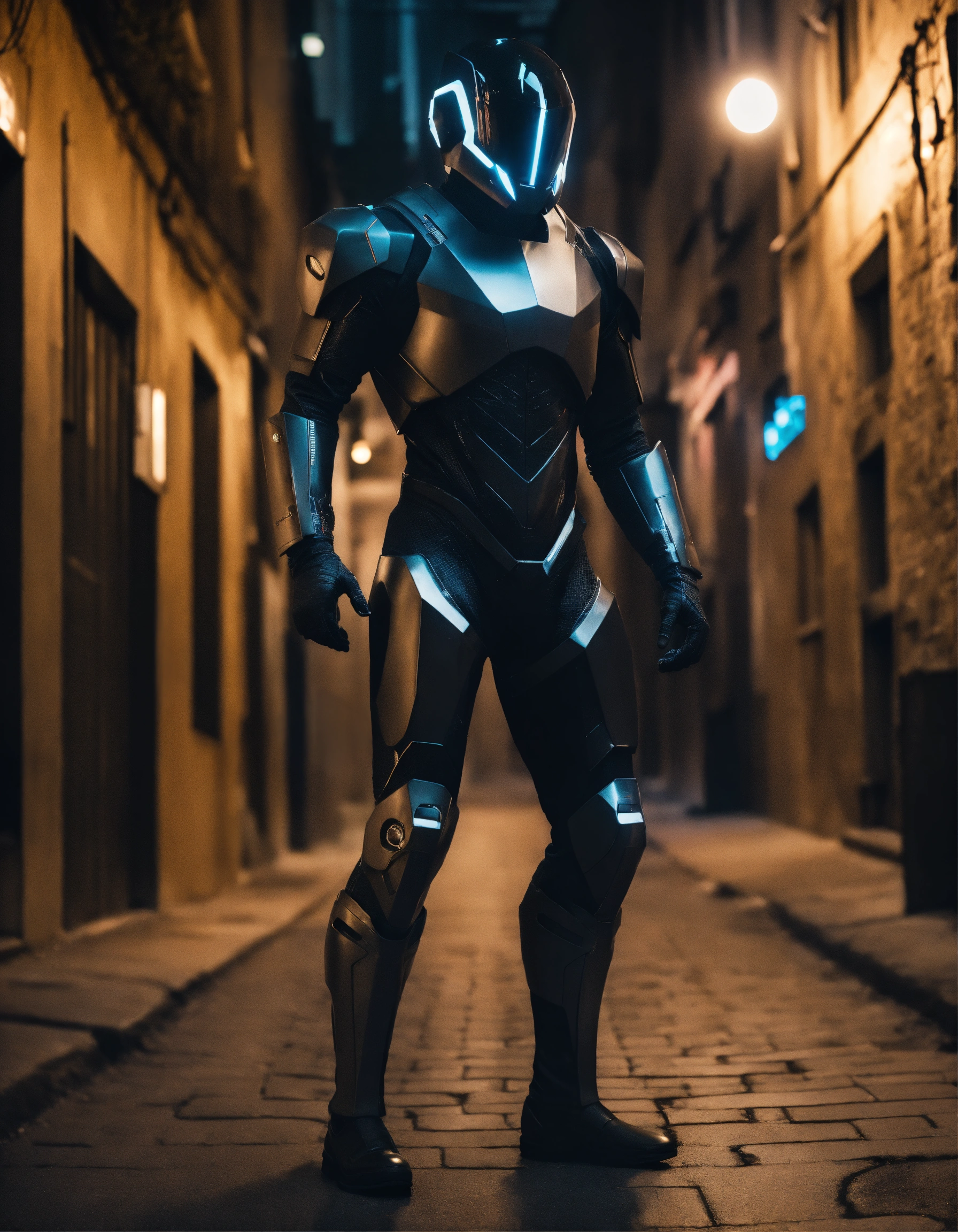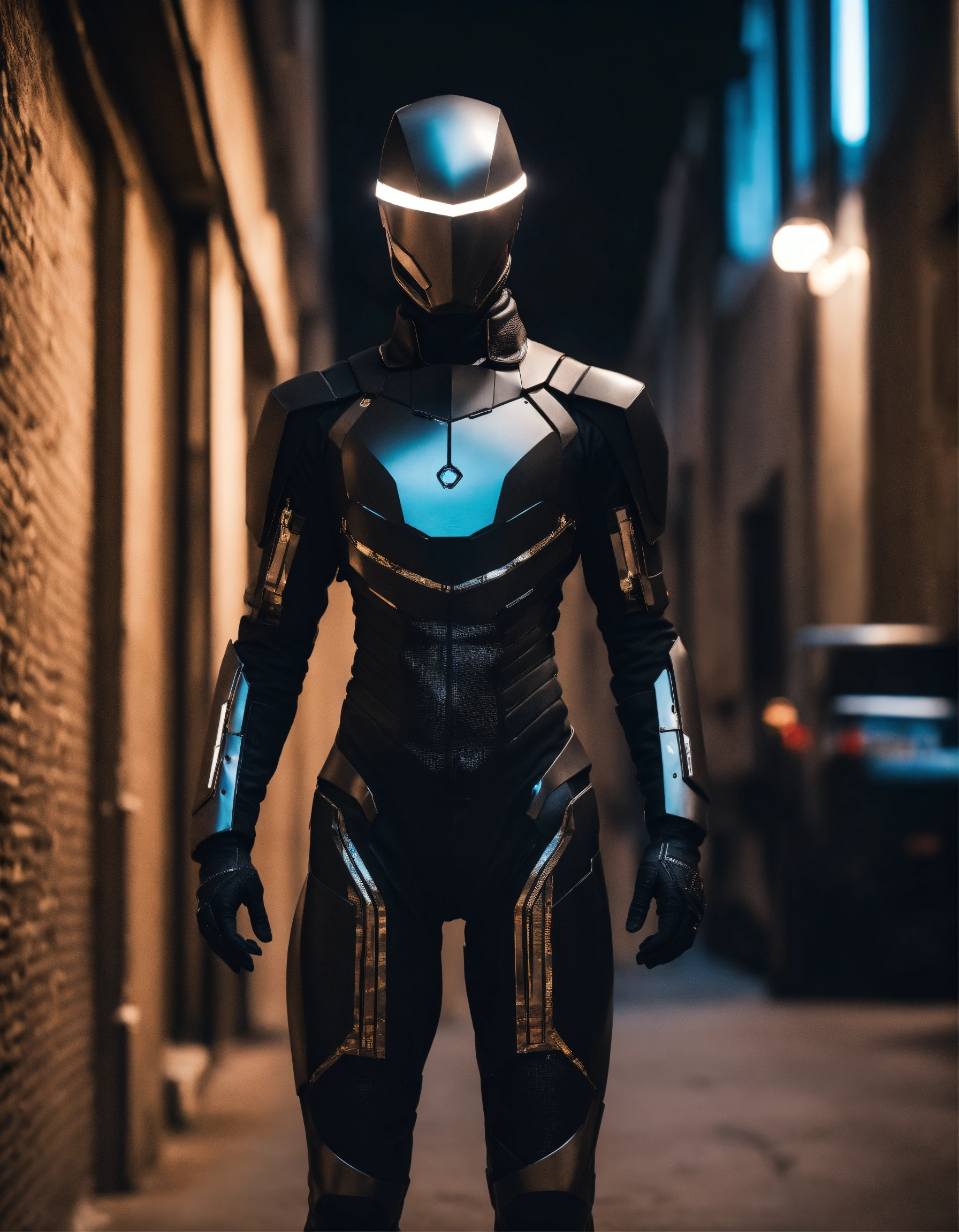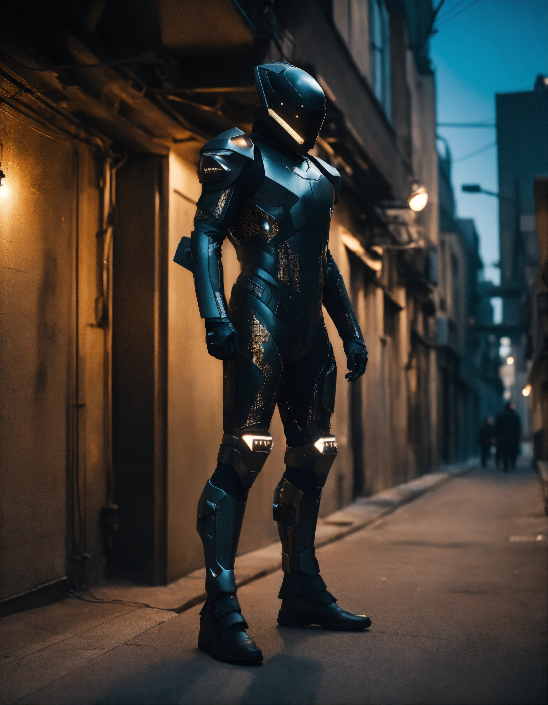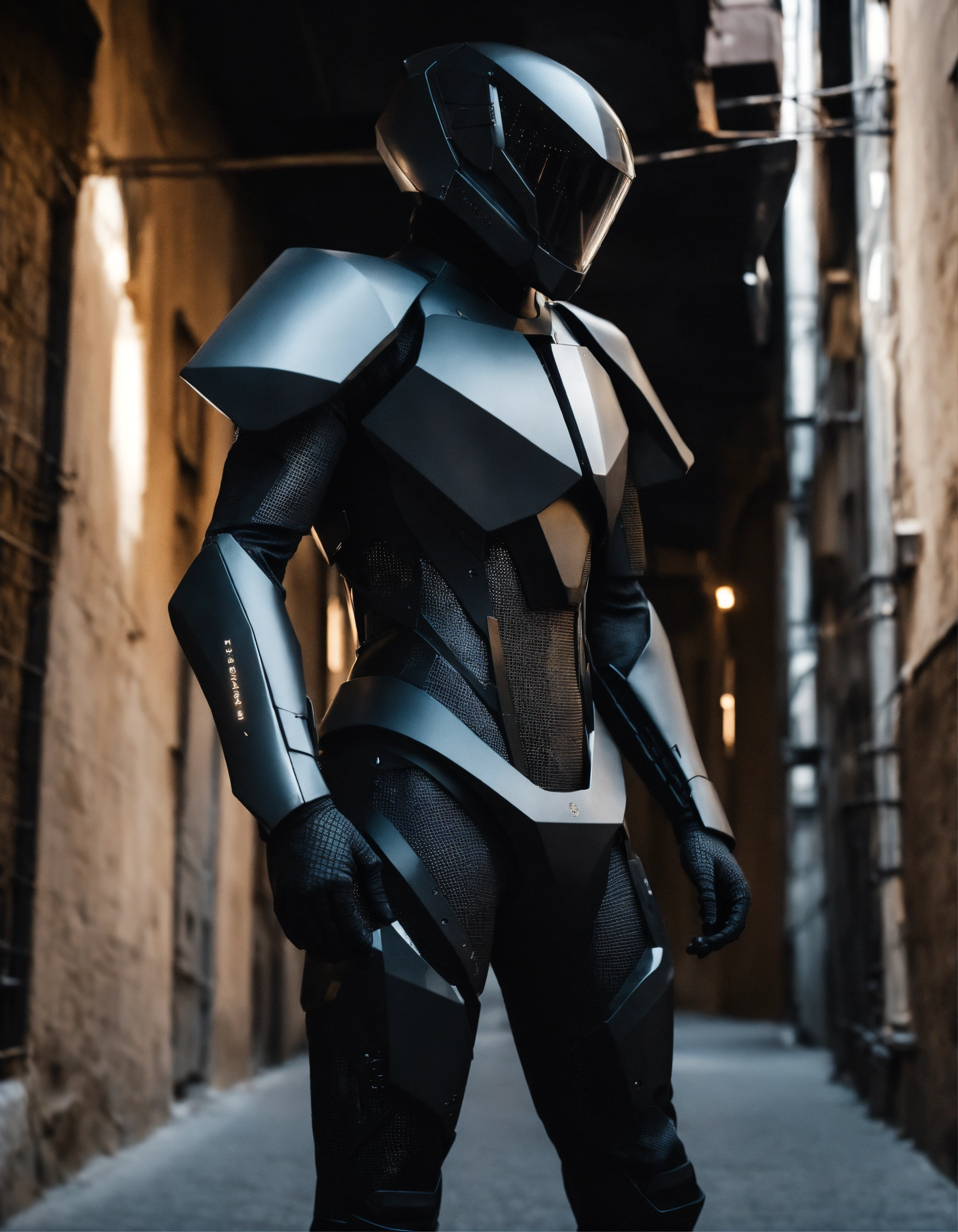 An ultrarealistic photograph of a minimalist futuristic full body power suit, without lights, made of black mate metal and polymer, full crystal hull, for a fit man, imposing, modern minimalism, elegant, dystopia, mysterious, godlike, scary, in a narrow alley in a desert city, 8k