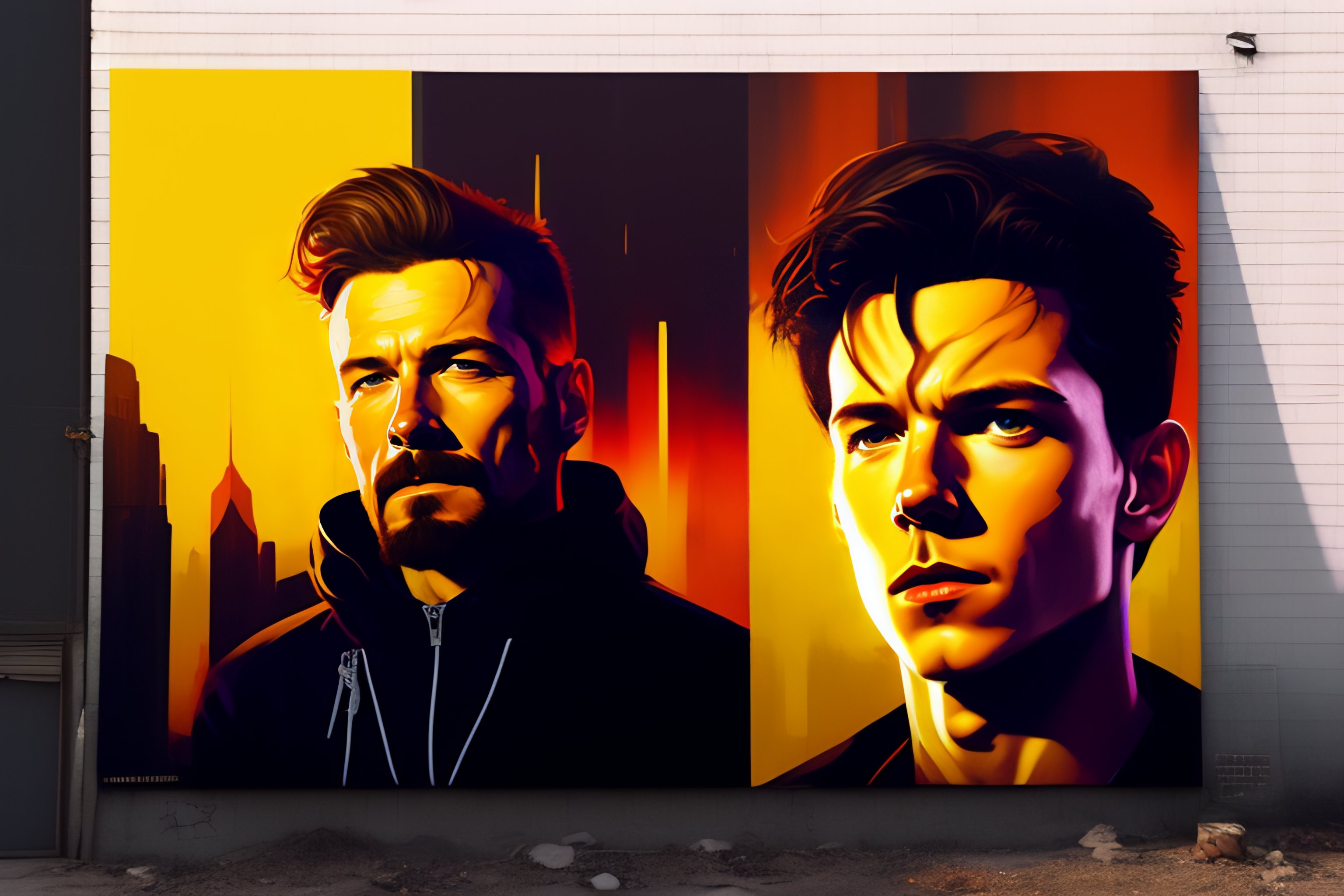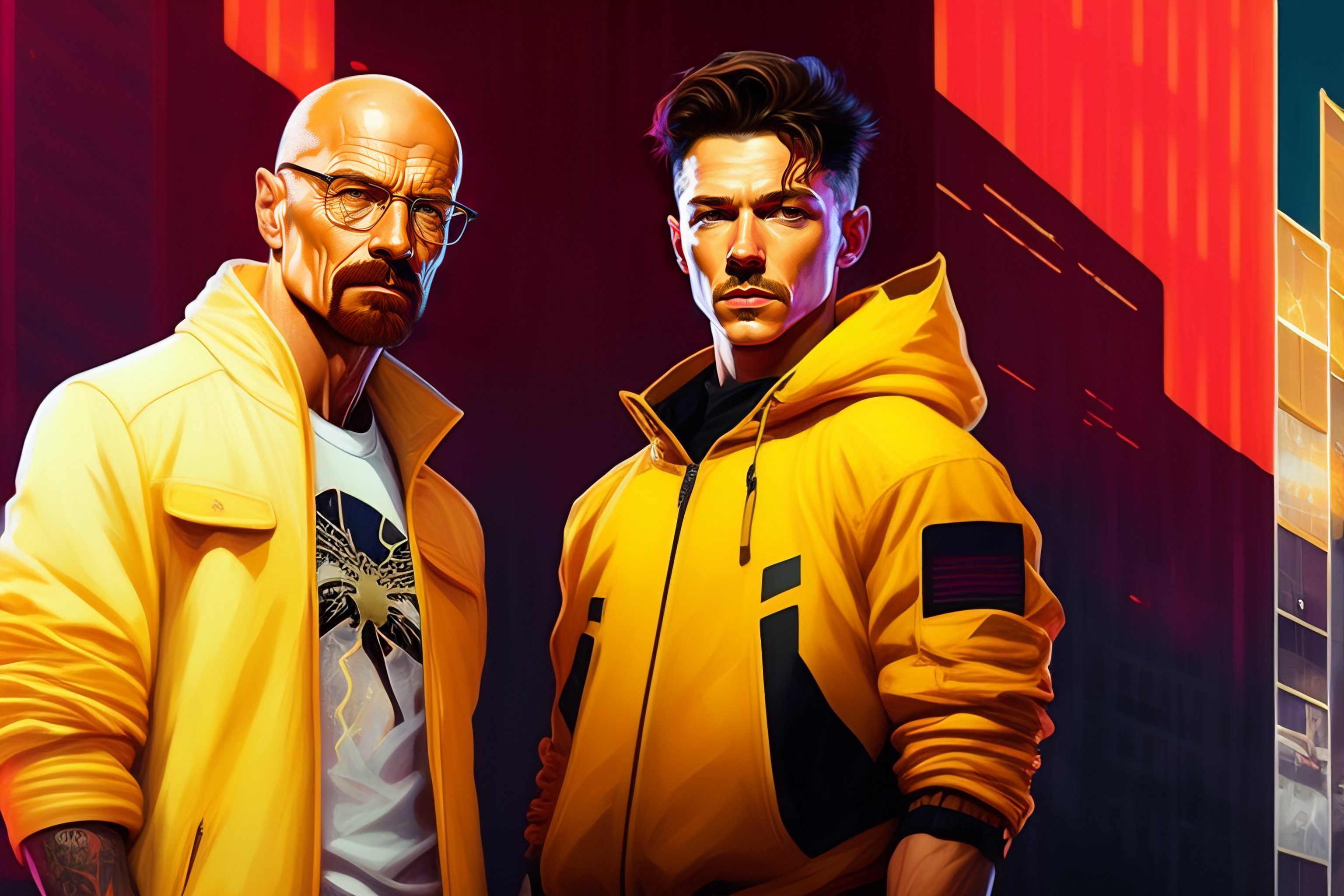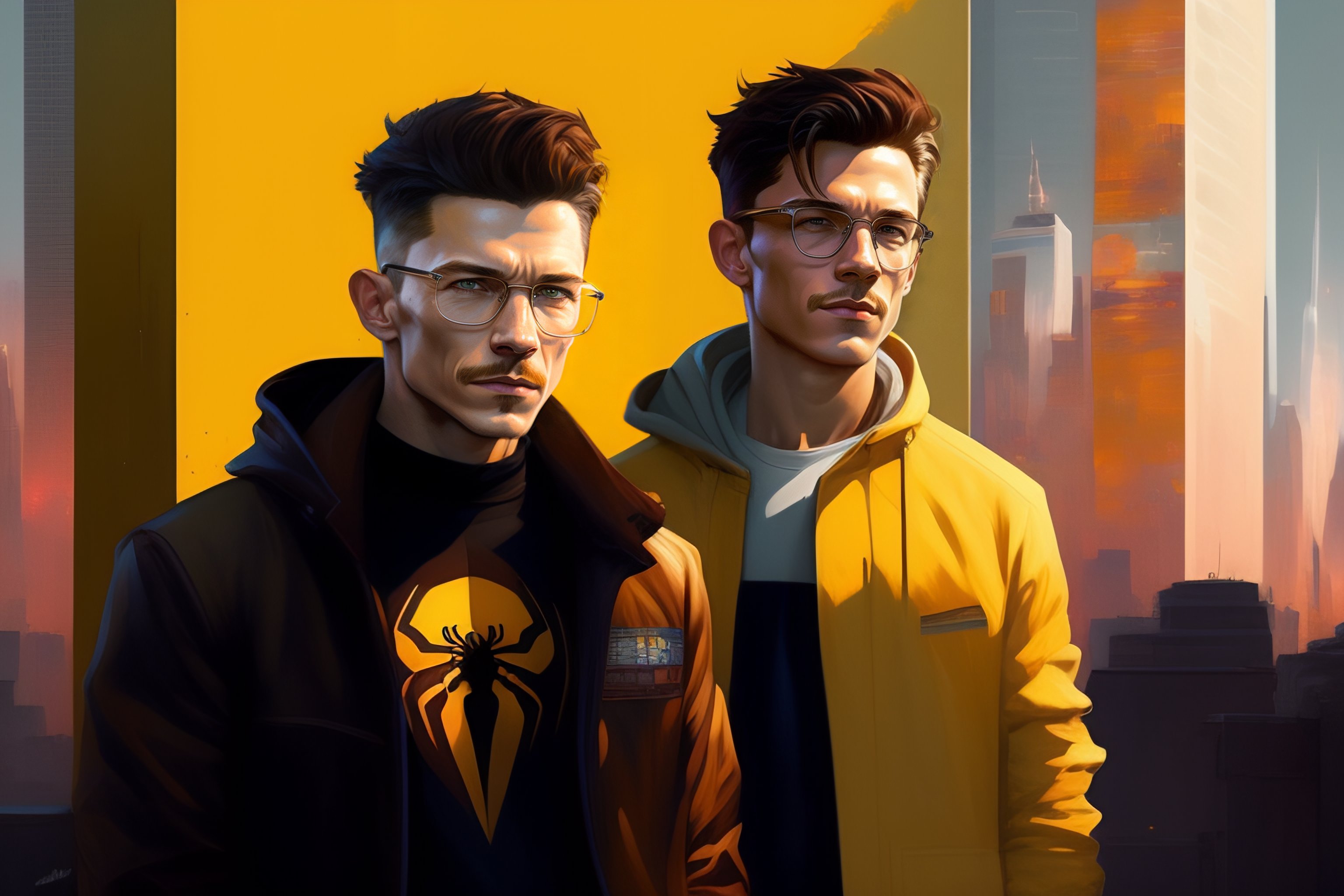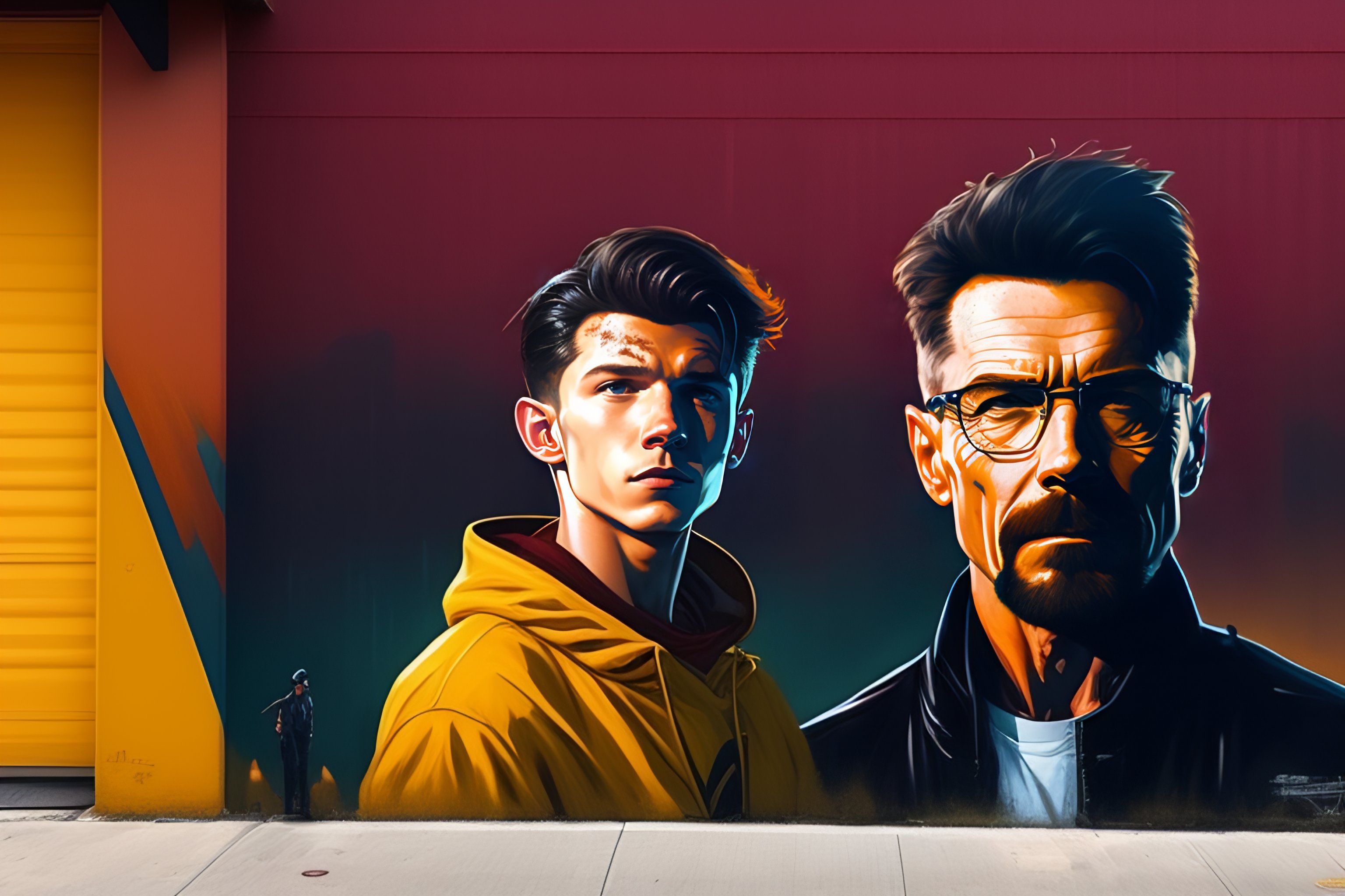 Full body highly detailed portrait of walter white and tom holland as spiderman in the twin towers september 11 attack, by greg rutkowski, by greg tocchini, by james gilleard, by joe fenton, by kaethe butcher, gradient yellow, black, brown and magenta color scheme, grunge aesthetic!!! graffiti tag wall background