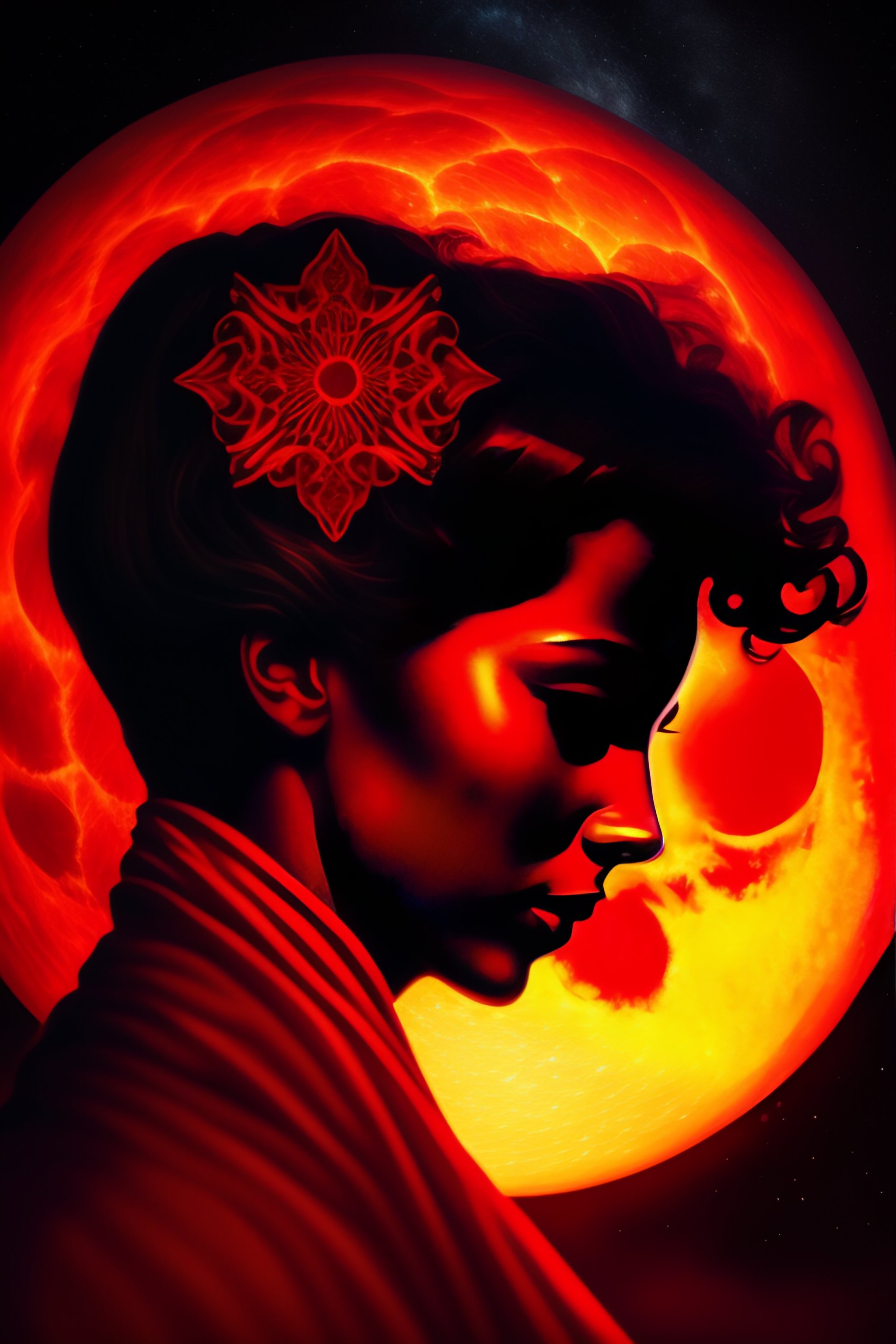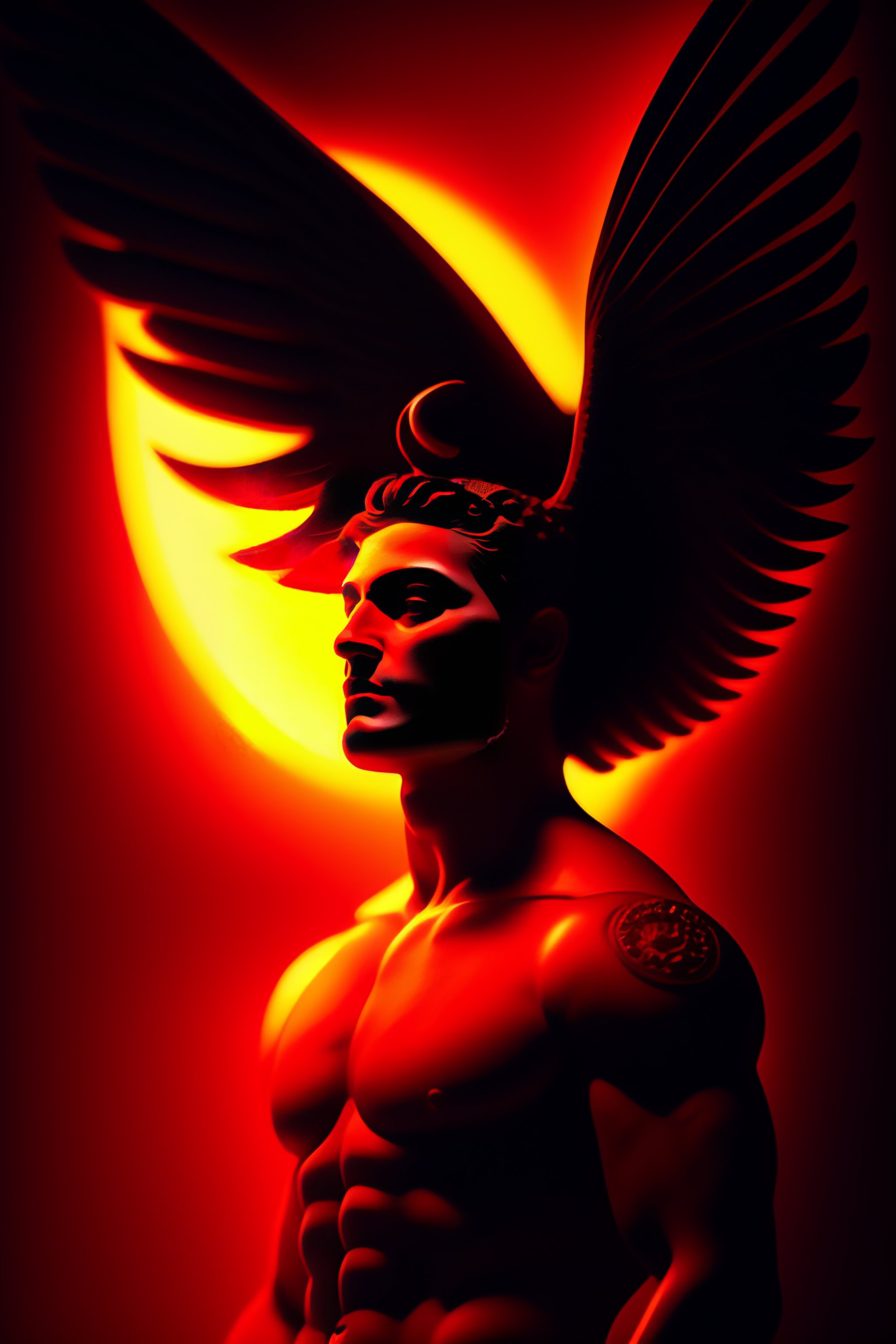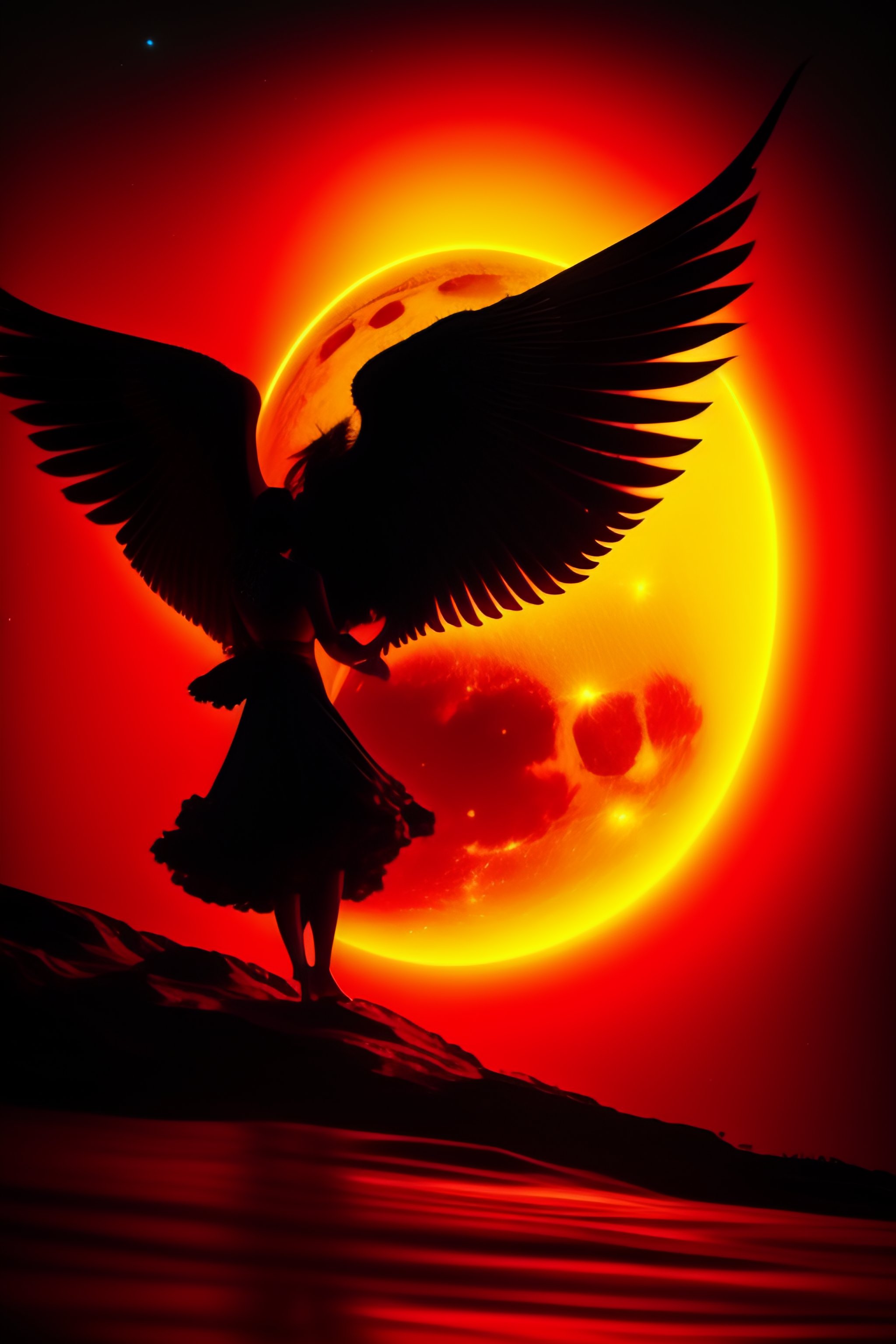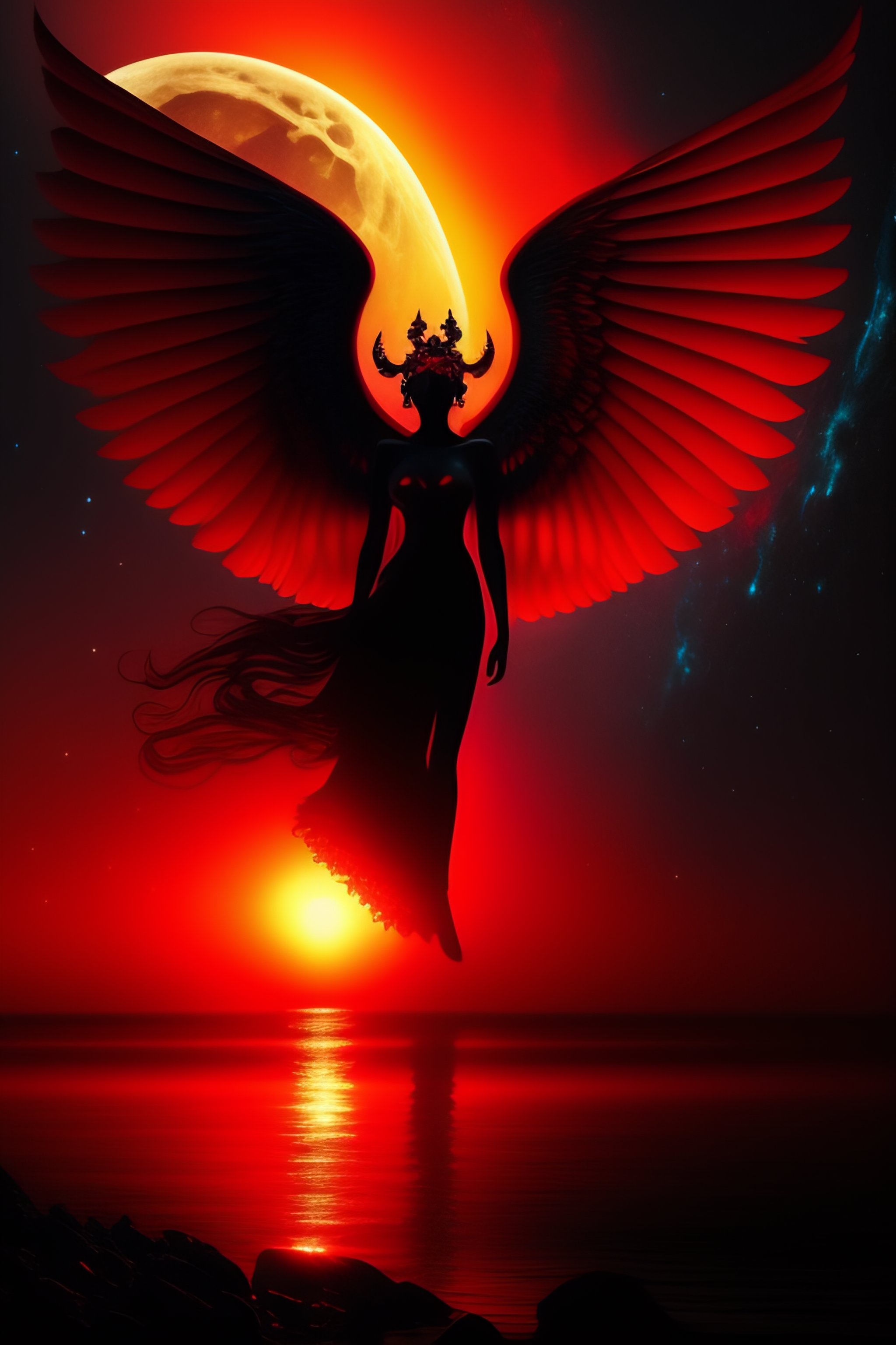 Lucifer con alas negras levitando a la luz de la luna en una noche estrellado recubierto con un aura roja
