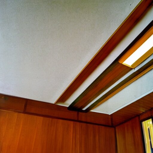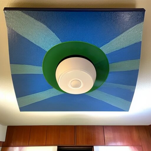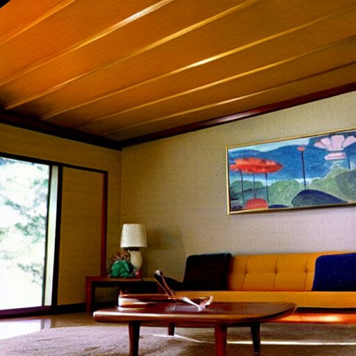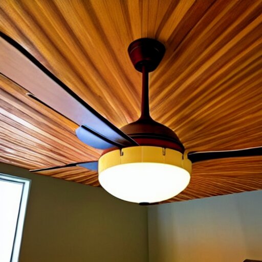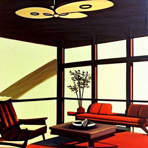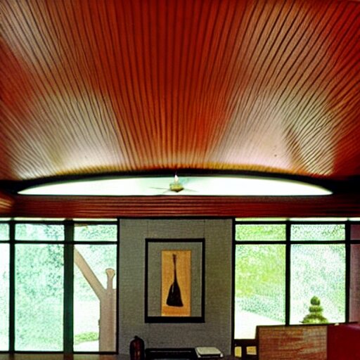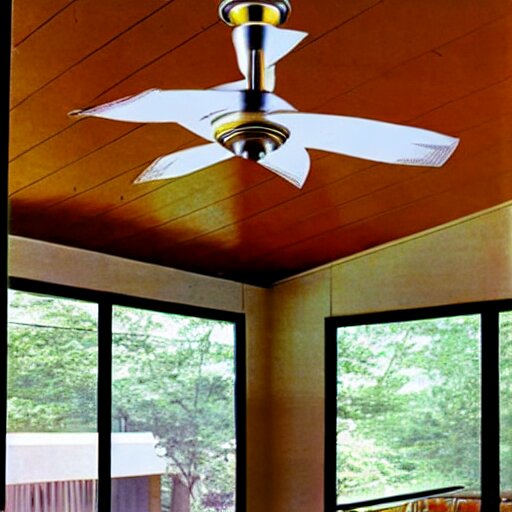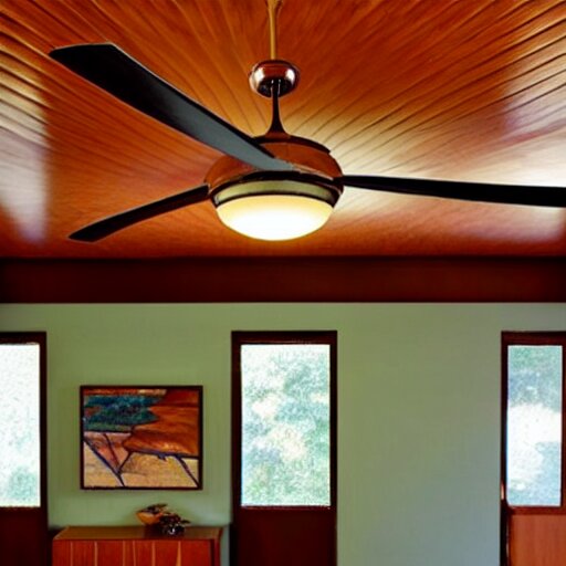 A picture of an oil painting of a ceiling fan in a mid century modern house designed by frank lloyd wright