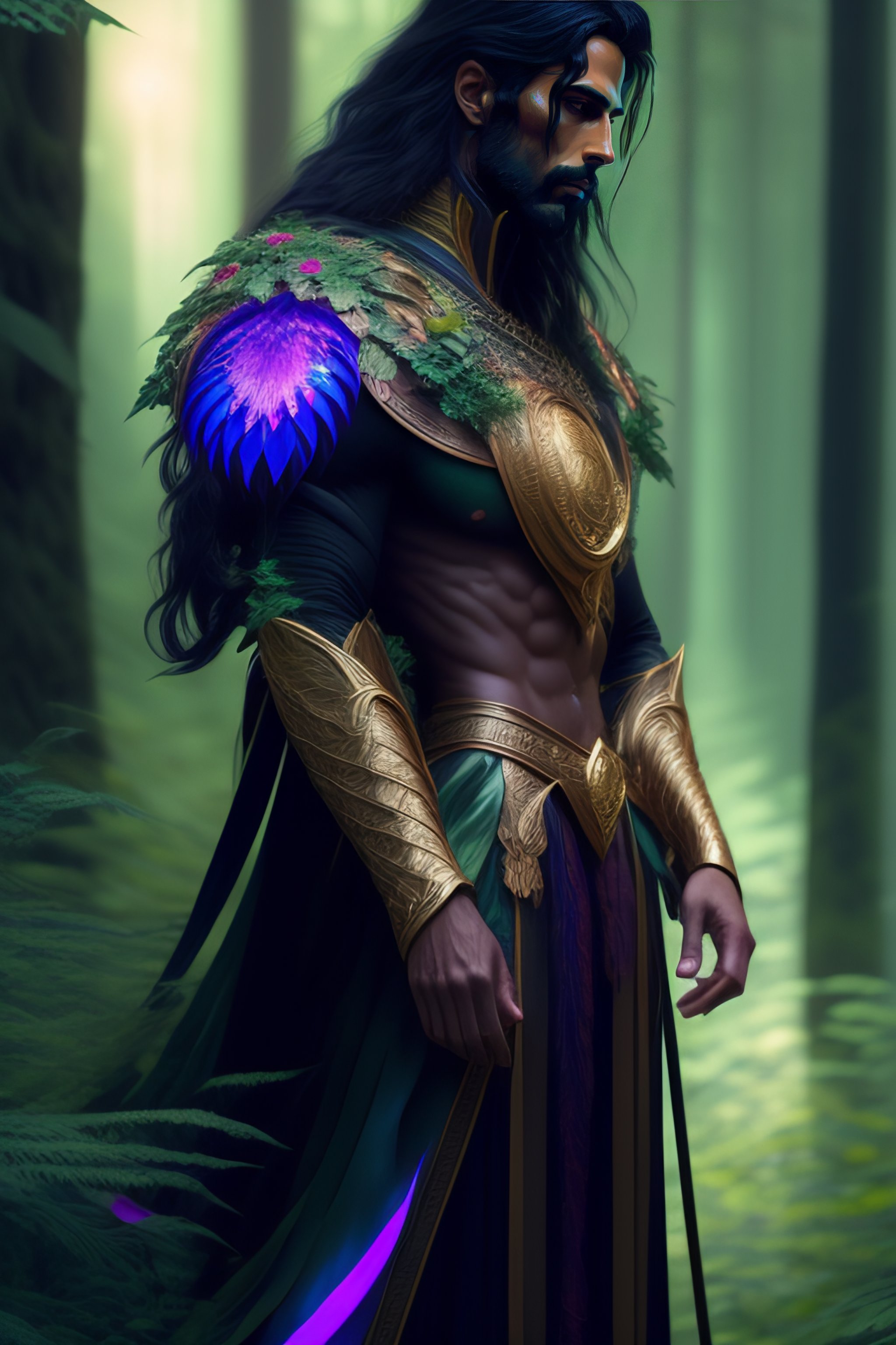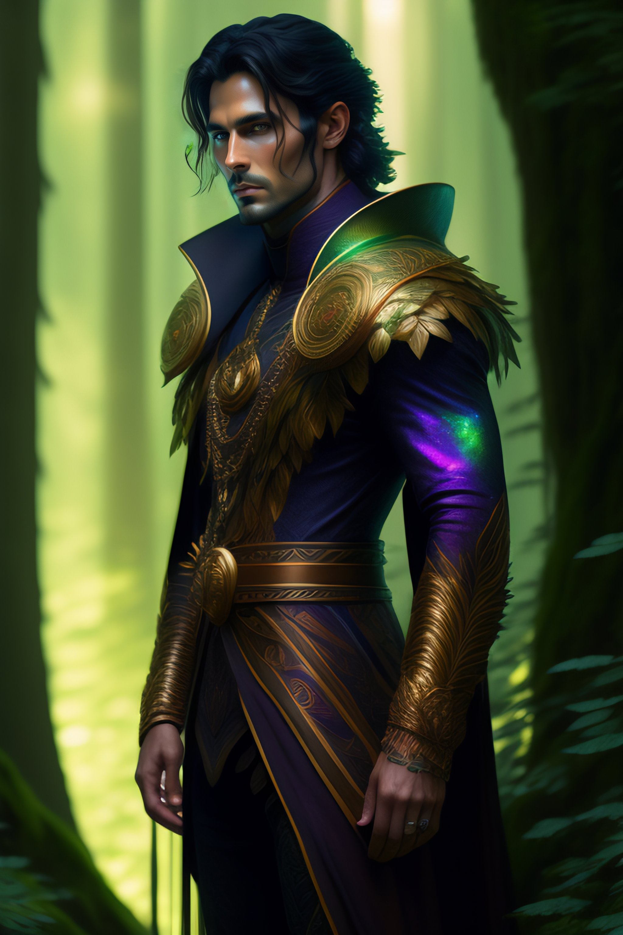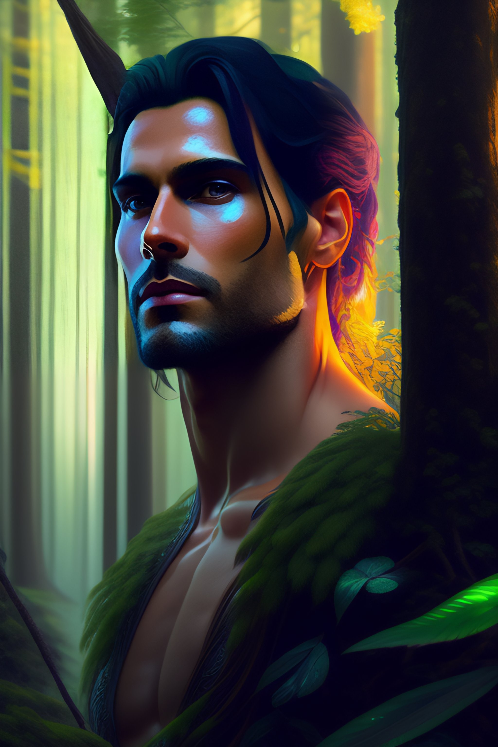 Forest god, full length shot of handsome dark haired male standing in alien colorful forest, highly detailed, digital painting, deviantart, artstation, concept art, matte, sharp focus, photo realistic, detailed face, photorealistic pale skin, greg rutkowski and alphonse mucha
