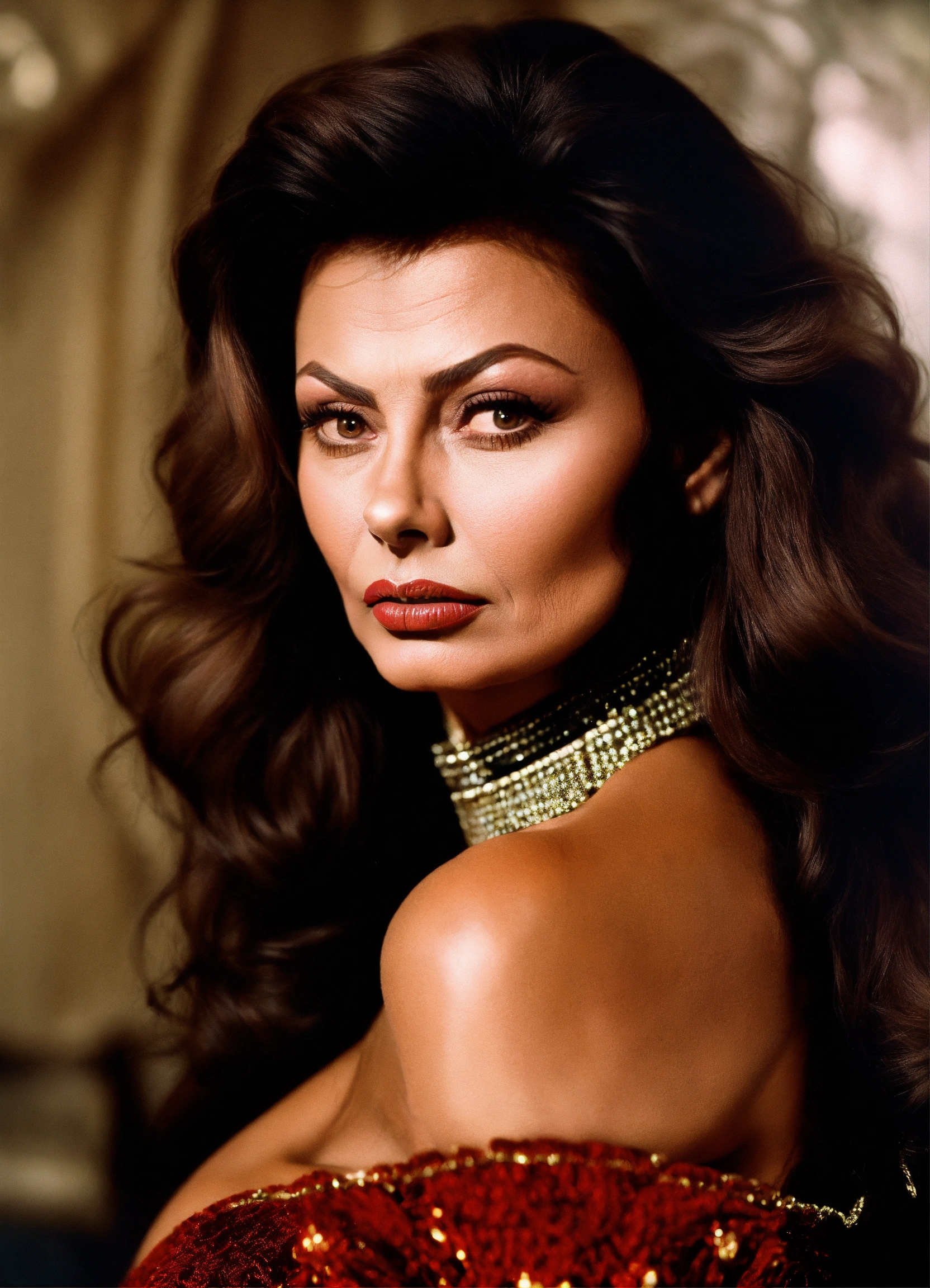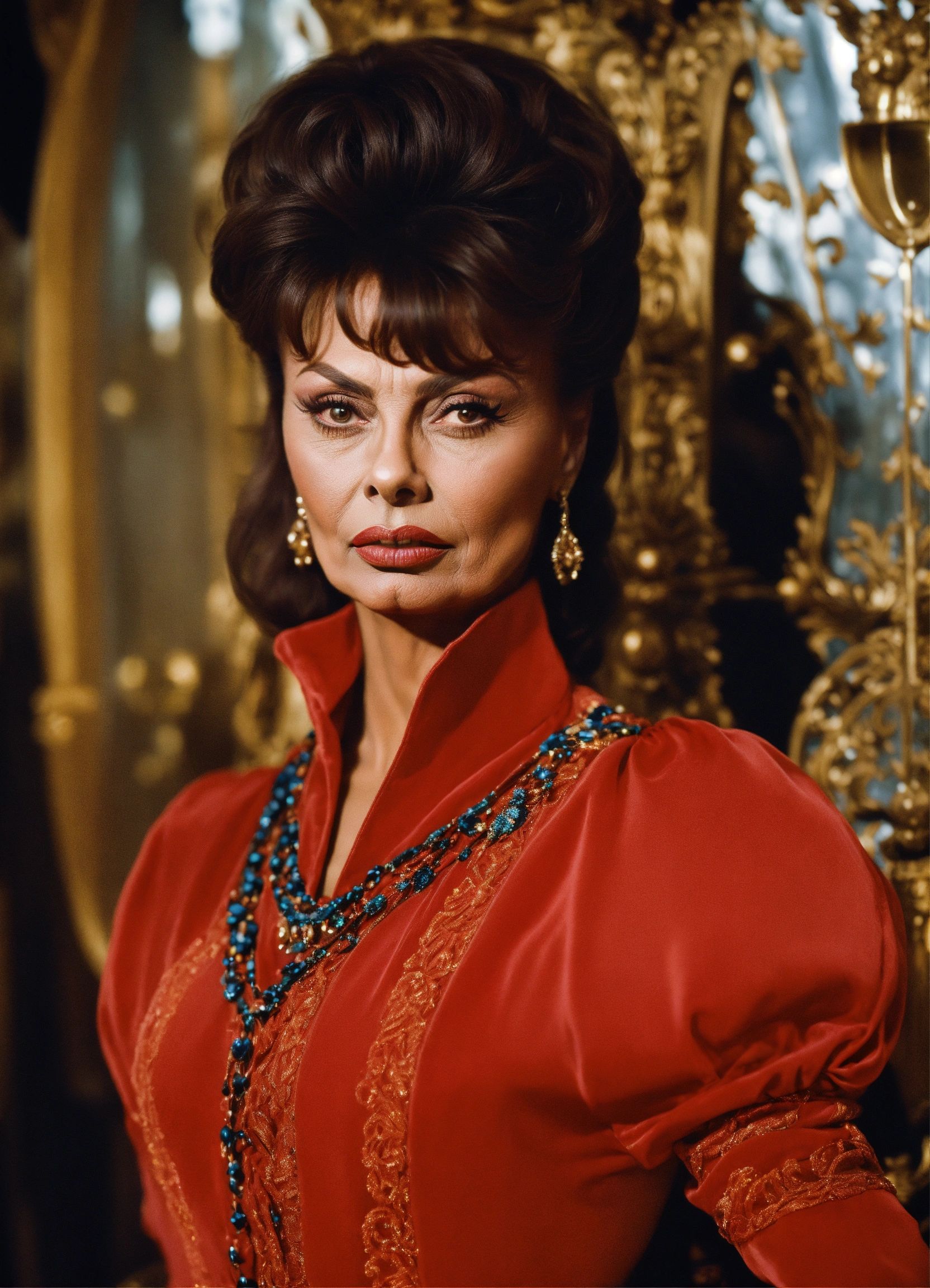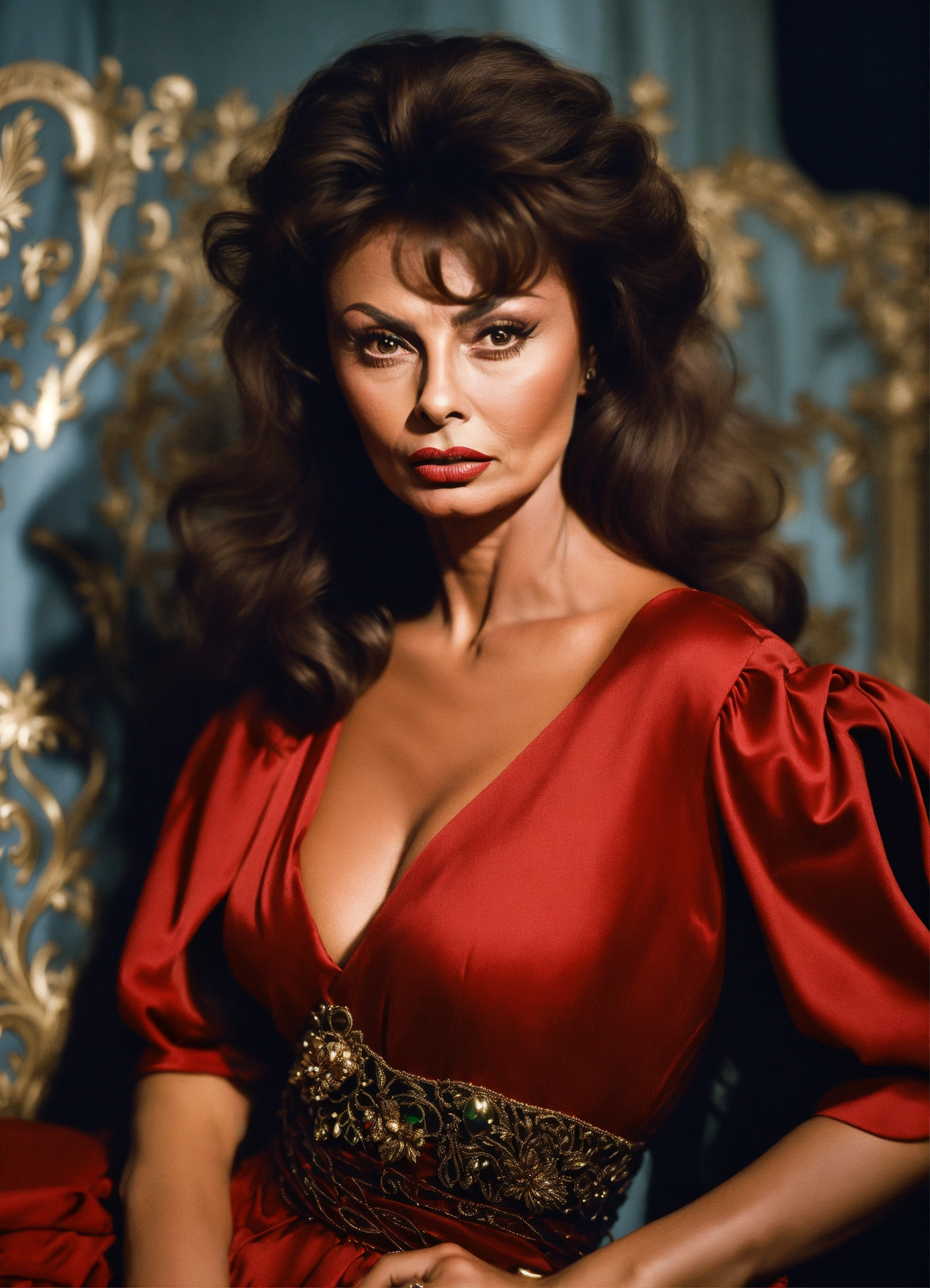 Photo quality portrait of sophia loren as a knight with dark flowing hair, pouting crimson lips and fierce glare