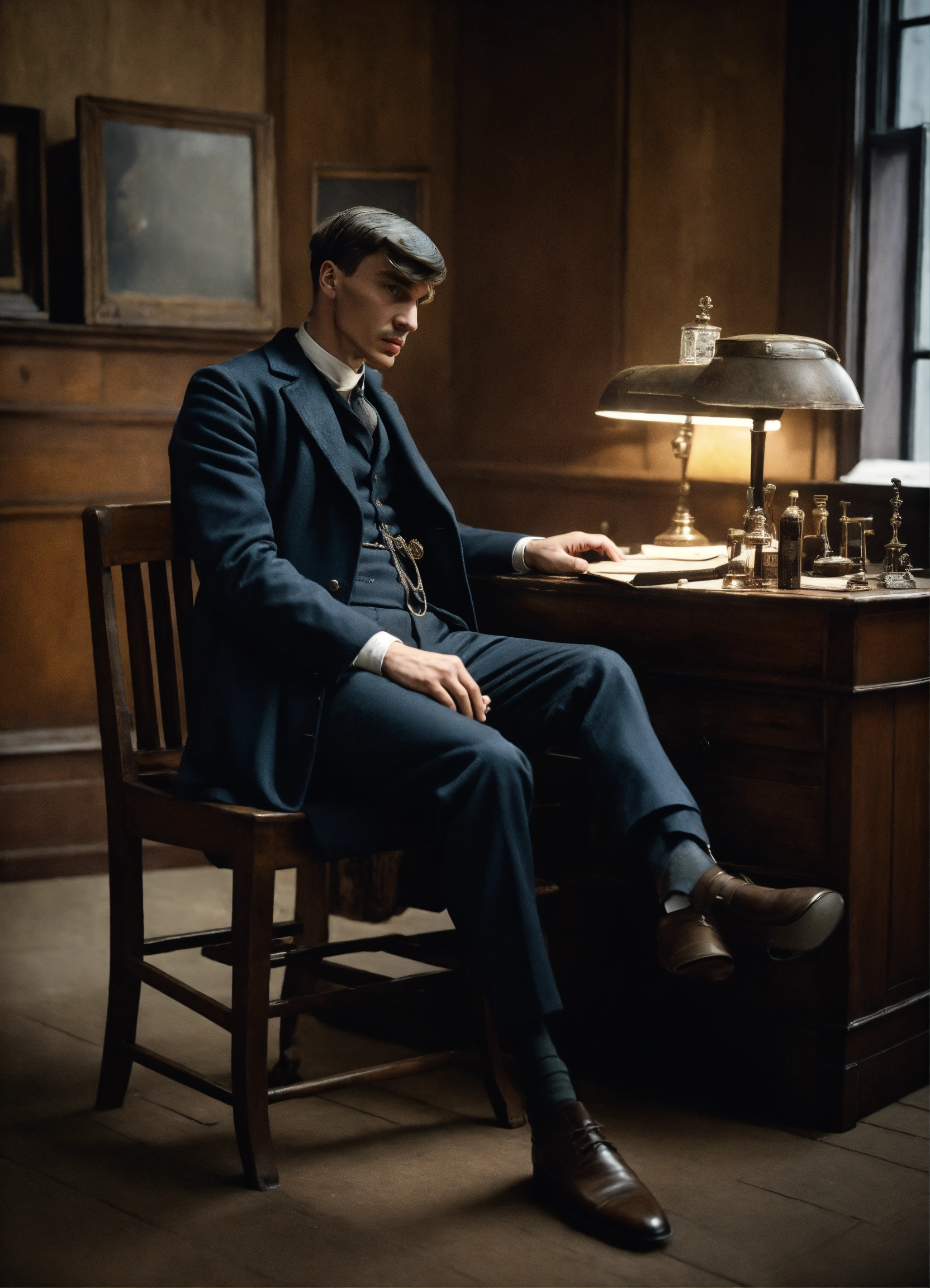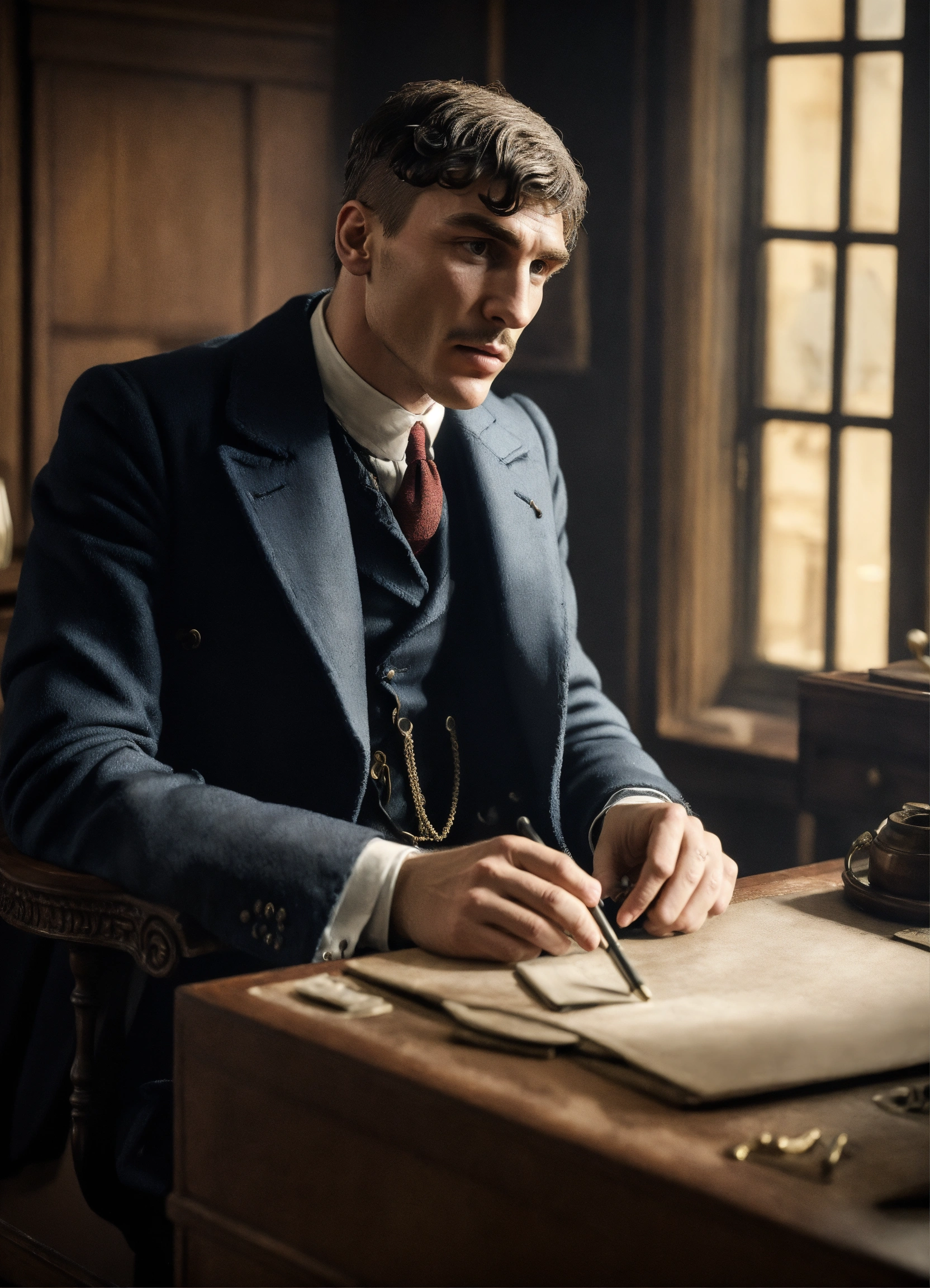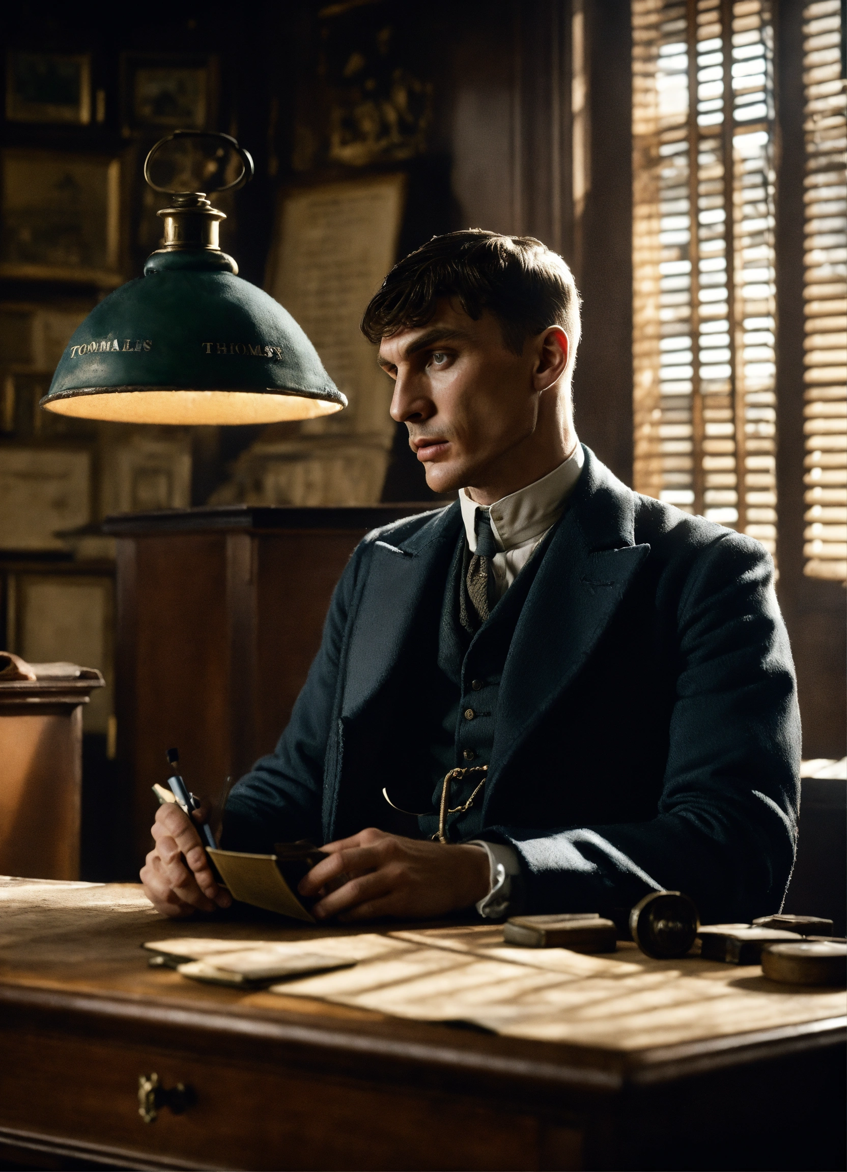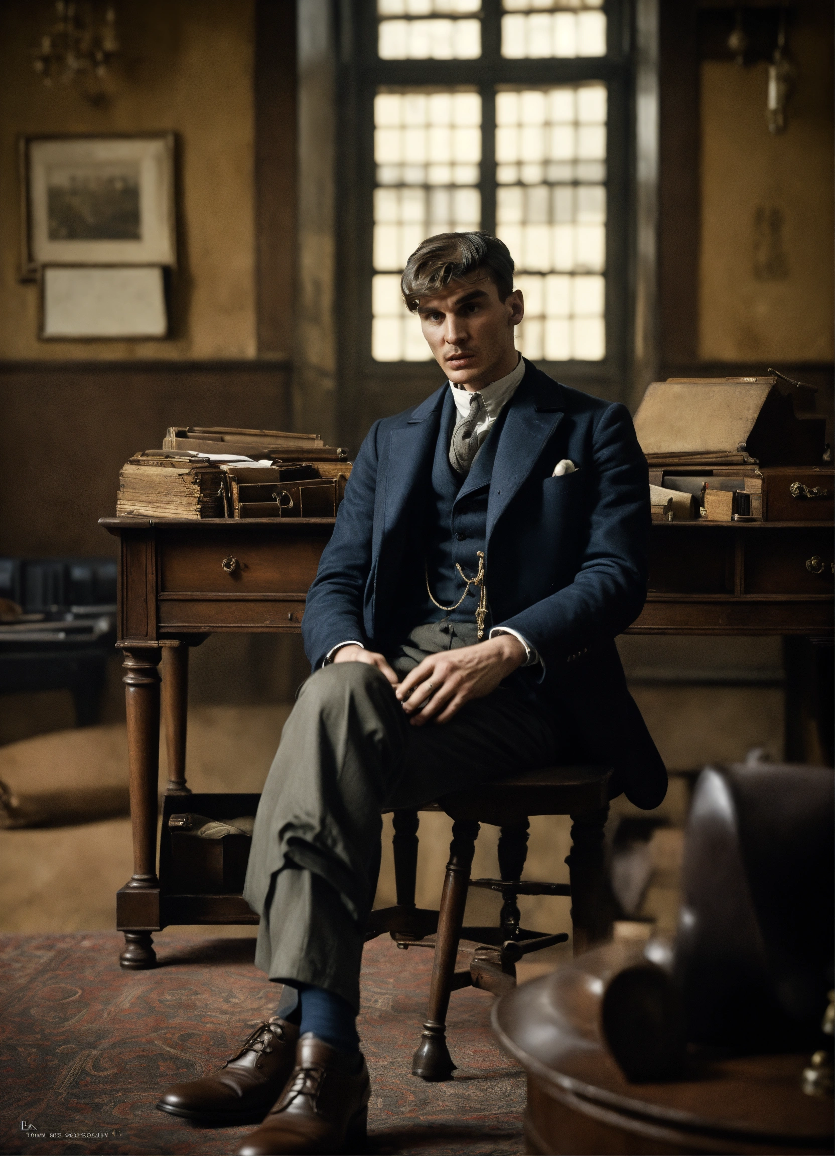 Thomas shelby est assis sur un bureau ancien, il regarde l’objectif, l’image est réaliste avec des détails