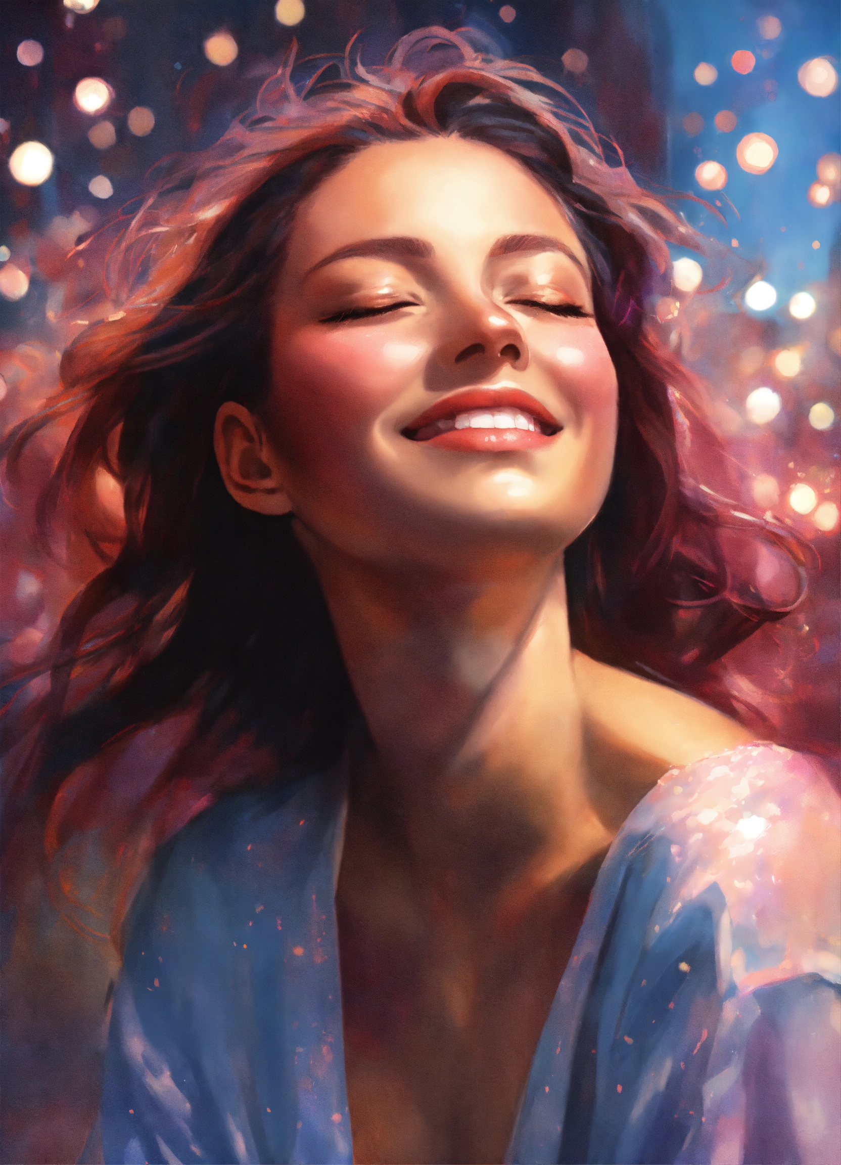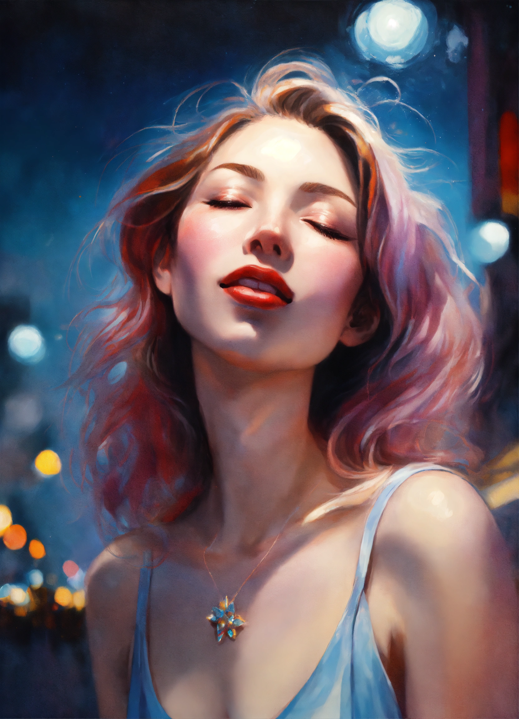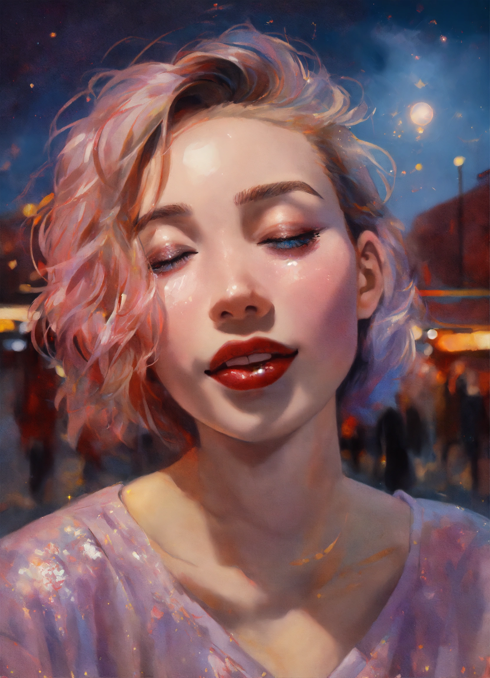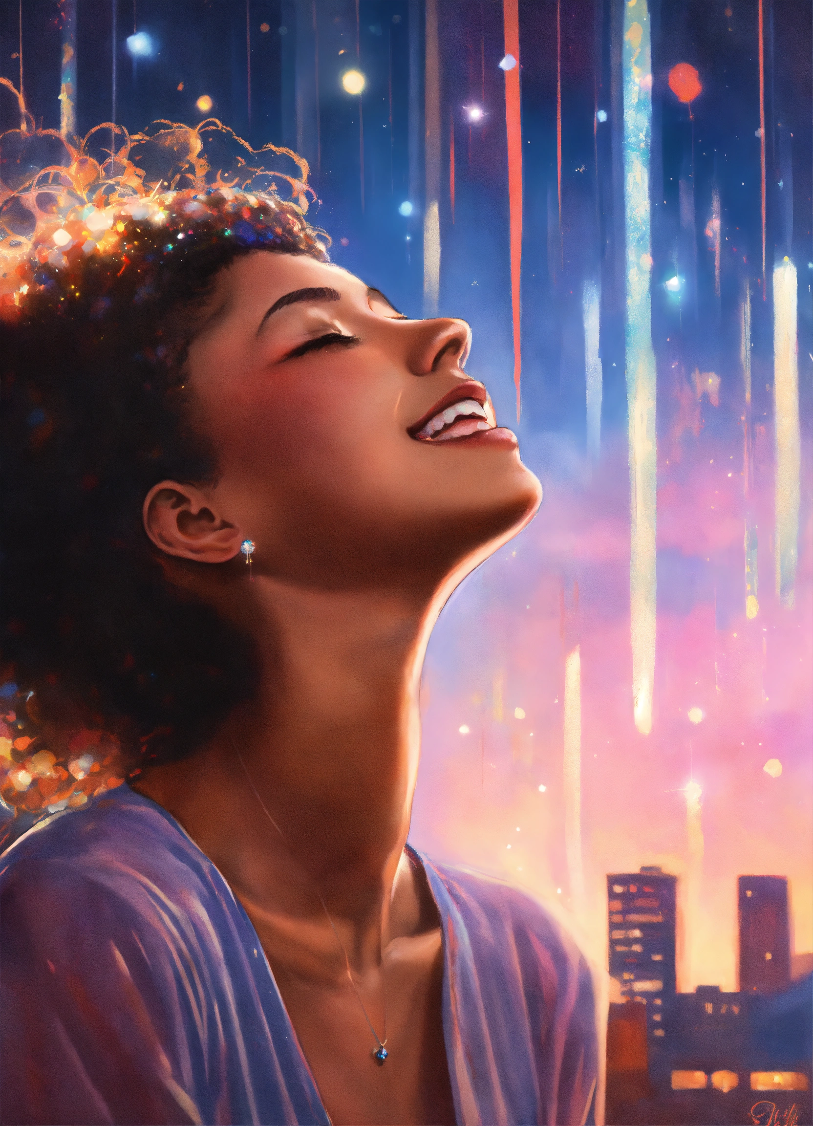 Superrealist style, urban style, someone looking to the sky, closed eyes, smile, closed but smiling mouth, satisfaction, happy, big light beam, glitters around, soft mauve aura, night, red shadows, pale blue, ivory