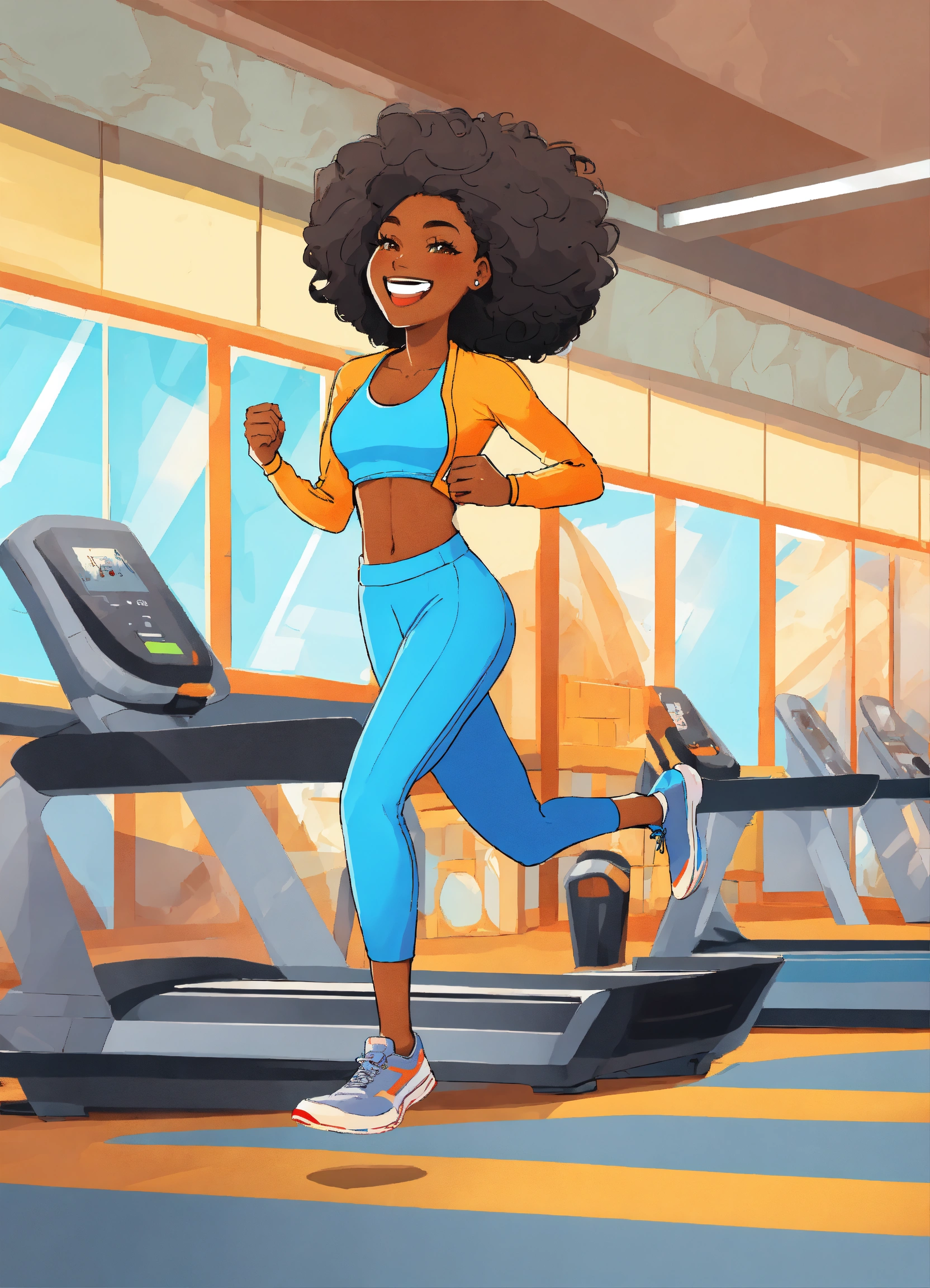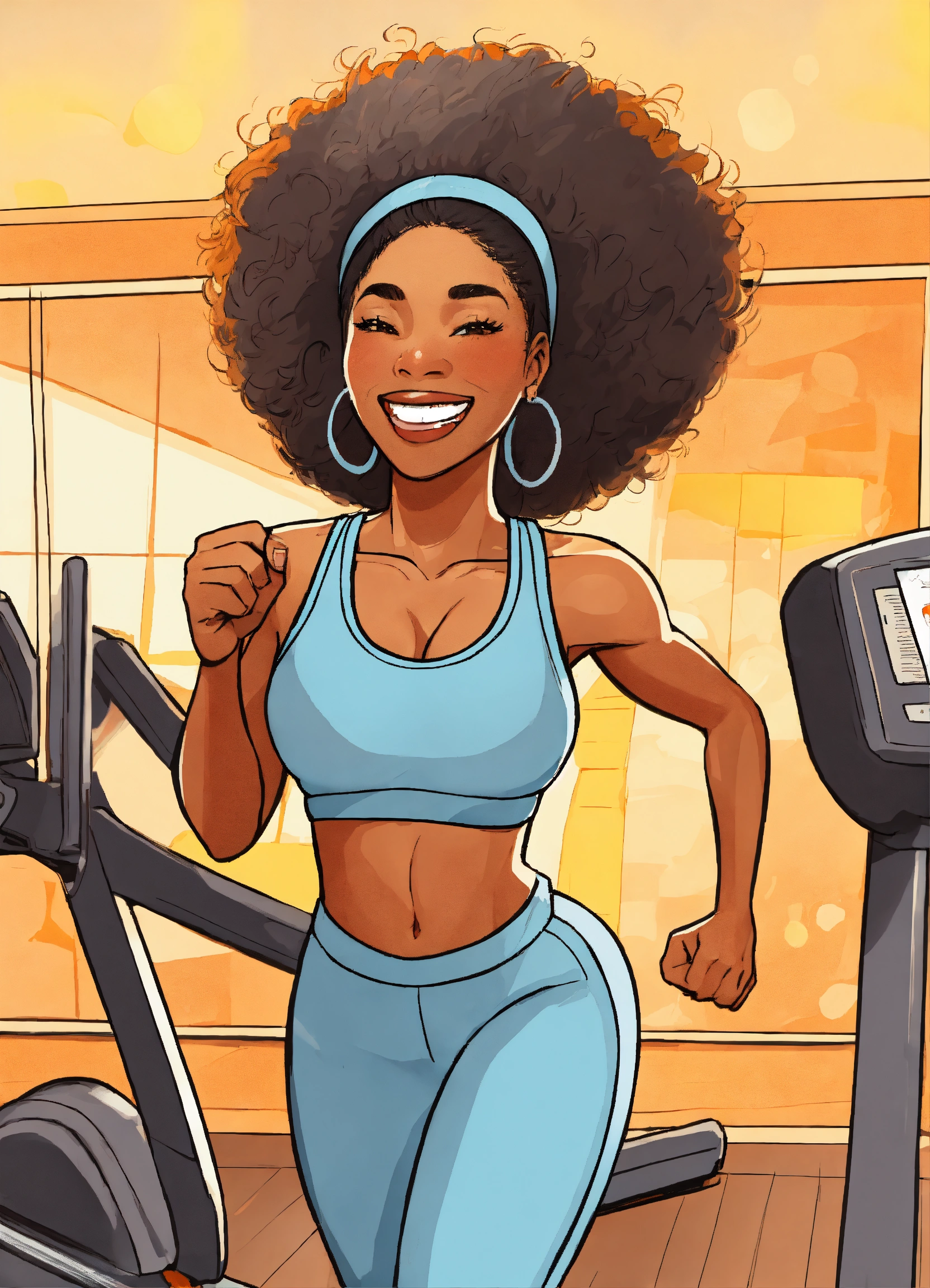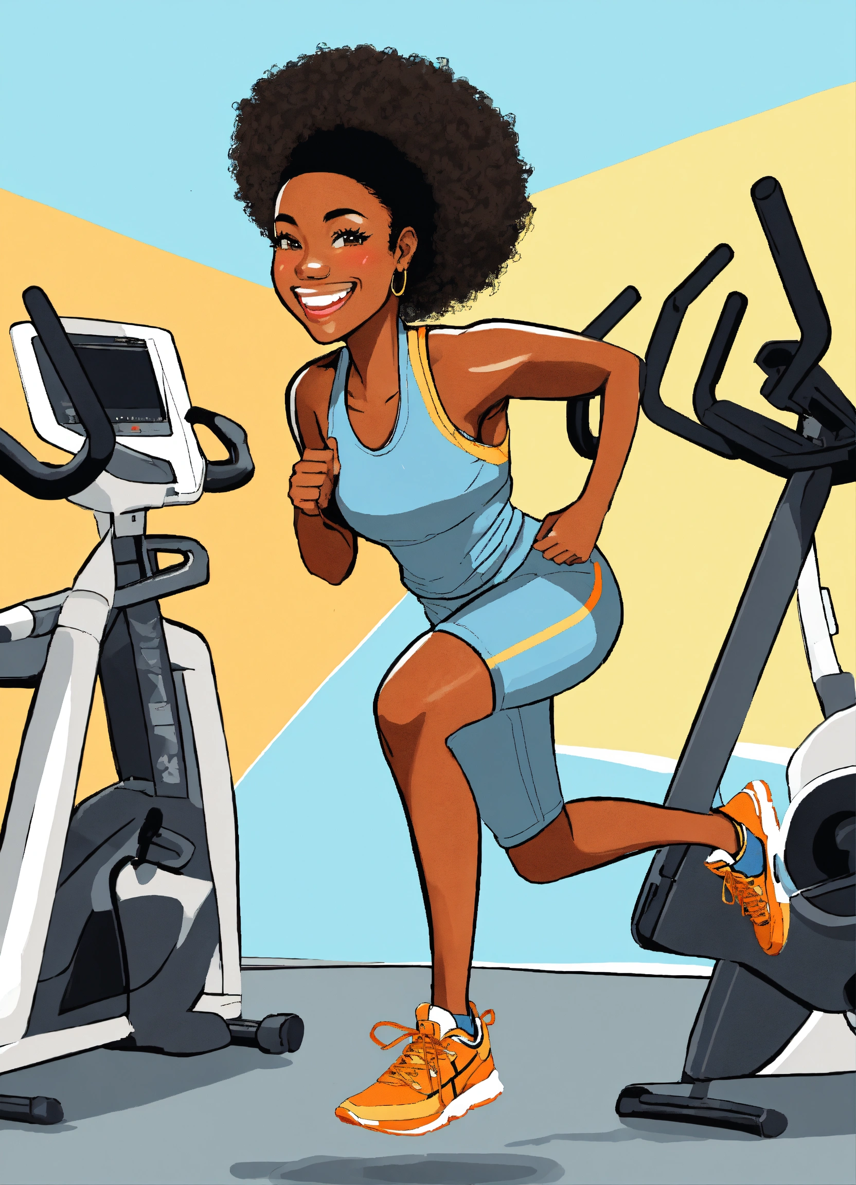 Illustrated cartoon cheerful african american woman with a big smile jogging suit and pastel blue yellow and orange black white exercising in an gym setting high detail illustration for book