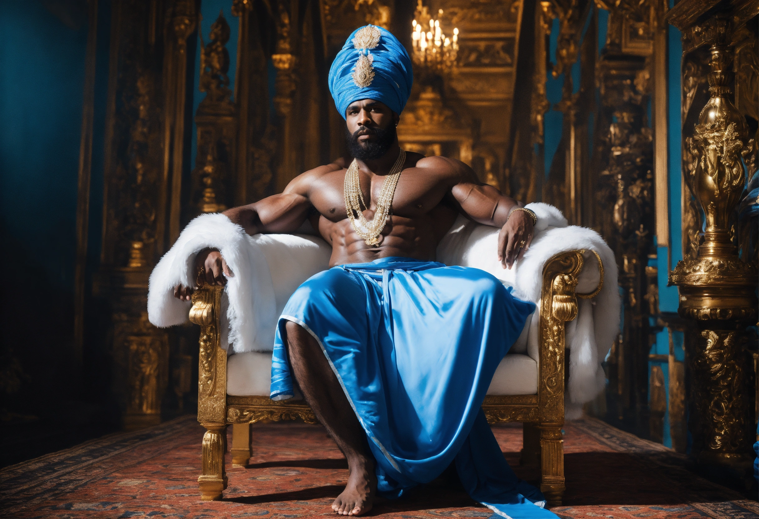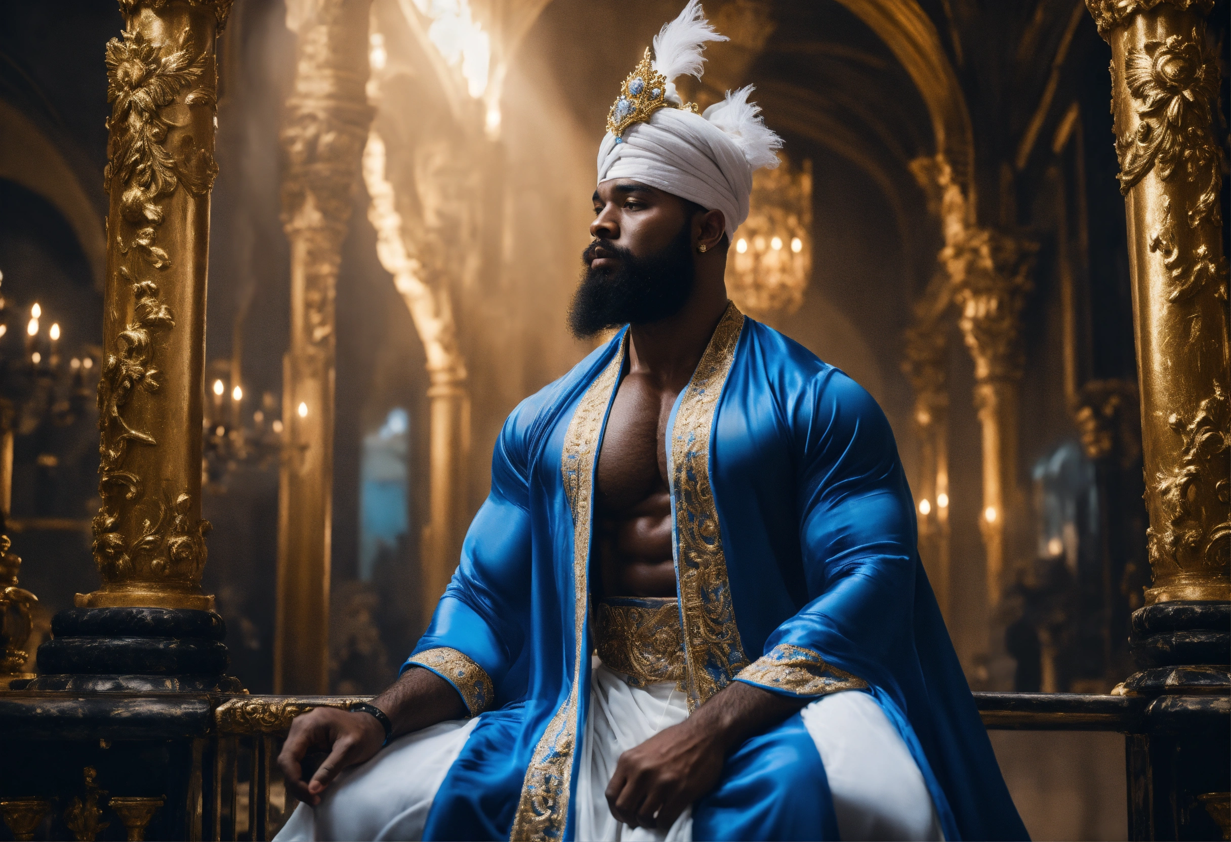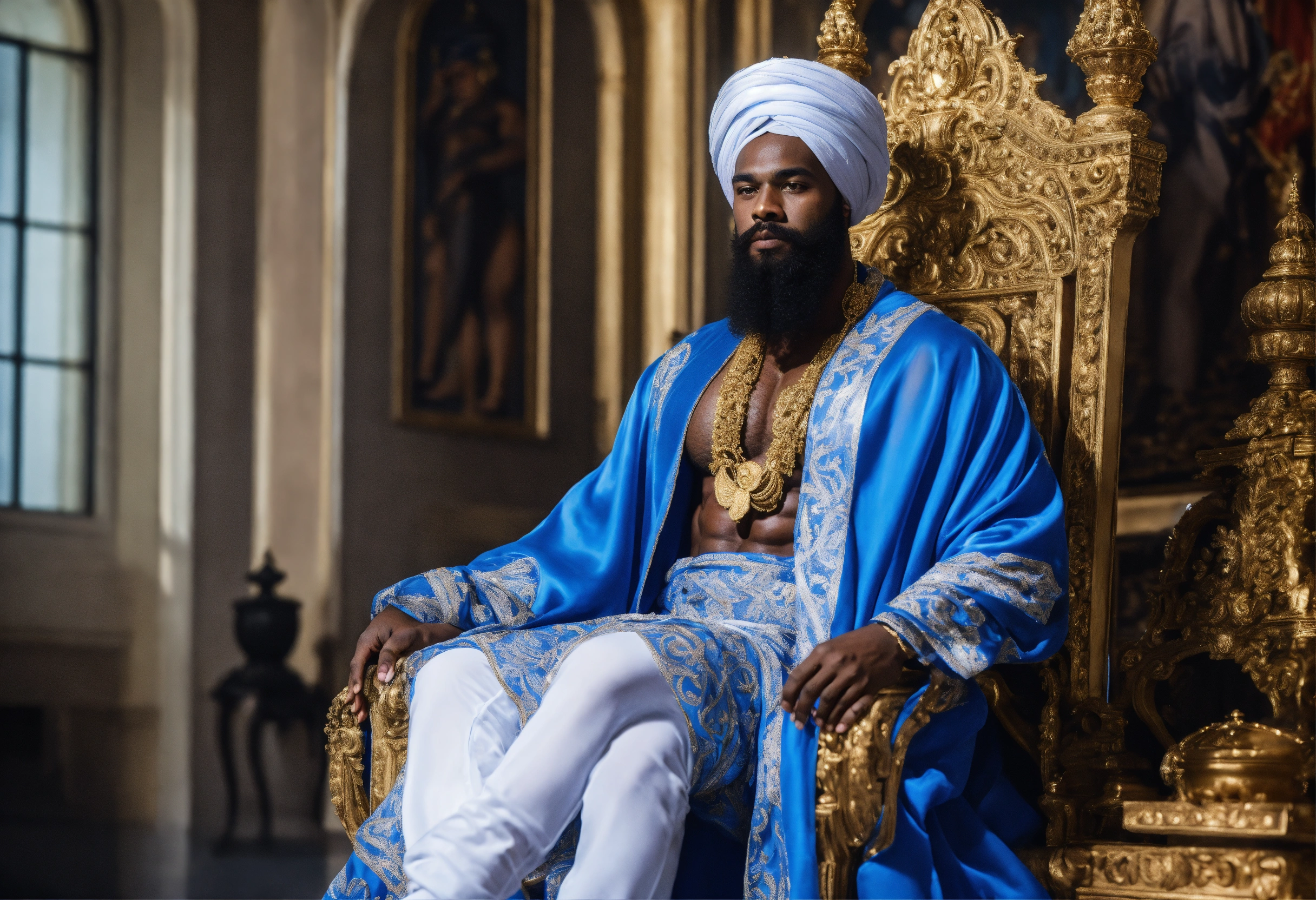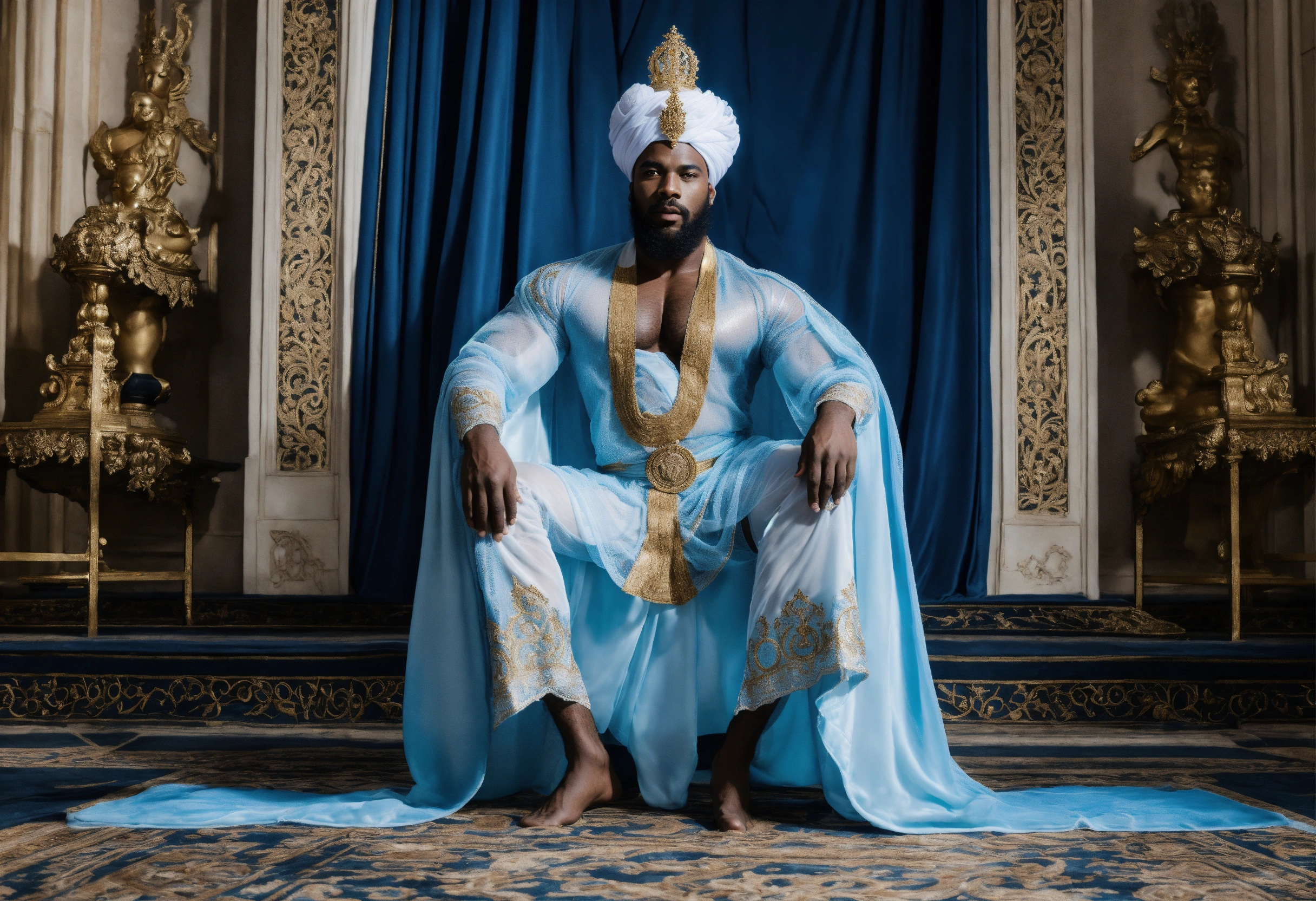A black god king in white turban, in beautiful sheer blue and white sheer robe, bodybuilder, beard, black magic, strong legs, palace