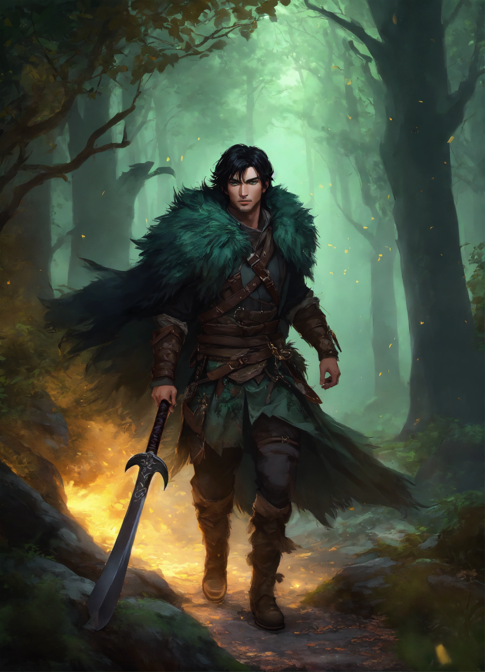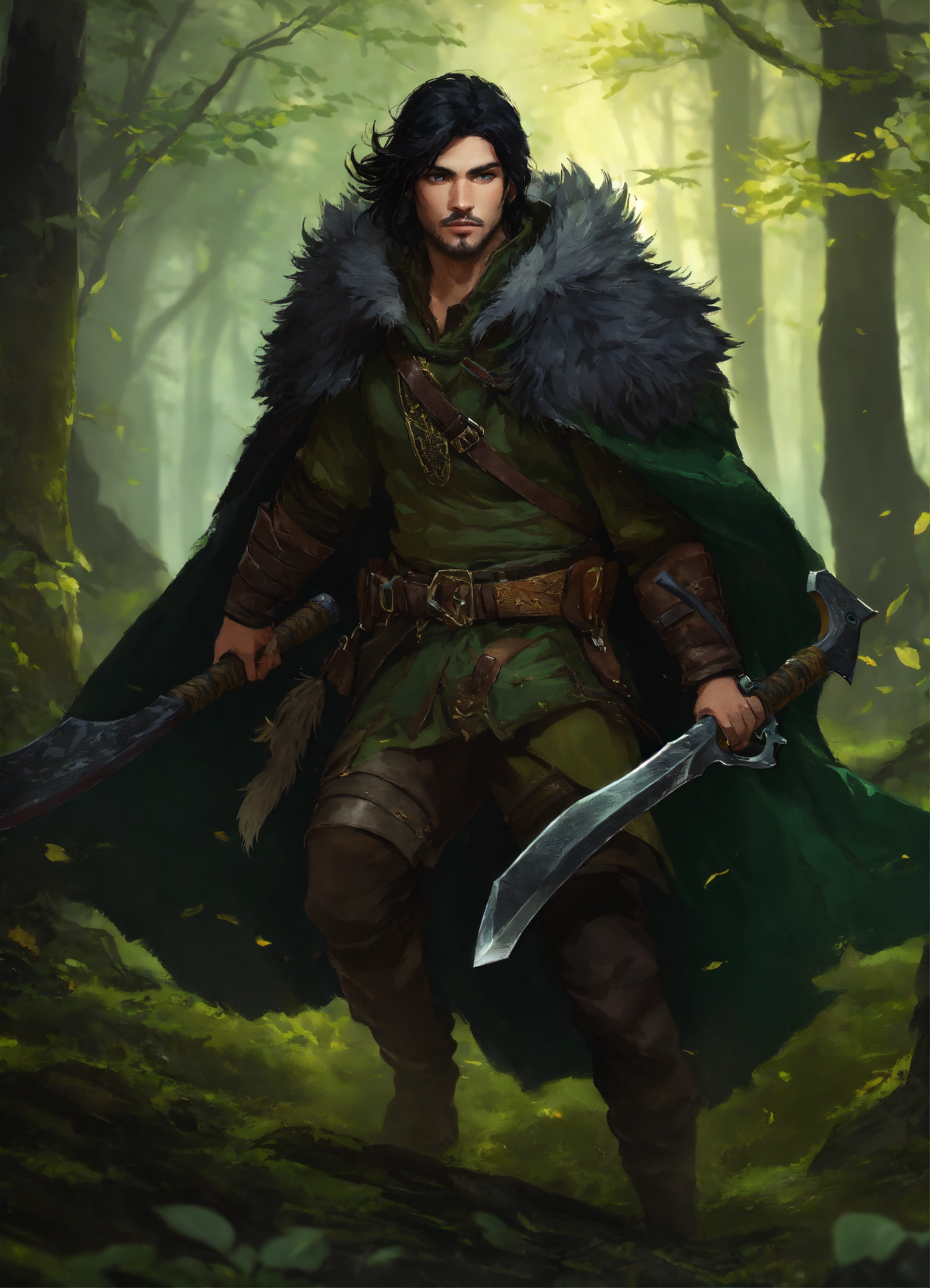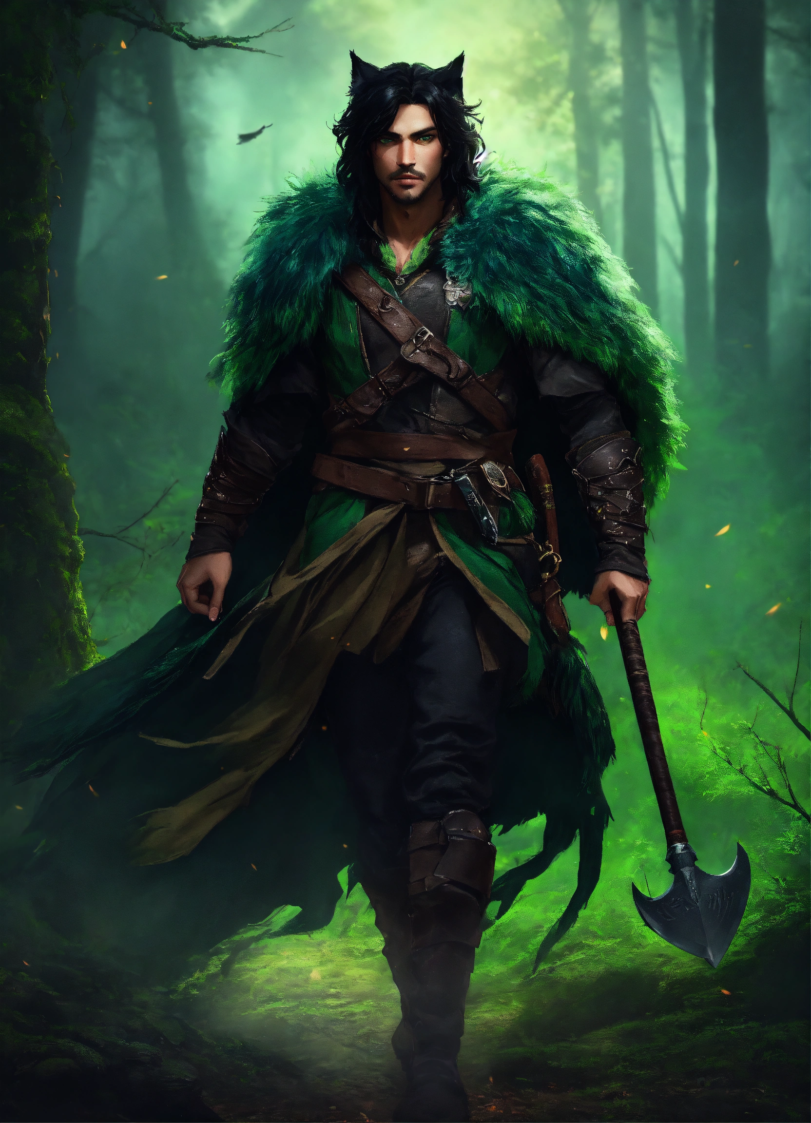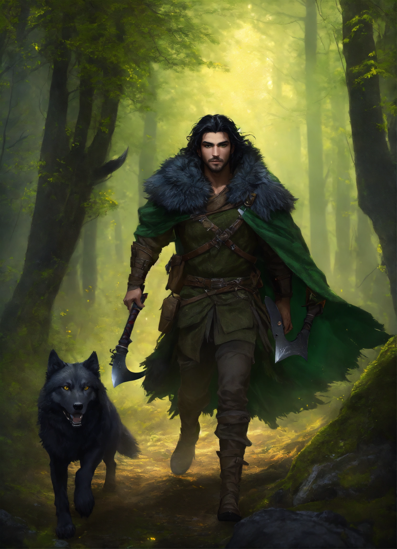 A male beserker warrior with black hair and green eyes, wielding 2 axes, a wolf fur cloak, run-down, in a dark forest, realistic with a black wolf companion