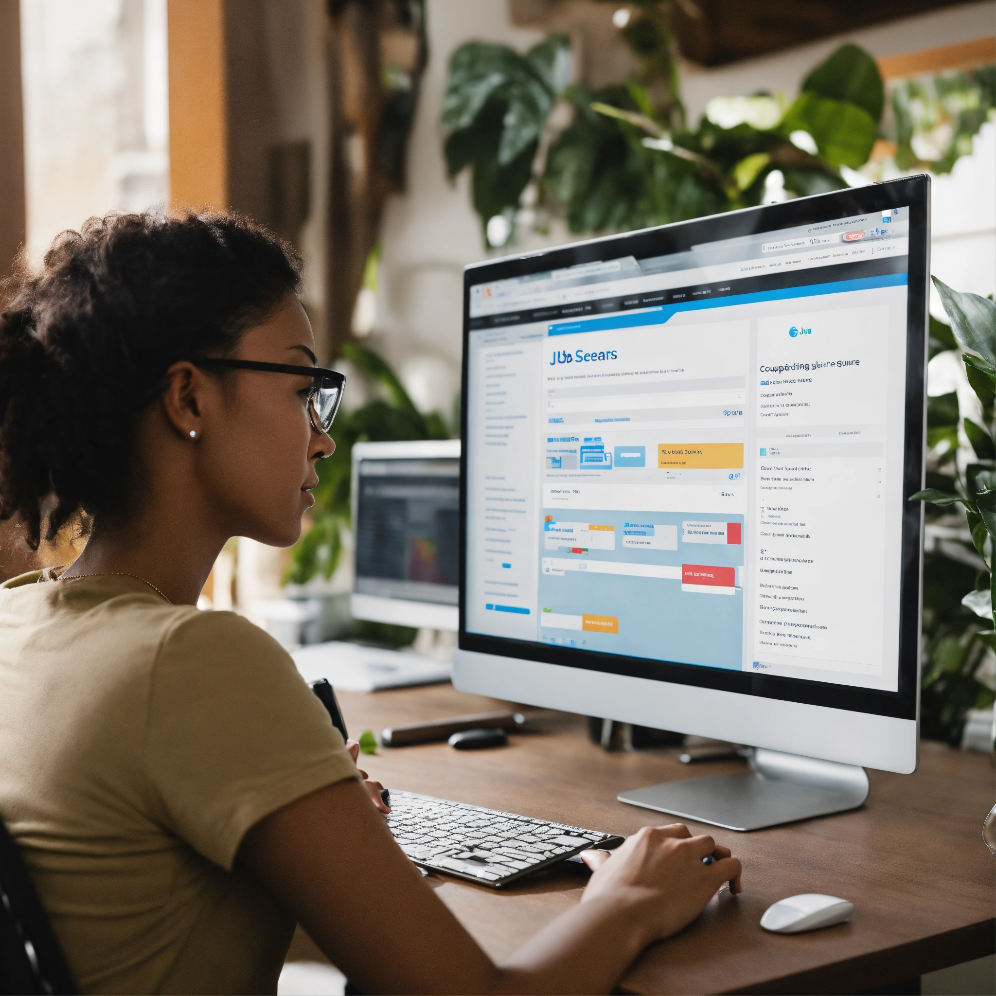 A photo of a person looking at a computer screen, the person is using a job search engine to find a job