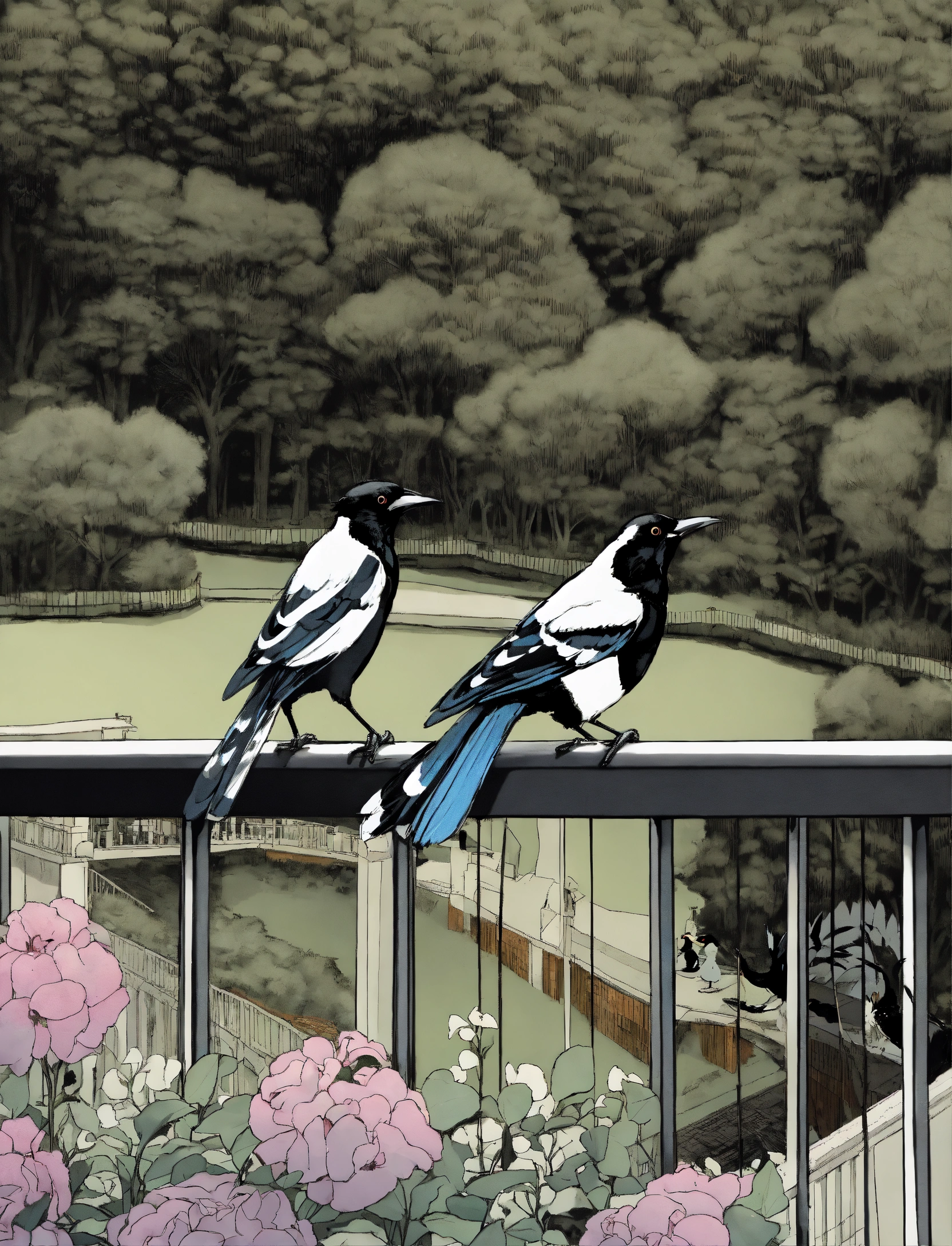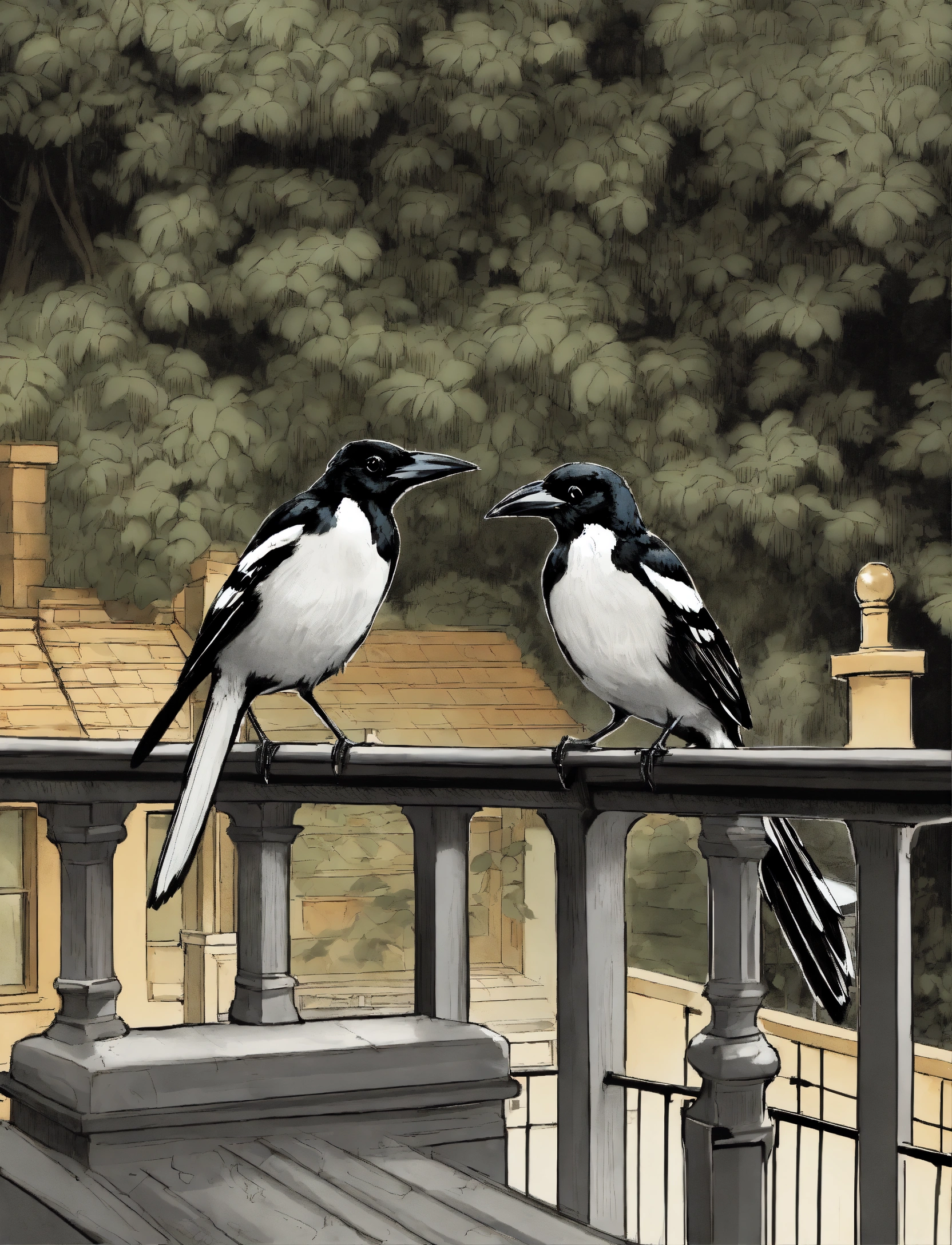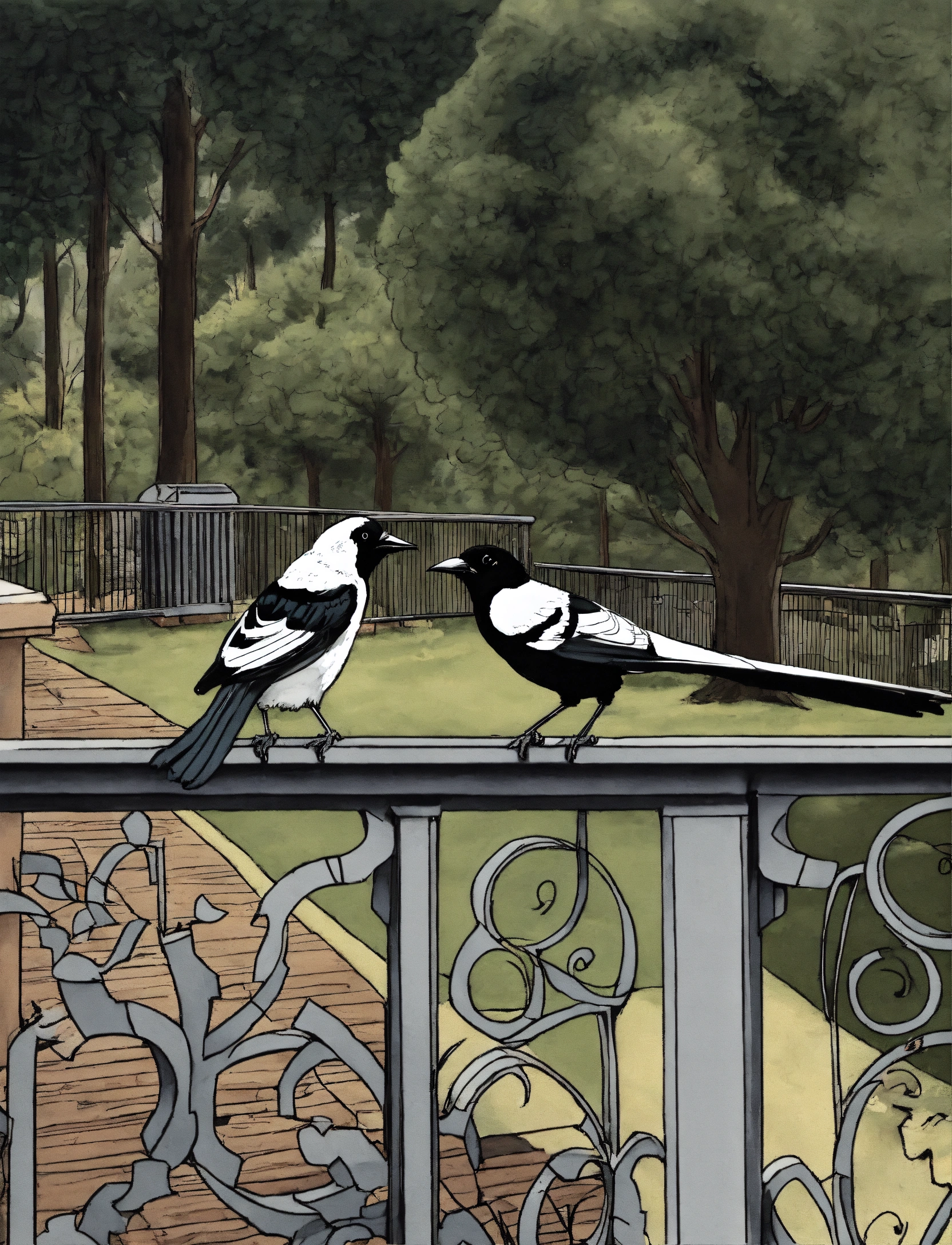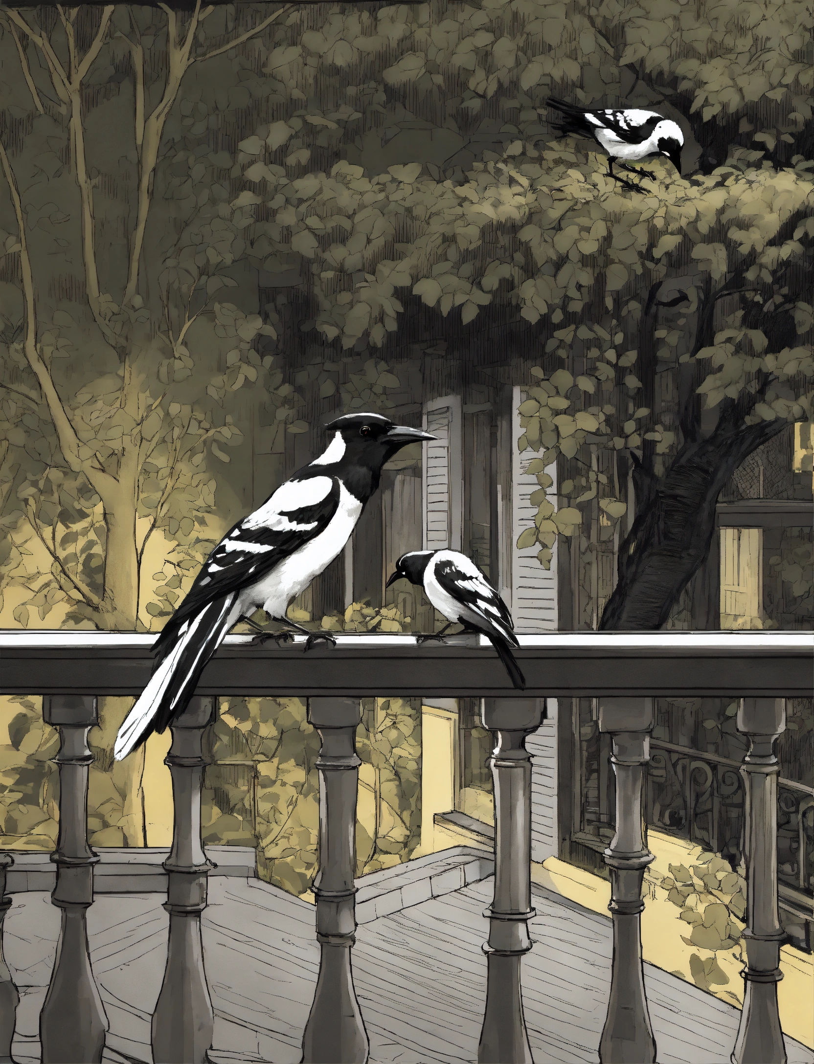2 magpies facing another magpie, standing on a balcony rail new yorker cartoon style black and white illustration
