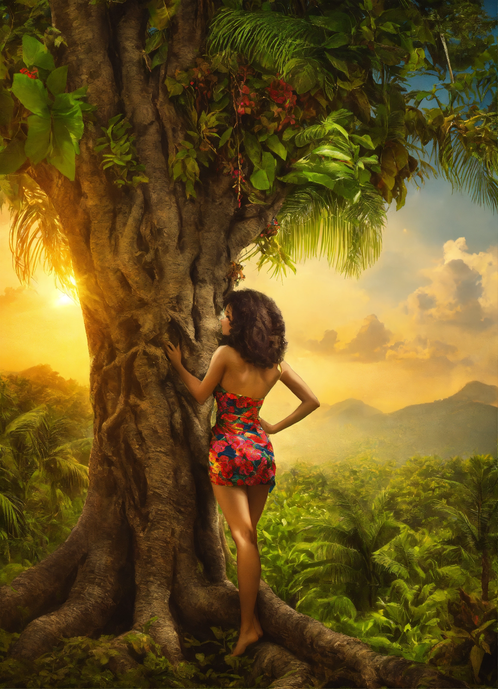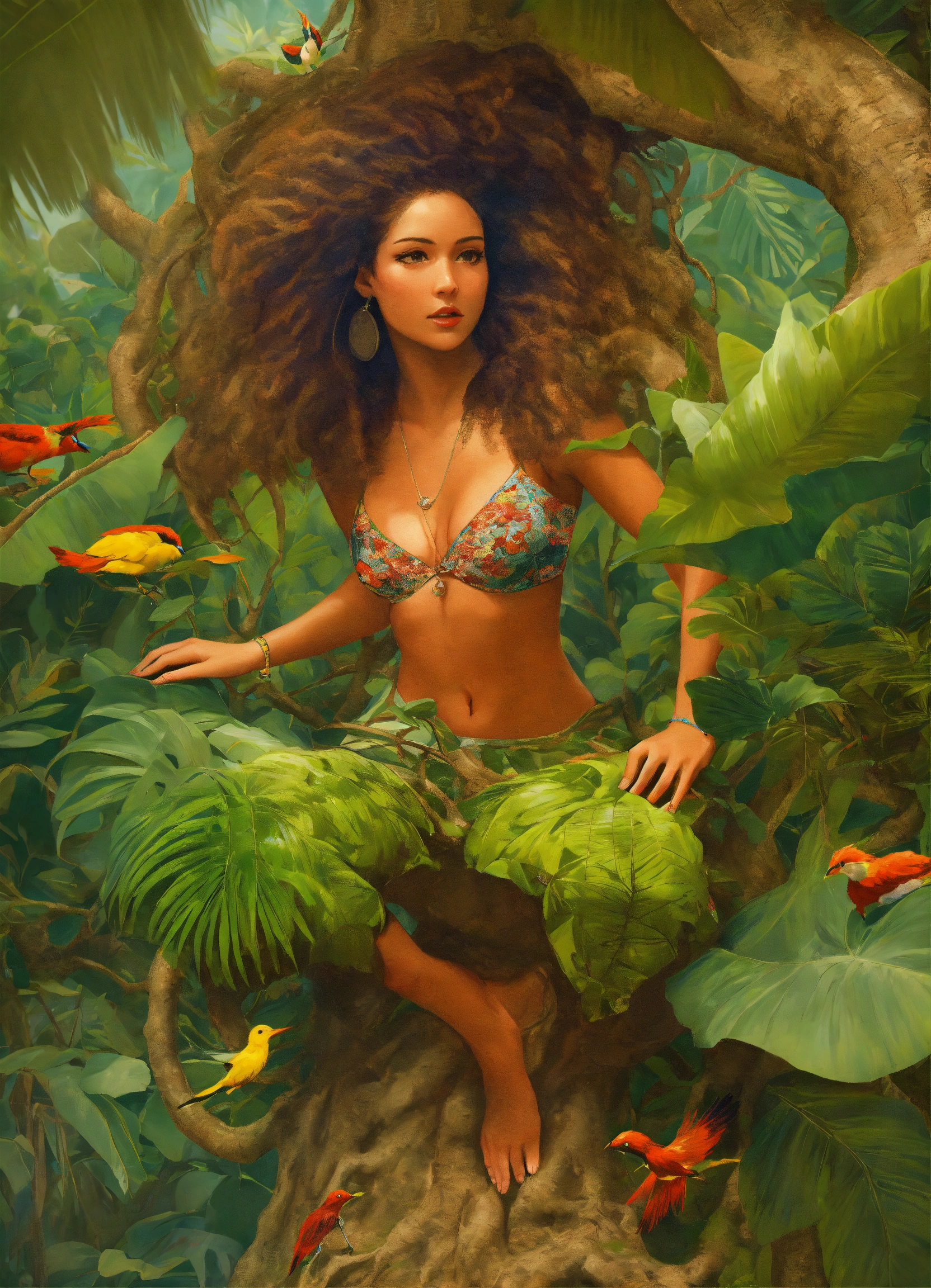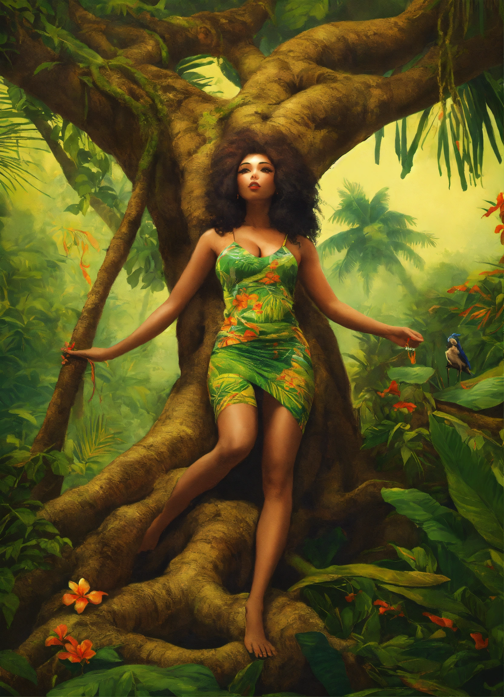 A woman whose legs turn into the trunk of a tropical tree, her hair is the bushy part of the tree and their are animals climbing all around her limbs