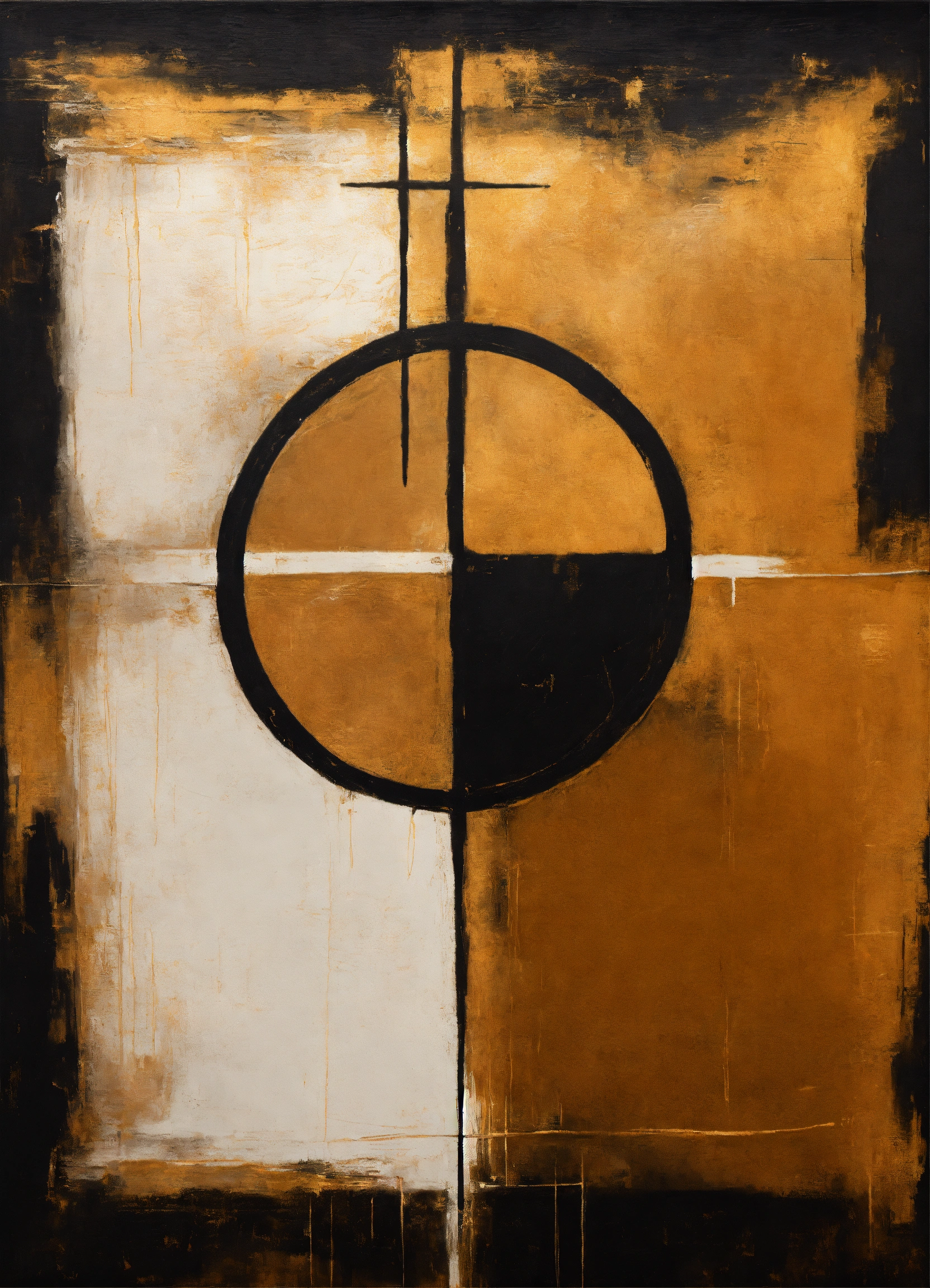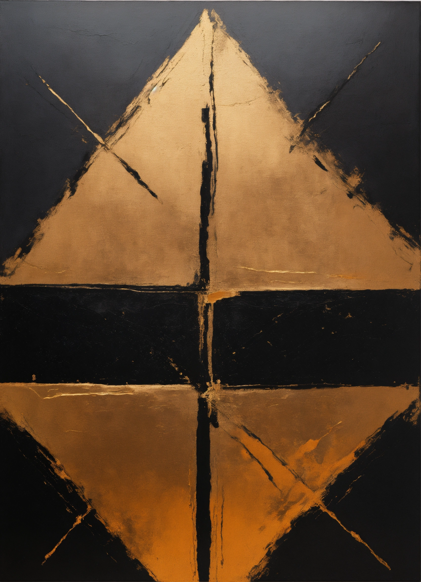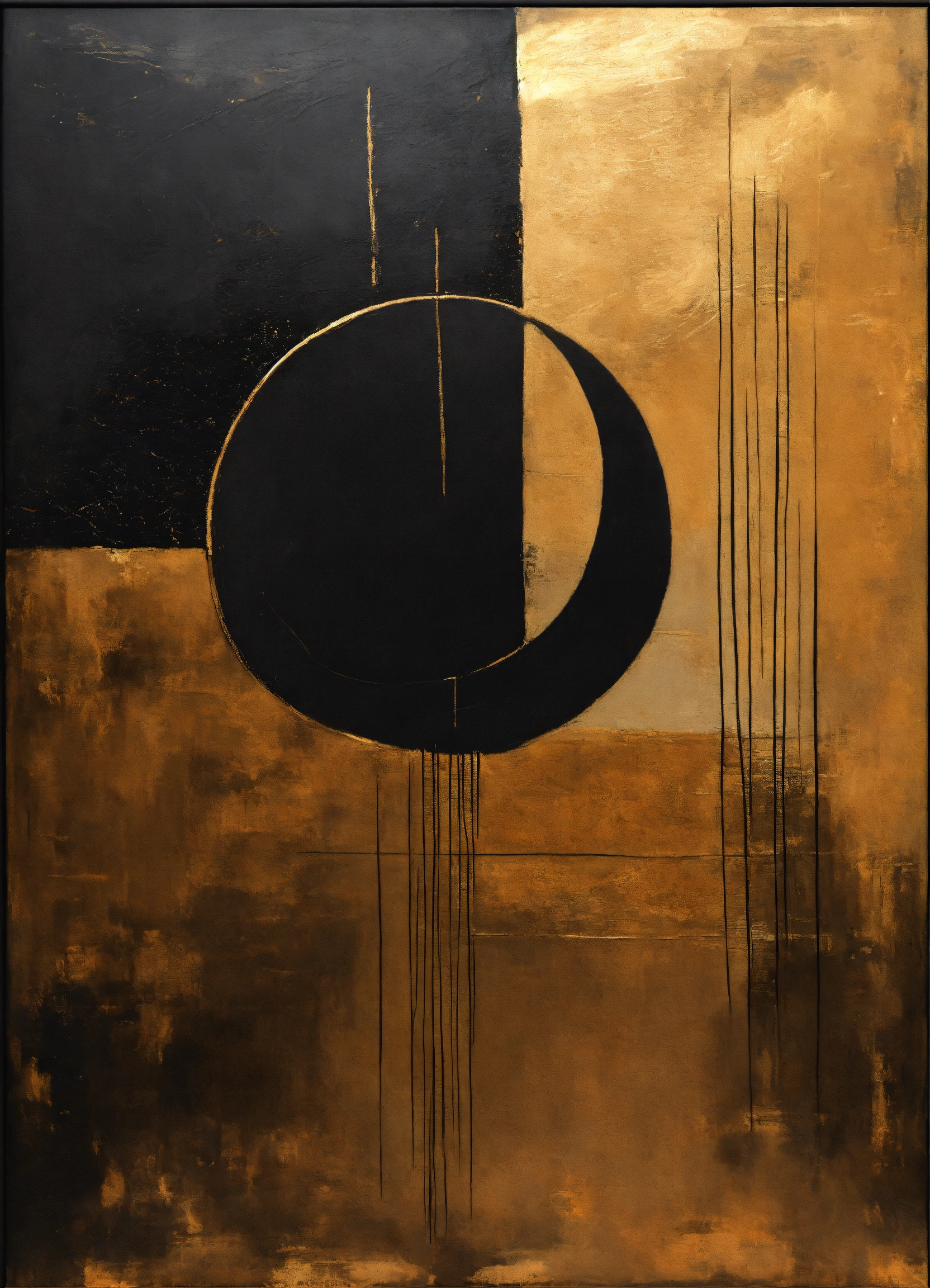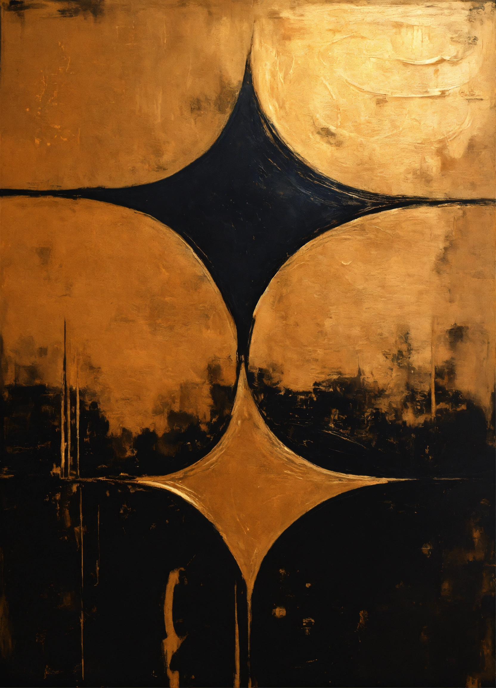 Minimalist, elegant, discret, abstract, enigmatic, sophisticated, modern painting with original twins symbol in black, gold and copper