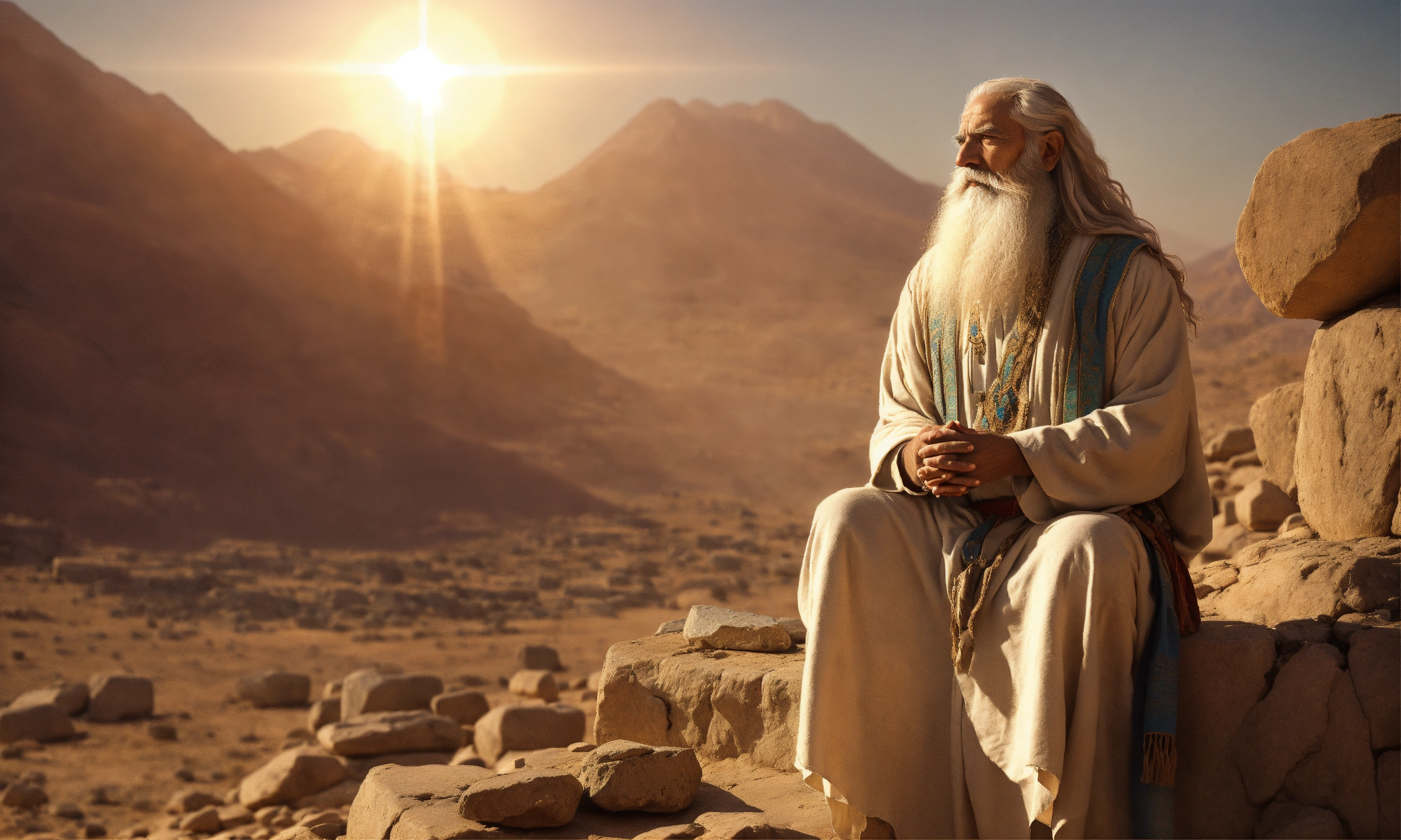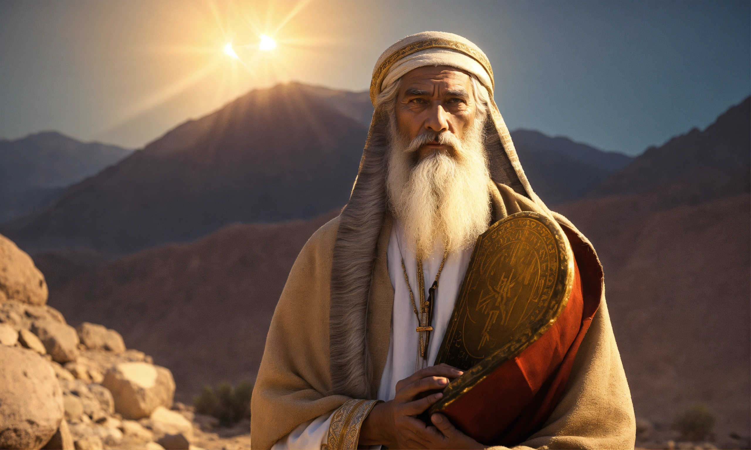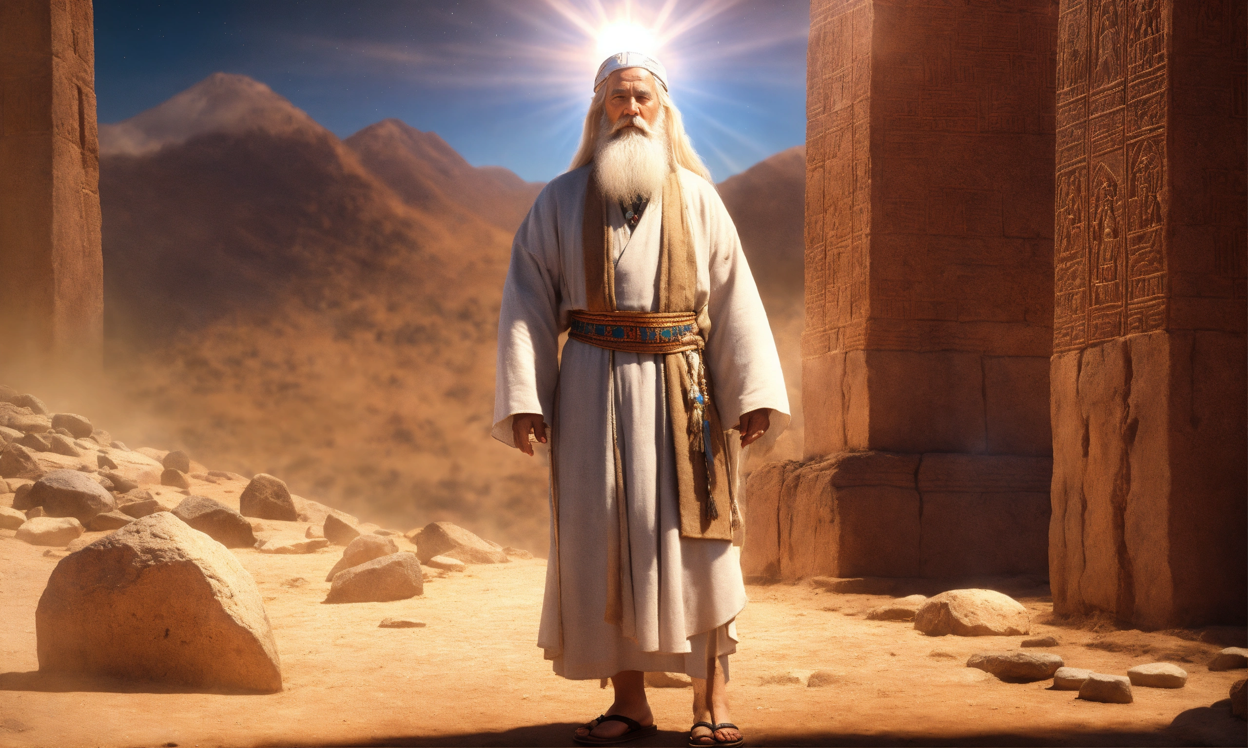 At the foot of mount sinai, hz. moses stands, with his long white hair and beard. he is in his religious clothes and experiencing his spiritual experience with an enlightened expression. he holds stone tablets in his hands. his eyes are turned towards the light above. 8k