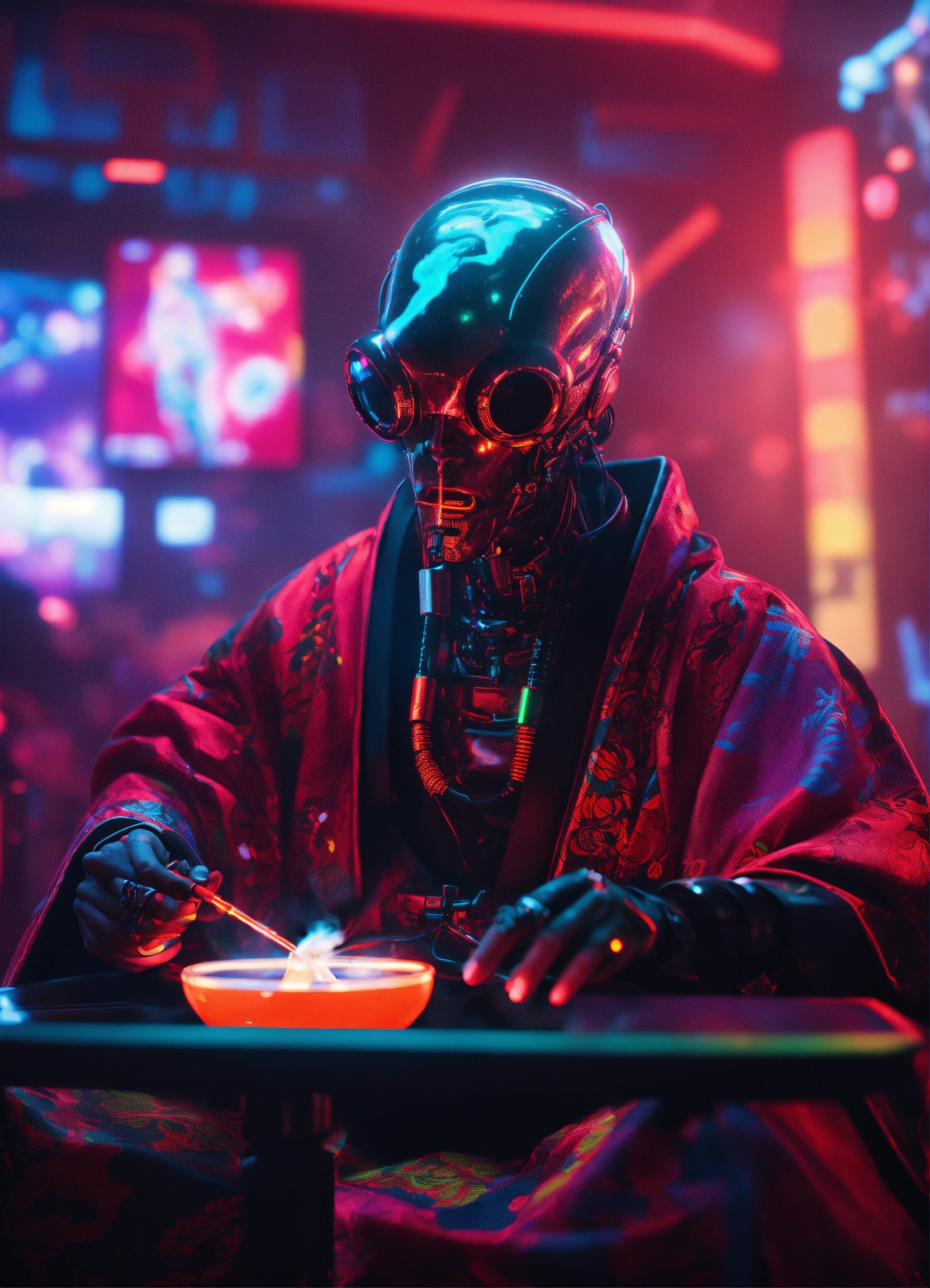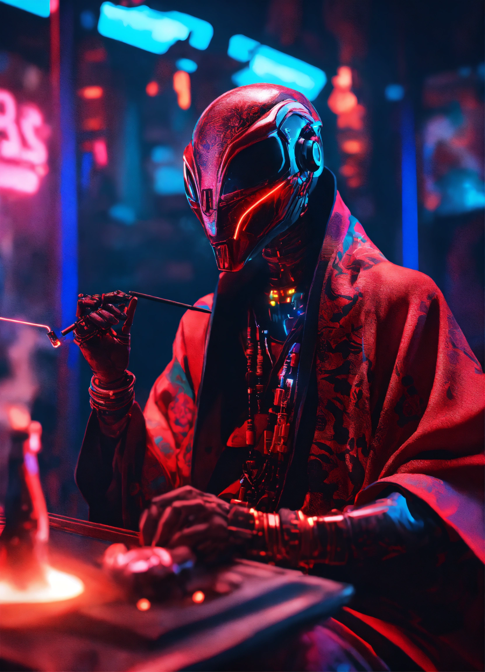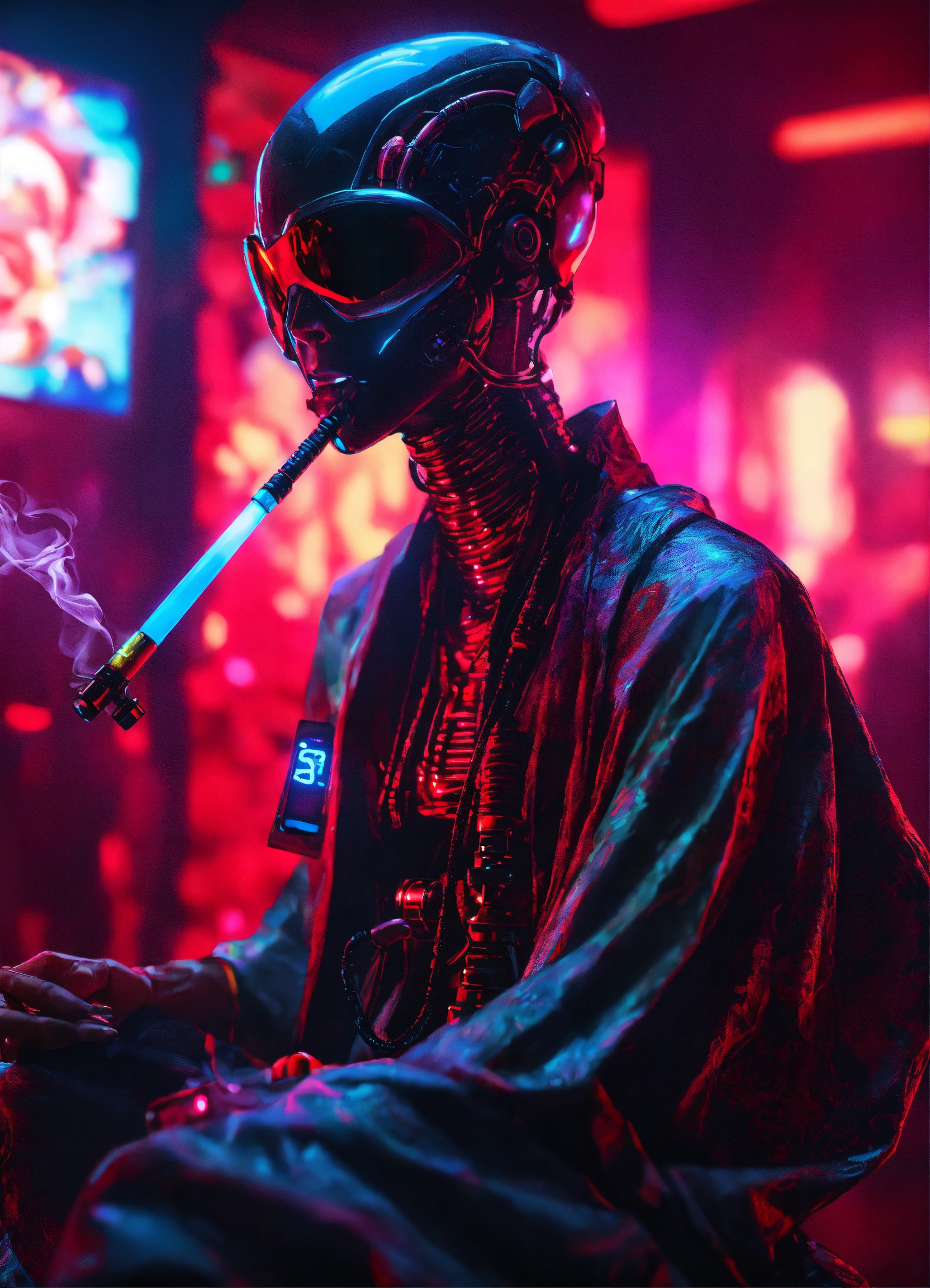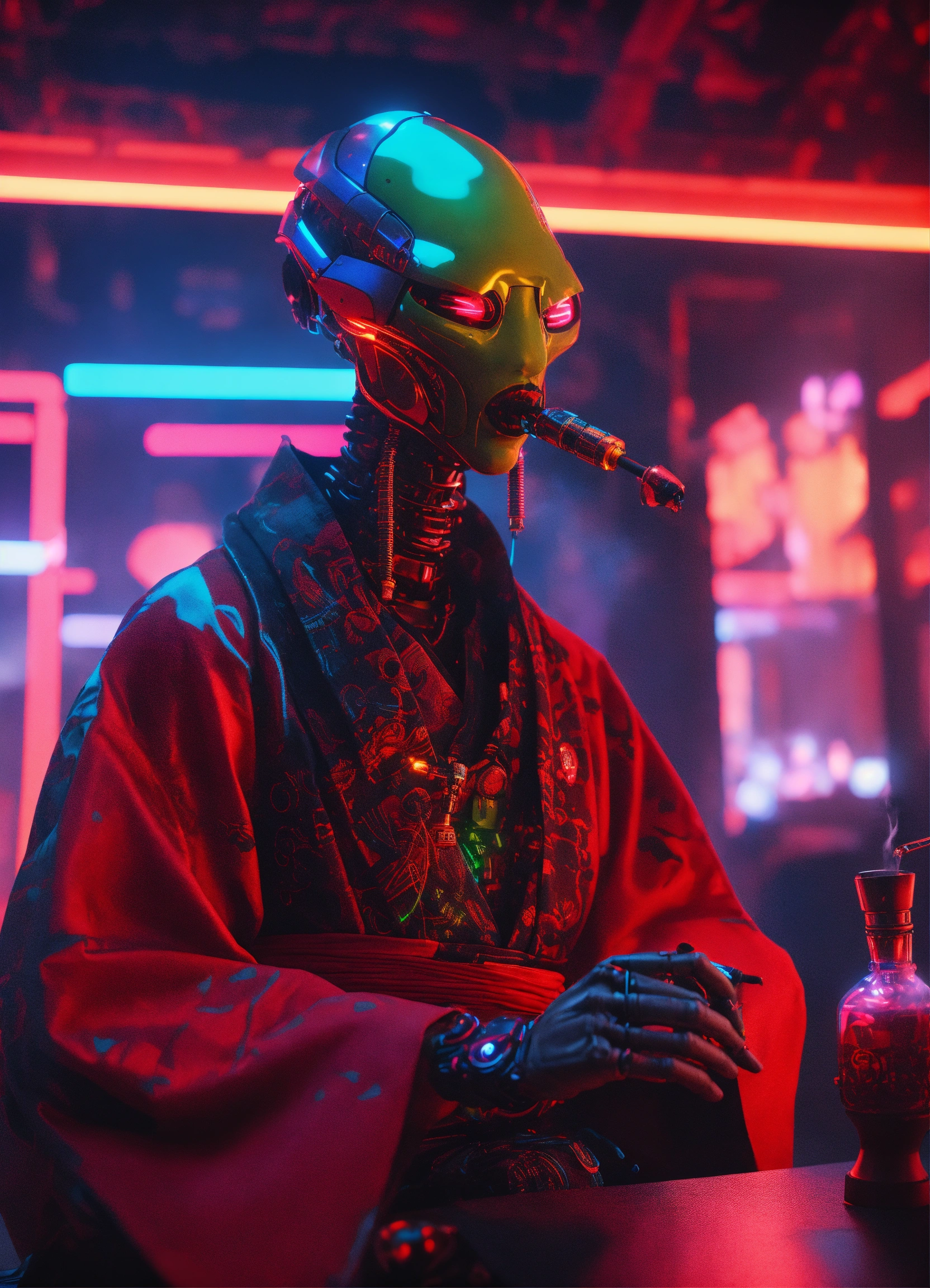 Dark aesthetic, a realistic alien cyborg with electronic screen in the face smoking a shisha, wearing a colorful kimono, in a cybernetic nightclub, neon texts 8k, unreal engine render, black and red light, smoke