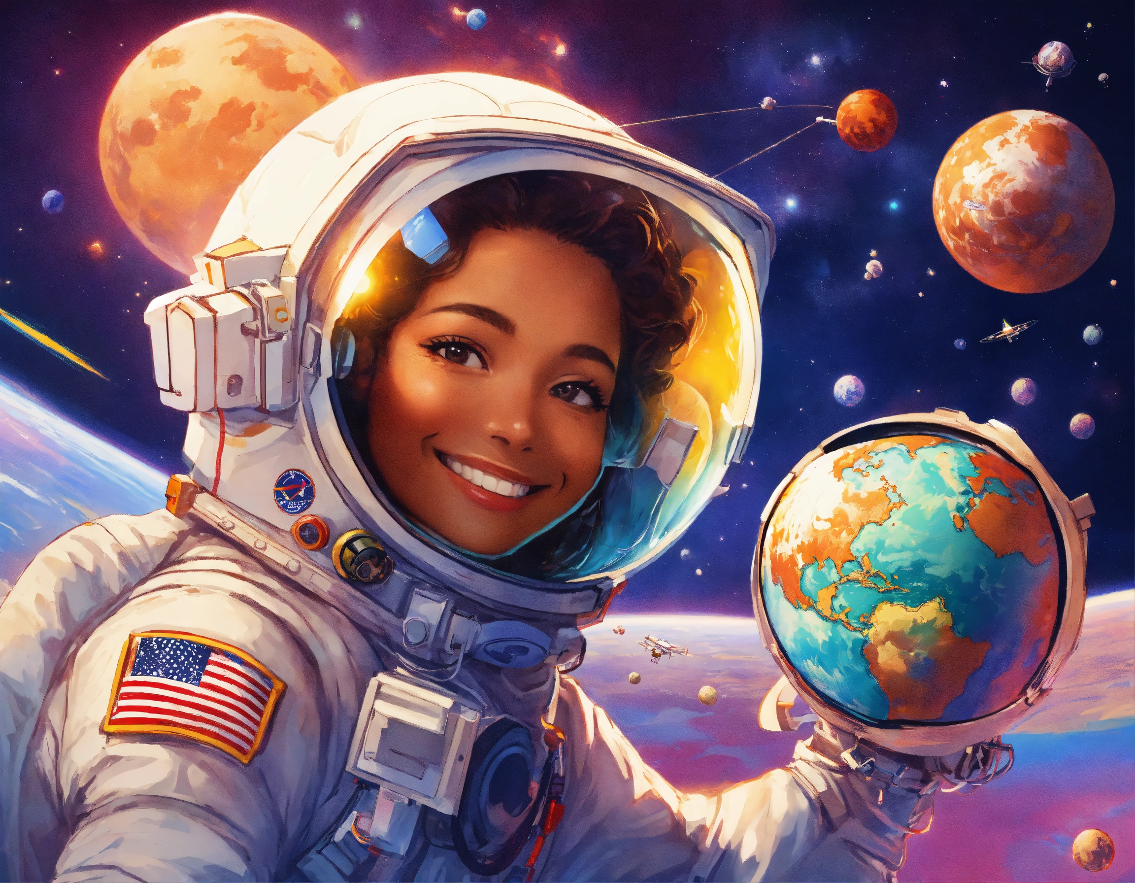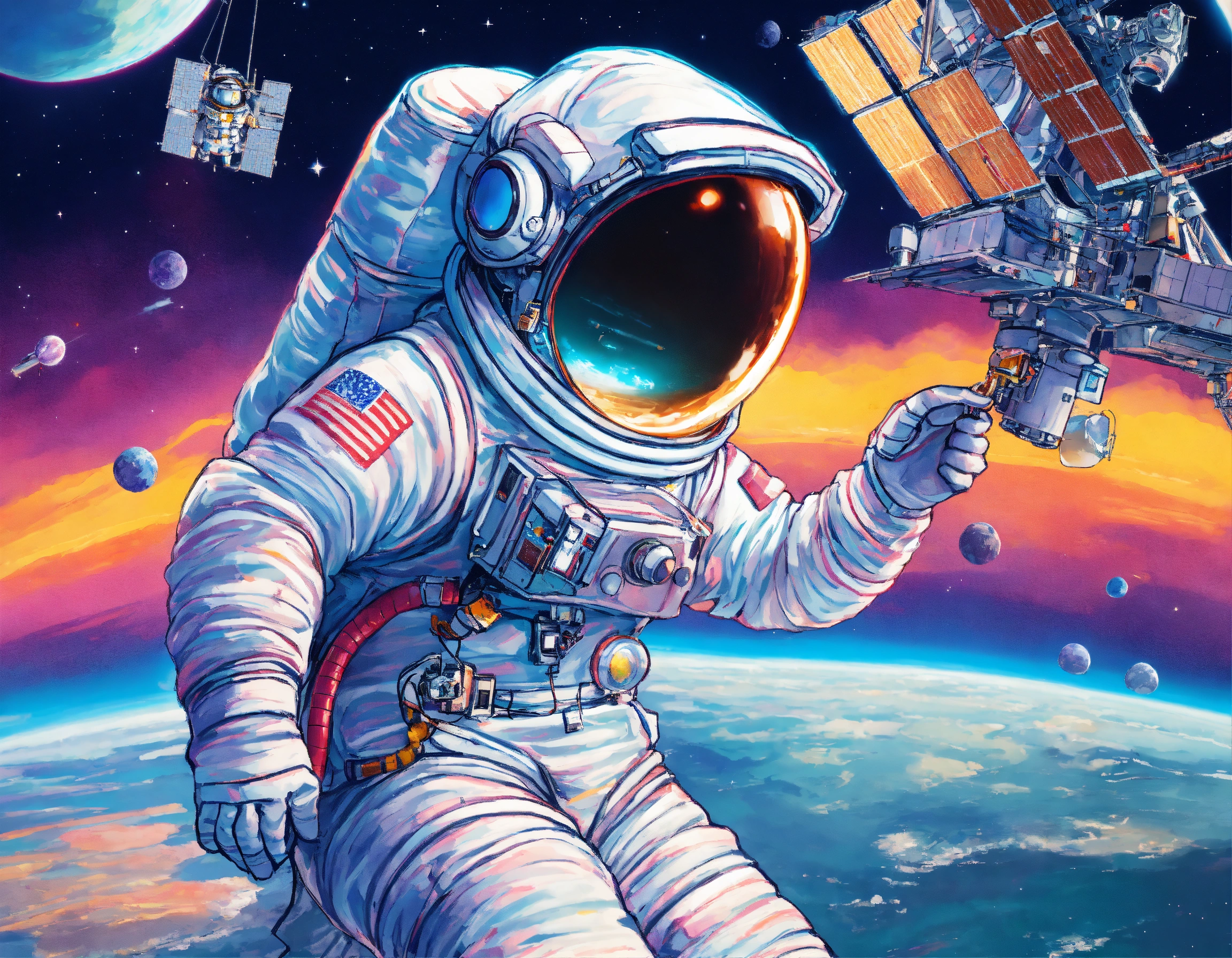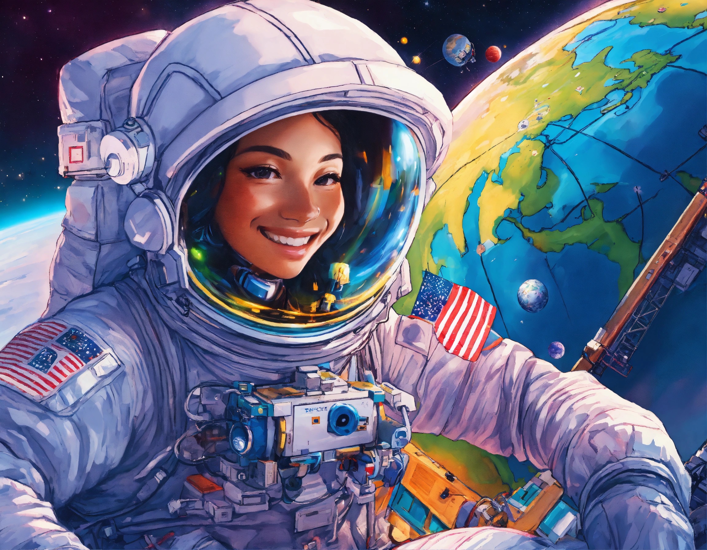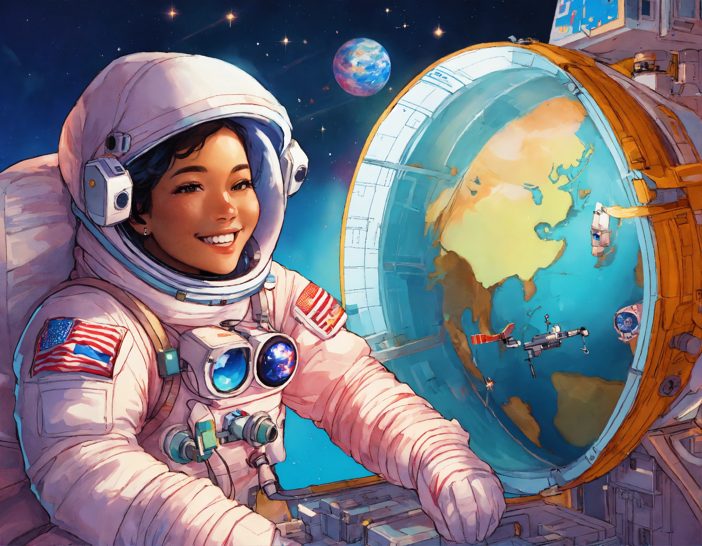 An astronaut repairing a space satellite, smiling, indonesian face, background behind the am-2 express satellite, framing, dramatic light, storybook illustration, 8k, by lisa frank