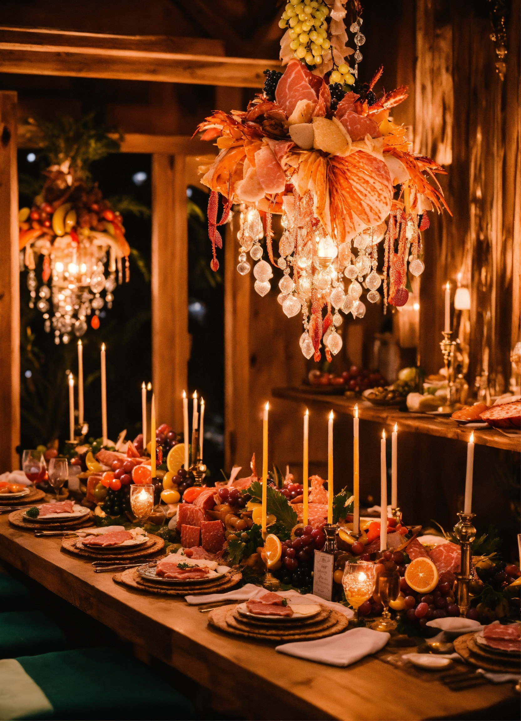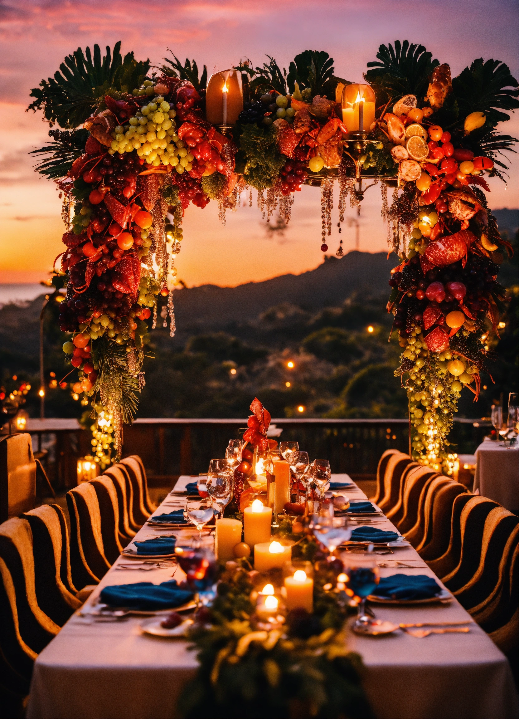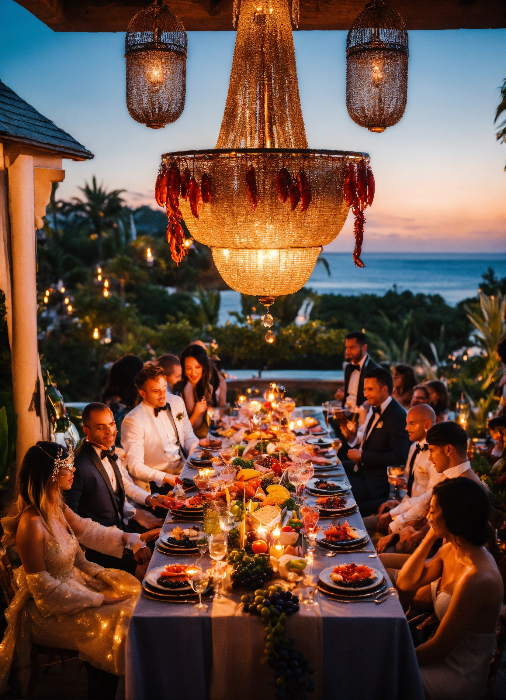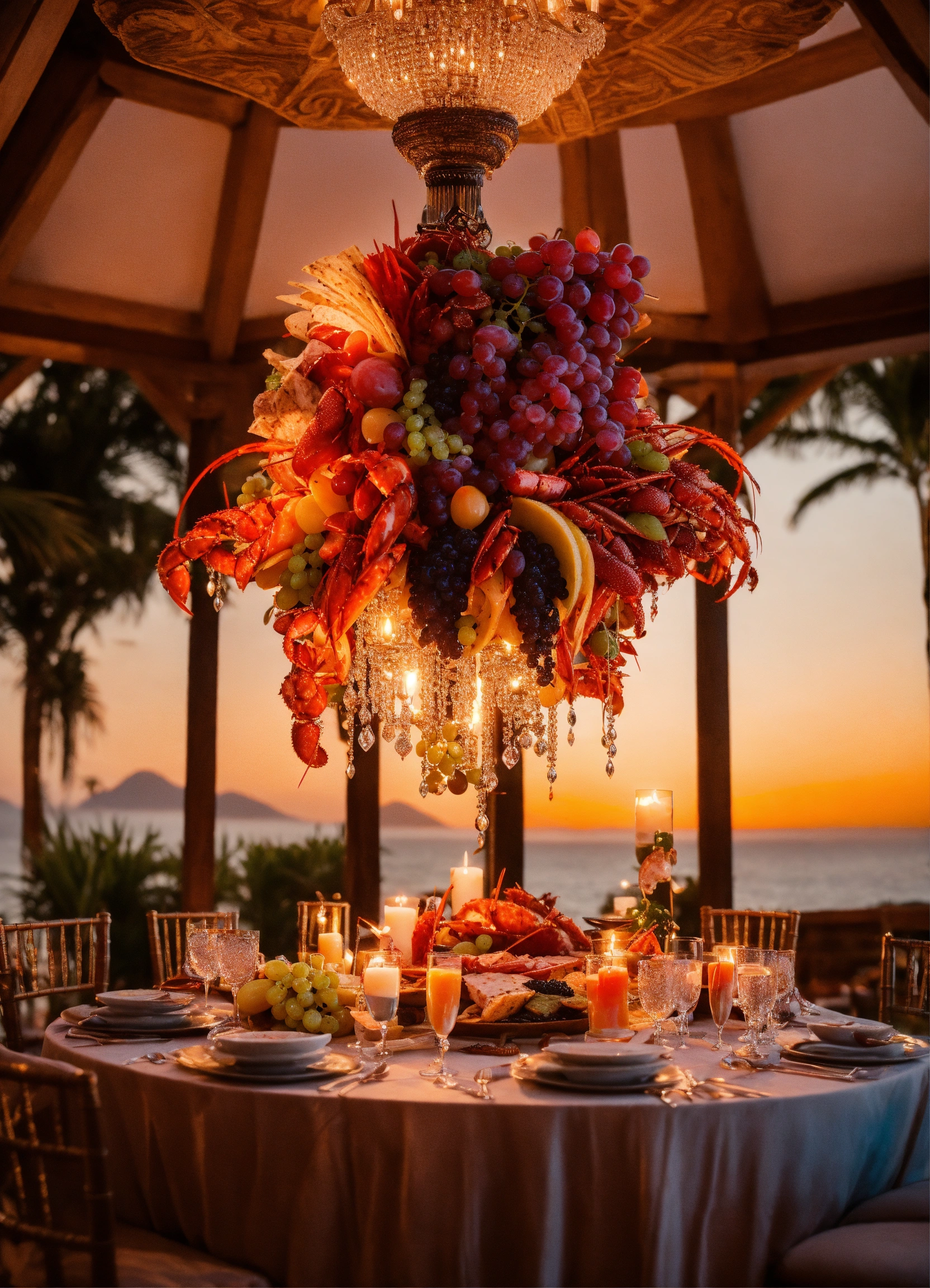 Sunset, magical aura, tropical island with charcuterie board, sizzling fajitas, grapes, lobster, caviar, exotic fruits, chandelier, masquerade ball, and an ethereal mood.