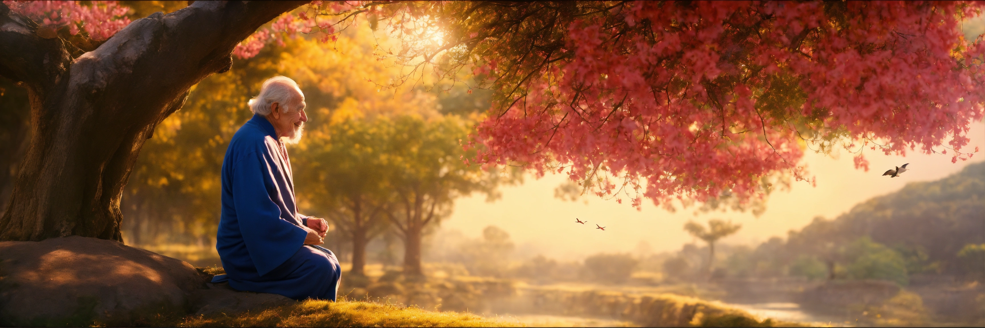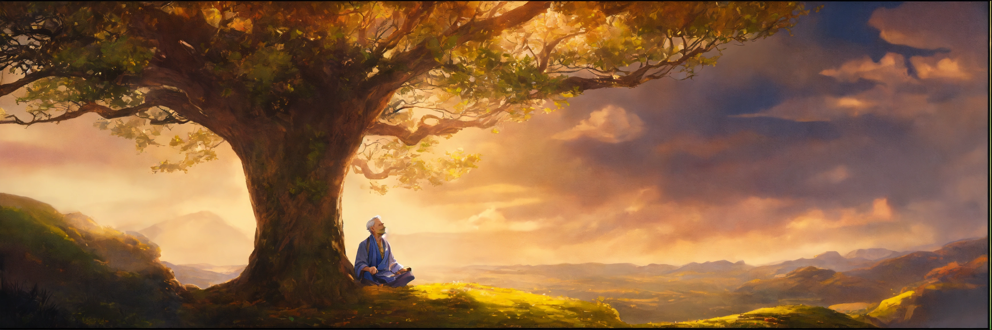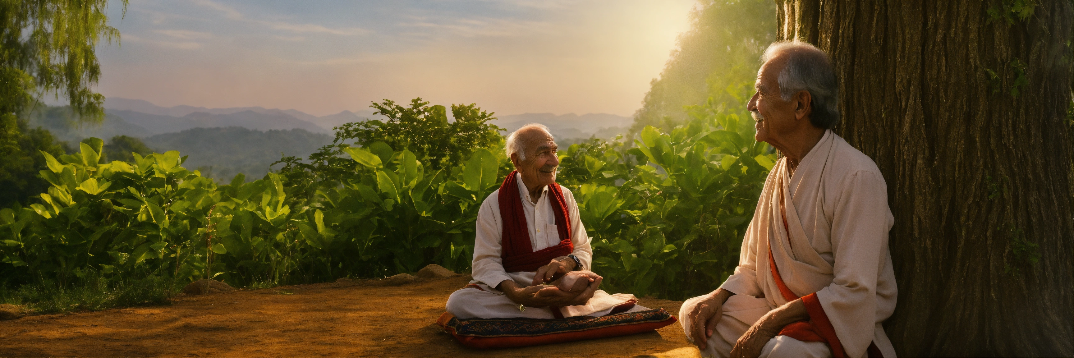 Picture the elderly man beneath the tree, his face adorned with a gentle and serene smile, exuding an aura of inner tranquility. feel the curiosity welling up within ananda as he draws nearer to the man. imagine ananda politely addressing the man, saying, "excuse me, sir." now, see the elderly man responding with a warm chuckle, his hand gesturing for ananda to join him by his side. hear the man's words as he says, "ah, young one. i'm glad you've asked., detailed, 4k, focused, extreme details, super resolution, cinematic, masterpiece
