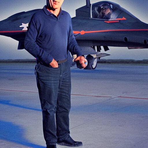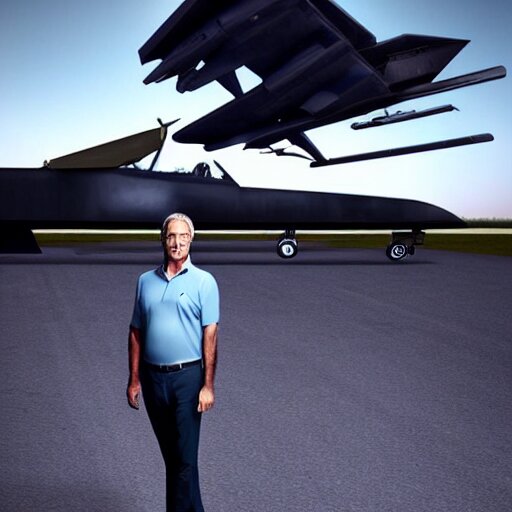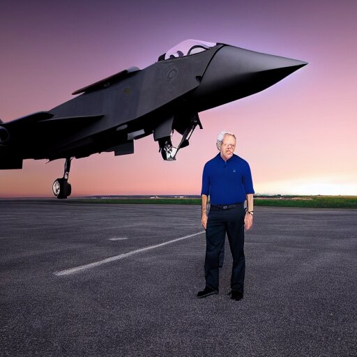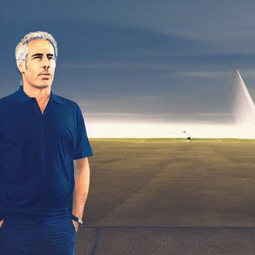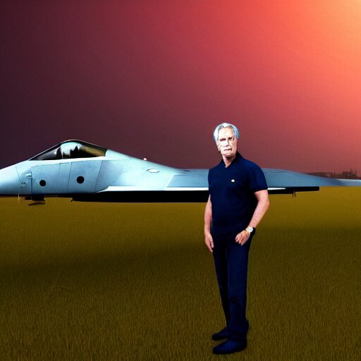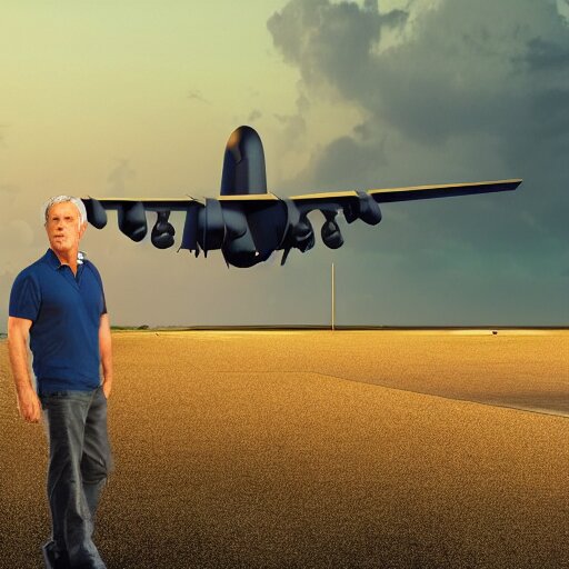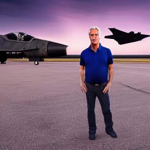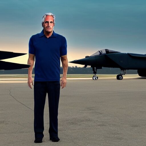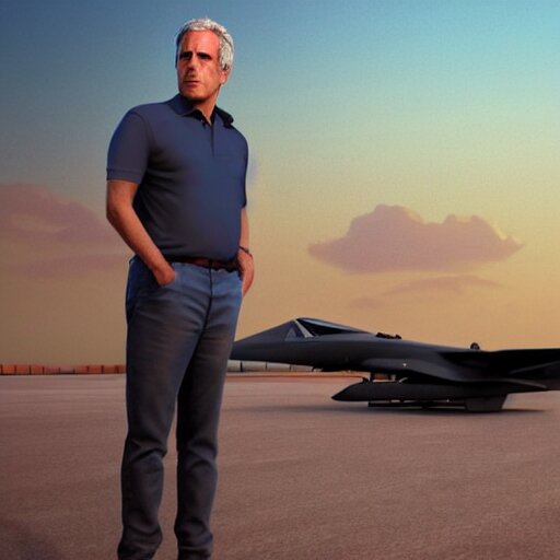 Aesthetic illustration of jeffrey epstein, wearing a dark blue polo shirt, standing near predator unmanned combat aircraft on an empty runway at dusk, cinematic lighting, high detail, volumetric lights, pinterest wallpaper, trending on artstation