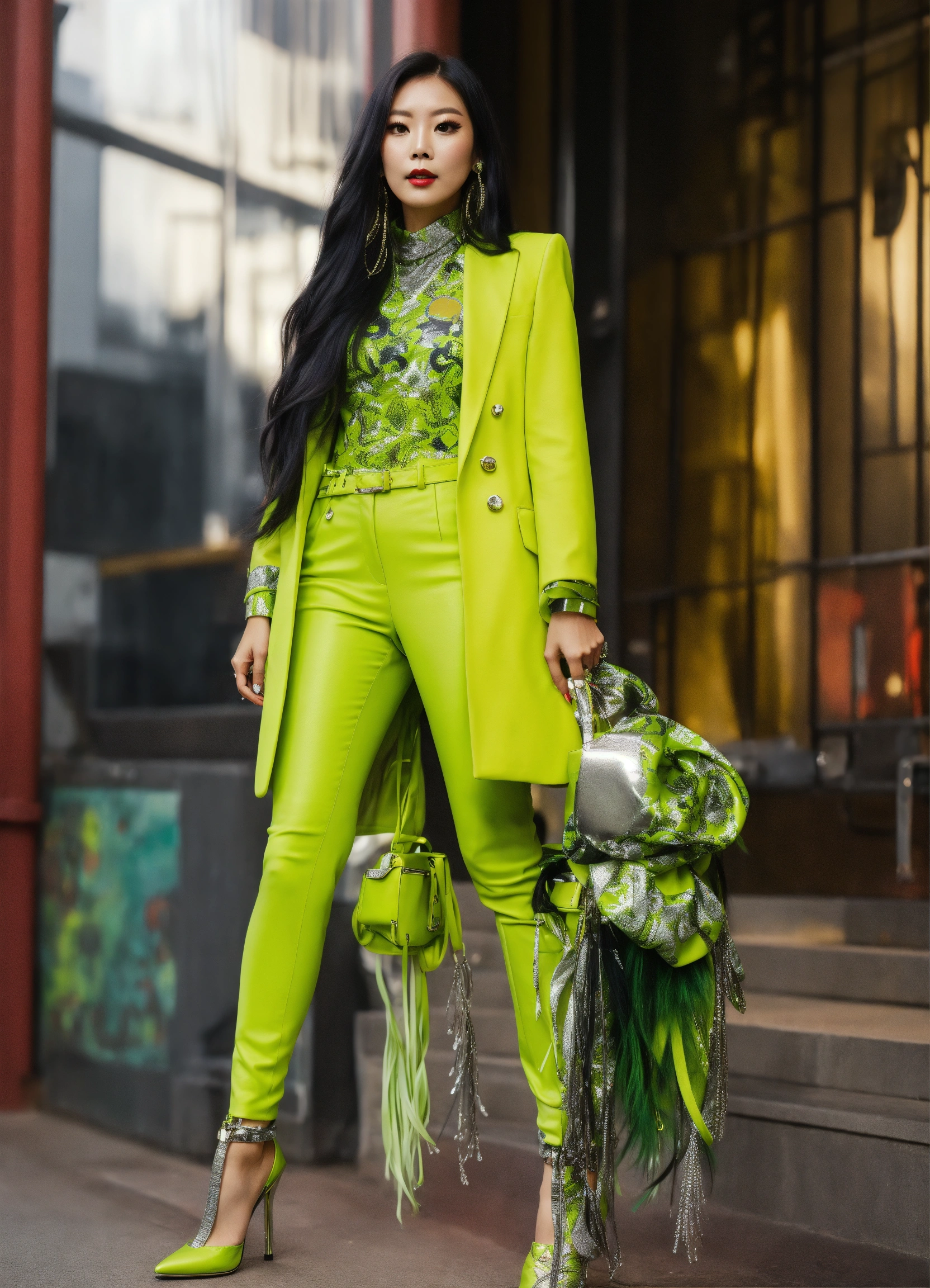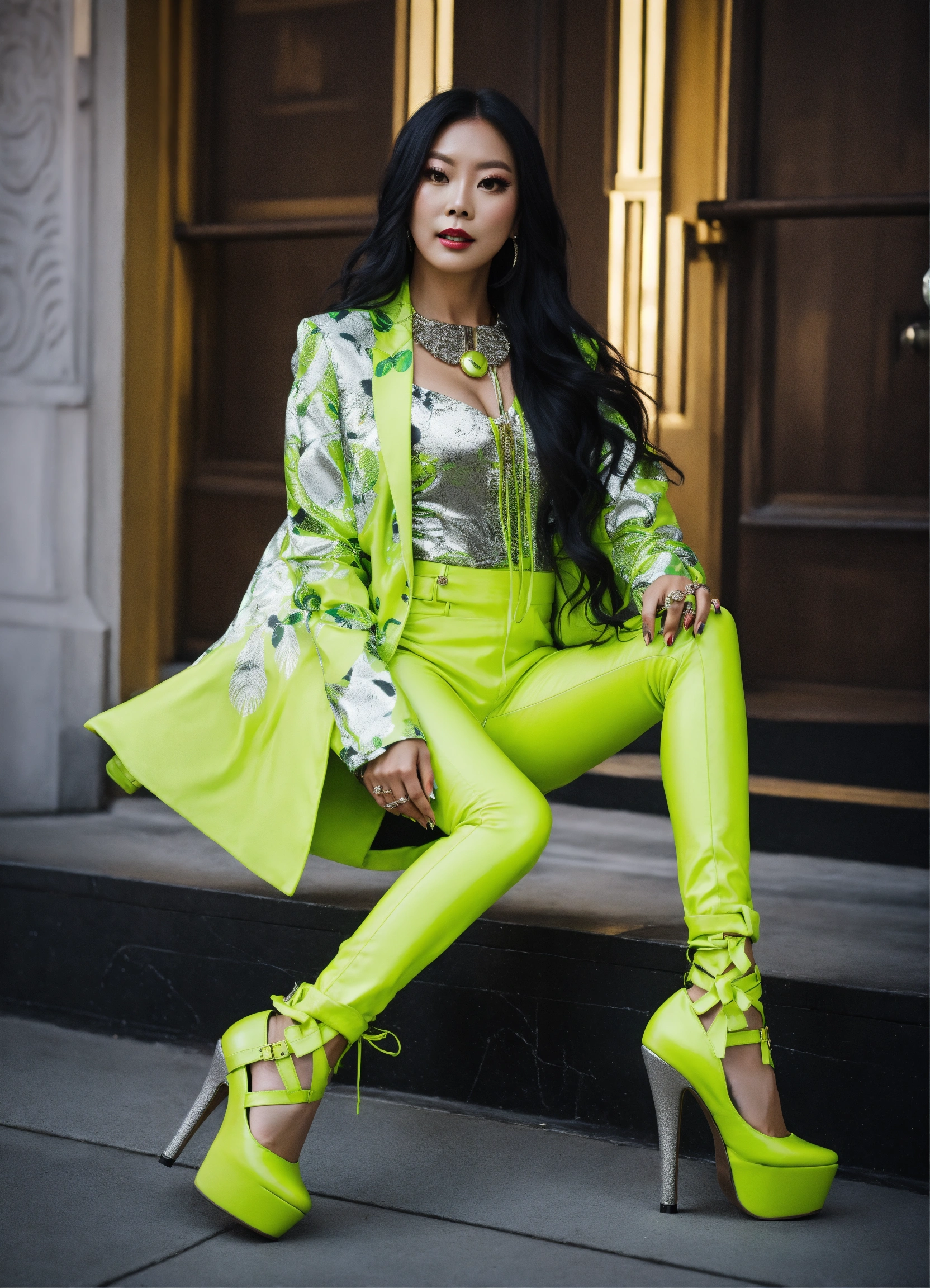 Dreamcatcher jiu glamorous lime green and silver outfit with funky prints, high heels and long dark hair