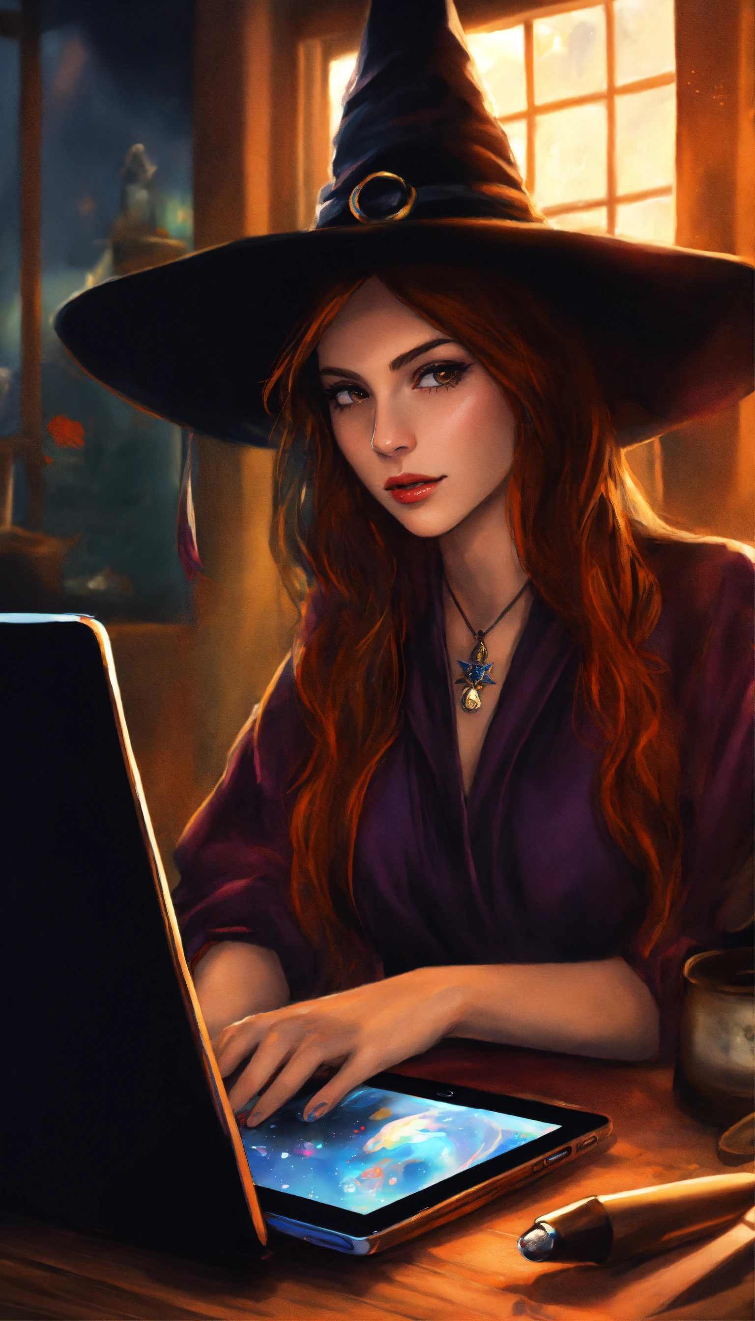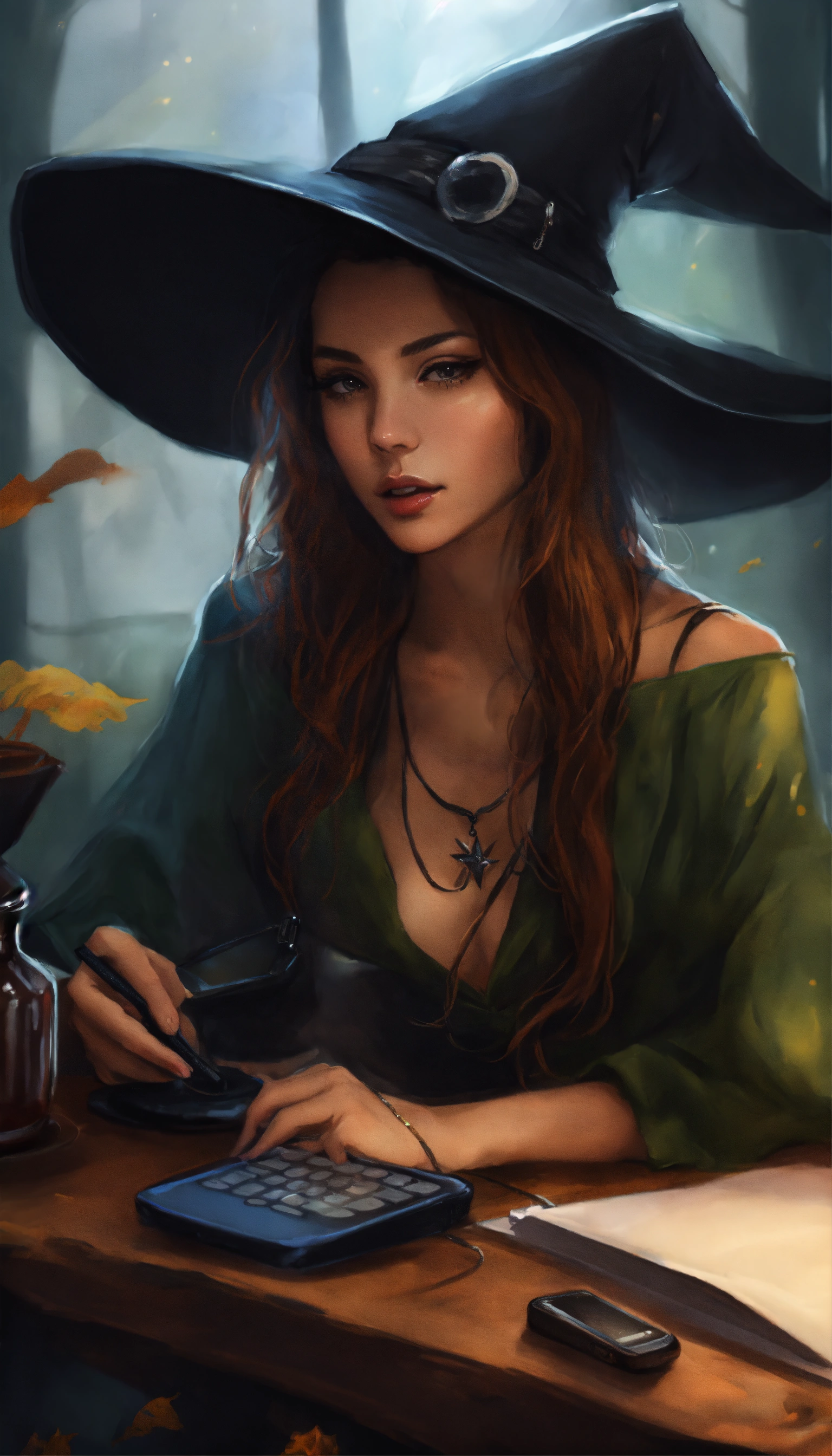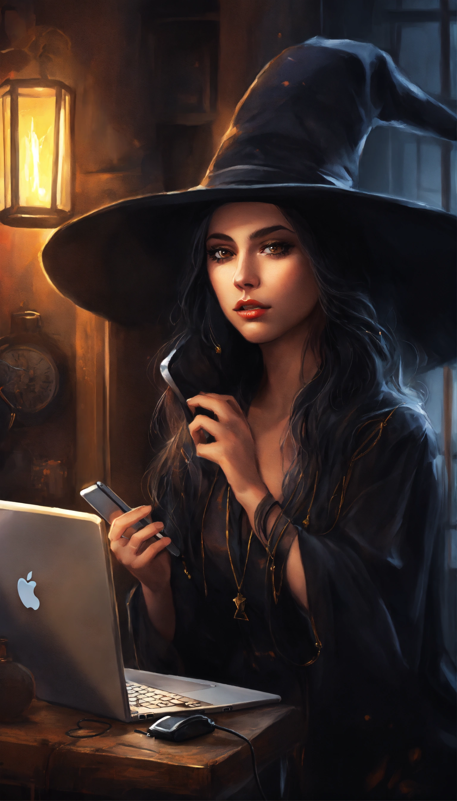 Drawing witch on the phone on her computer realistic